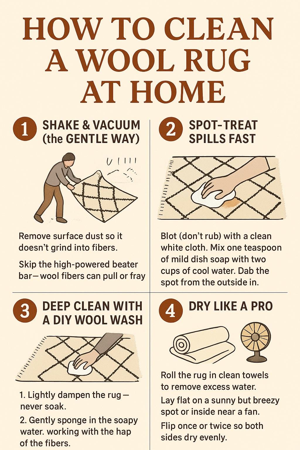 Discover an easy 4-step method to clean your wool rug safely at home. From gentle vacuuming to a DIY wool wash and pro drying tips, keep your Moroccan or handmade rug looking fresh—without harsh chemicals or expensive services.
