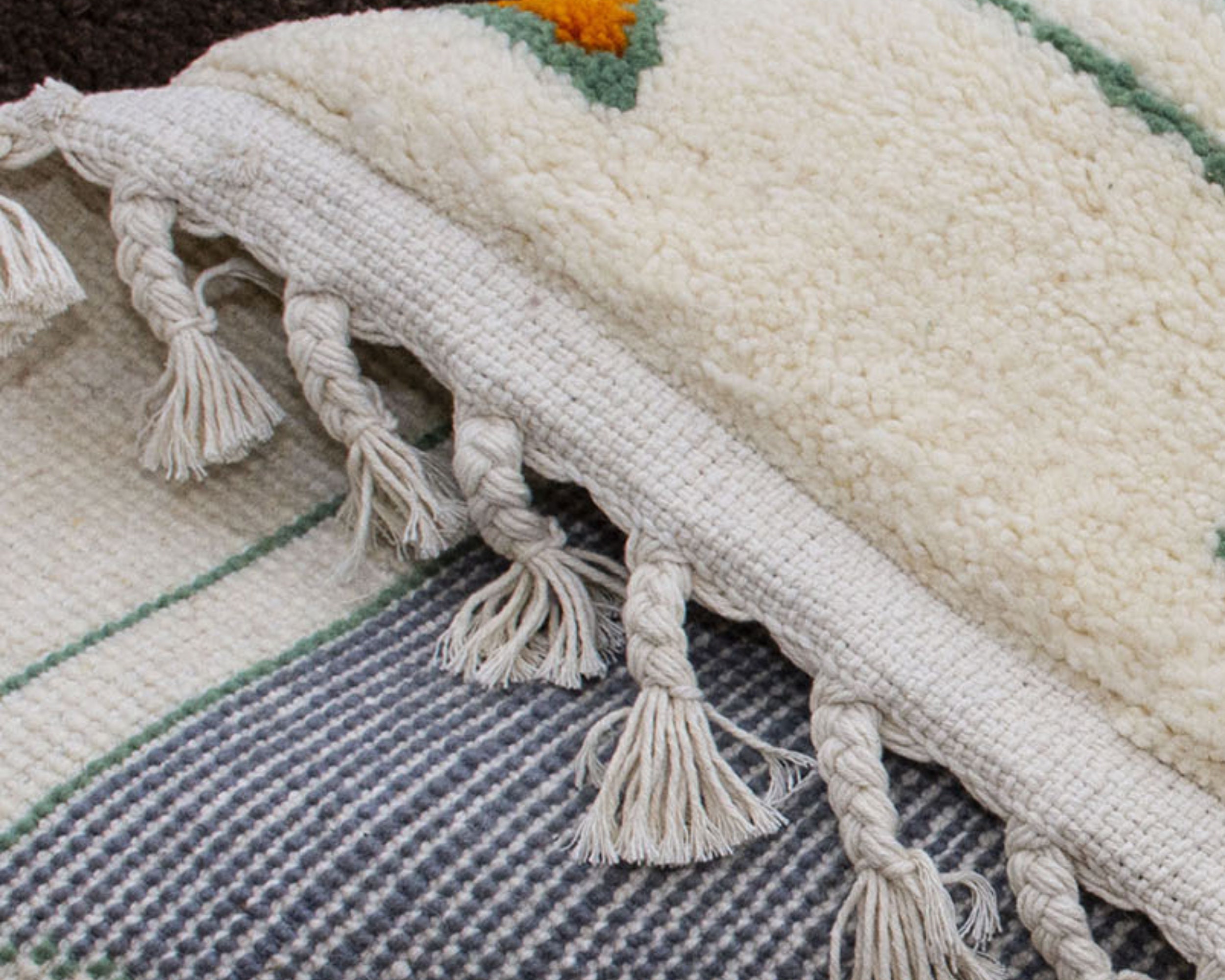 This fabulous Moroccan Rug that will give your room both a cozy feeling and stylish is made from 100% Natural sheep wool, It's Very plush and comfy to walk on, actually It's Heaven for your feet.