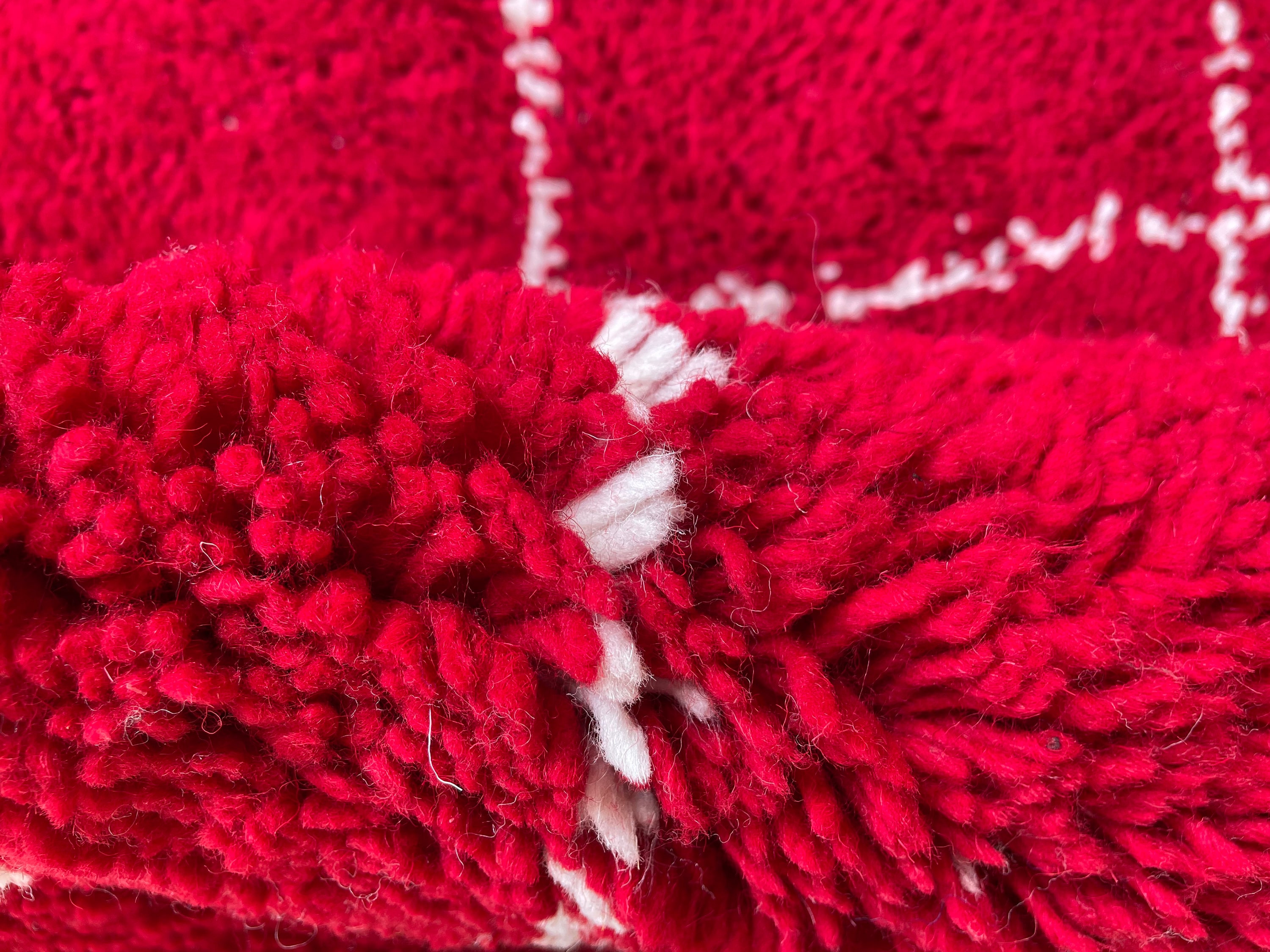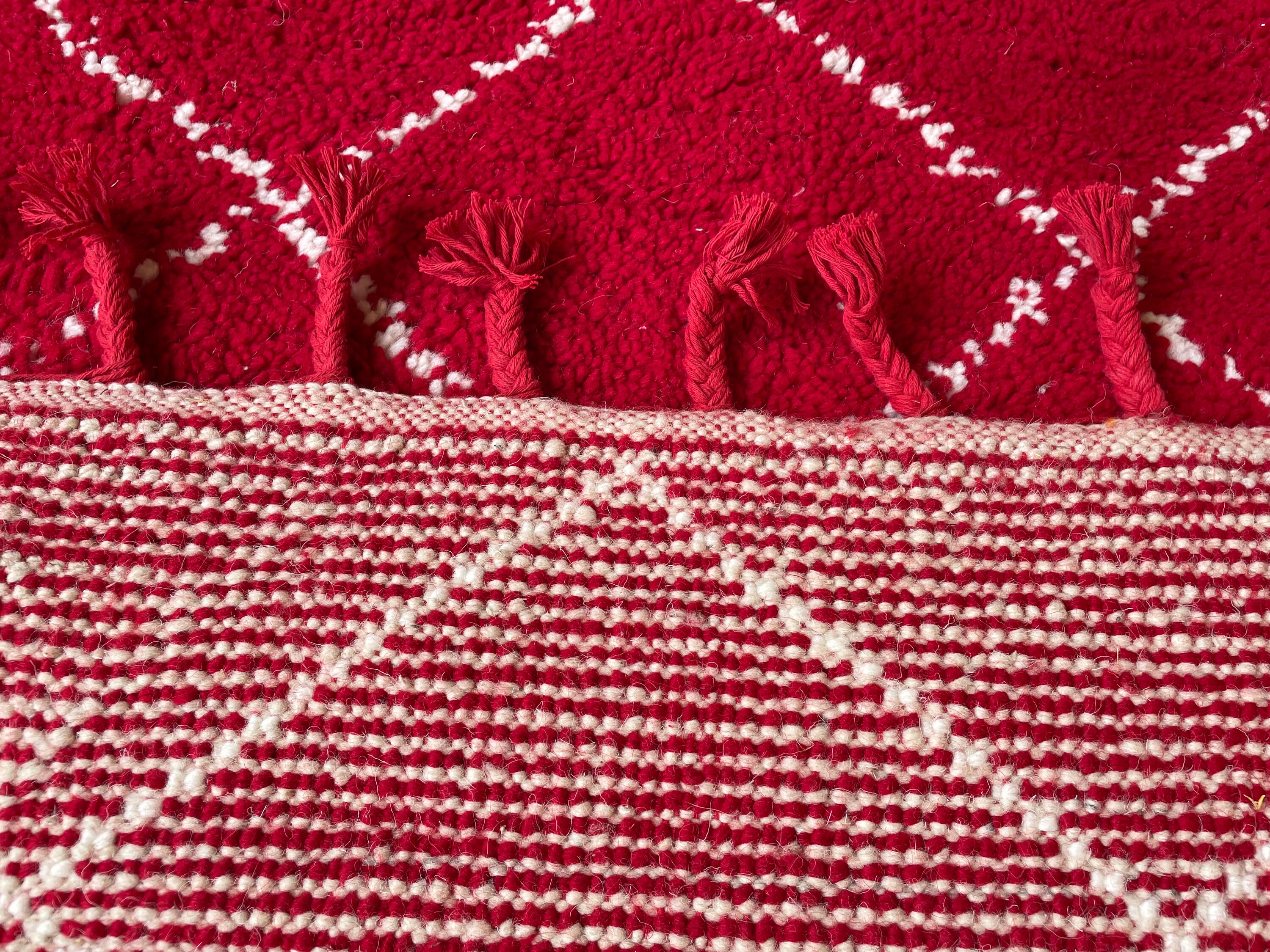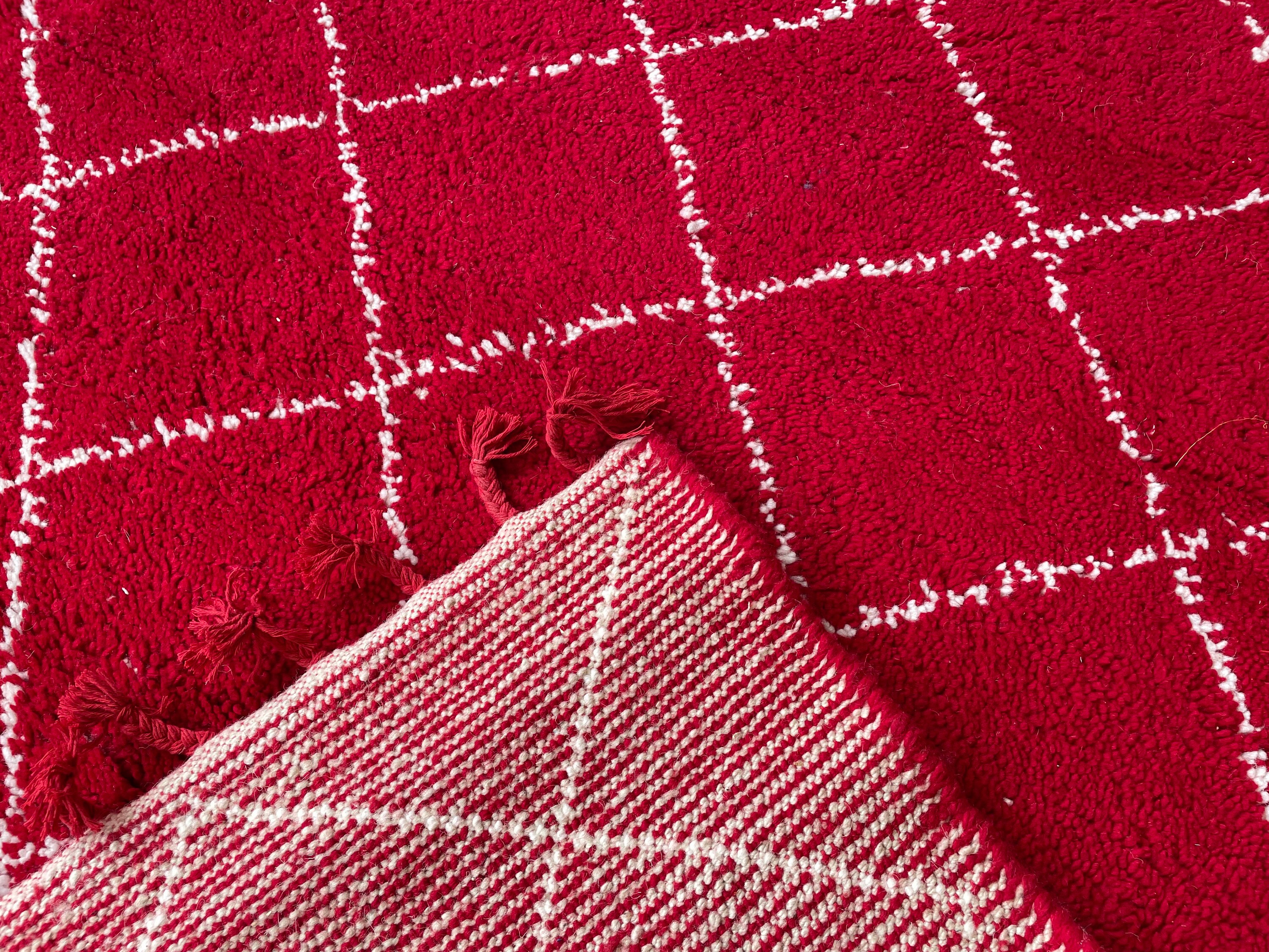 Add a bold statement to your space with this Red and White Geometric Beni Ourain Carpet, handcrafted from soft wool and designed with intricate geometric patterns. Perfect for bohemian home decor, this custom handmade rug makes a stunning area rug for your living room, bedroom, or cozy corners, bringing both warmth and style to your space.