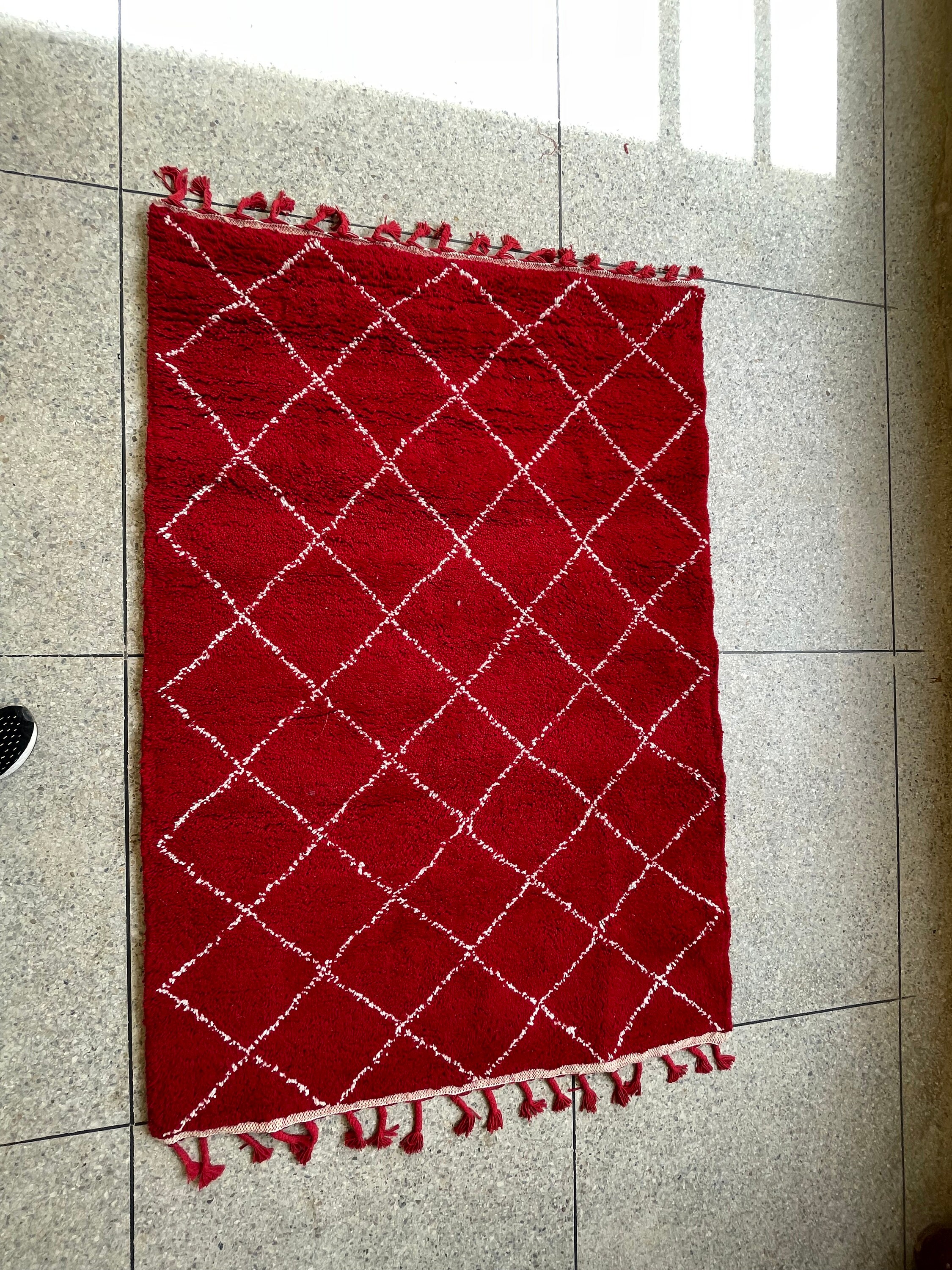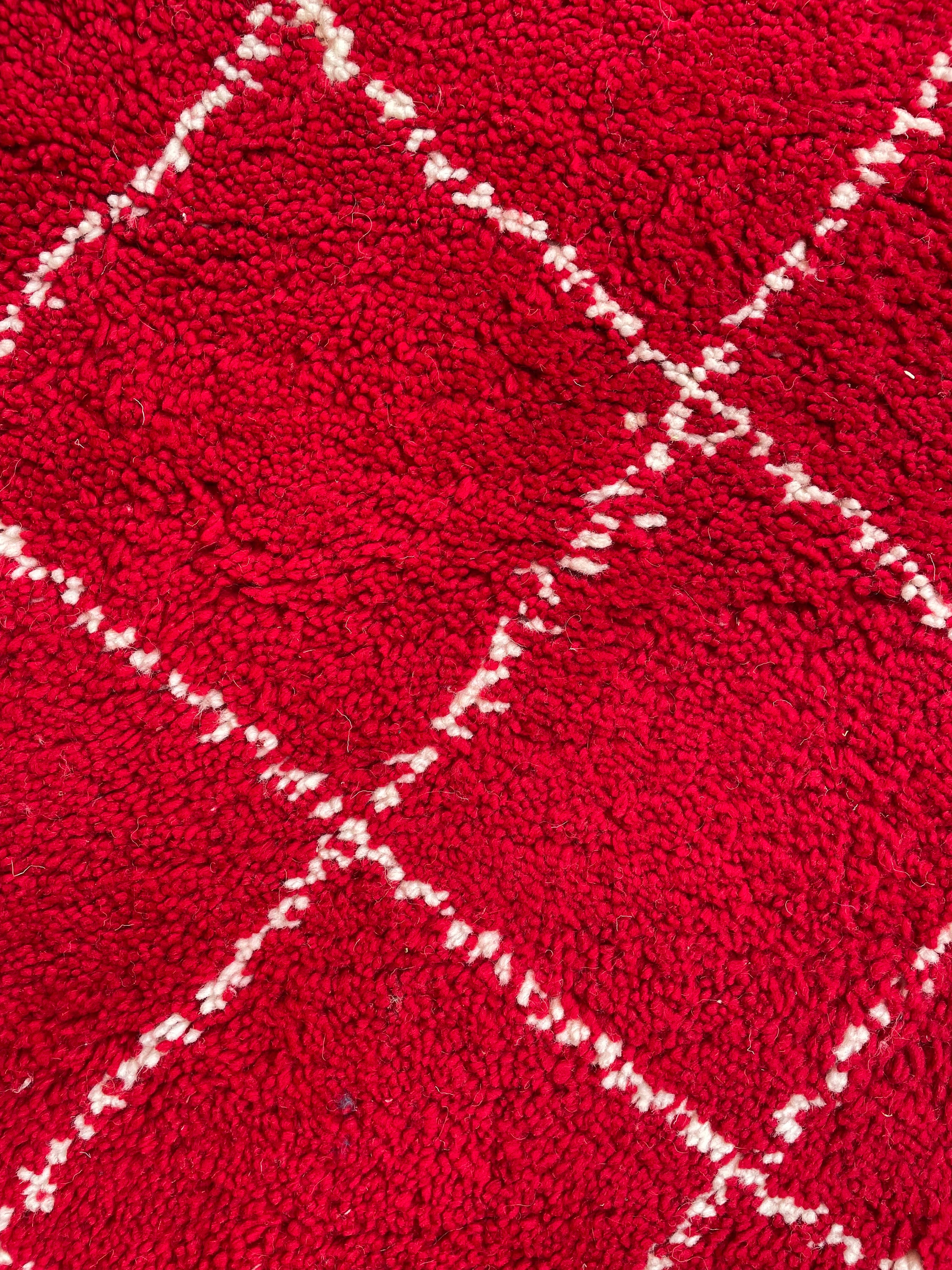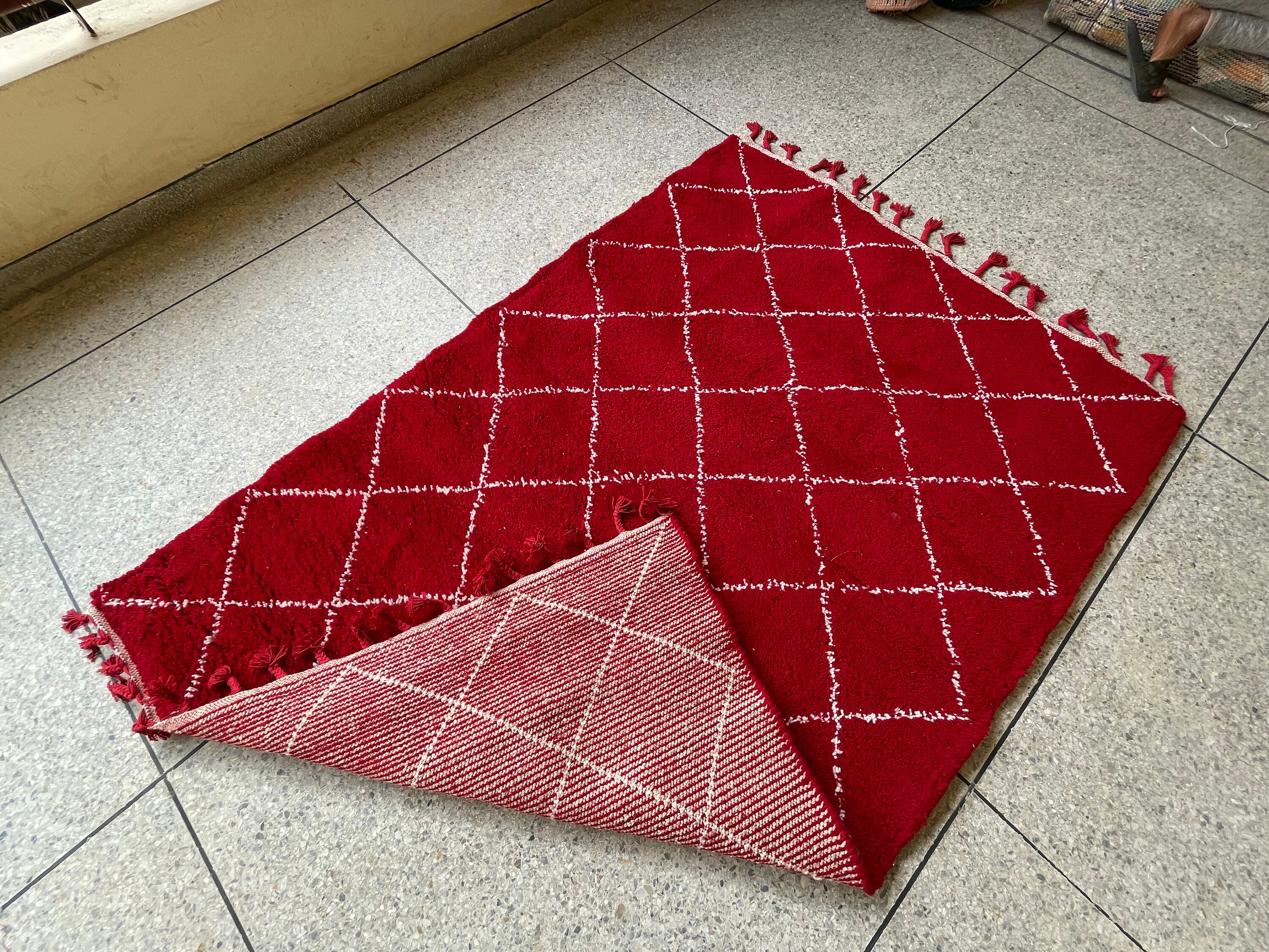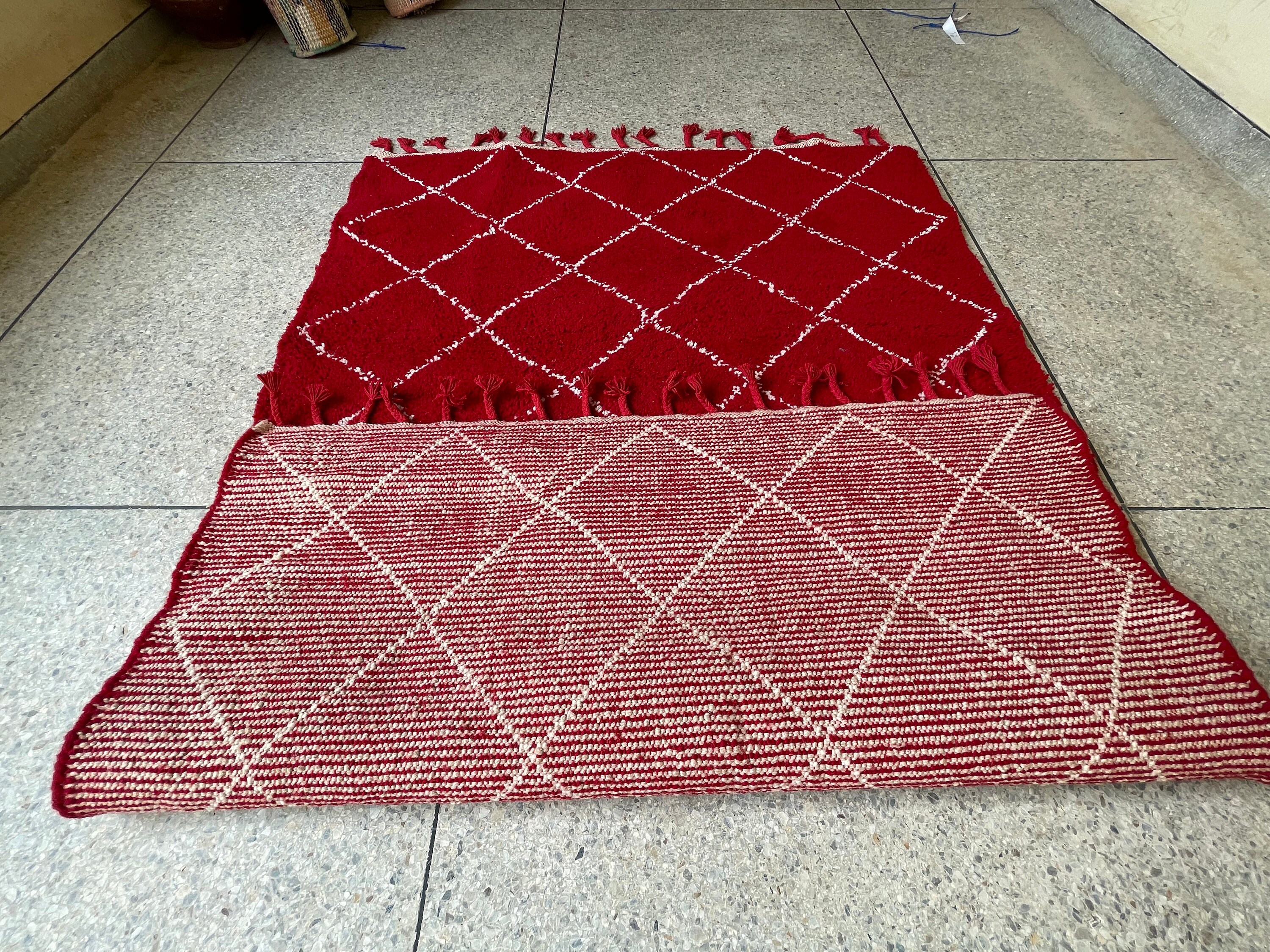 Add a bold statement to your space with this Red and White Geometric Beni Ourain Carpet, handcrafted from soft wool and designed with intricate geometric patterns. Perfect for bohemian home decor, this custom handmade rug makes a stunning area rug for your living room, bedroom, or cozy corners, bringing both warmth and style to your space.