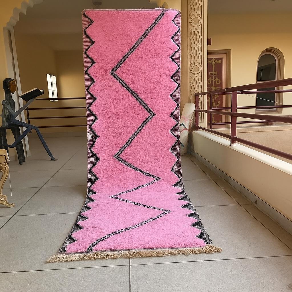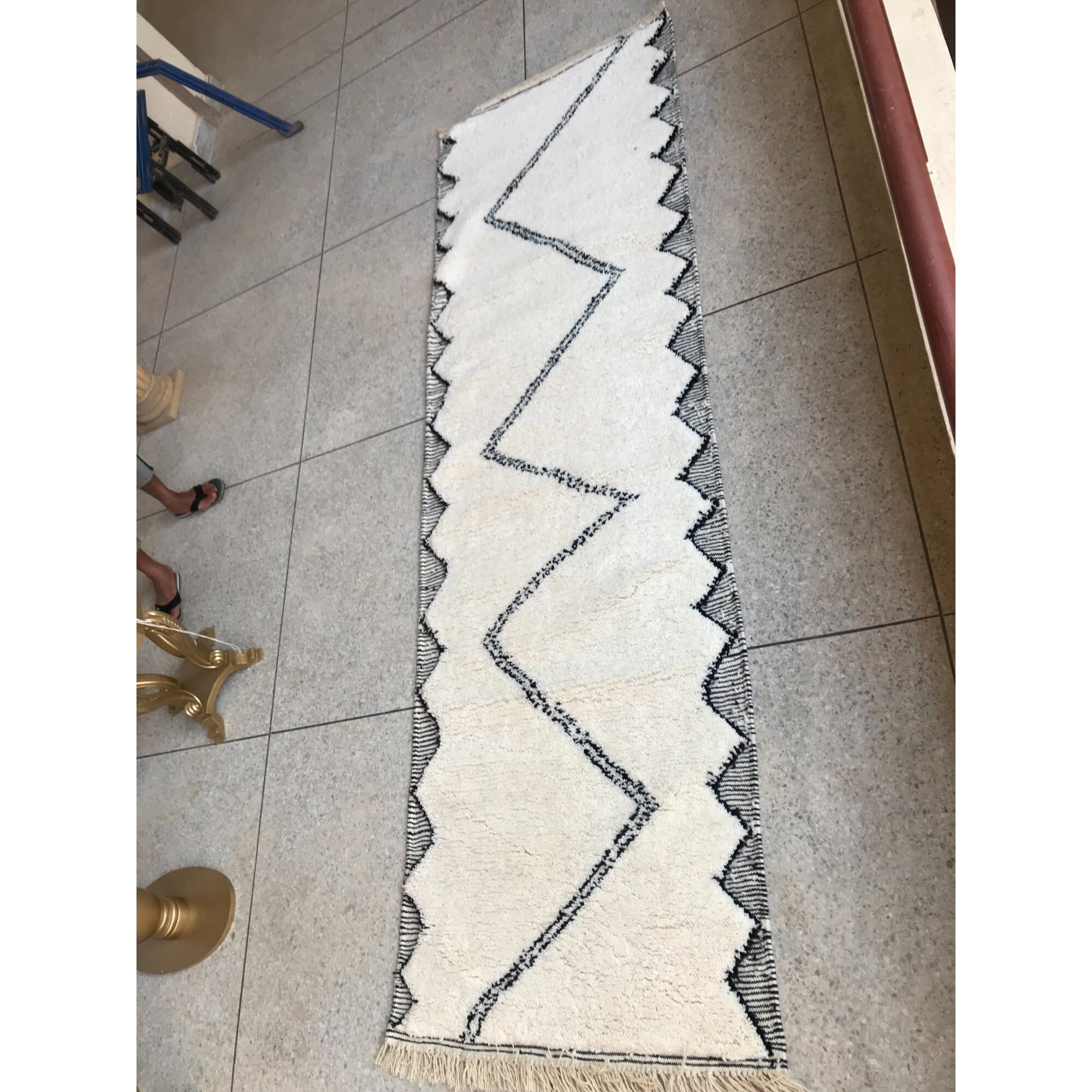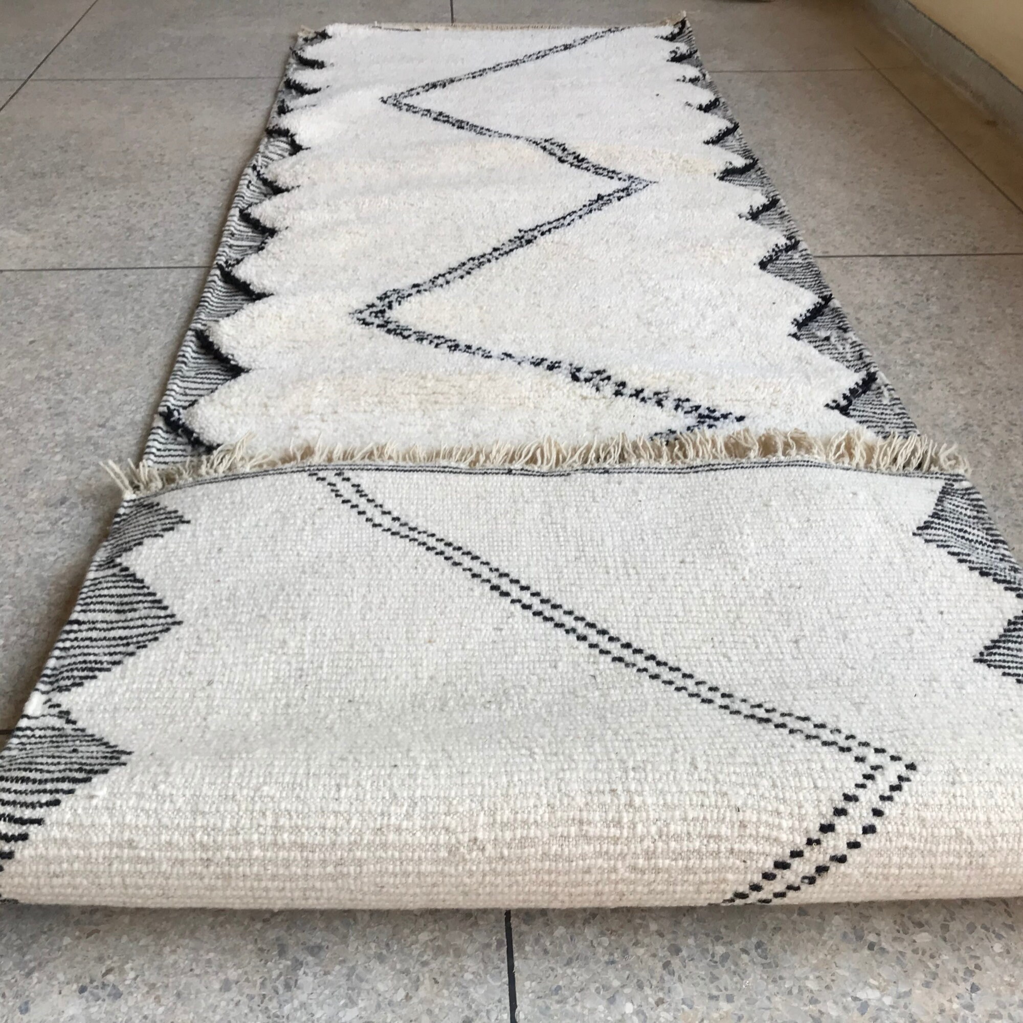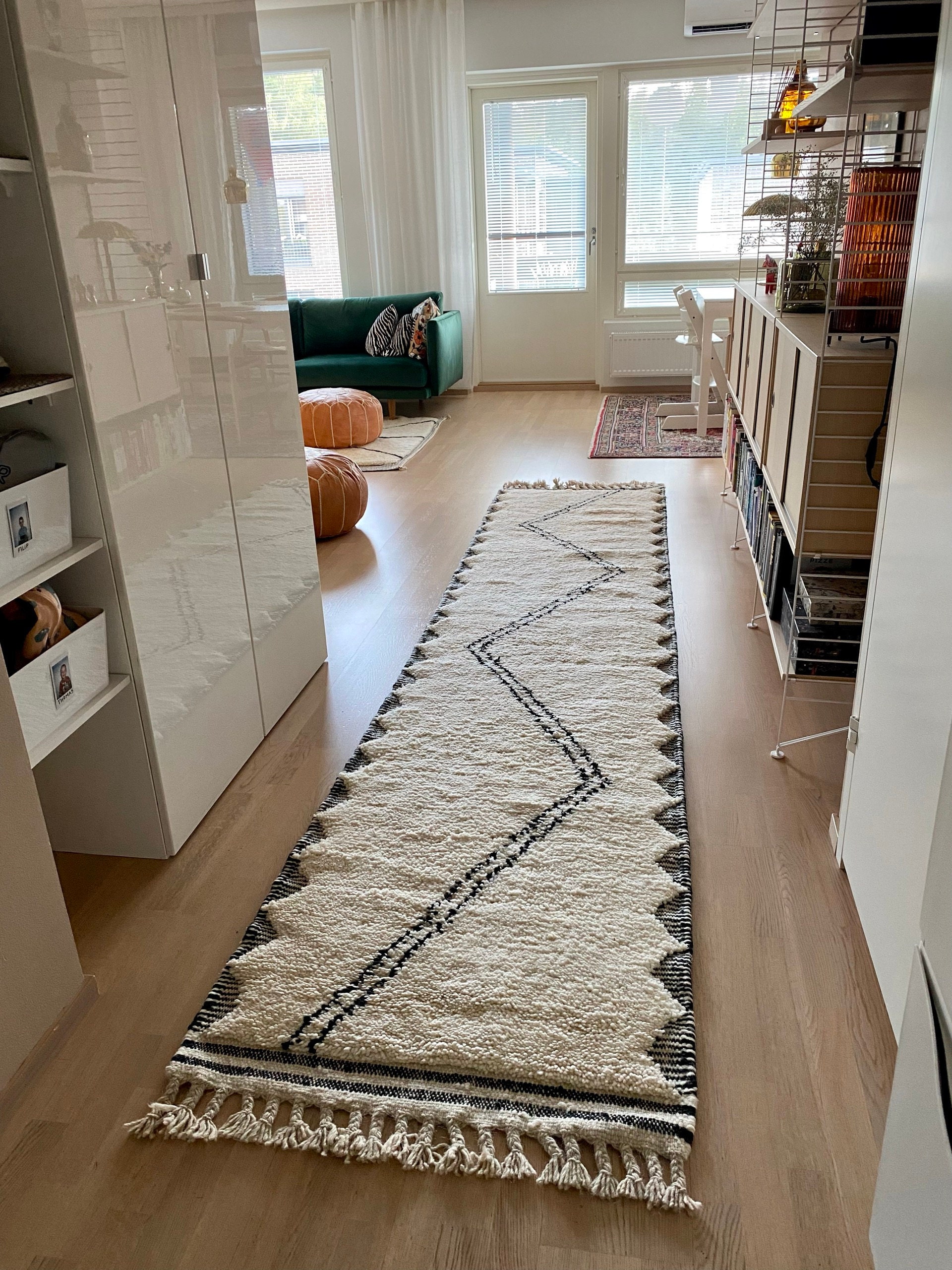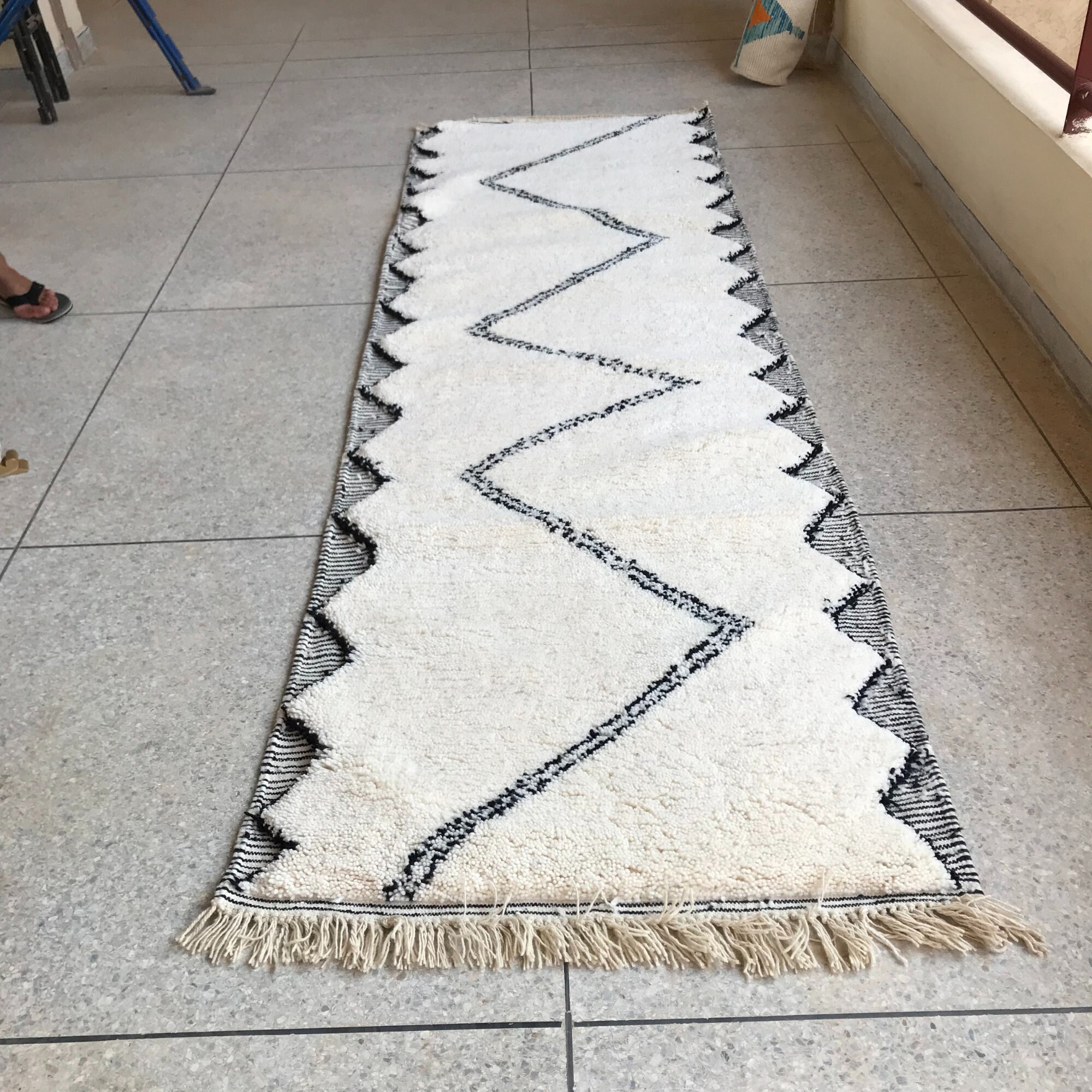 Enhance your space with this cute Beni Ourain runner, a striking handmade checkered rug straight from Morocco. This authentic Berber rug features timeless stripes in classic black and white hues, adding a touch of elegance to any room. Perfect as a stylish black rug that brings a touch of Moroccan charm to your home decor.