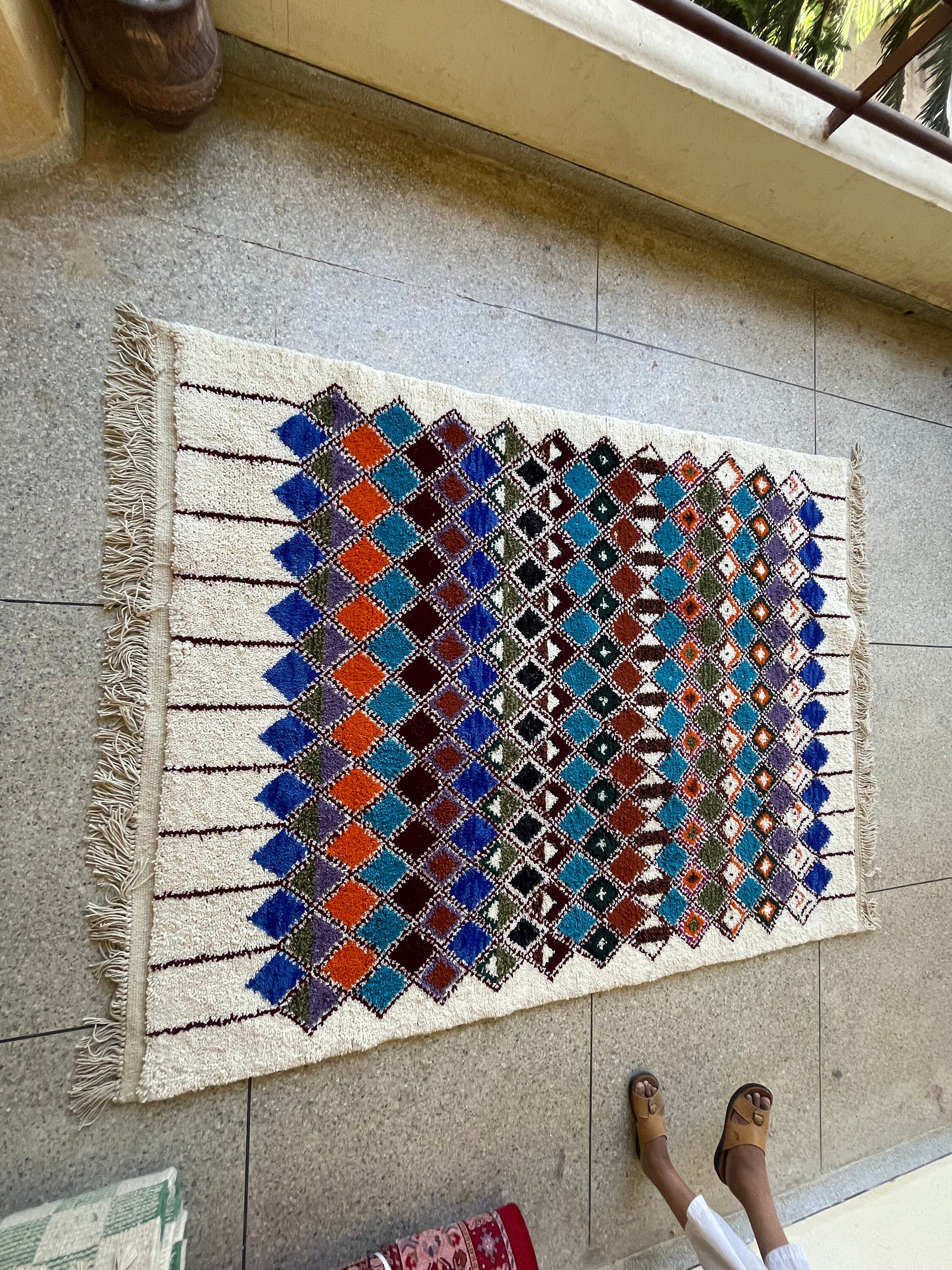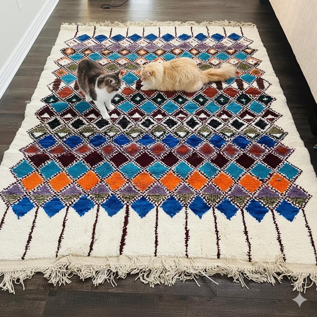 Transform your space with this stunning Geometric Moroccan Rug! Our vibrant Blue Multicolor Beni Ourain Wool Carpet features intricate patterns that add a touch of elegance to any room. Handwoven by skilled artisans, this Bohemian Handwoven Berber Area Rug is perfect for your living room, creating a cozy and inviting atmosphere. Embrace the charm of traditional craftsmanship with this unique Boujaad Living Room Carpet that complements both modern and eclectic decor. Elevate your home today!