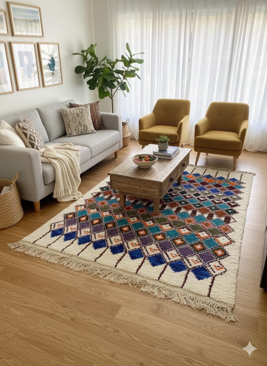 "Transform your home with a piece of Moroccan heritage that exudes both elegance and warmth 🌟. Whether placed under your sofa 🛋️, in your bedroom 🛏️, or even as a wall hanging 🖼️, these rugs invite a sense of history, style, and comfort 🧶✨ Explore our full collection of Beni Ourain, Azilal, and Boucherouite rugs for unique pieces that tell a story 📚💫.”