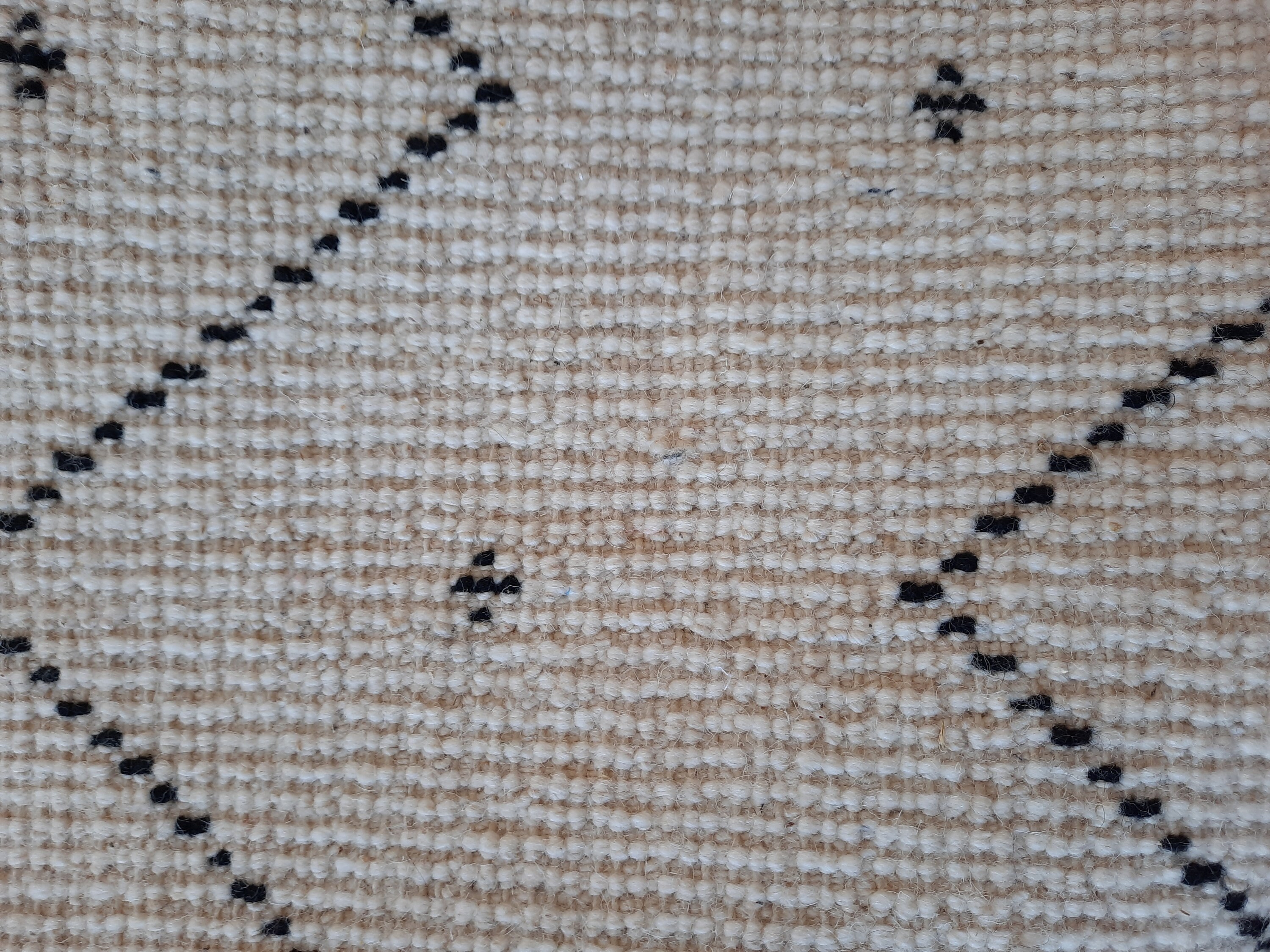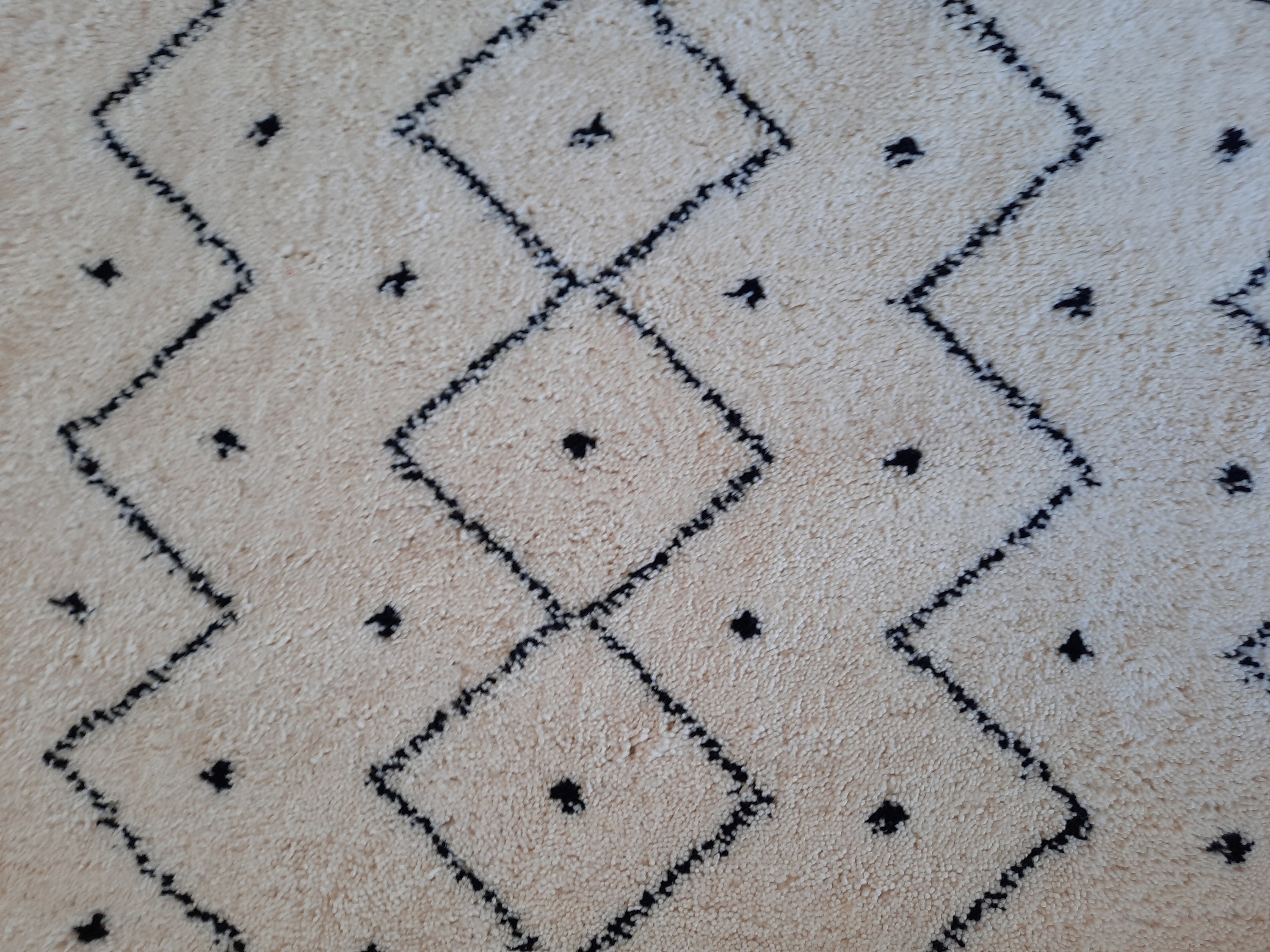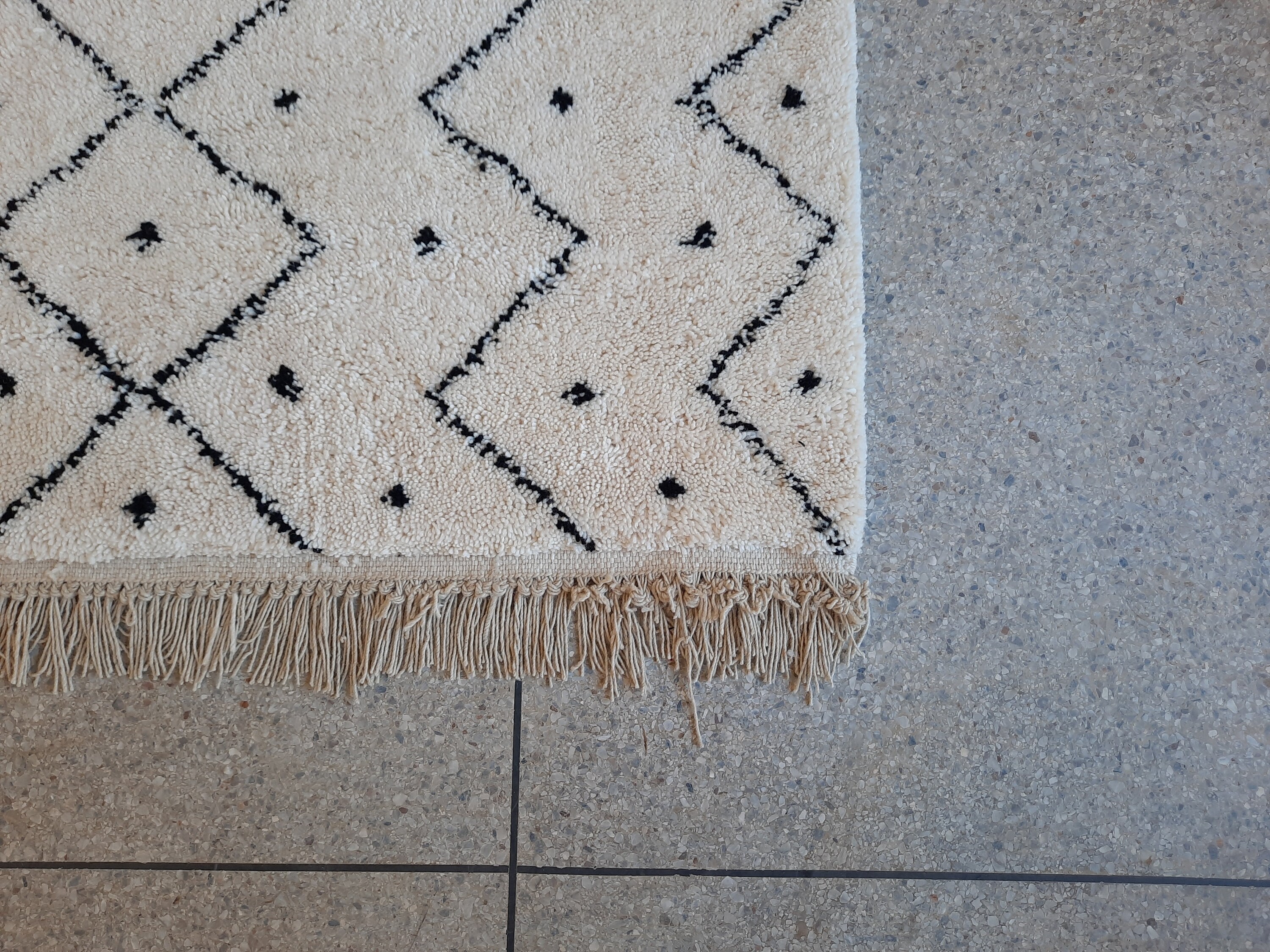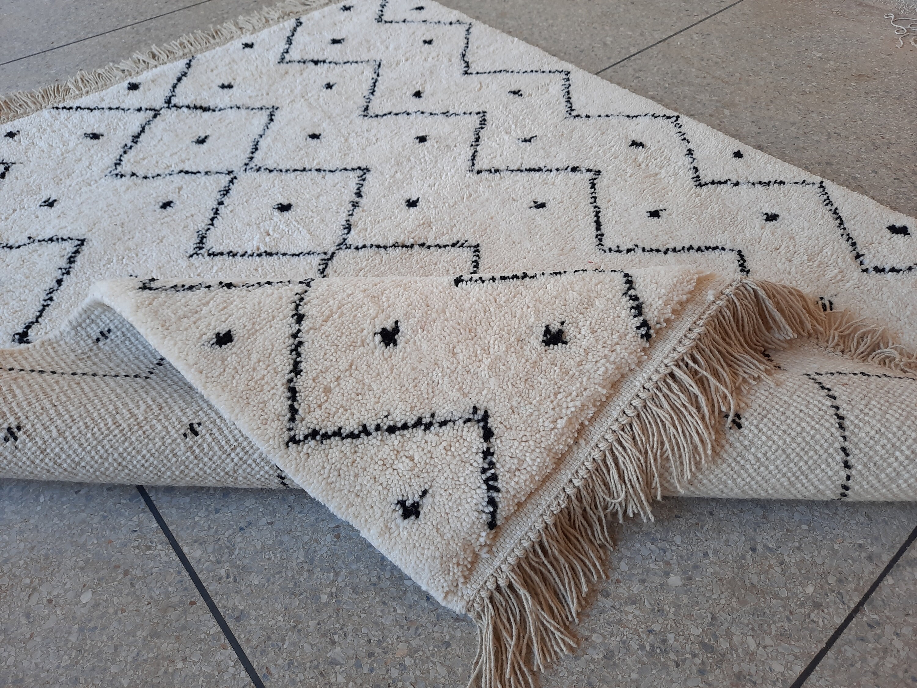 Transform your space with our stunning BENI OURAIN CARPET, featuring a striking black and white geometric design. This custom dotted soft wool rug is perfect for adding warmth and elegance to your minimalist living room or bedroom. Its abstract pattern effortlessly complements any decor style, making it a versatile addition to your home. Experience the luxurious feel and unique charm of this area rug, crafted with love and attention to detail. Elevate your interior with this exquisite Moroccan treasure!
