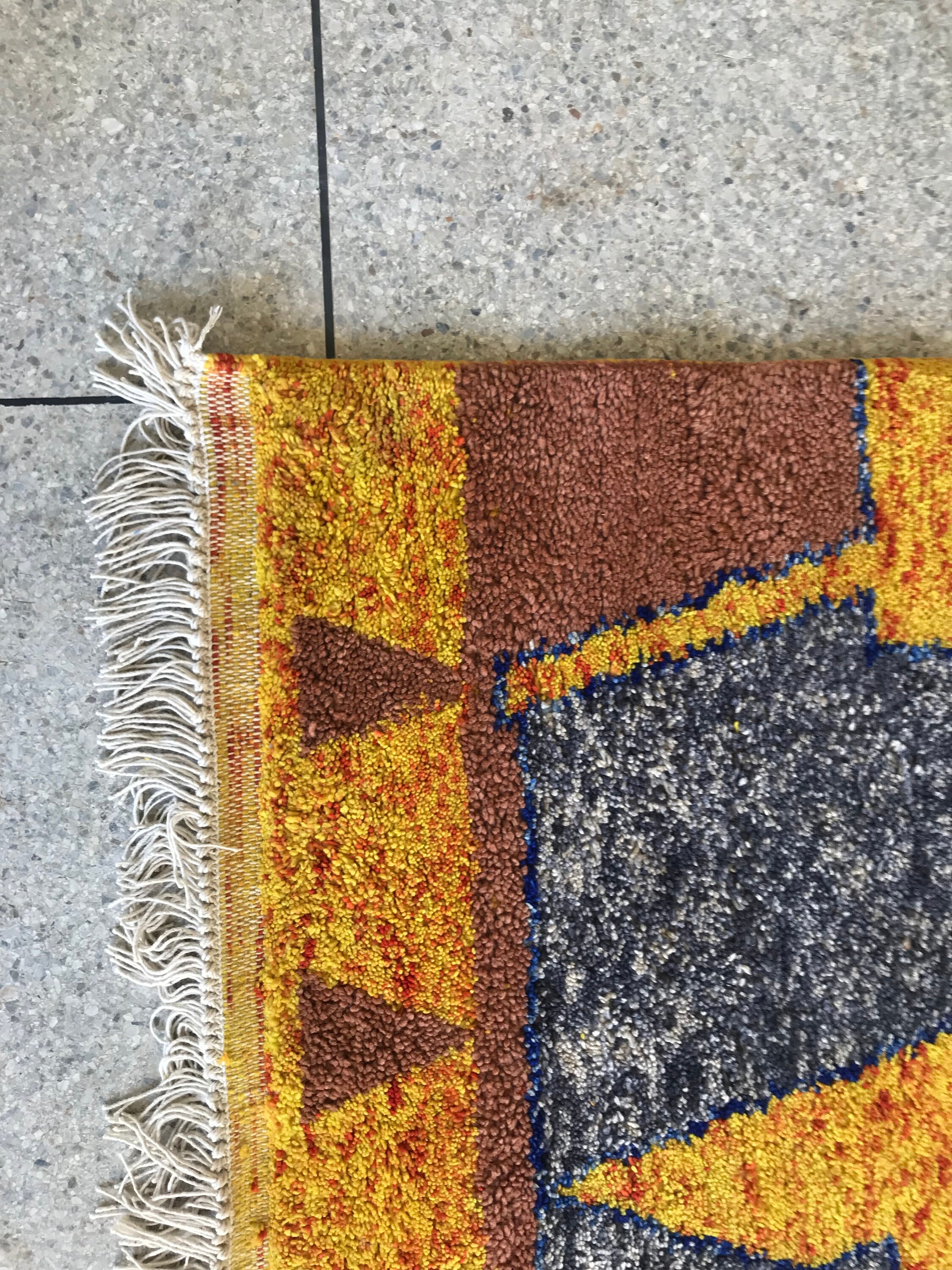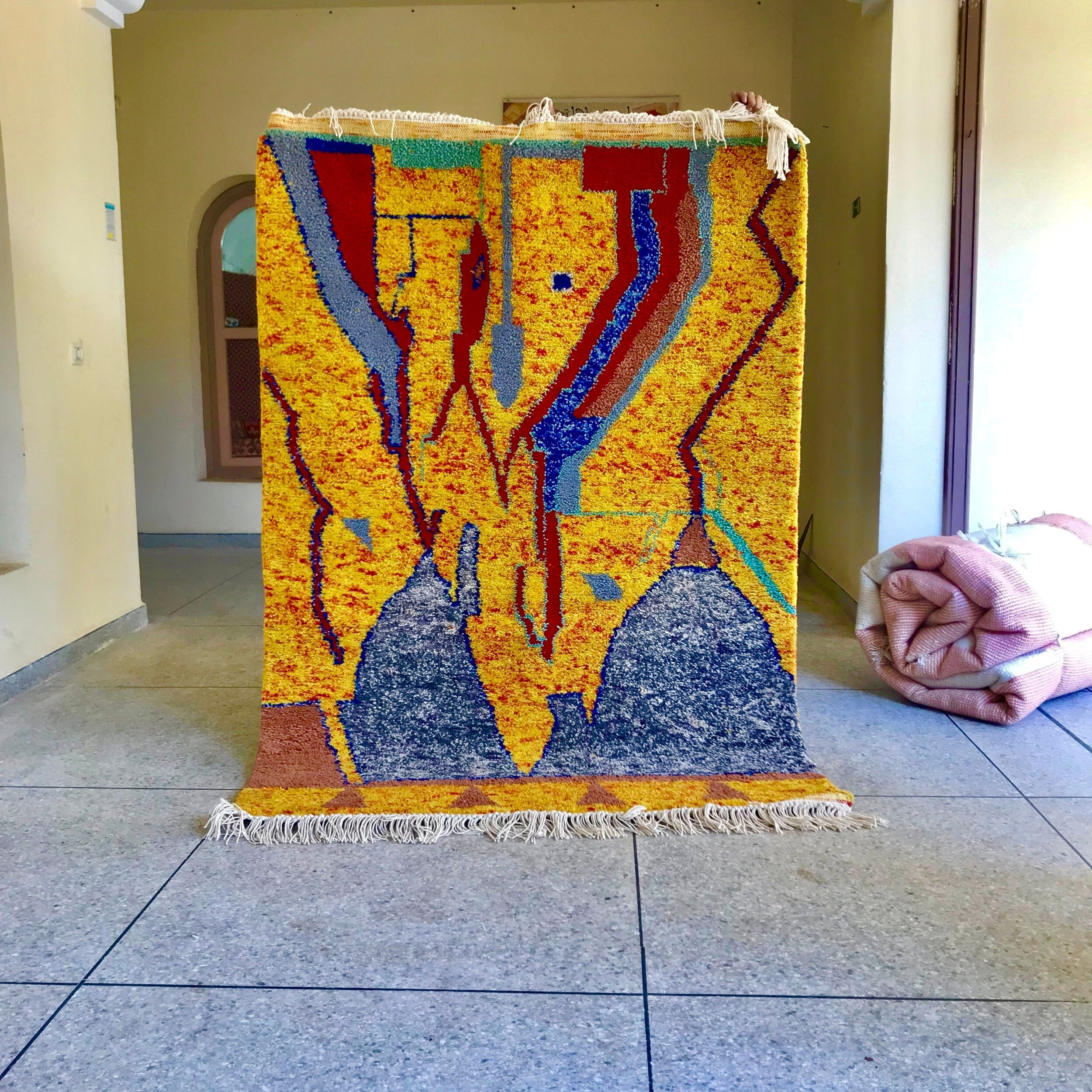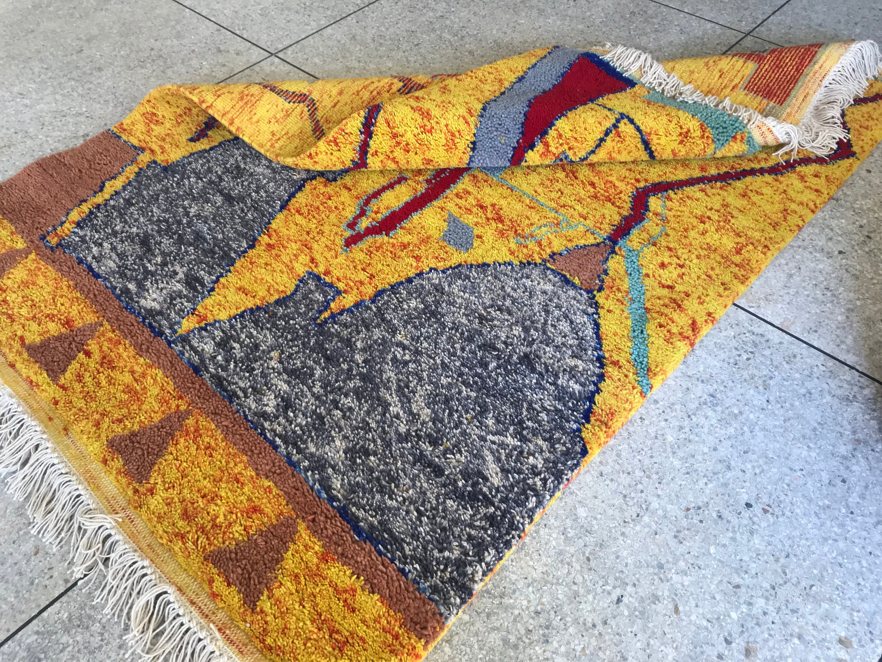 Brighten your home with this handmade yellow Beni Ourain rug — soft wool, abstract design, and perfect for bohemian and eclectic spaces.