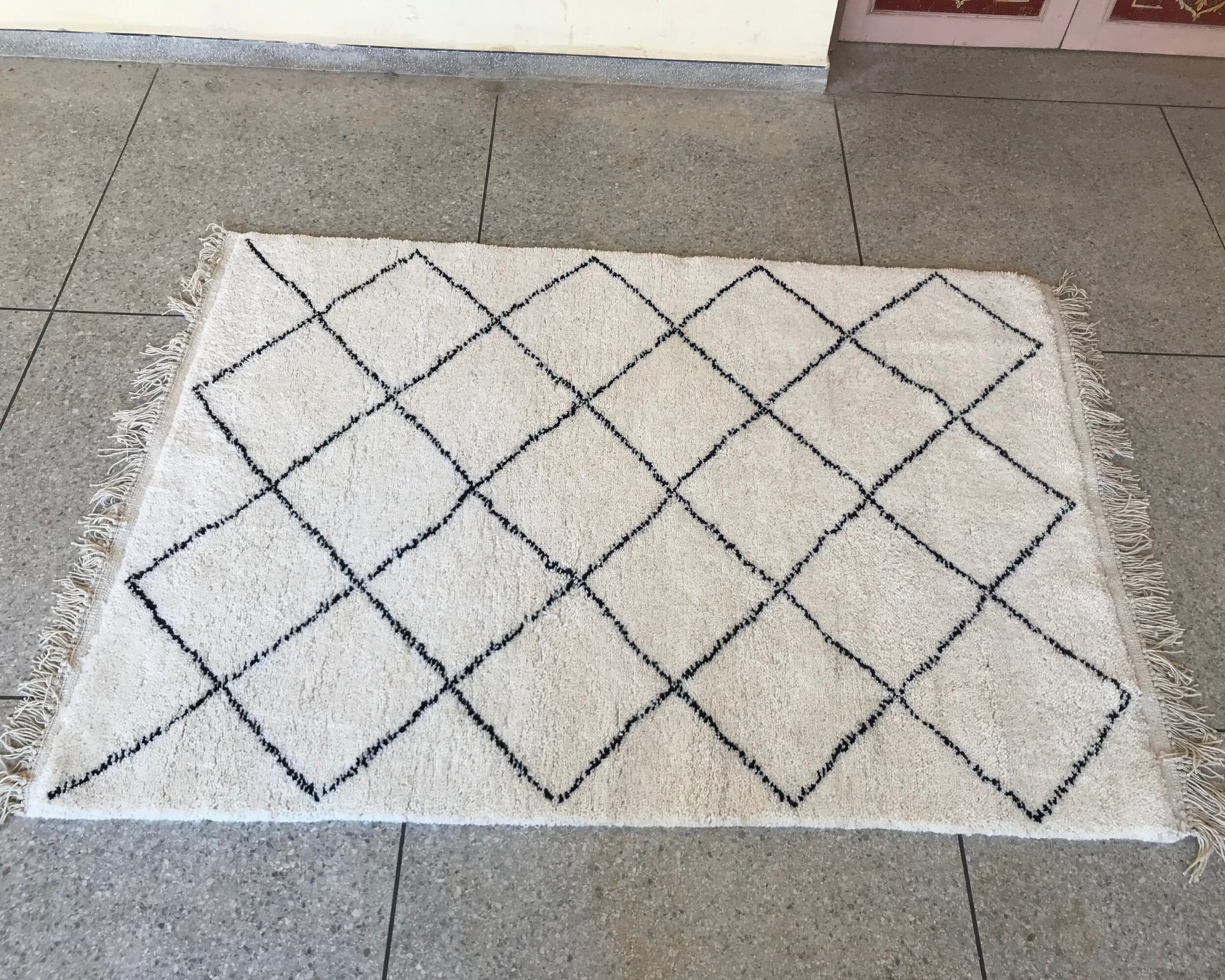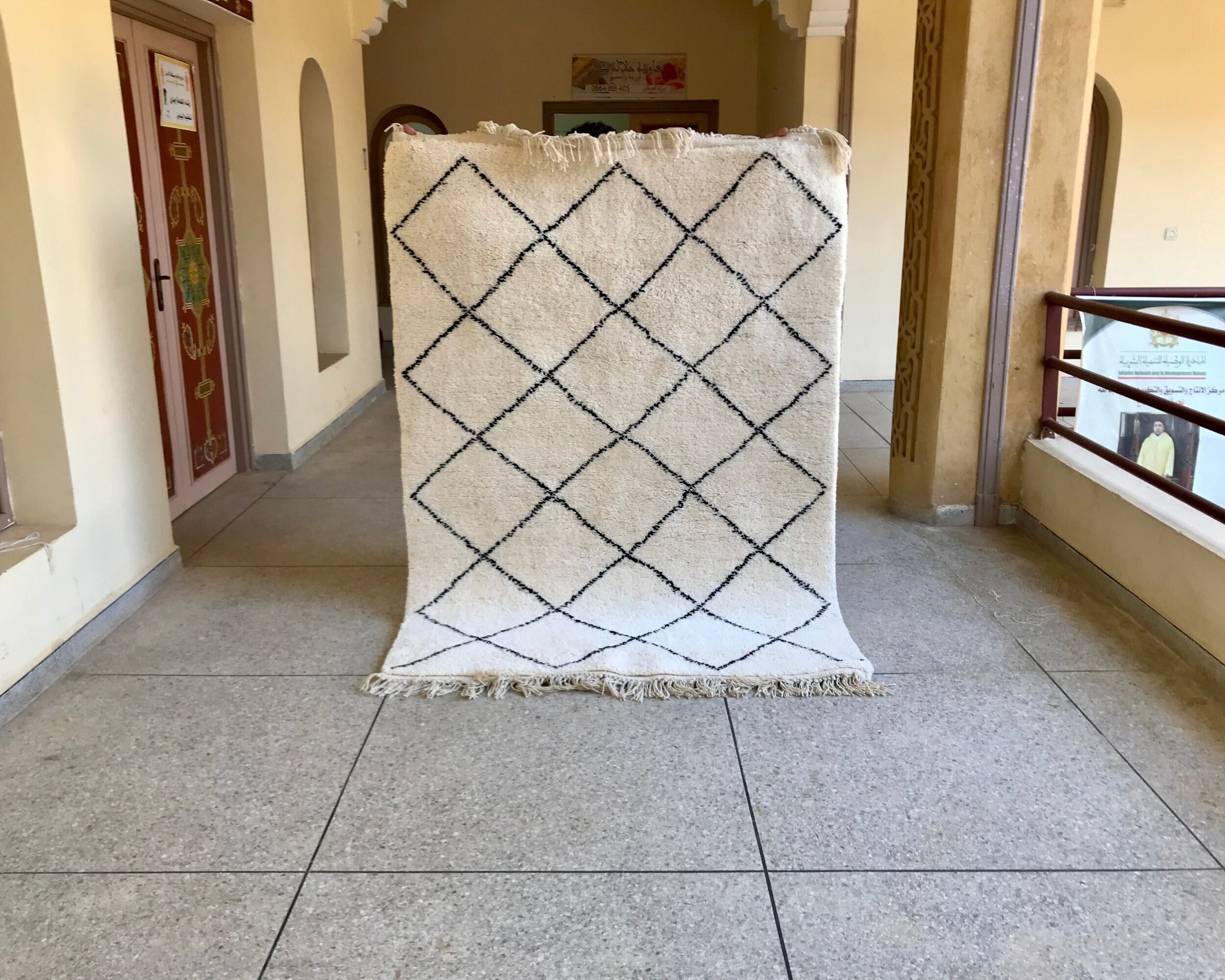 Elevate your space with this authentic Moroccan Beni Ourain rug, handcrafted from 100% natural sheep wool. Featuring a timeless white and black diamond pattern, this geometric rug blends effortlessly into minimalist, modern, and bohemian interiors. Its plush texture adds warmth and comfort, making it perfect for your living room, bedroom, or office. A luxurious yet versatile piece that brings Moroccan heritage and elegance to your home!
