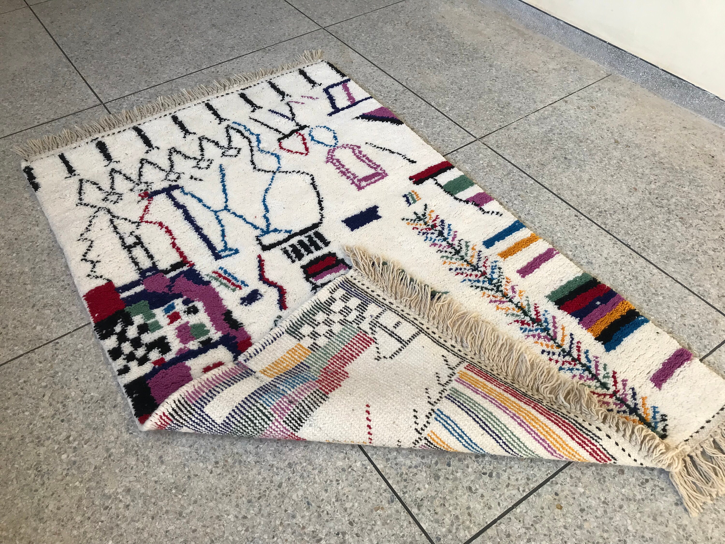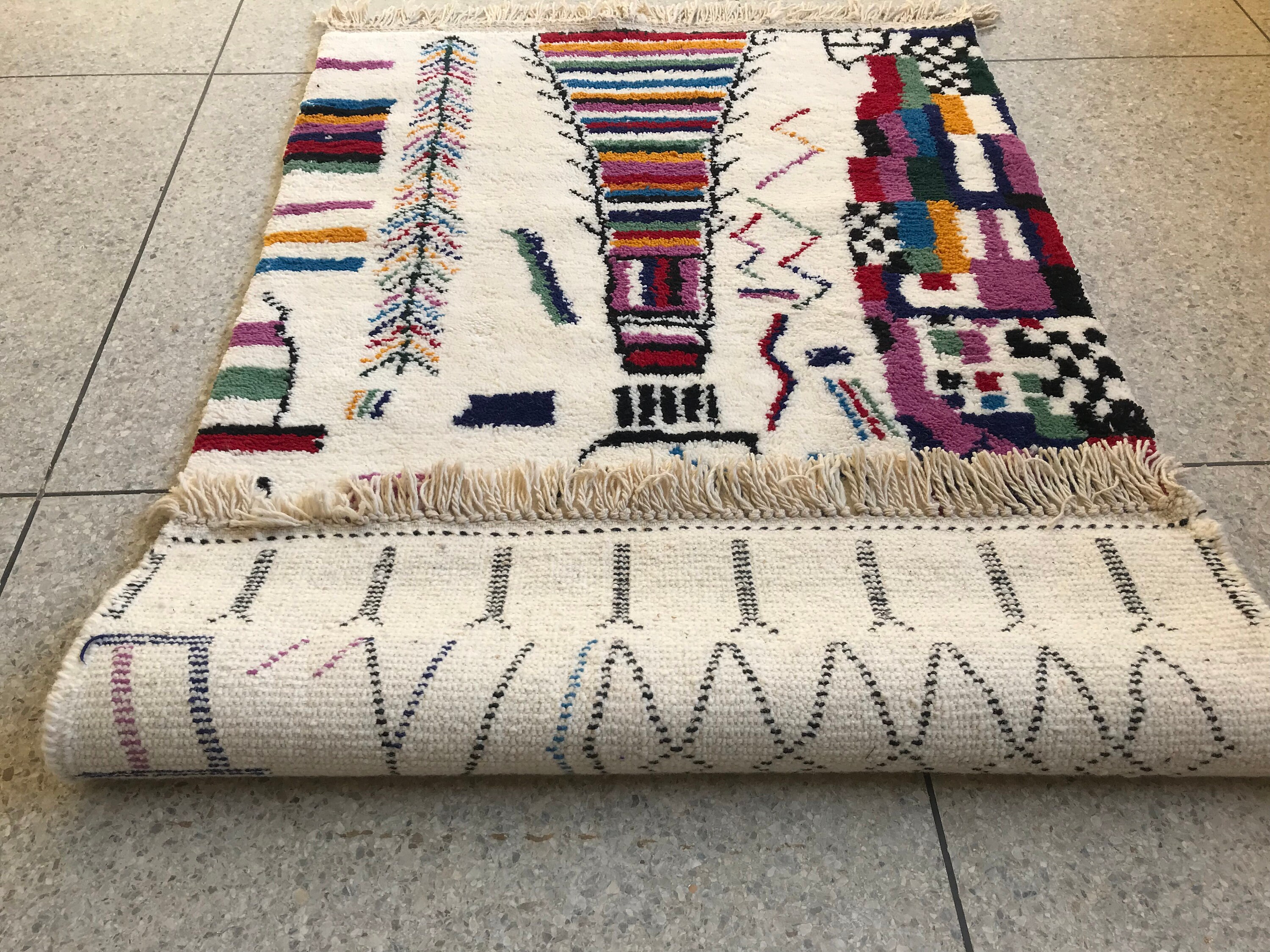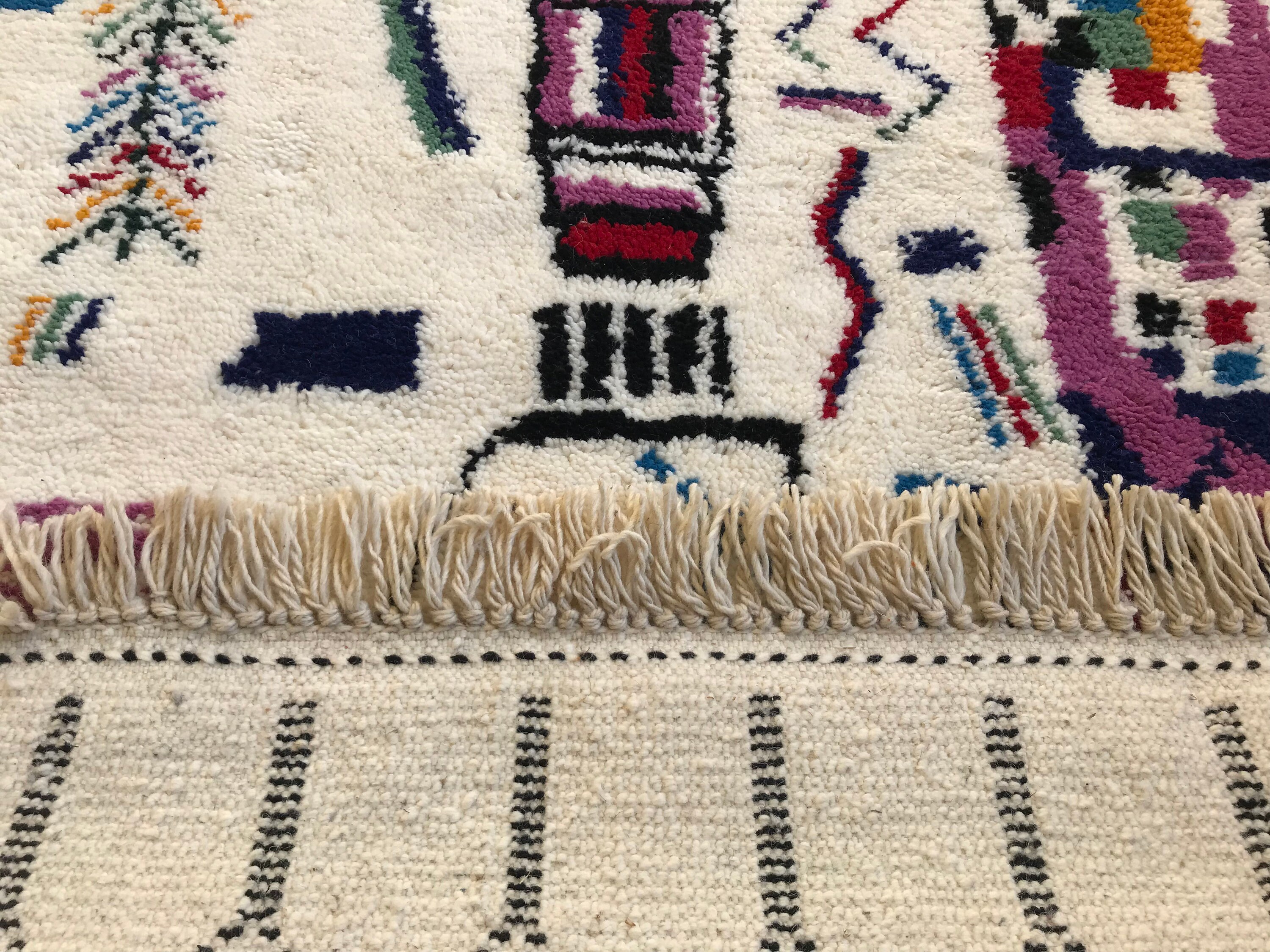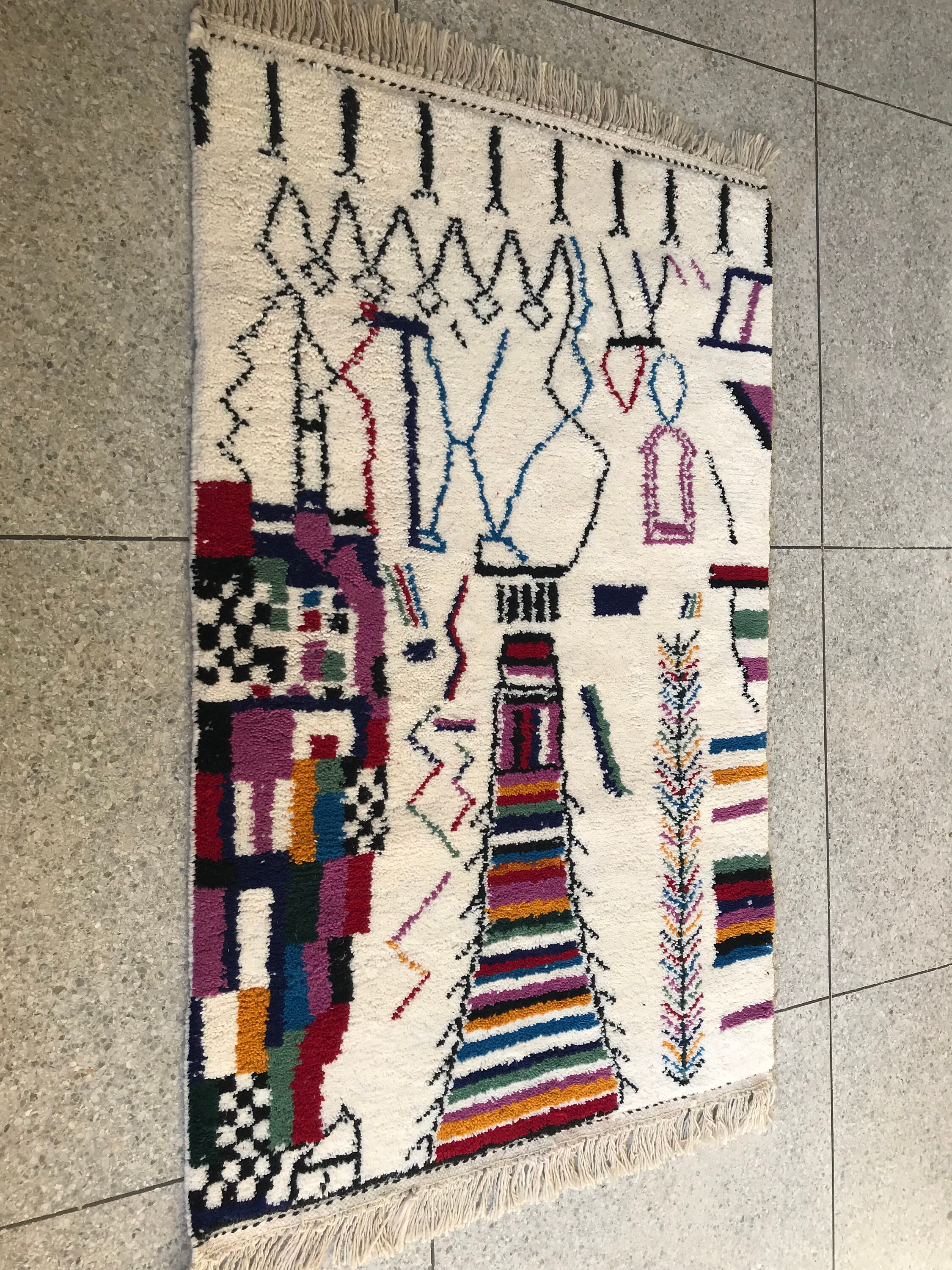 Add vibrant Moroccan charm to your space with this handmade multicolor Beni Ourain rug — soft wool, abstract patterns, and perfect for boho decor.