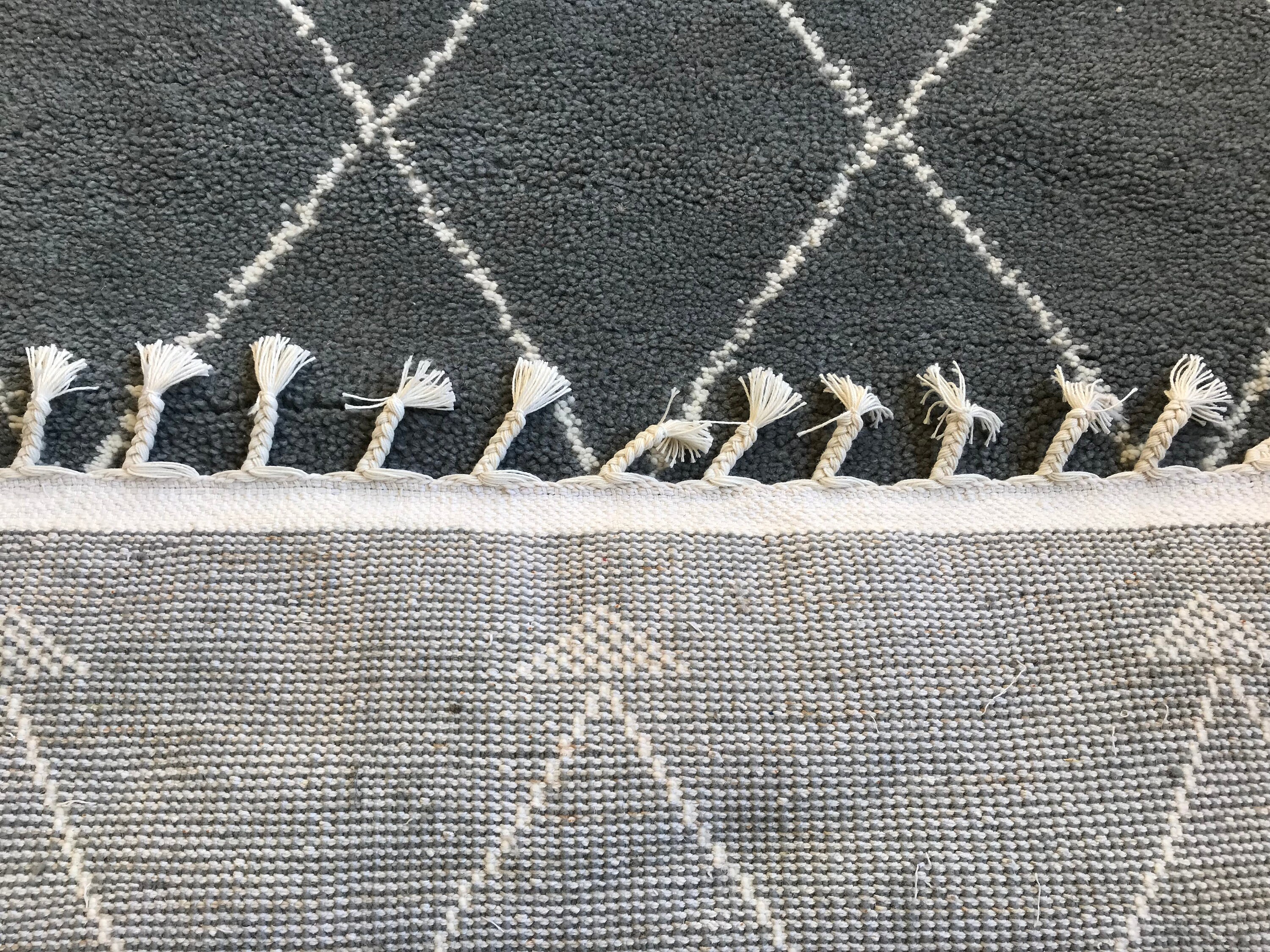 This gray & white Beni Ourain rug blends soft wool with bold diamond patterns — handmade for cozy bohemian and eclectic interiors.