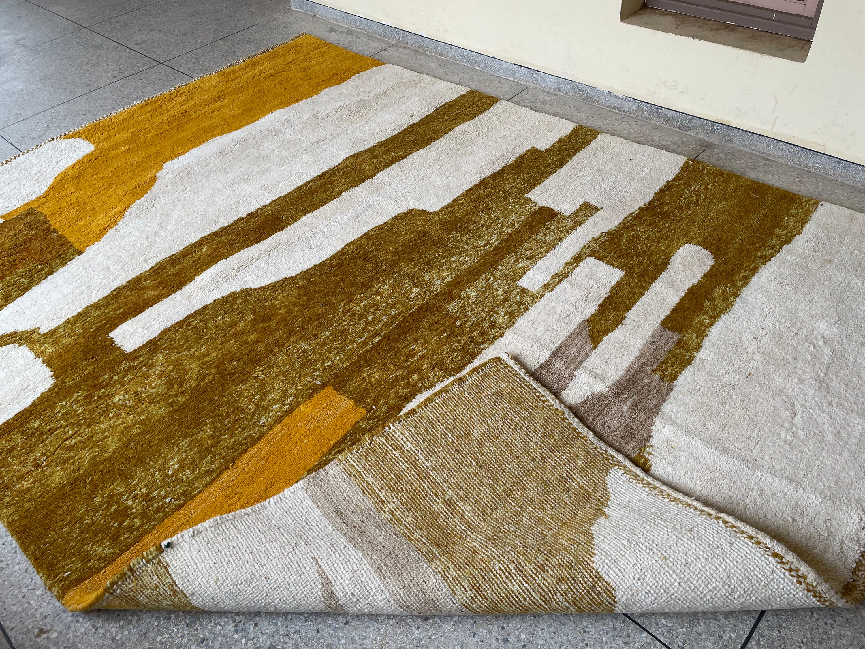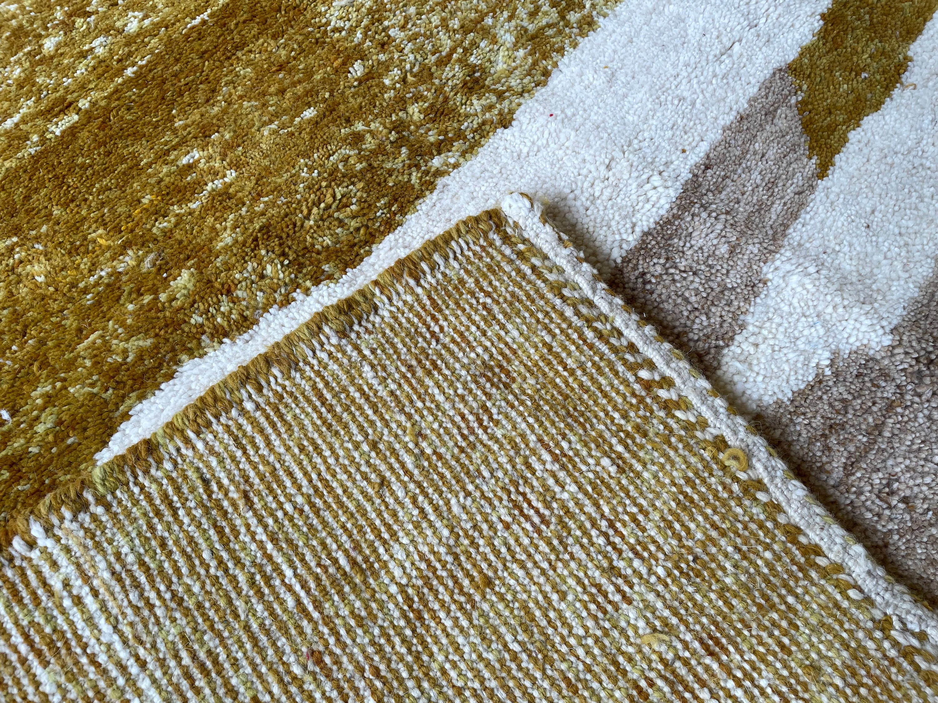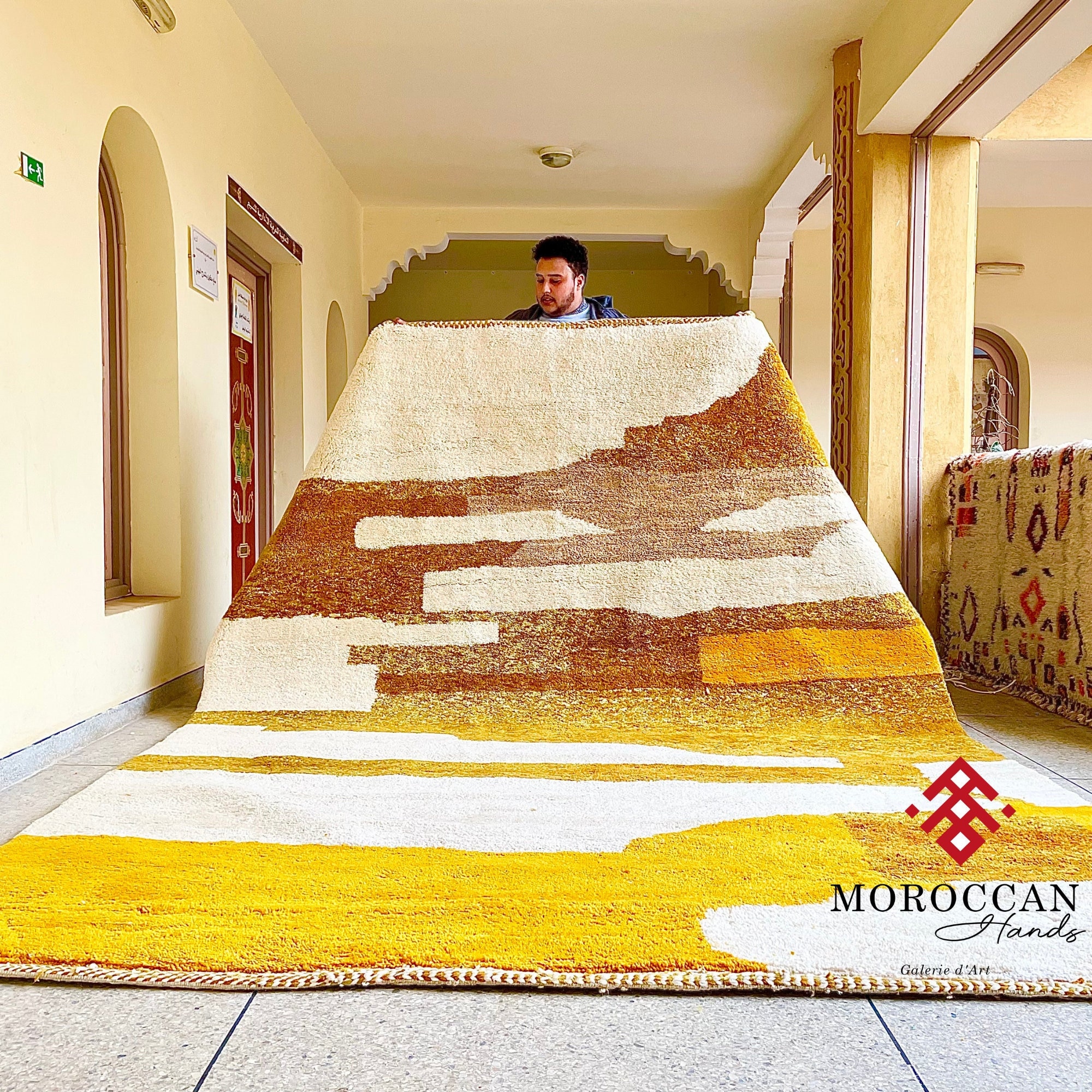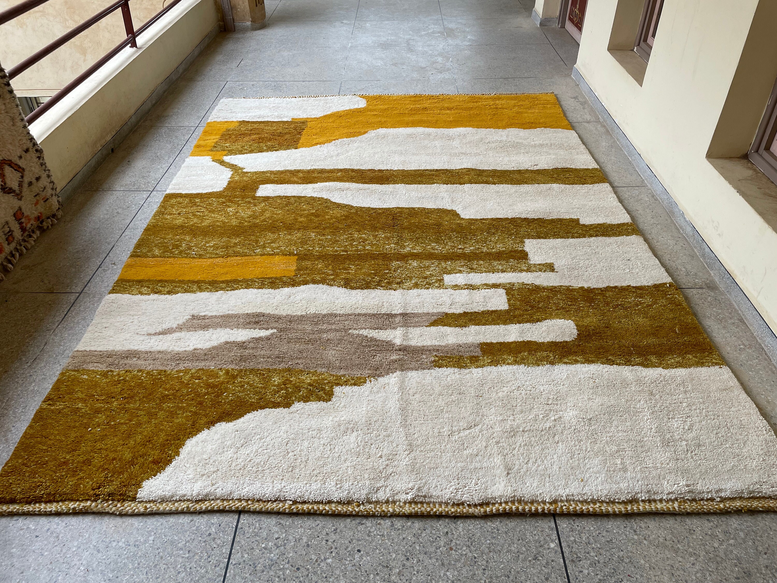Elevate your space with this custom handmade Moroccan rug. Featuring a white and yellow abstract design, this Beni Ourain wool rug is perfect for a bohemian living room or bedroom. Created with soft wool, this area rug offers both cozy comfort and chic style. Add a touch of elegance to your home decor with this unique piece.