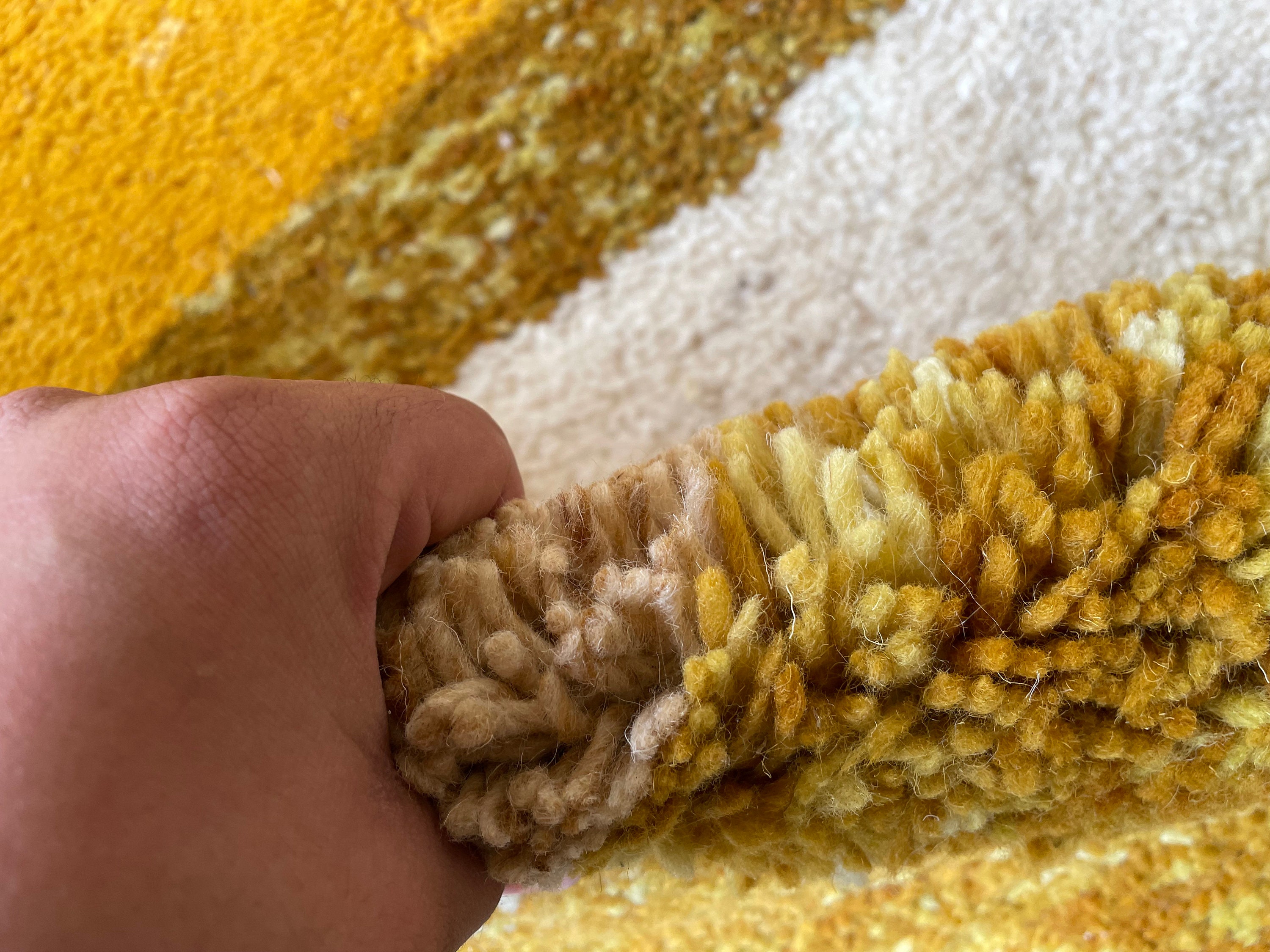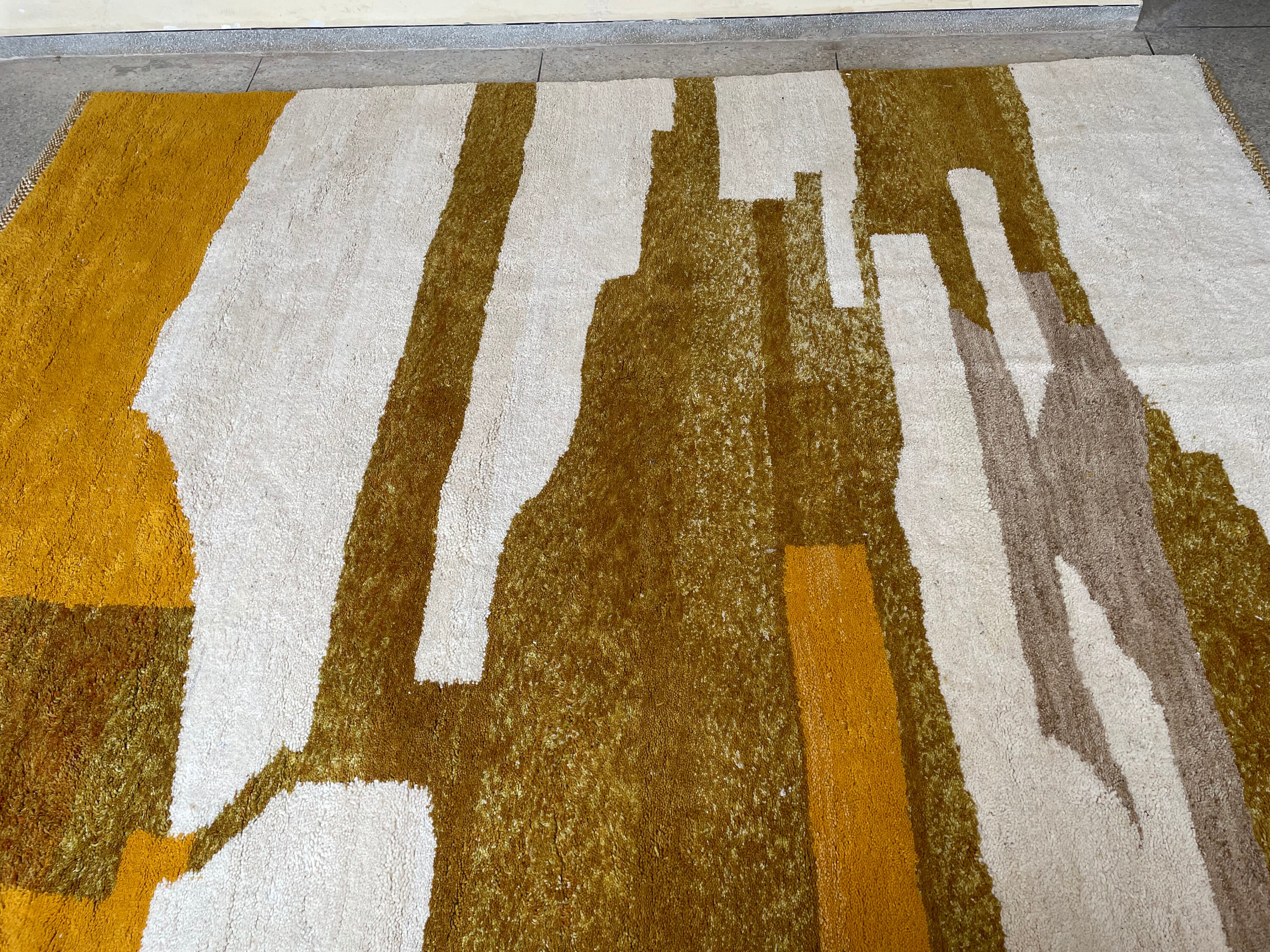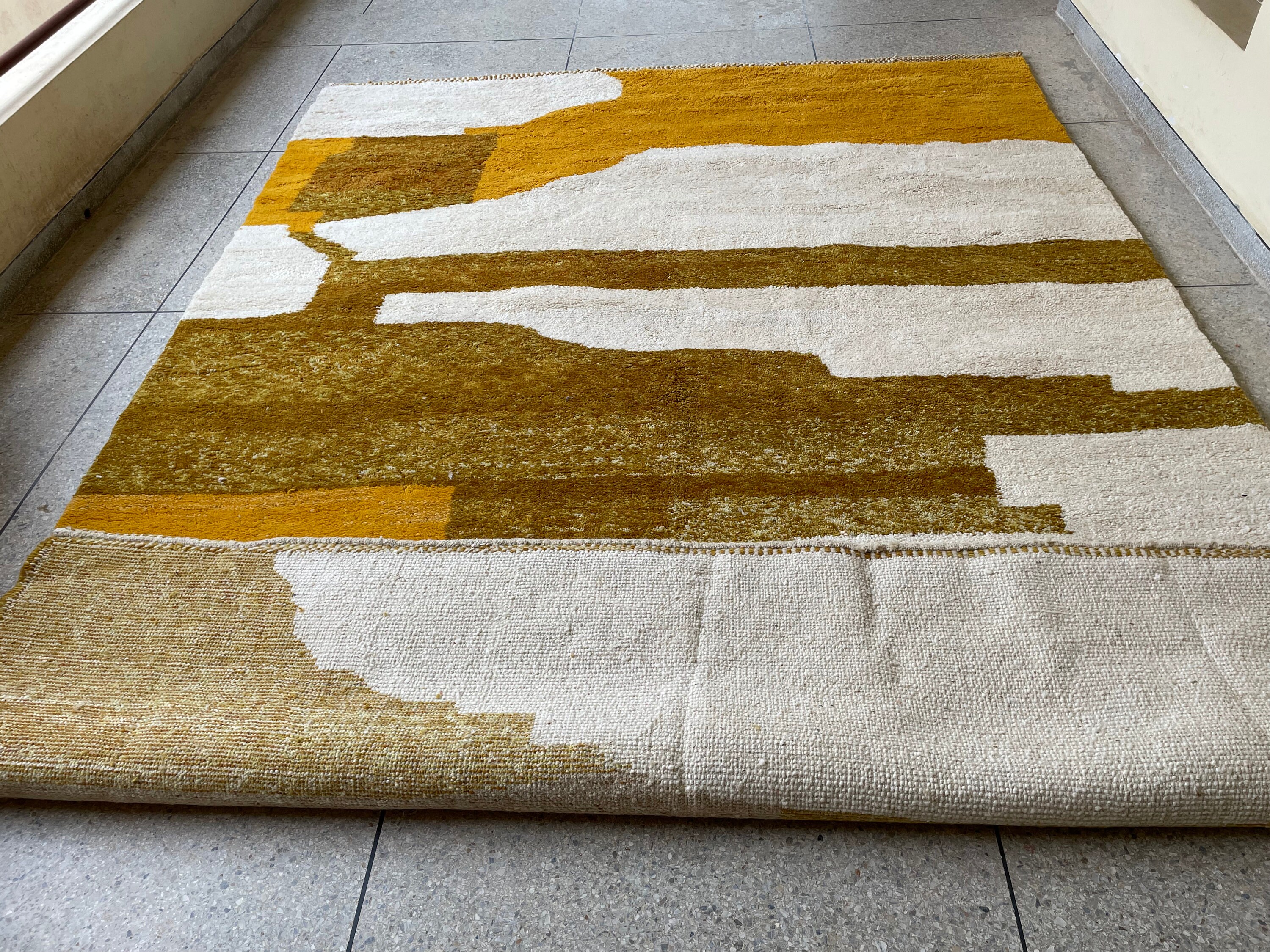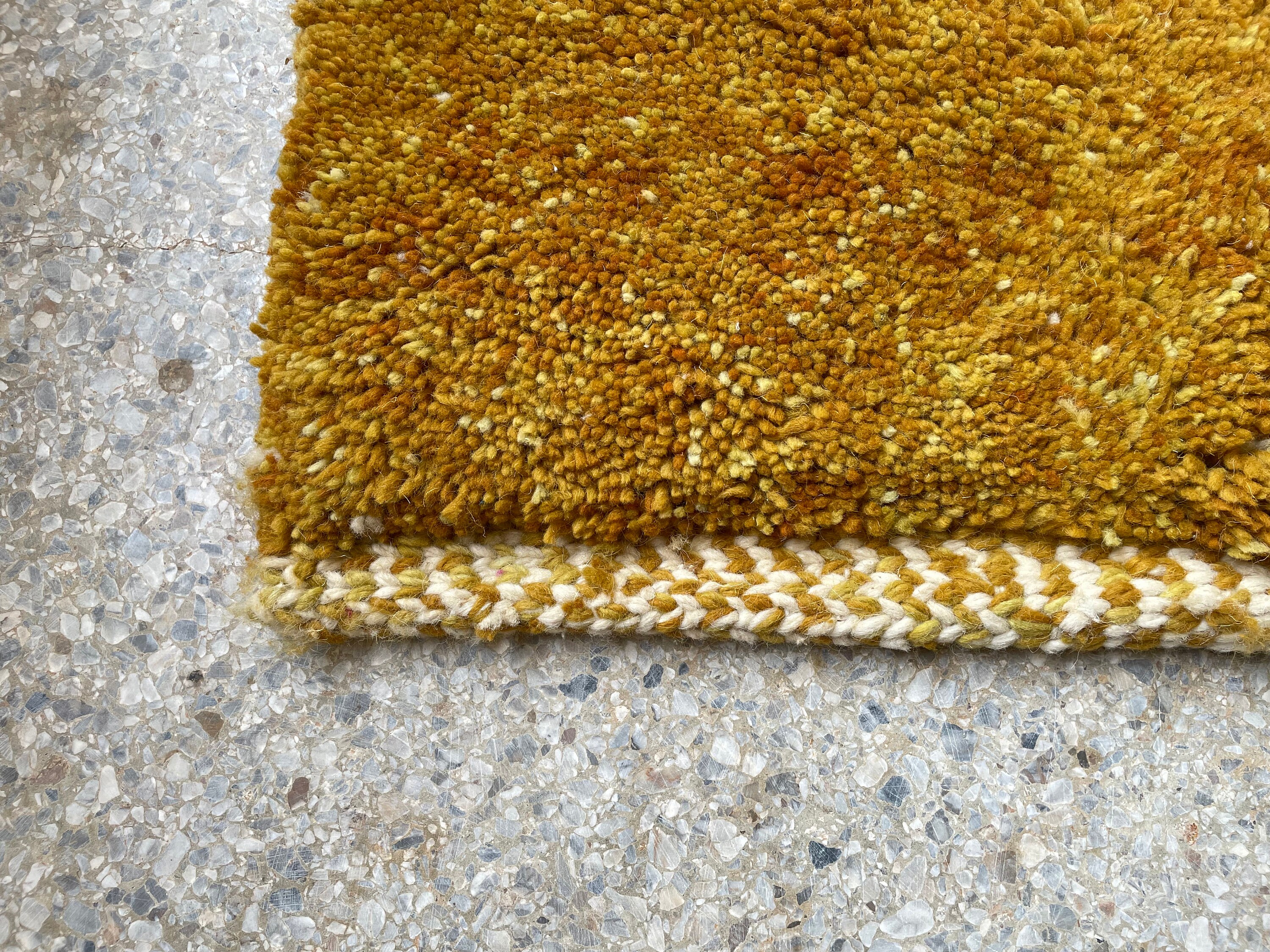 Elevate your space with this custom handmade Moroccan rug. Featuring a white and yellow abstract design, this Beni Ourain wool rug is perfect for a bohemian living room or bedroom. Created with soft wool, this area rug offers both cozy comfort and chic style. Add a touch of elegance to your home decor with this unique piece.