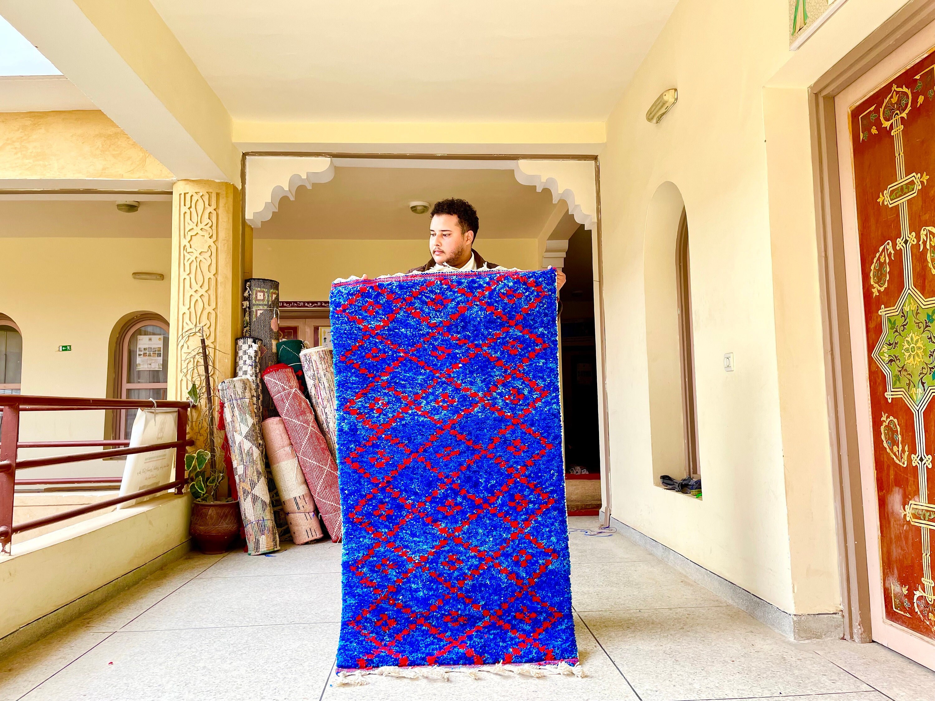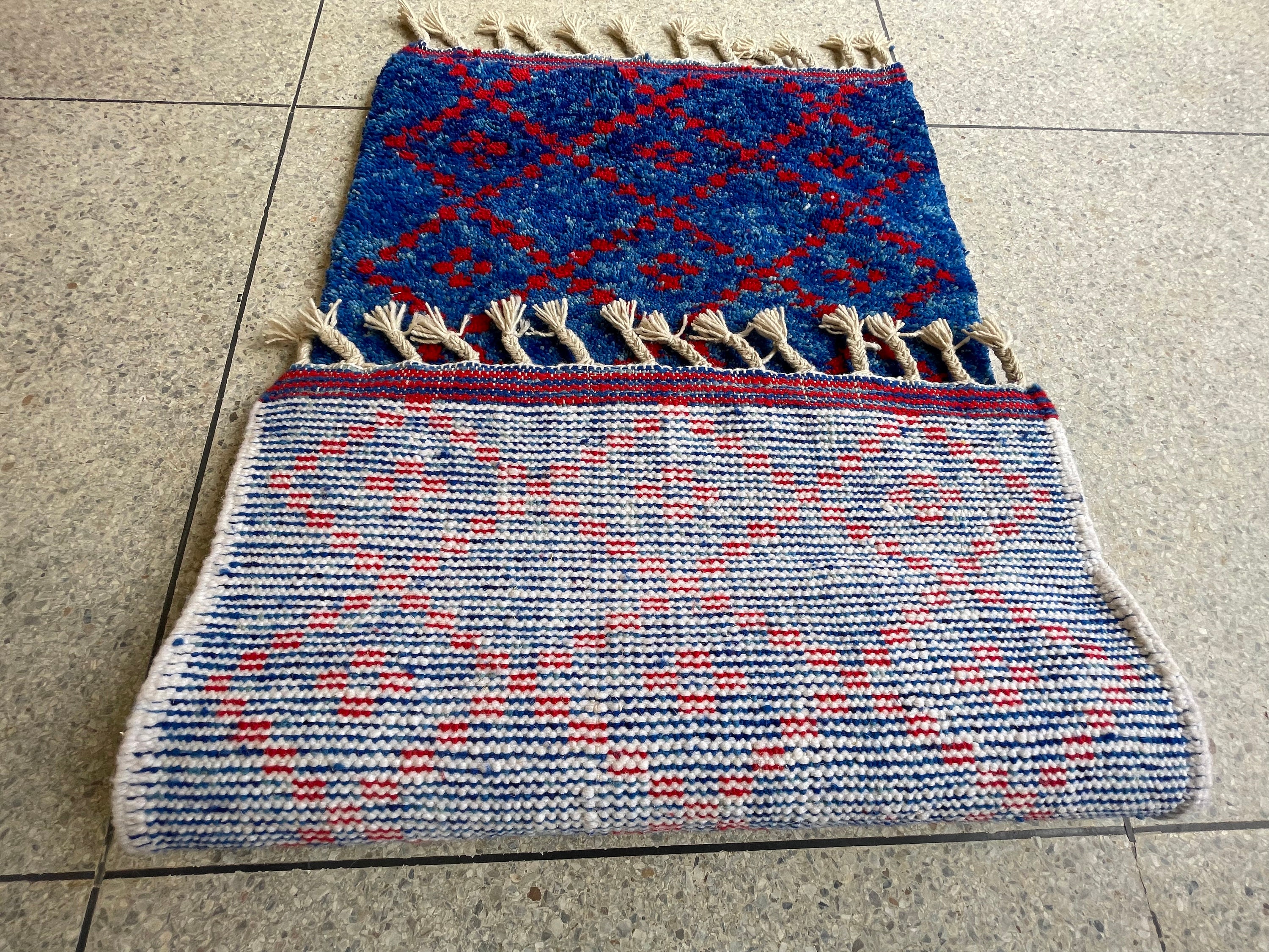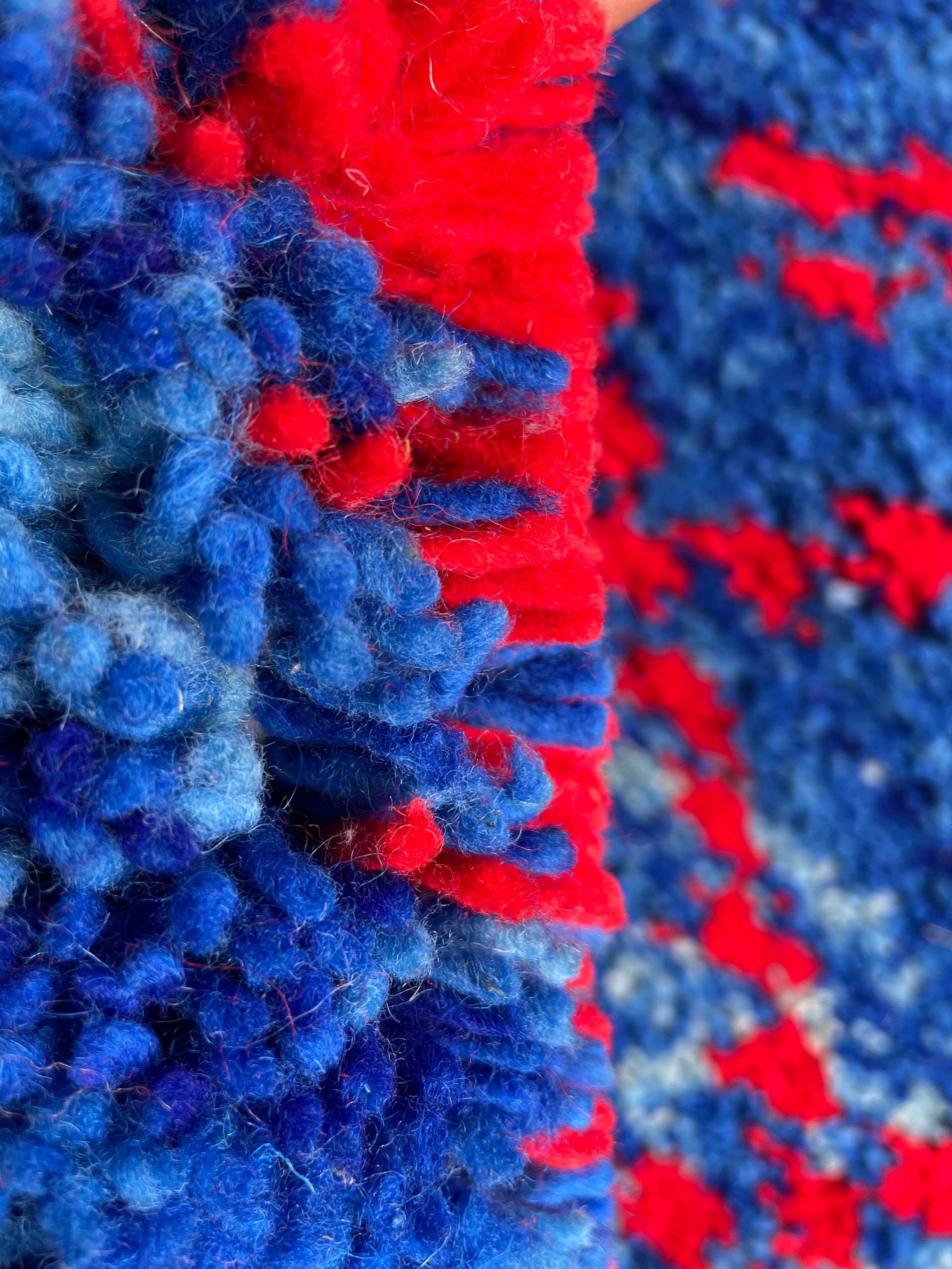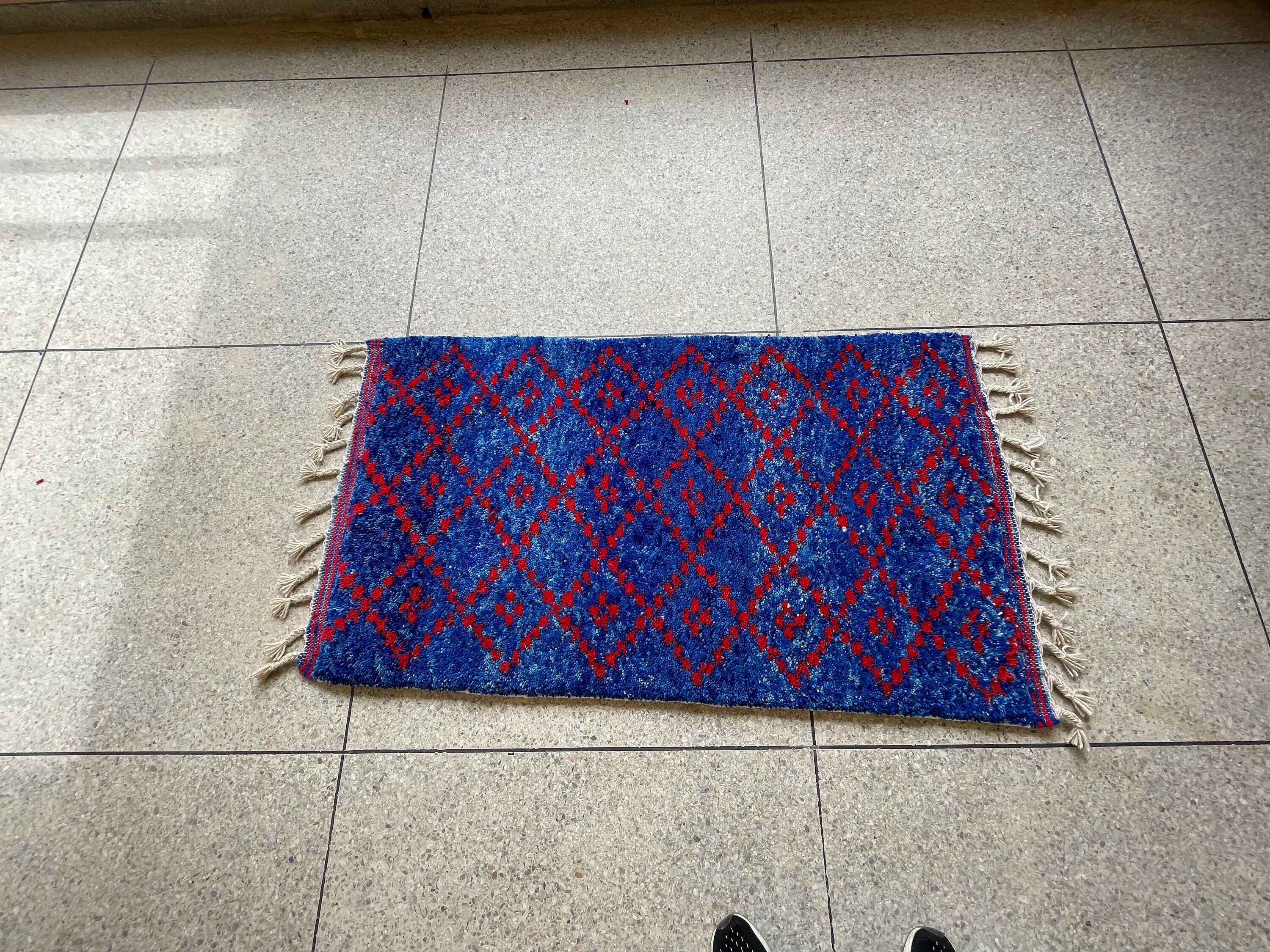 .Artistic Wool Rug, Custom Beni Ourain Rug, Blue and red Wool Rug, Azilal rug, Blue Berber Wool Rug, Unique Geometric Rug, Handwoven Rug.