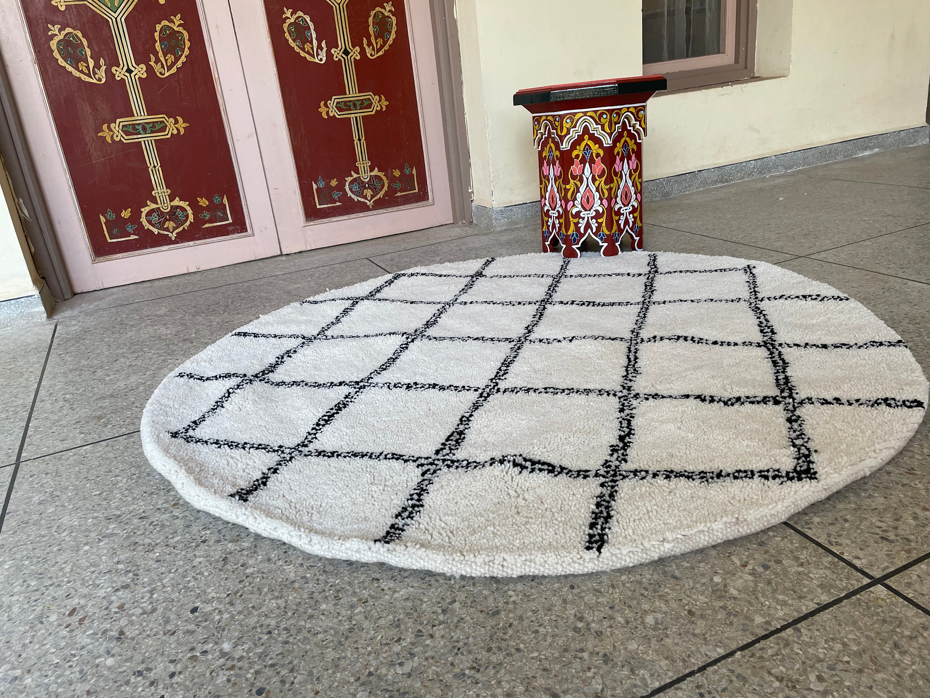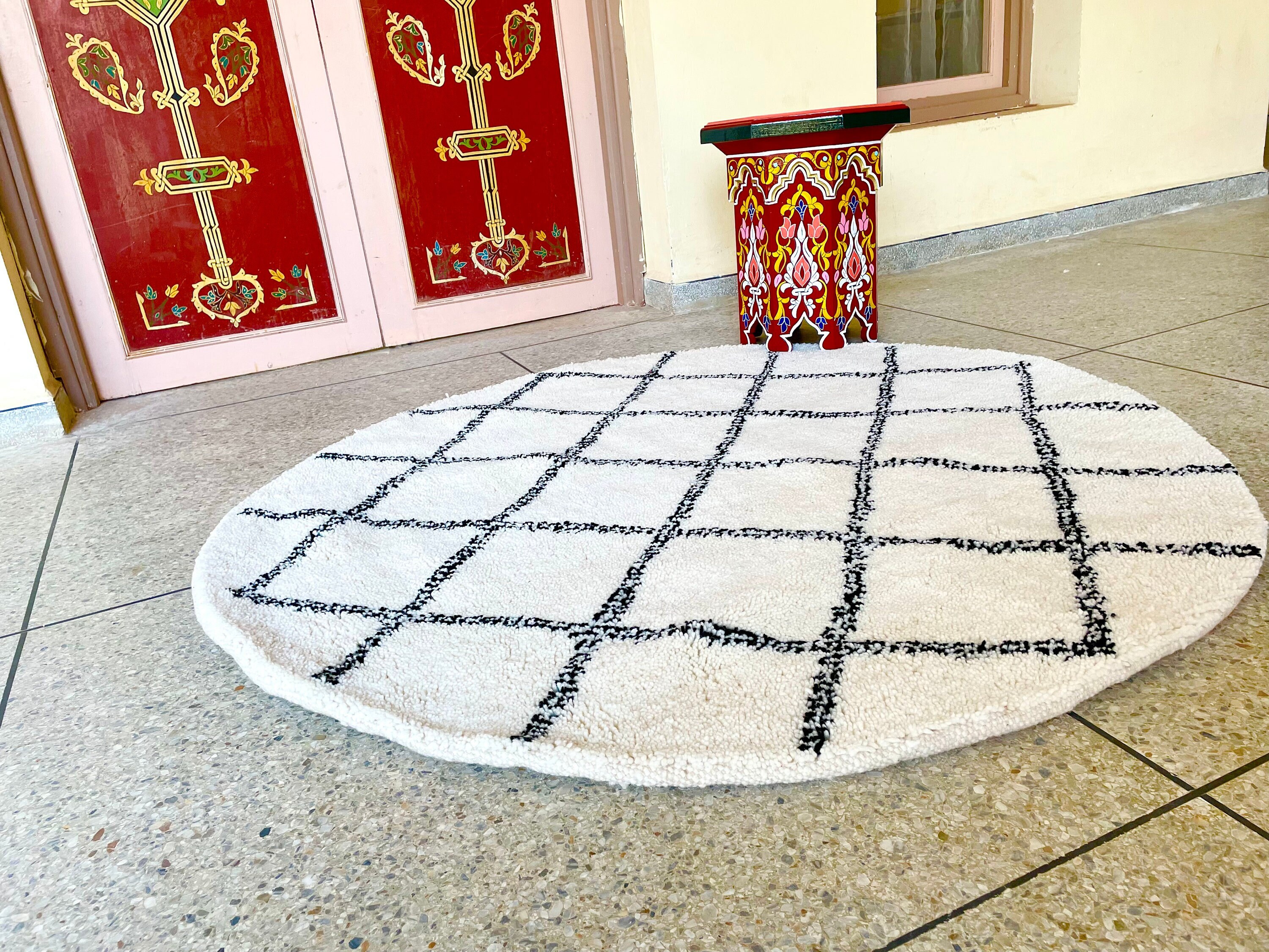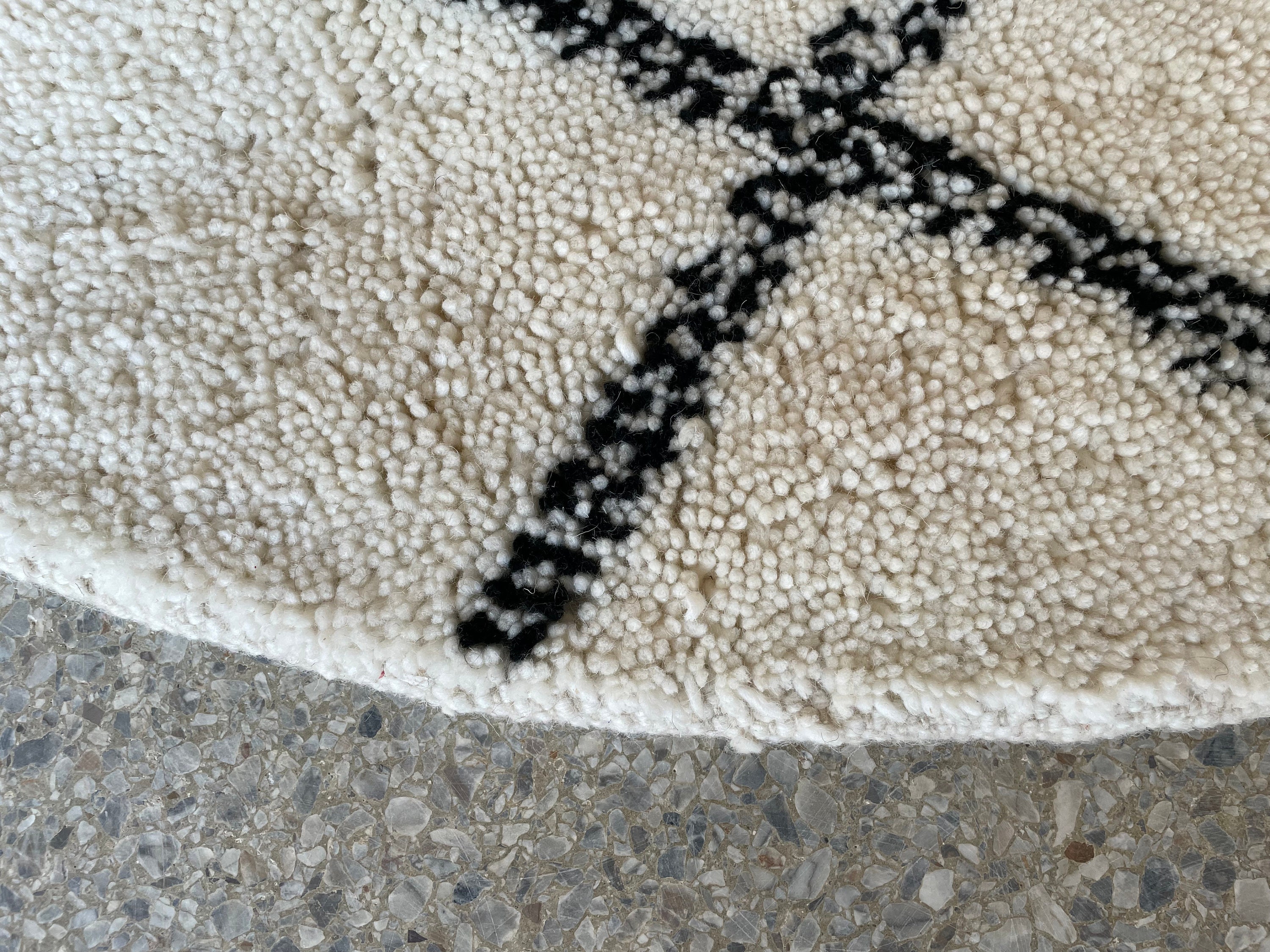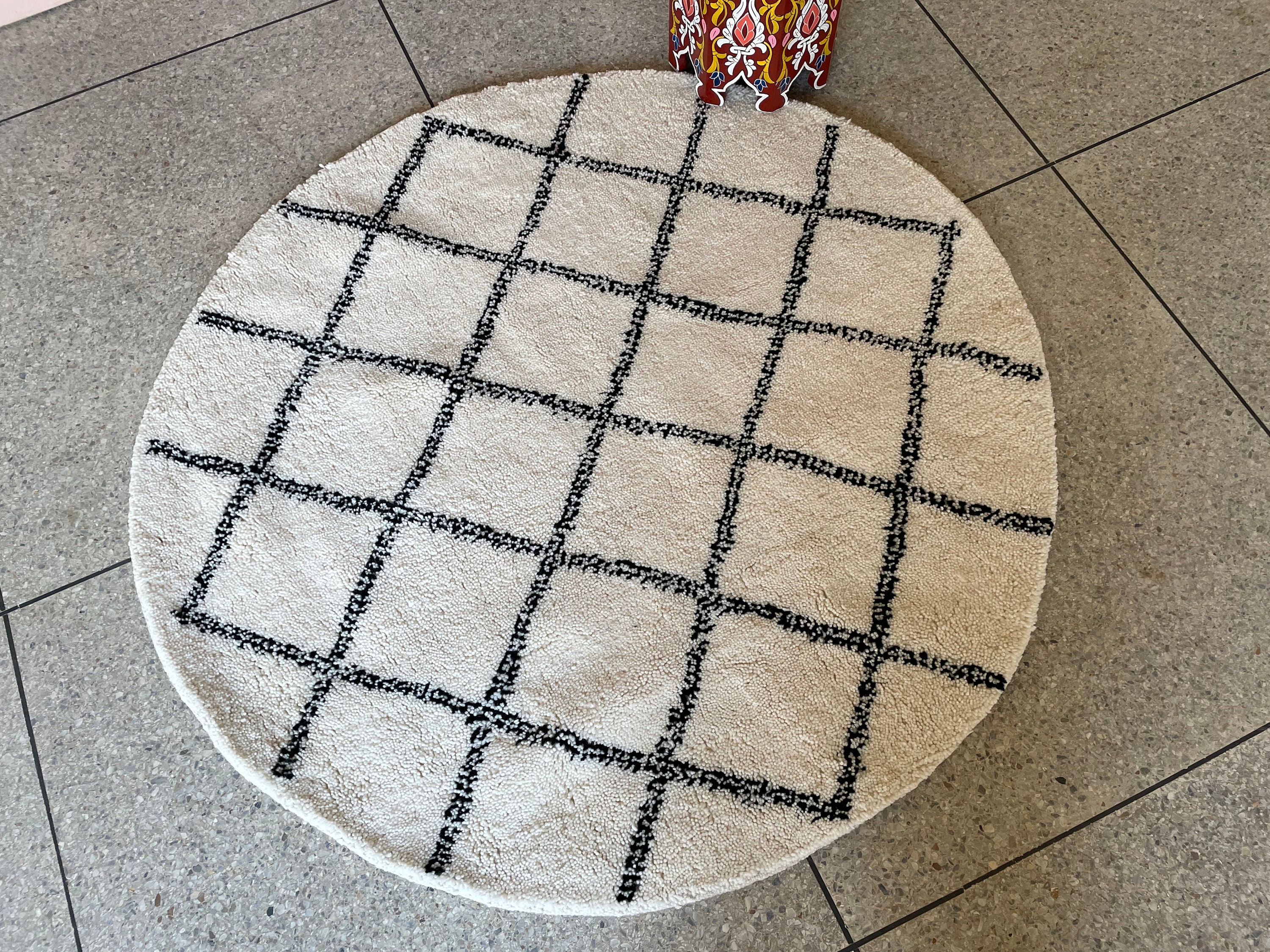 Elevate your interior with this Round Moroccan Beni Ourain Rug, featuring a striking black and white geometric design. Handwoven from soft, high-quality wool by skilled artisans, this custom handmade rug adds a cozy and artistic touch to any bohemian or eclectic living space, be it the living room, bedroom, or study.