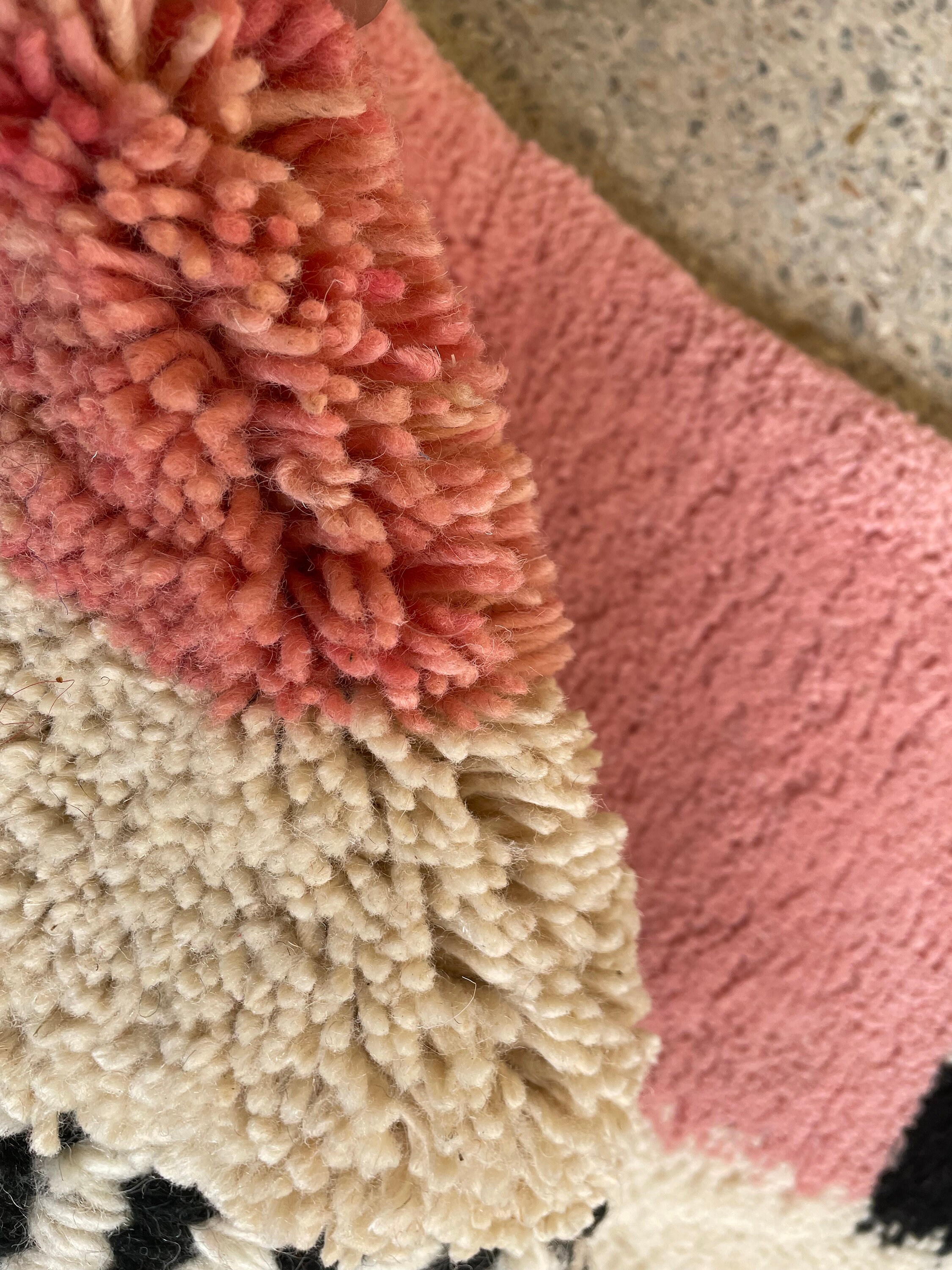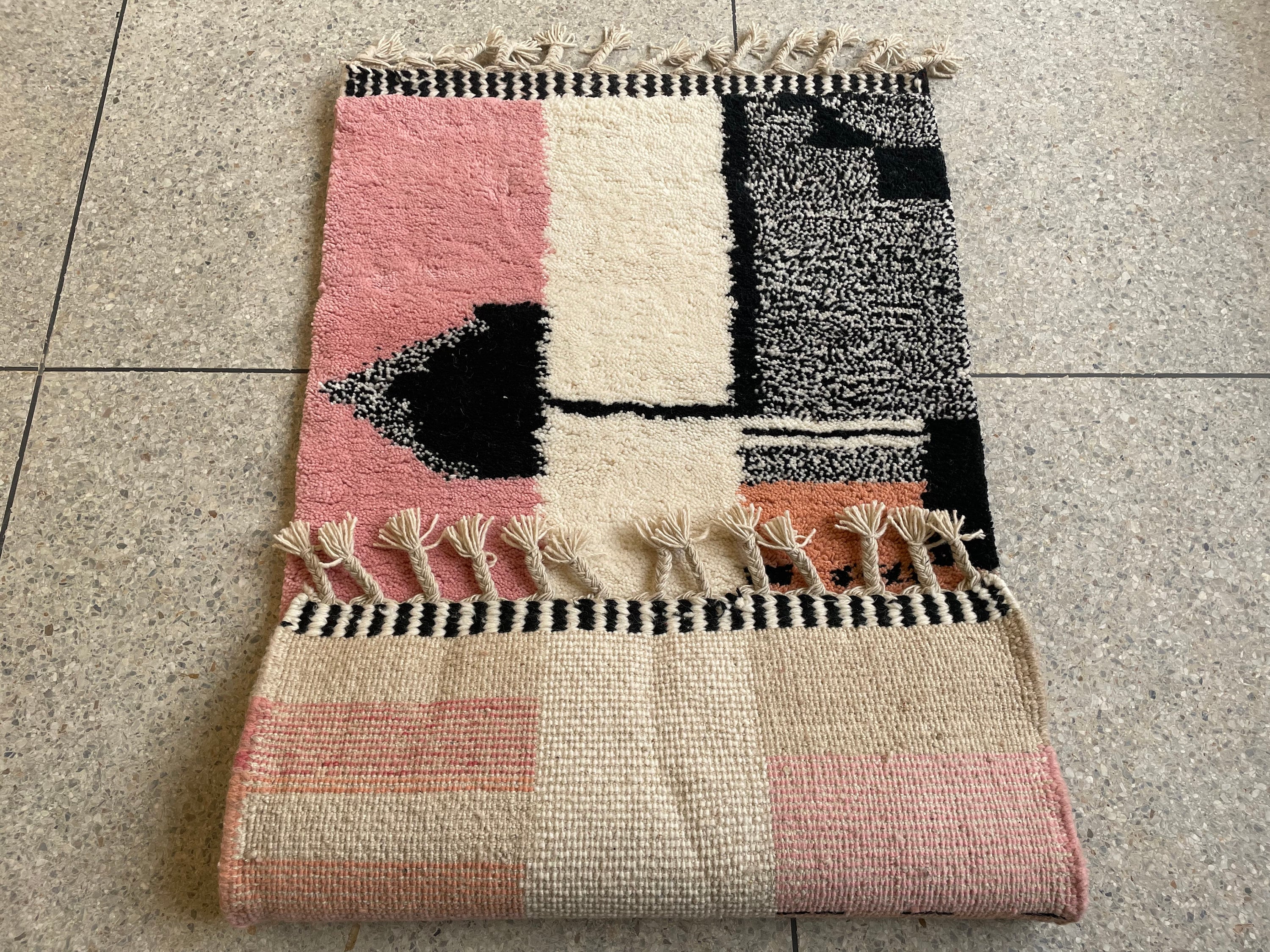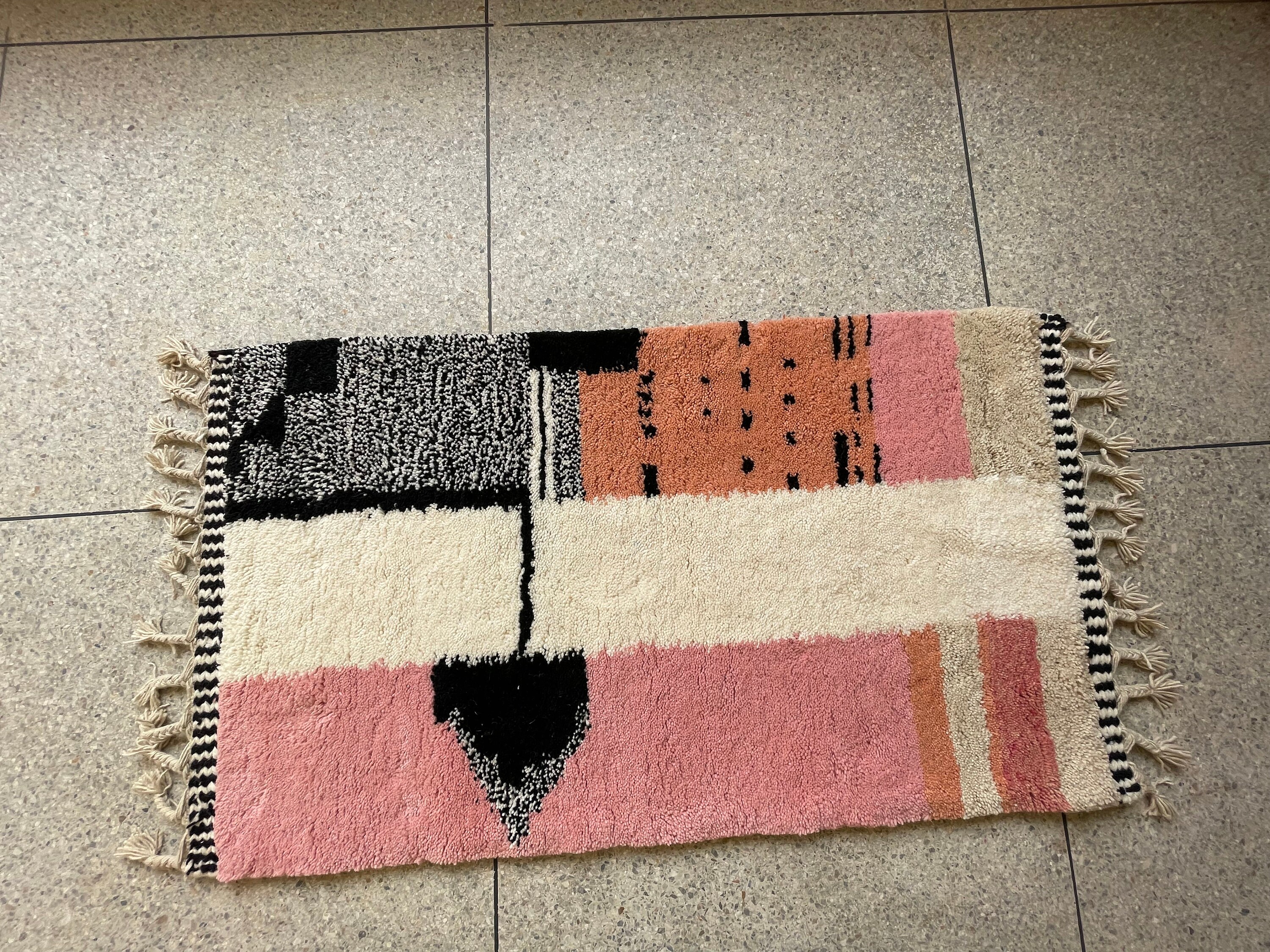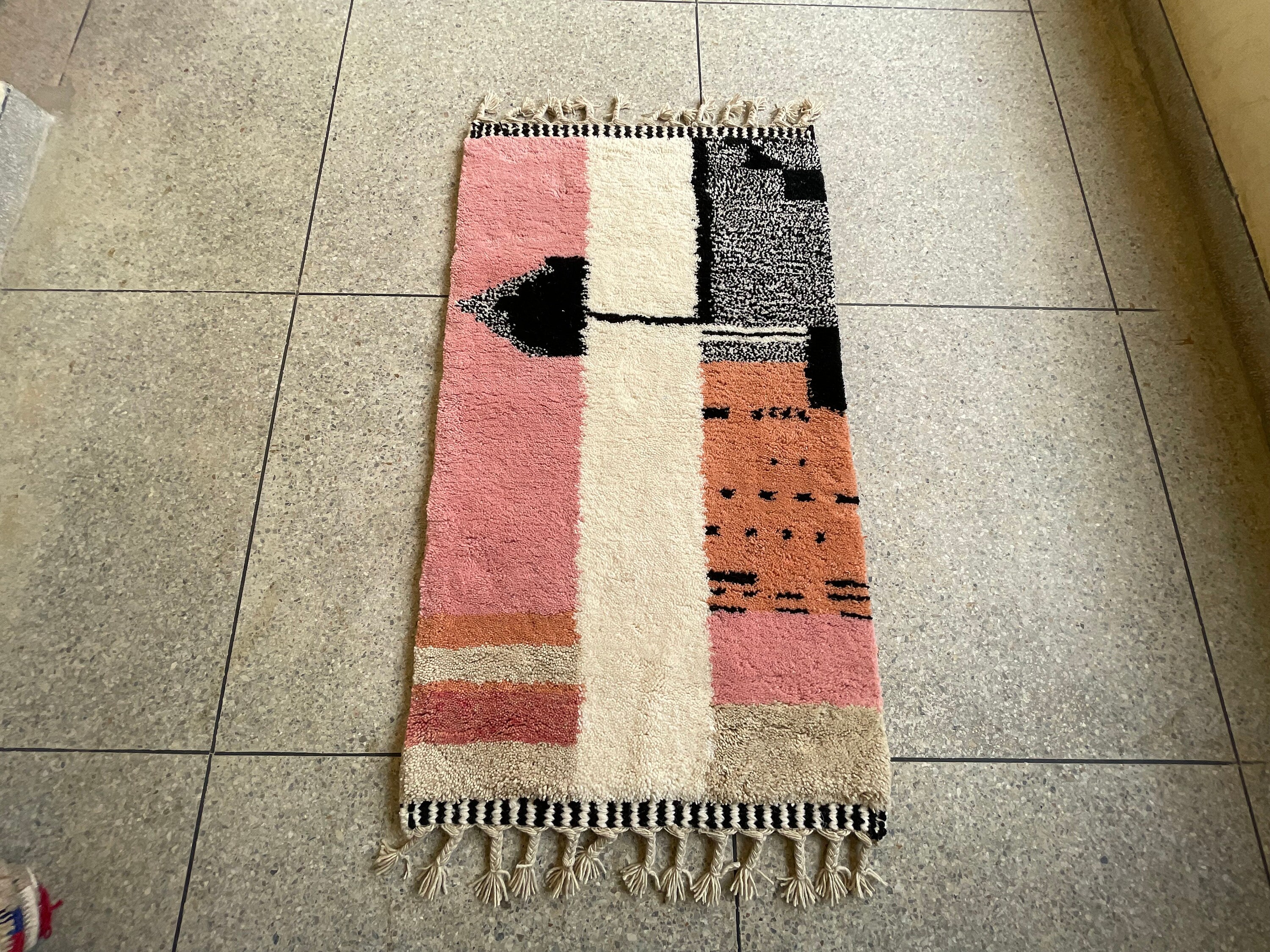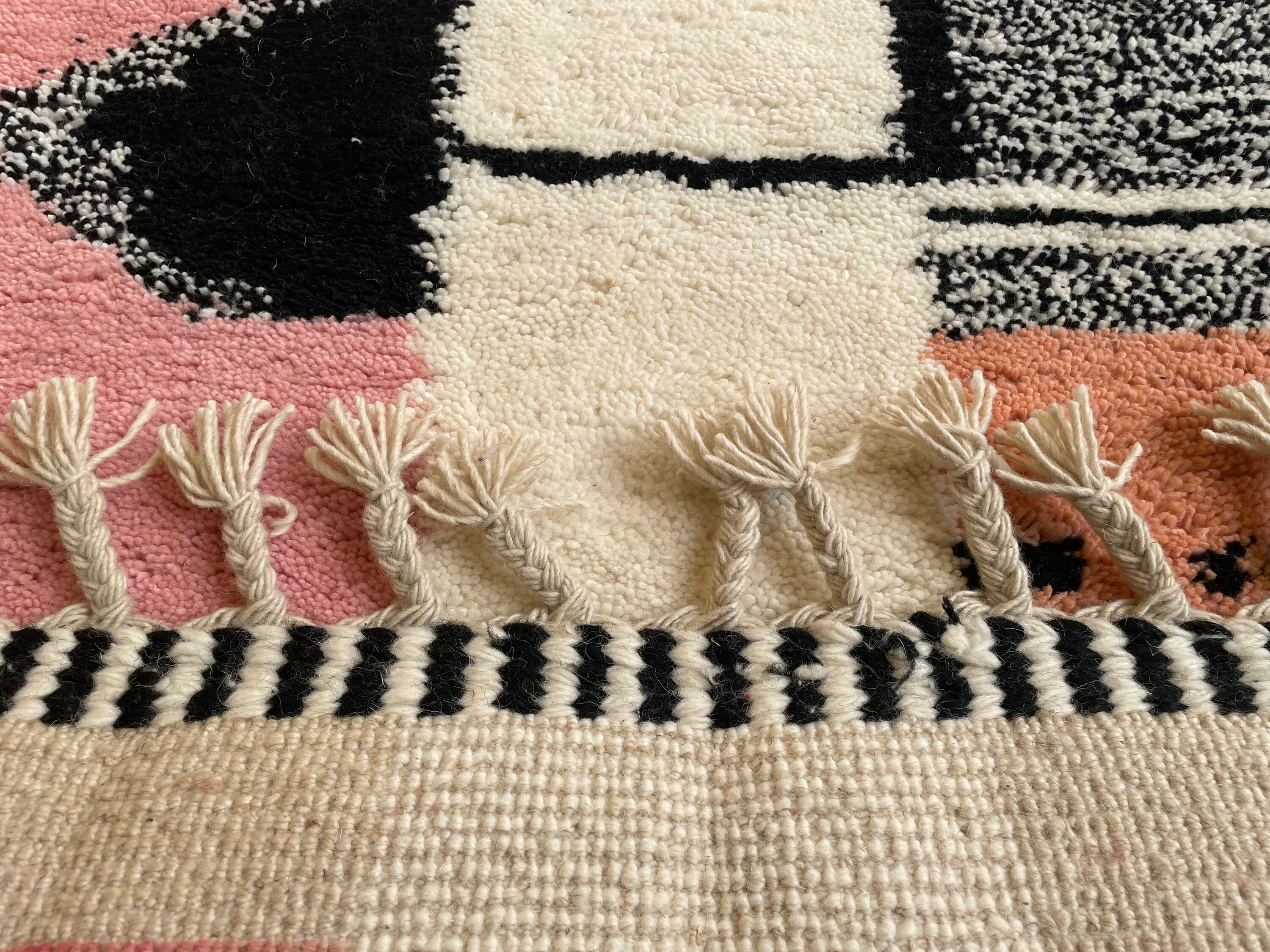Make a bold statement with this pink and black abstract Beni Ourain rug. Handcrafted by MoroccanHandsArt using soft sheep wool, this bohemian area rug is perfect for modern living rooms or bedrooms. Its vibrant design and eco-friendly materials make it a sustainable and stylish choice for any space. Elevate your decor with this luxurious, artisan-crafted Moroccan rug today!