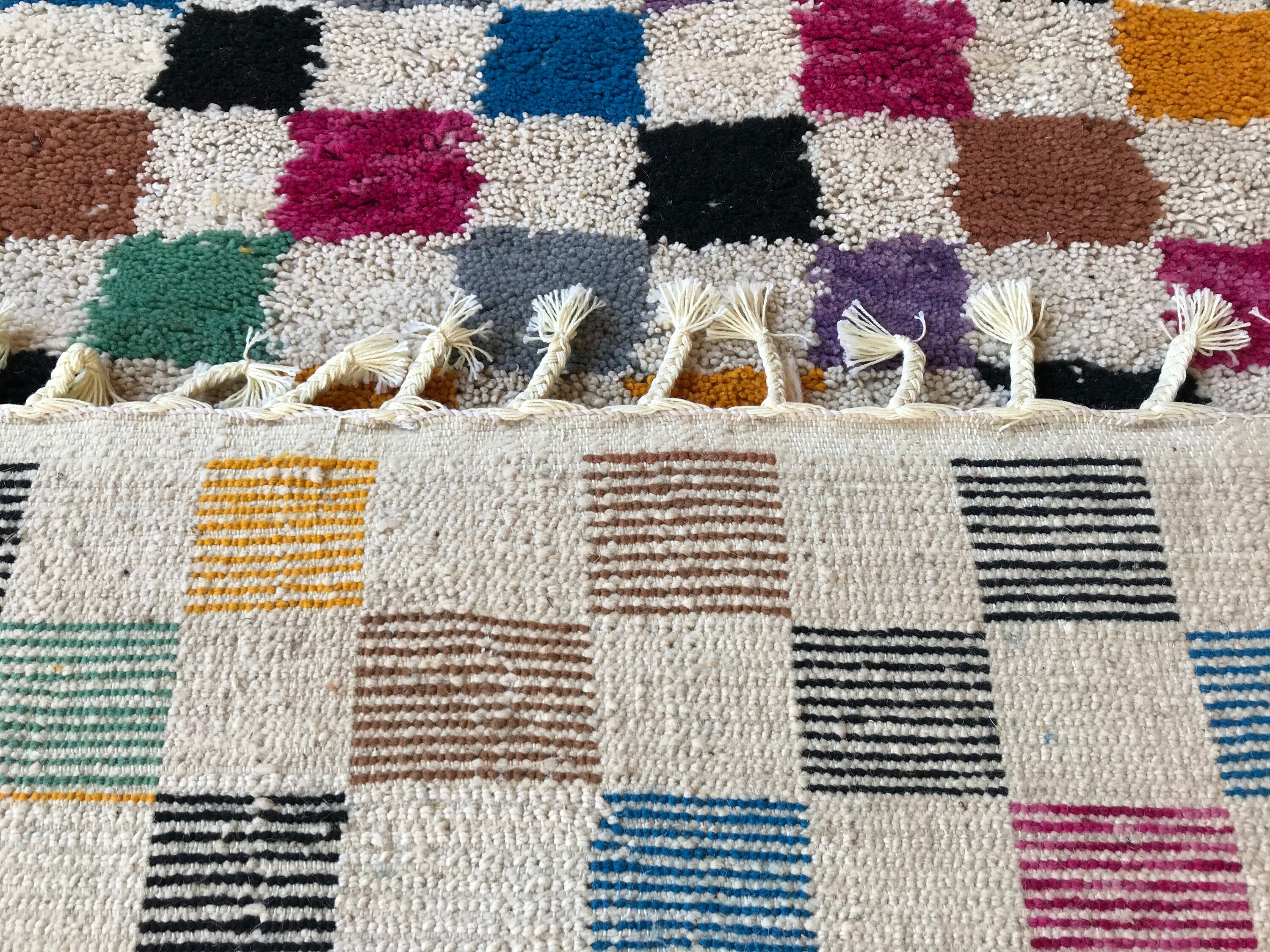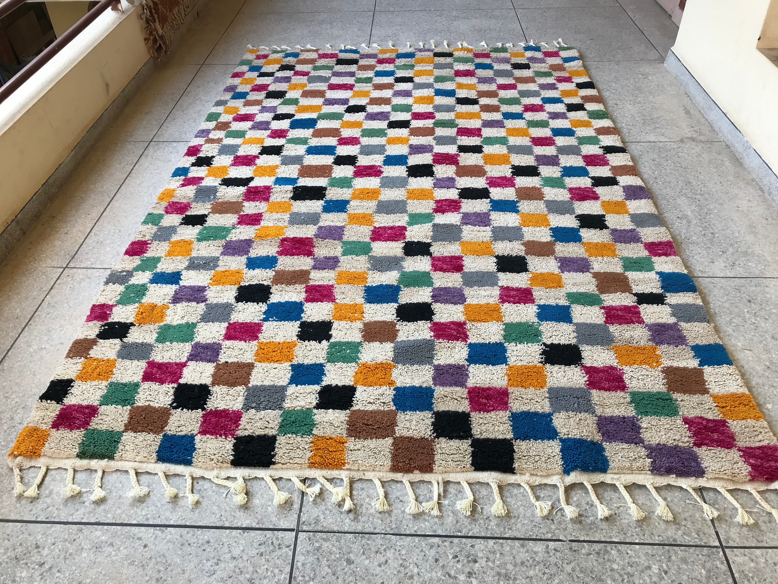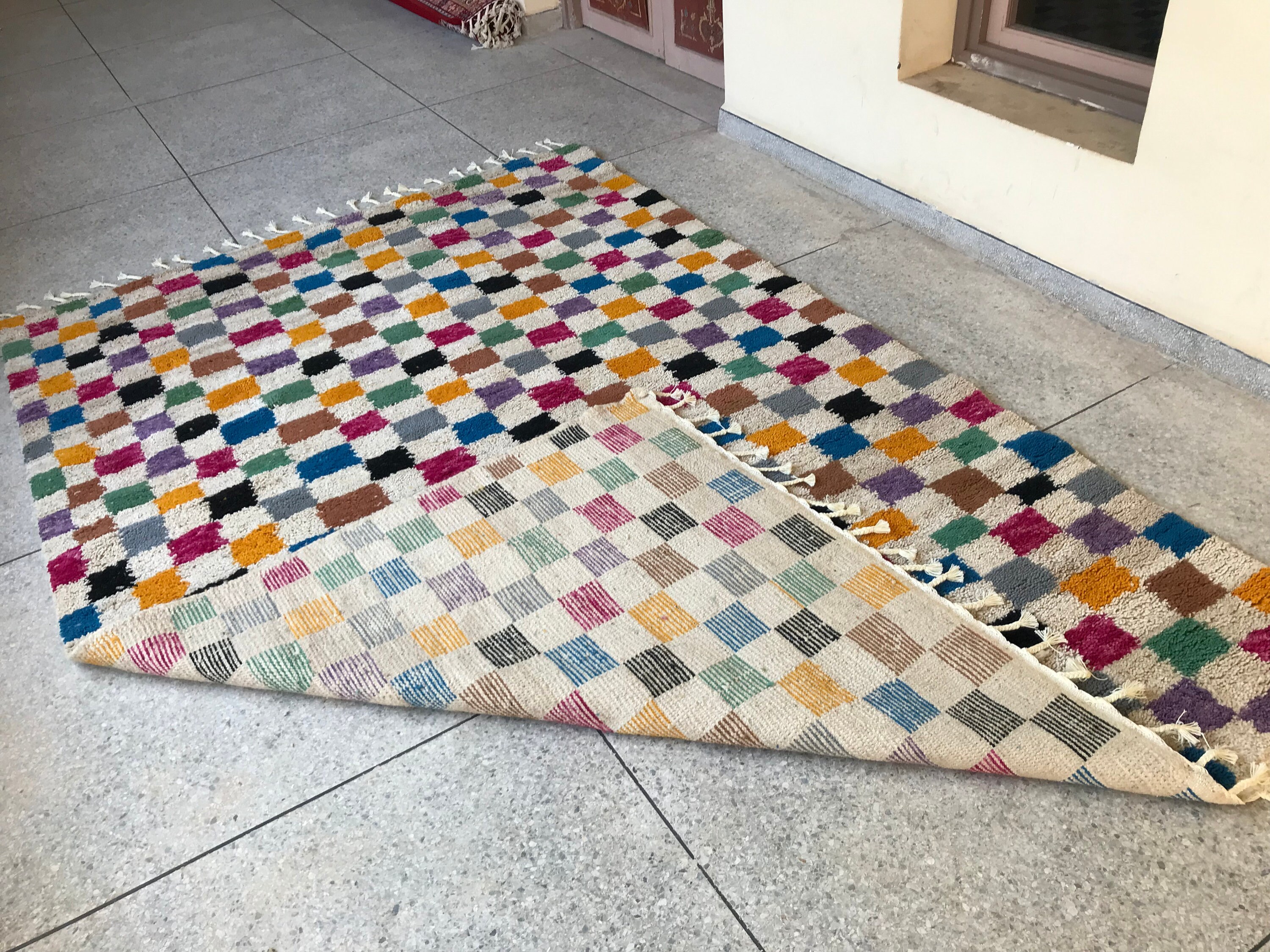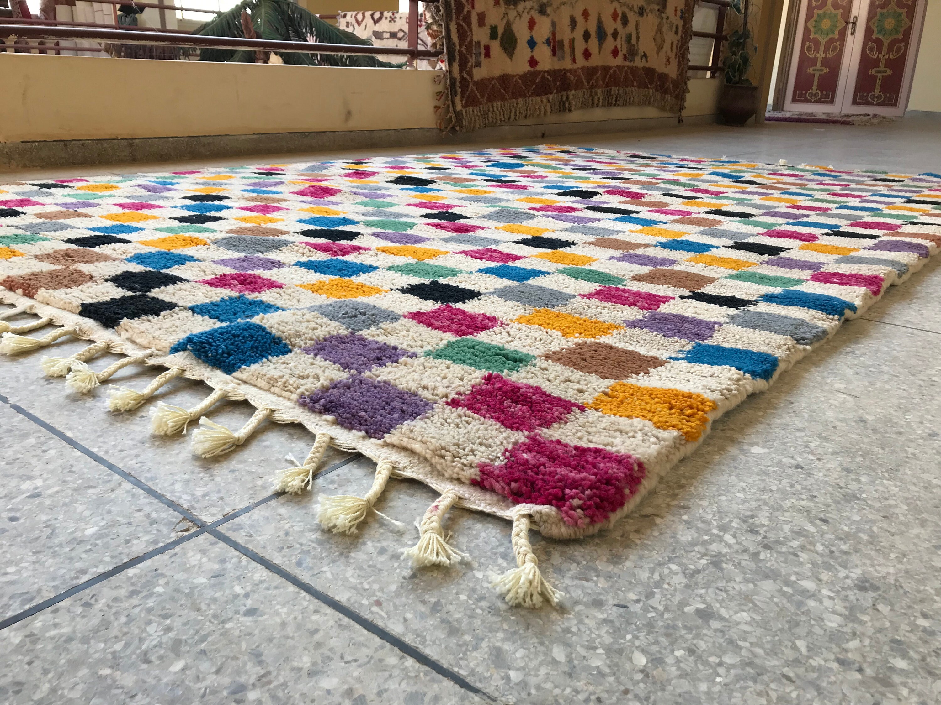 Enhance your vibrant living room decor with this custom colorful handmade wool rug. This checkered Moroccan rug features a multicolor Beni Ourain design, adding a touch of bohemian style to your space. Elevate your home with this unique and eye-catching area rug today!