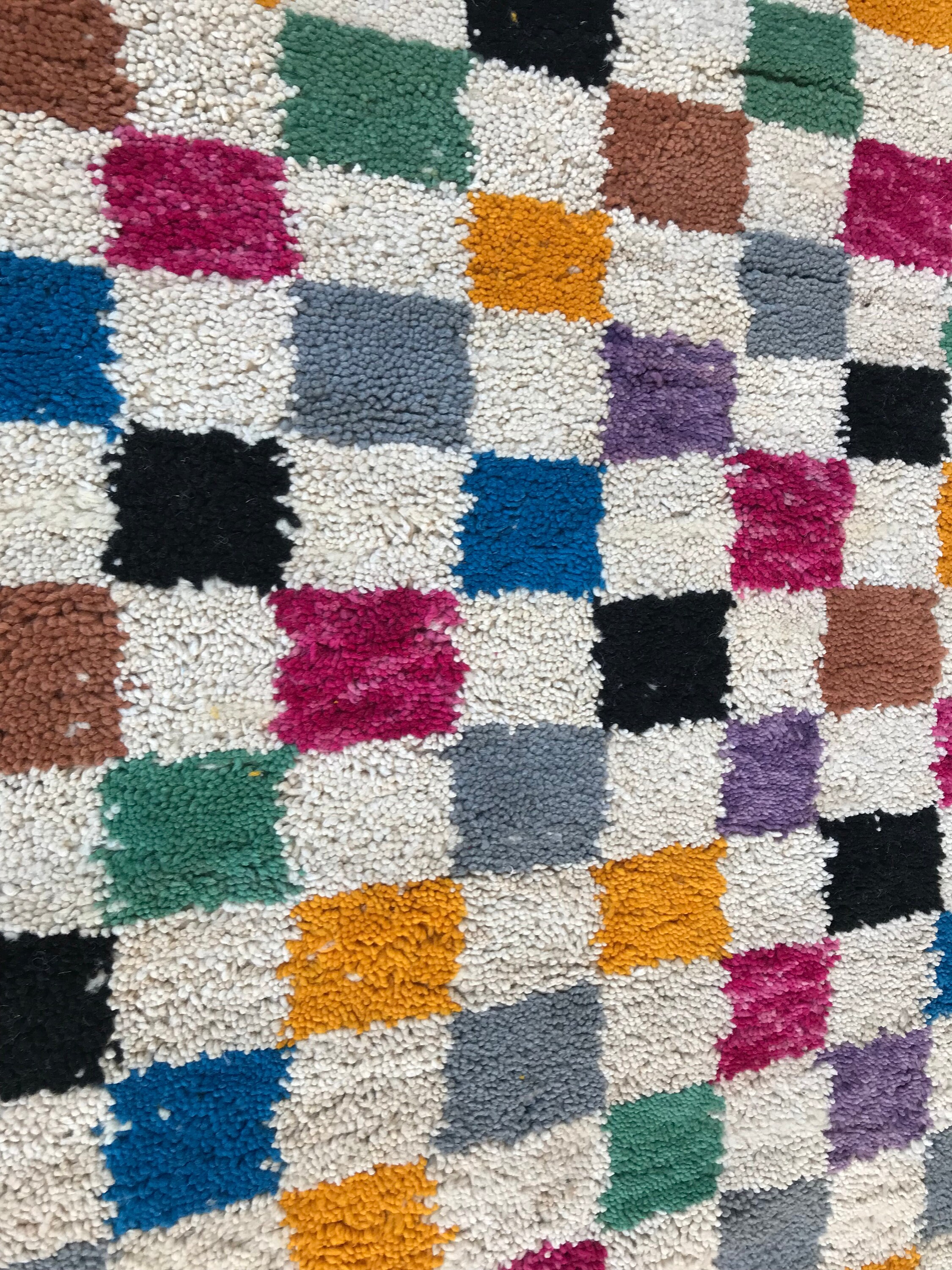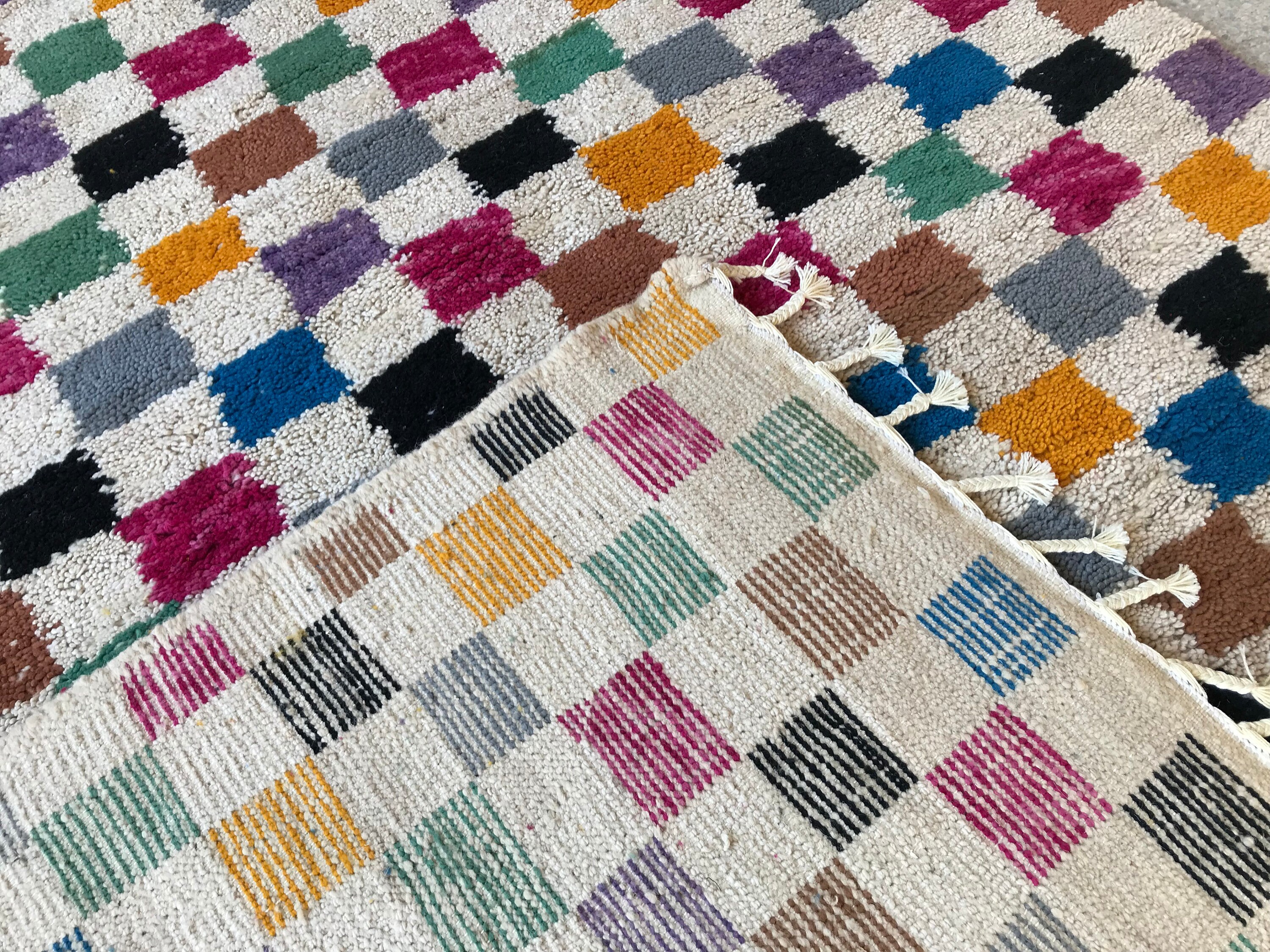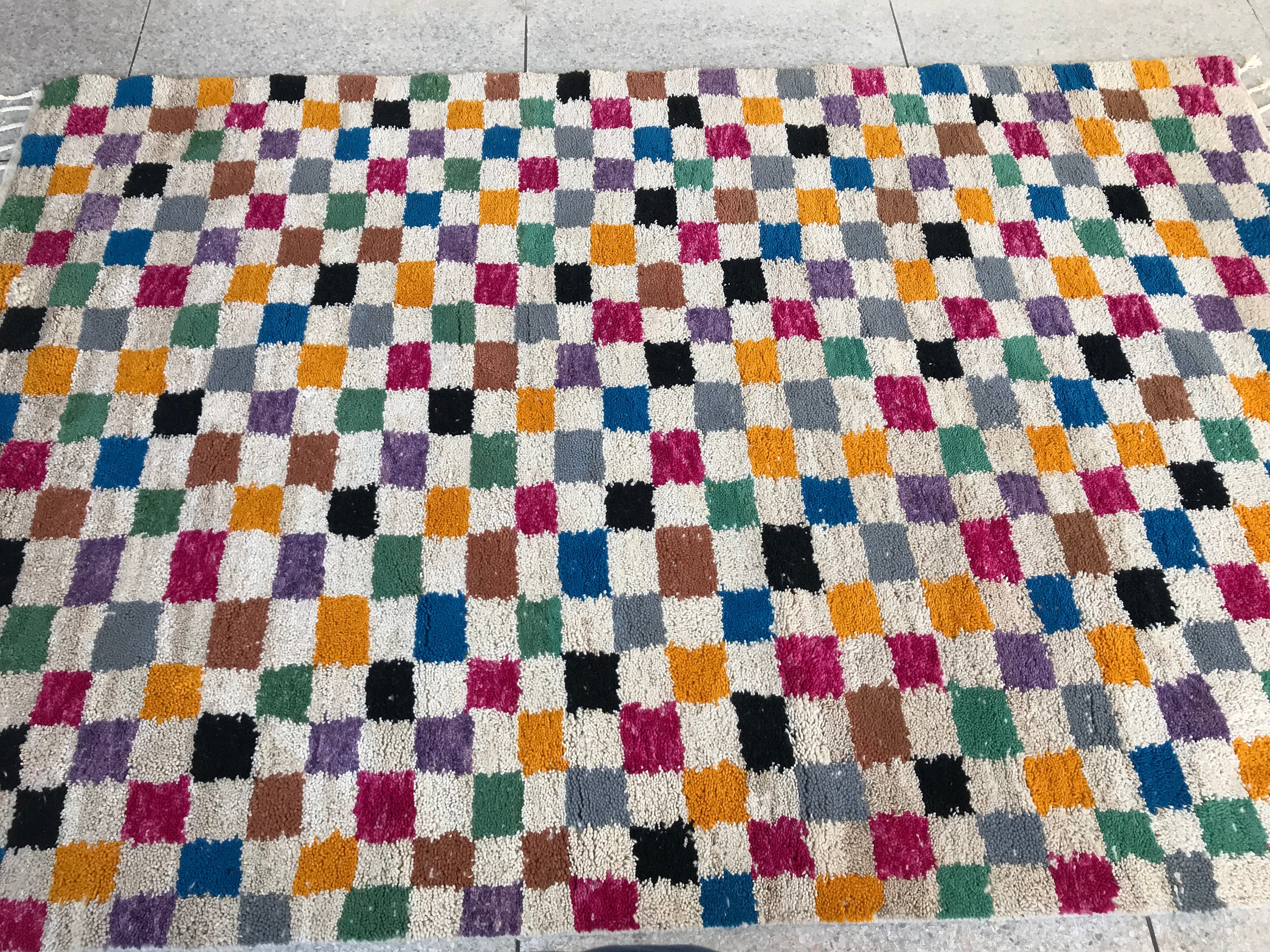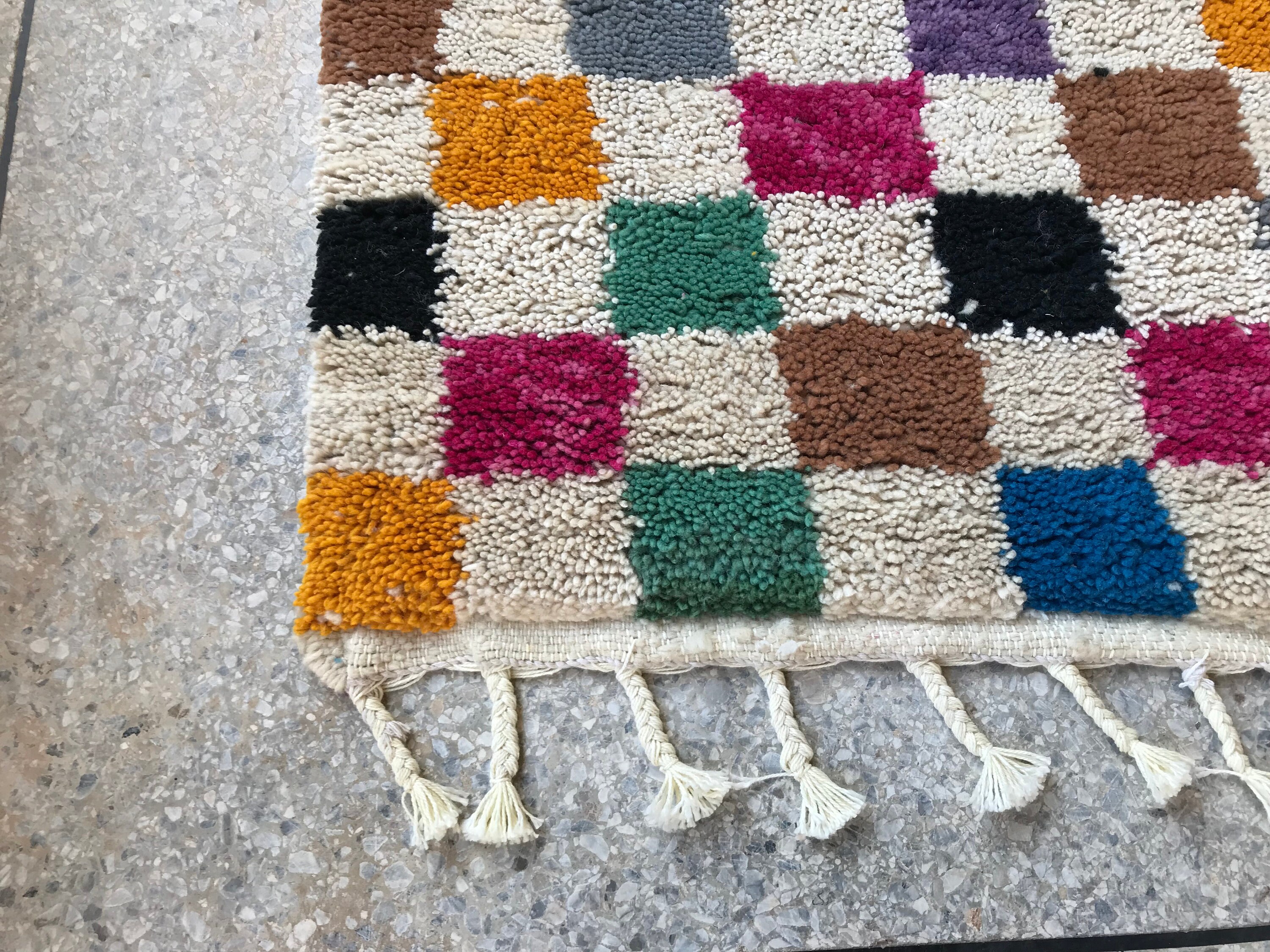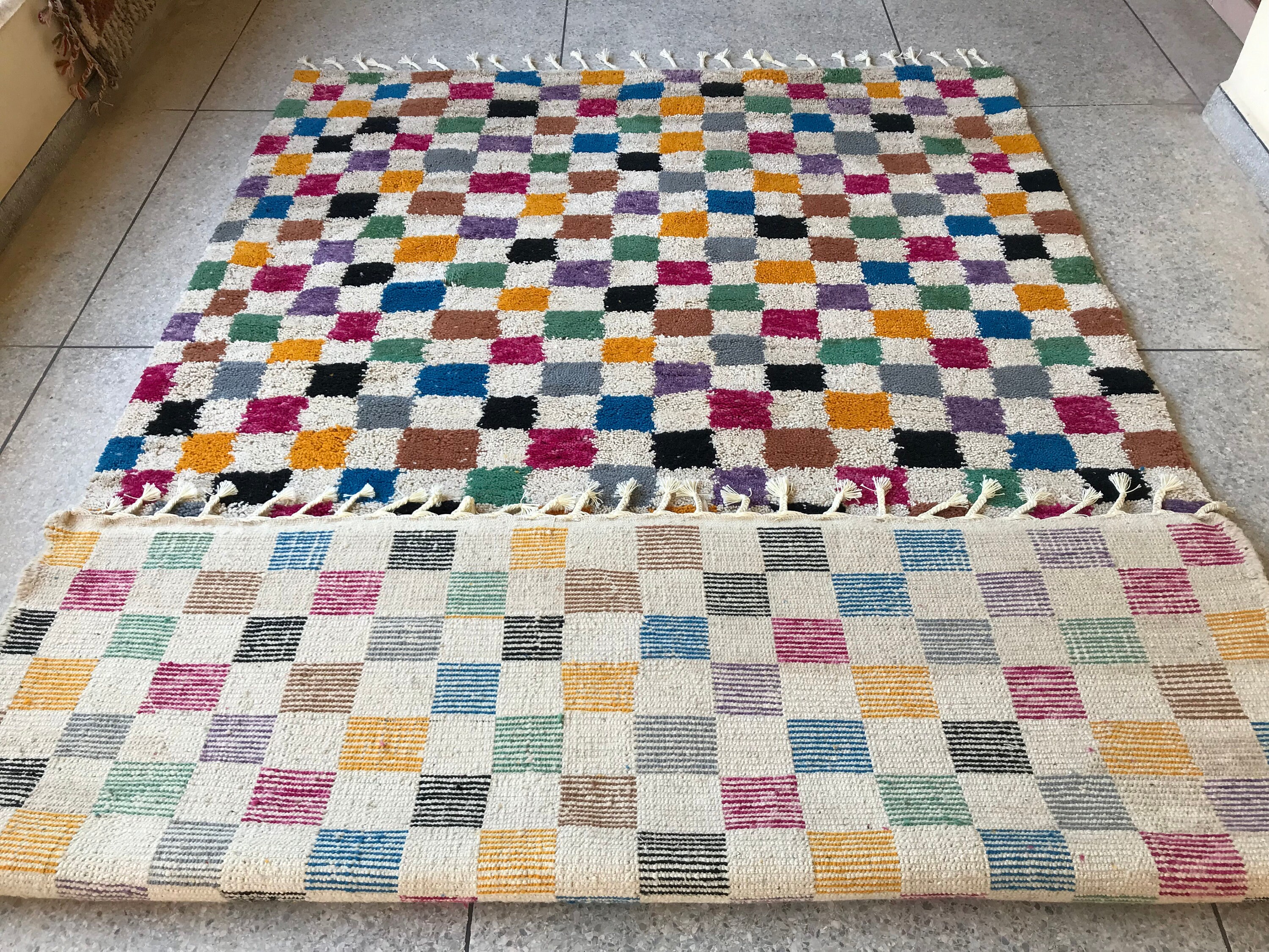 Enhance your vibrant living room decor with this custom colorful handmade wool rug. This checkered Moroccan rug features a multicolor Beni Ourain design, adding a touch of bohemian style to your space. Elevate your home with this unique and eye-catching area rug today!