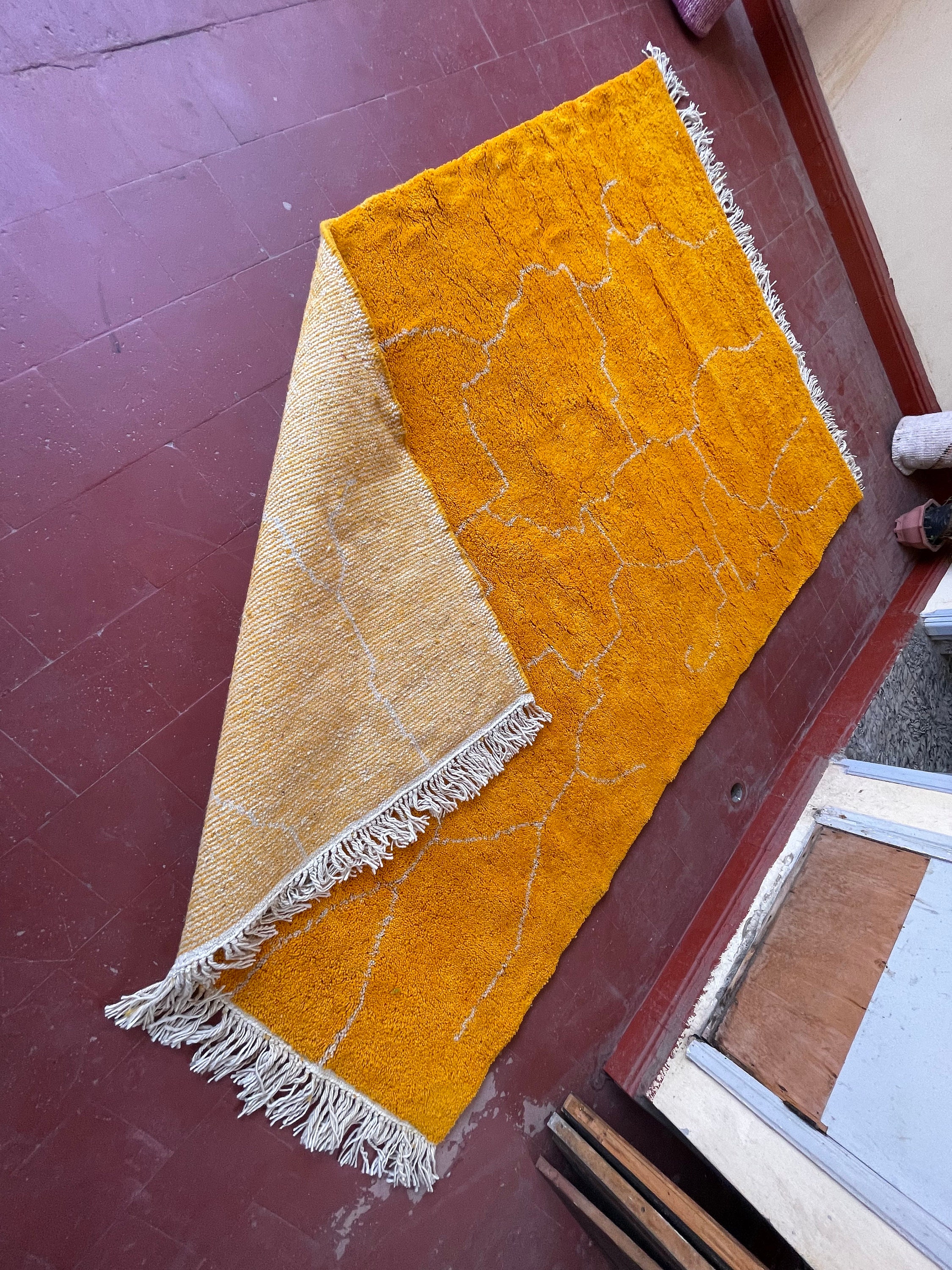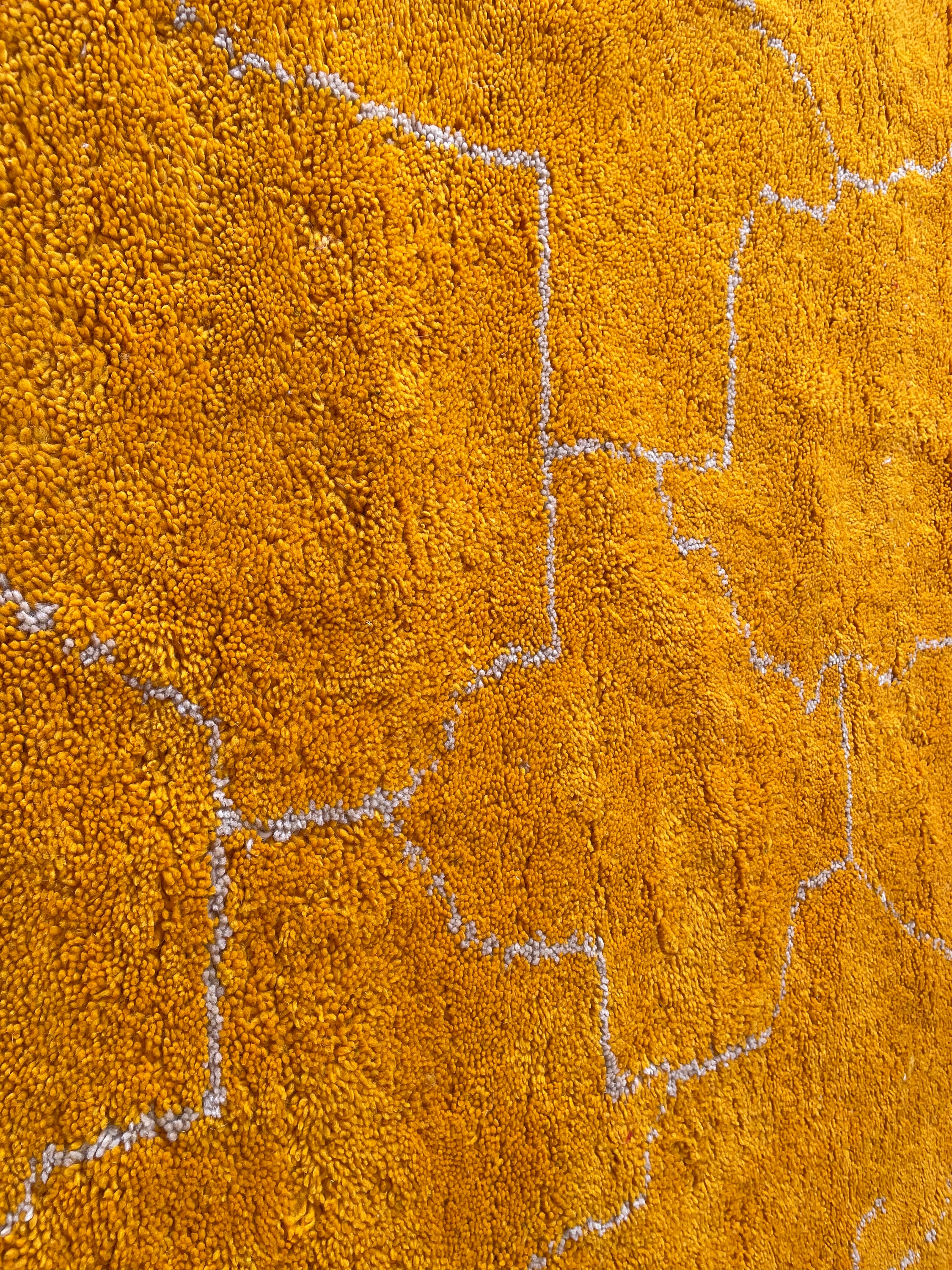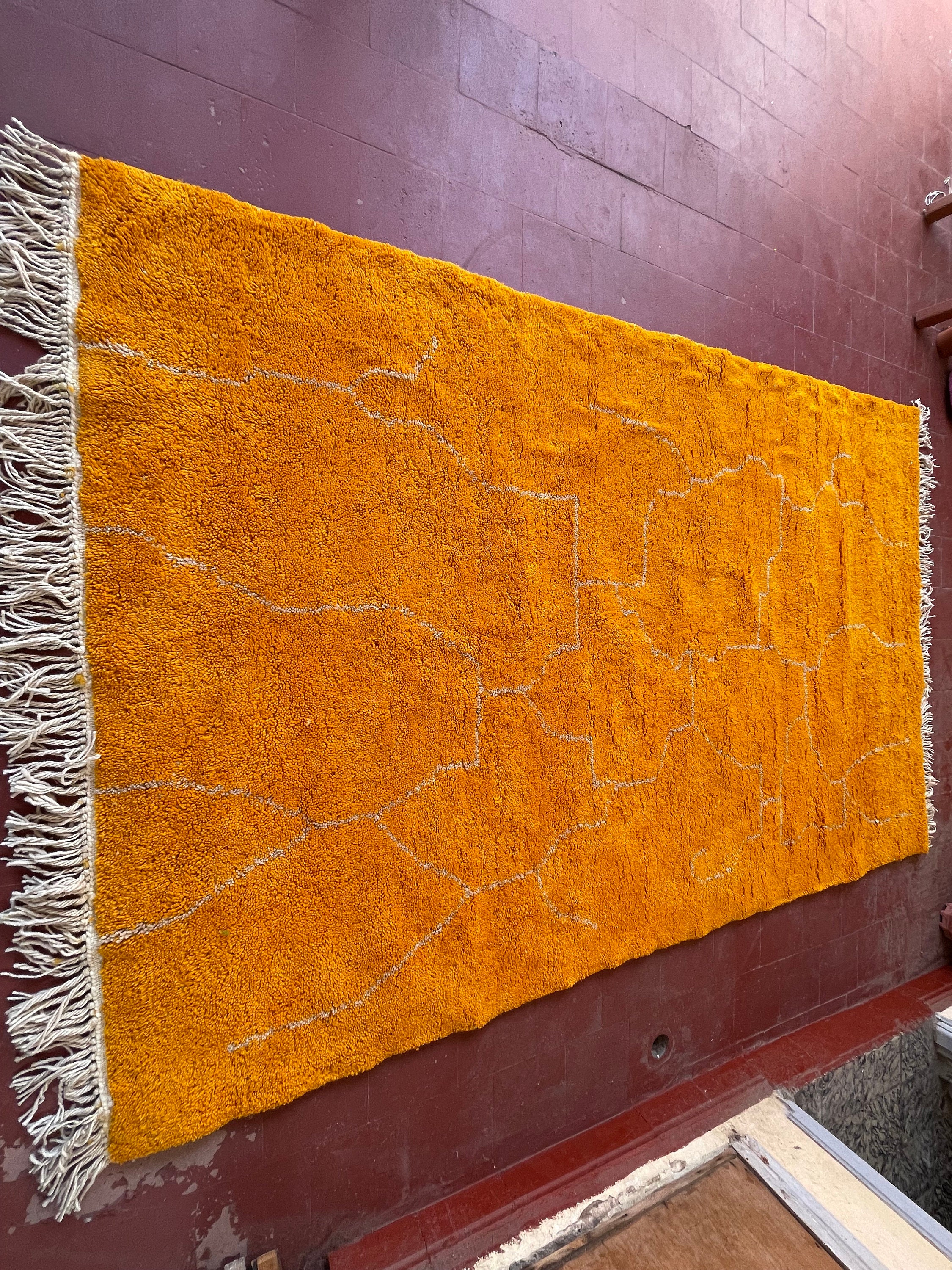 Add a touch of modern elegance to your space with this custom-made minimalist Moroccan rug. Hand-knotted in the traditional Berber style, this Beni Ourain wool rug features a striking orange abstract design. Elevate your decor with this unique floor covering that seamlessly blends style and comfort. Perfect for adding warmth and charm to any room in your home.