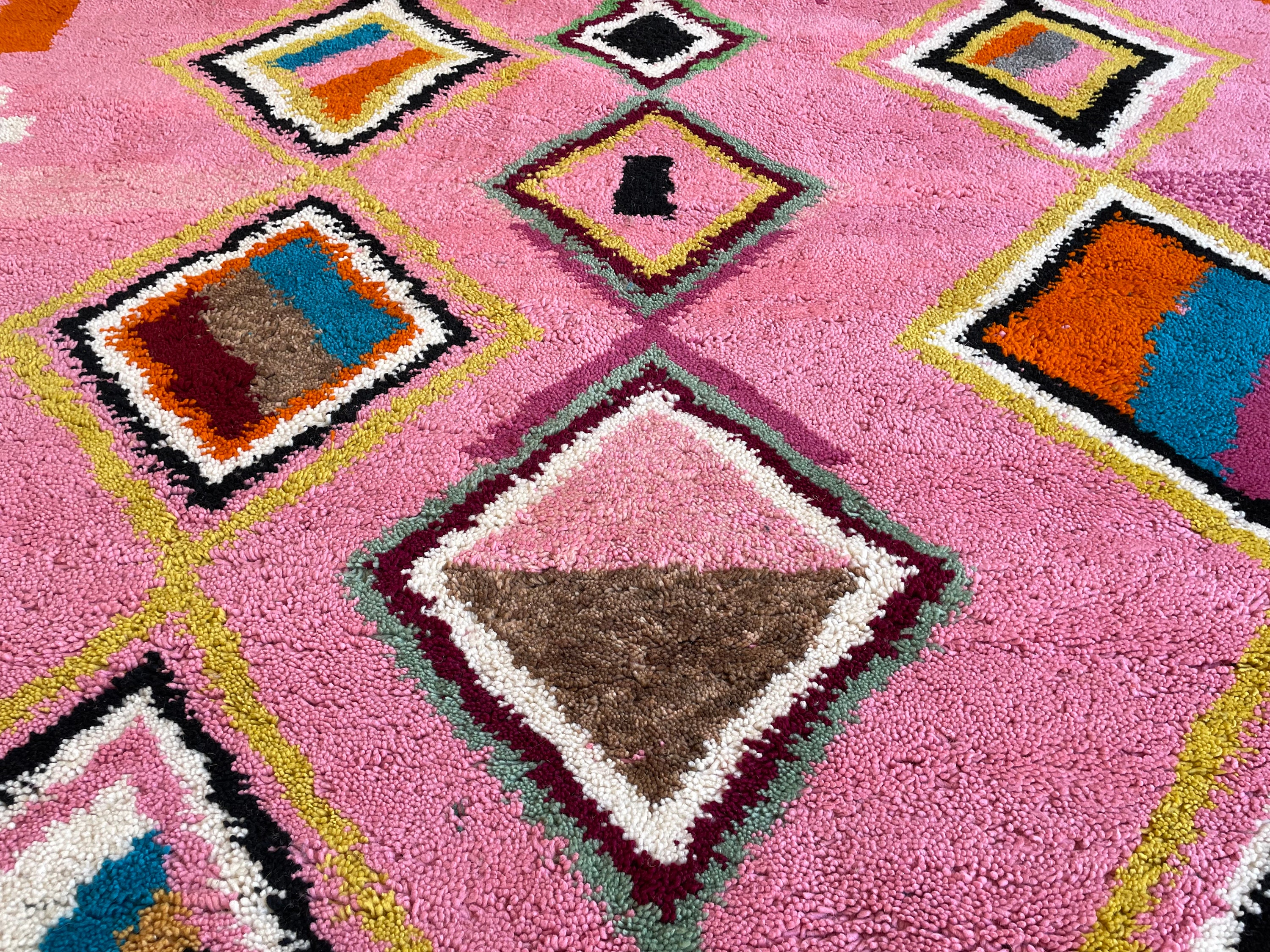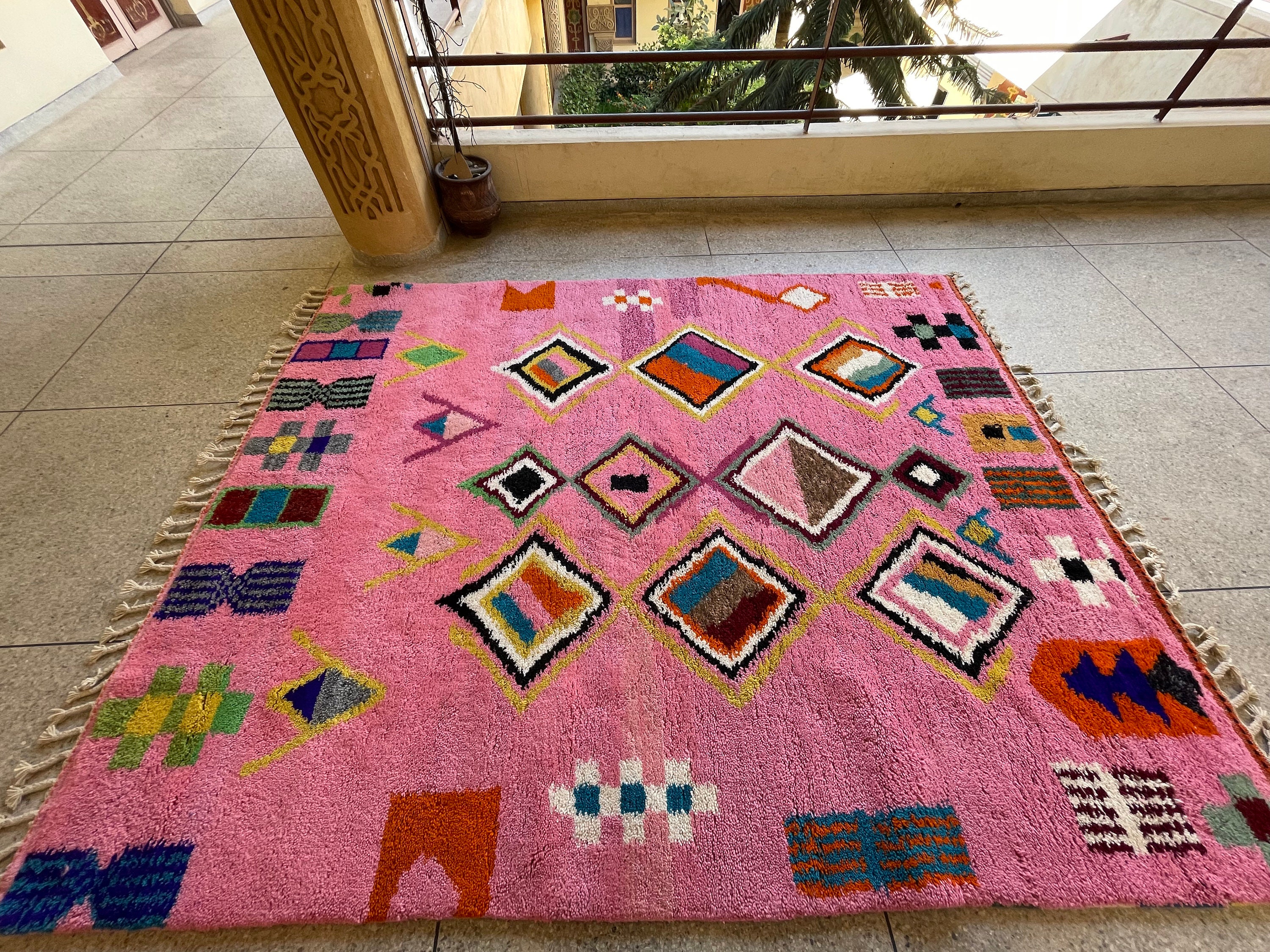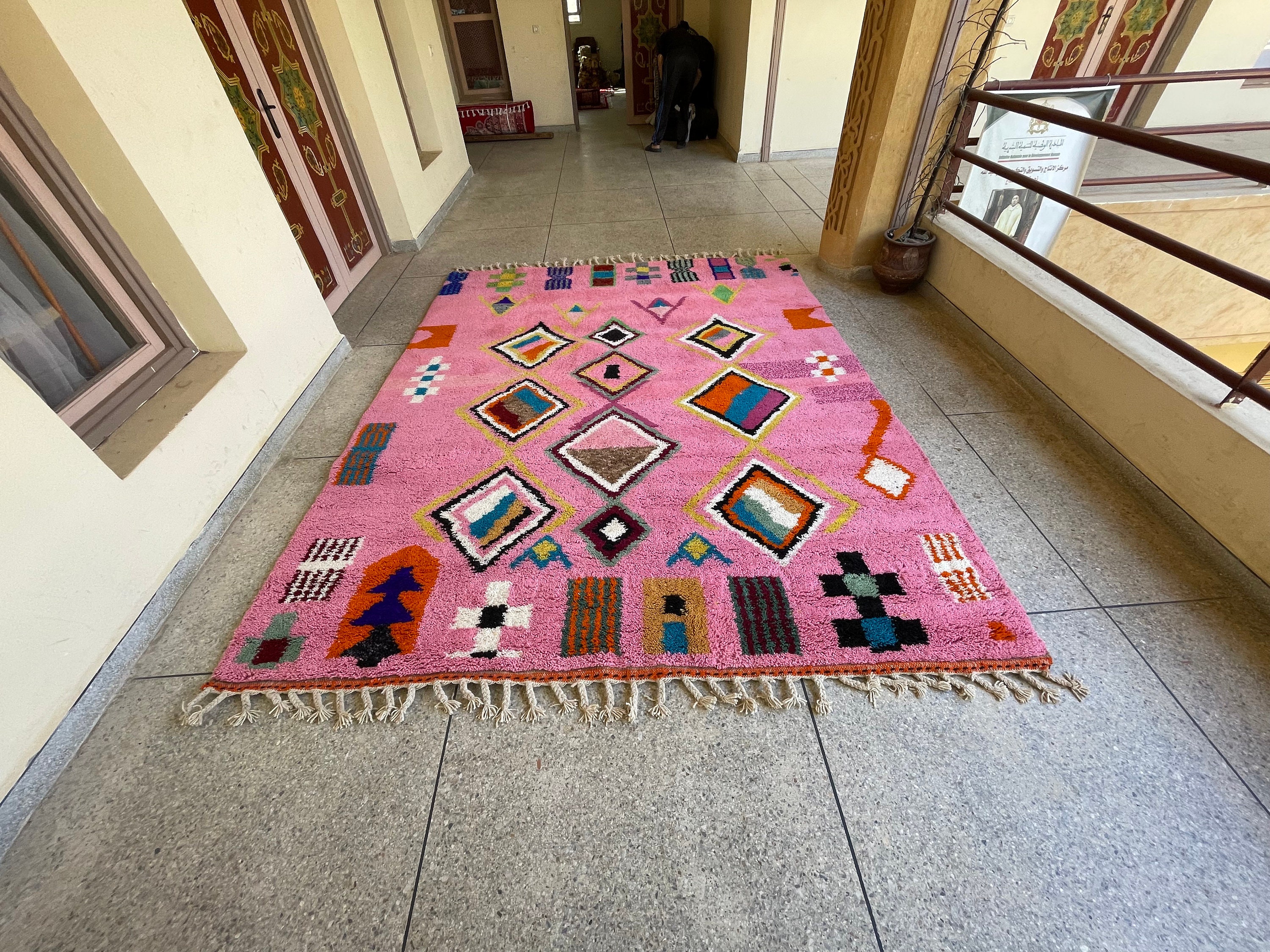 Add a touch of luxury to your space with this Moroccan handmade rug. Handcrafted by skilled artisans, this Beni Ourain pink shag rug features an abstract design that will elevate any room's aesthetic. Made from custom wool, this authentic Berber area rug is a one-of-a-kind piece that exudes elegance and charm. Enhance your home decor with the timeless beauty of this luxury Beni rug today!