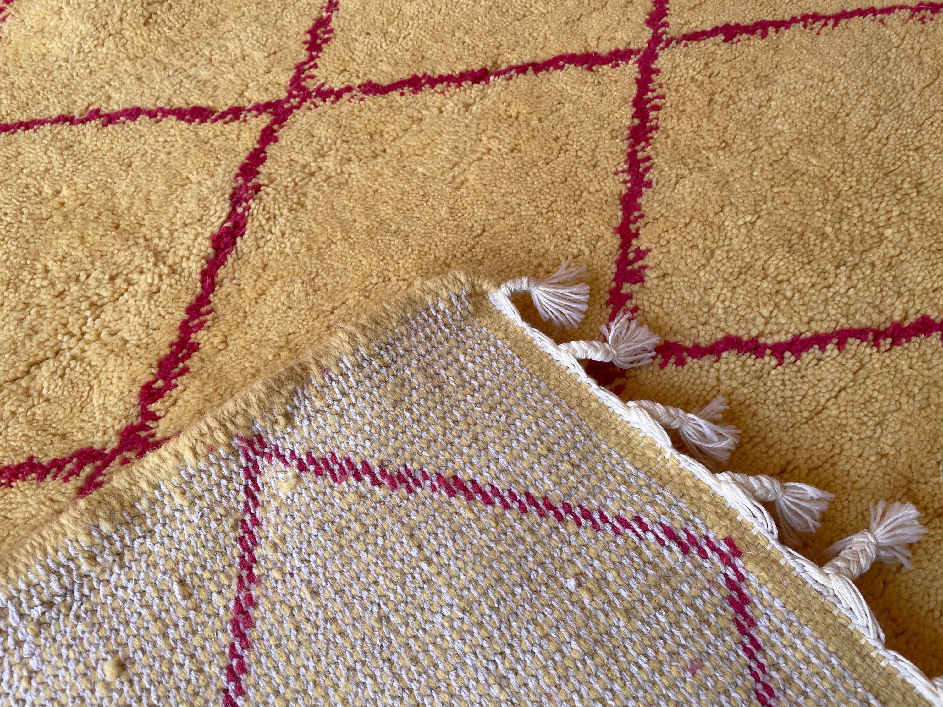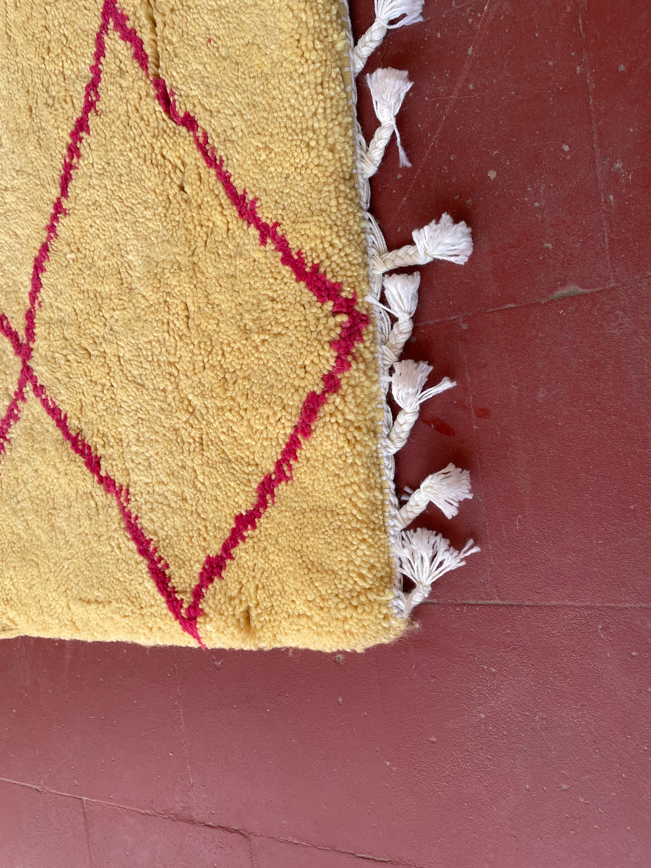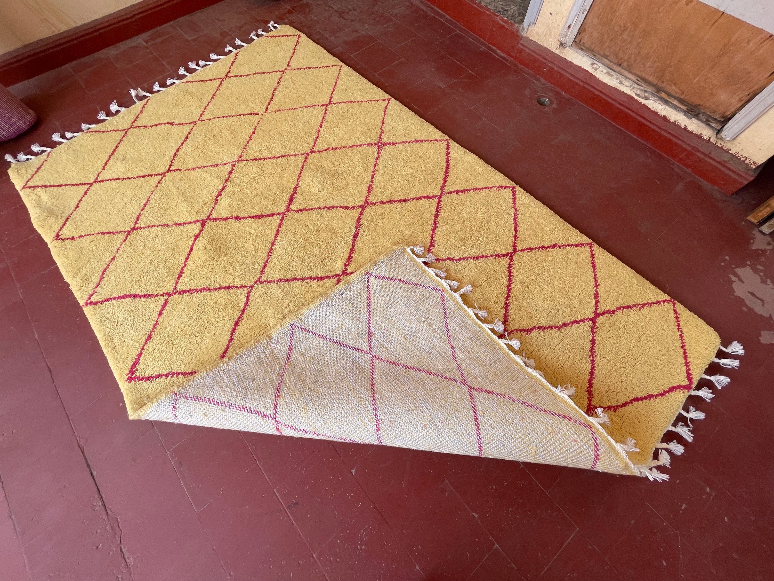 Add a playful touch to your space with this cute Moroccan Beni Ourain rug, featuring a charming yellow and pink geometric diamond pattern. Handwoven from soft sheep wool, this custom area rug brings warmth and style to minimalist and modern interiors.