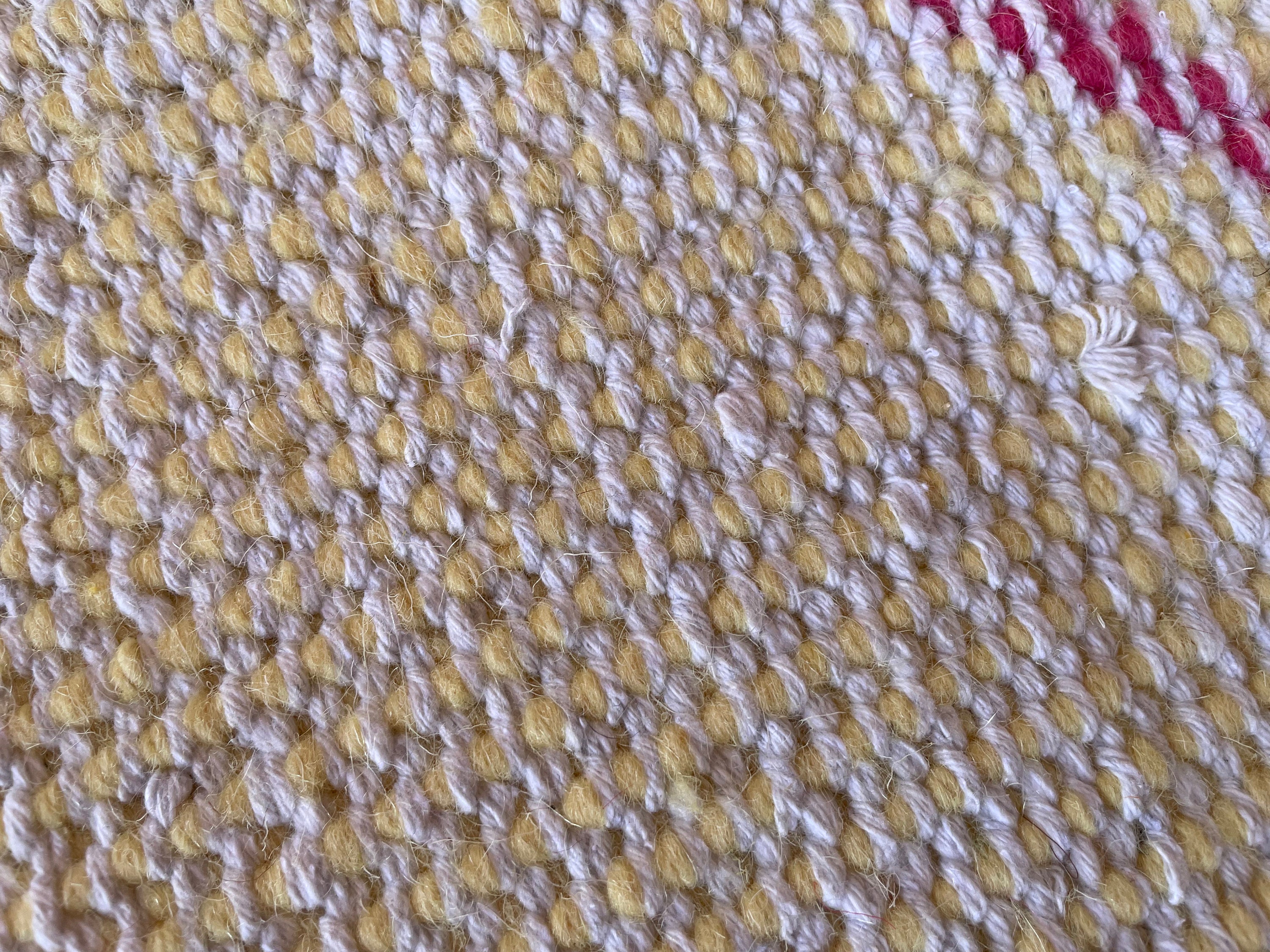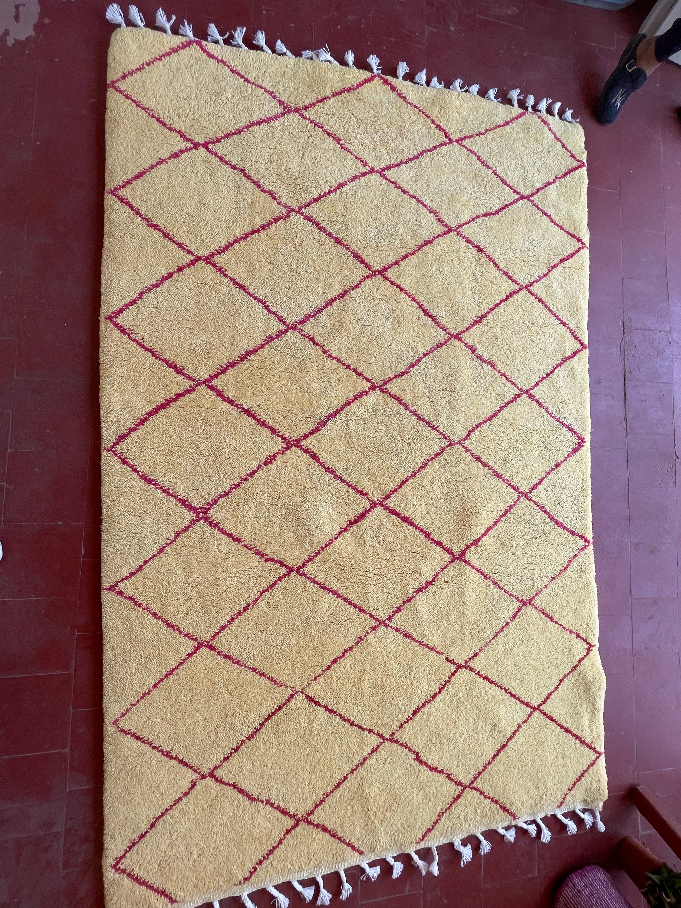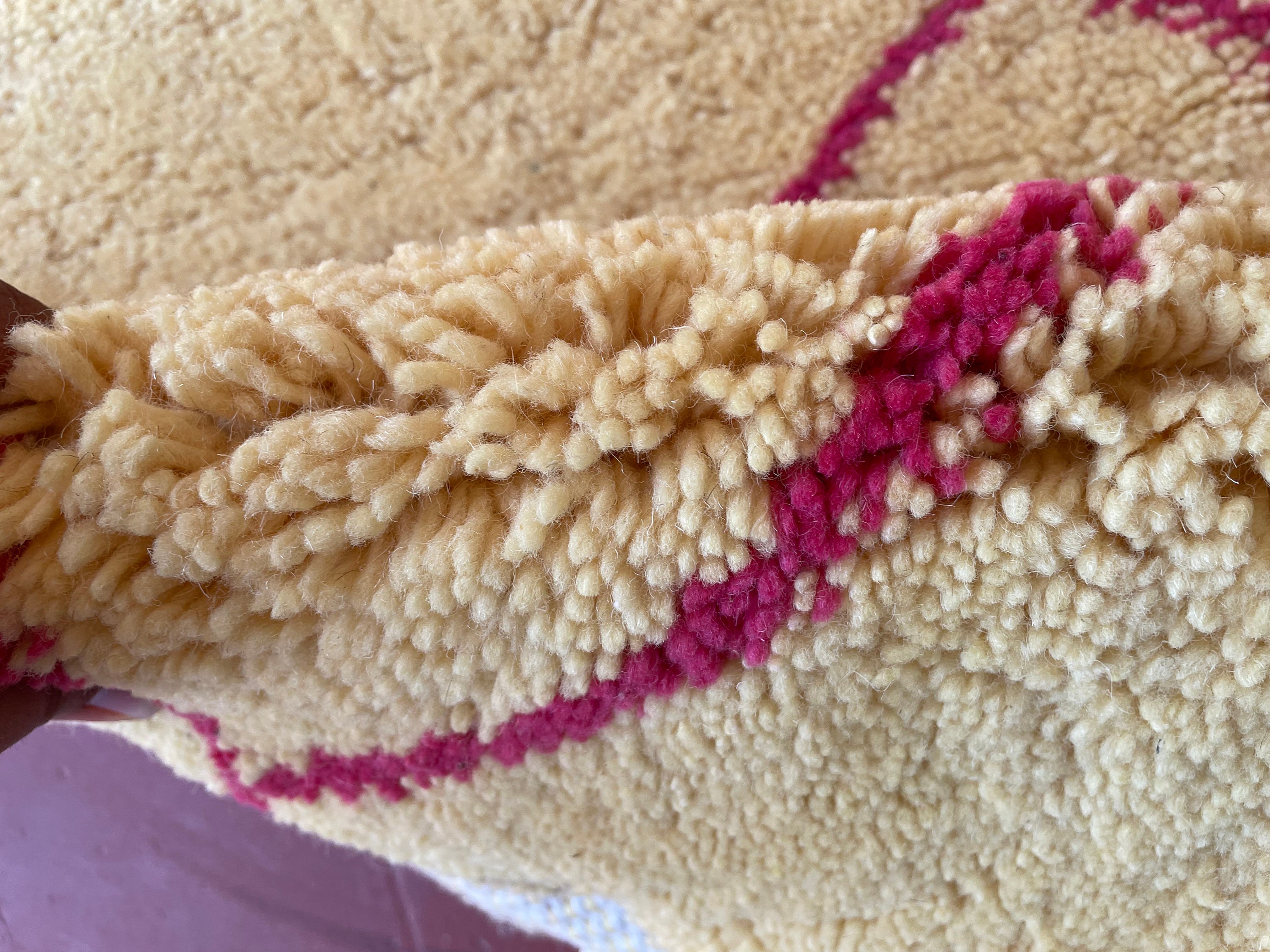 Add a playful touch to your space with this cute Moroccan Beni Ourain rug, featuring a charming yellow and pink geometric diamond pattern. Handwoven from soft sheep wool, this custom area rug brings warmth and style to minimalist and modern interiors.