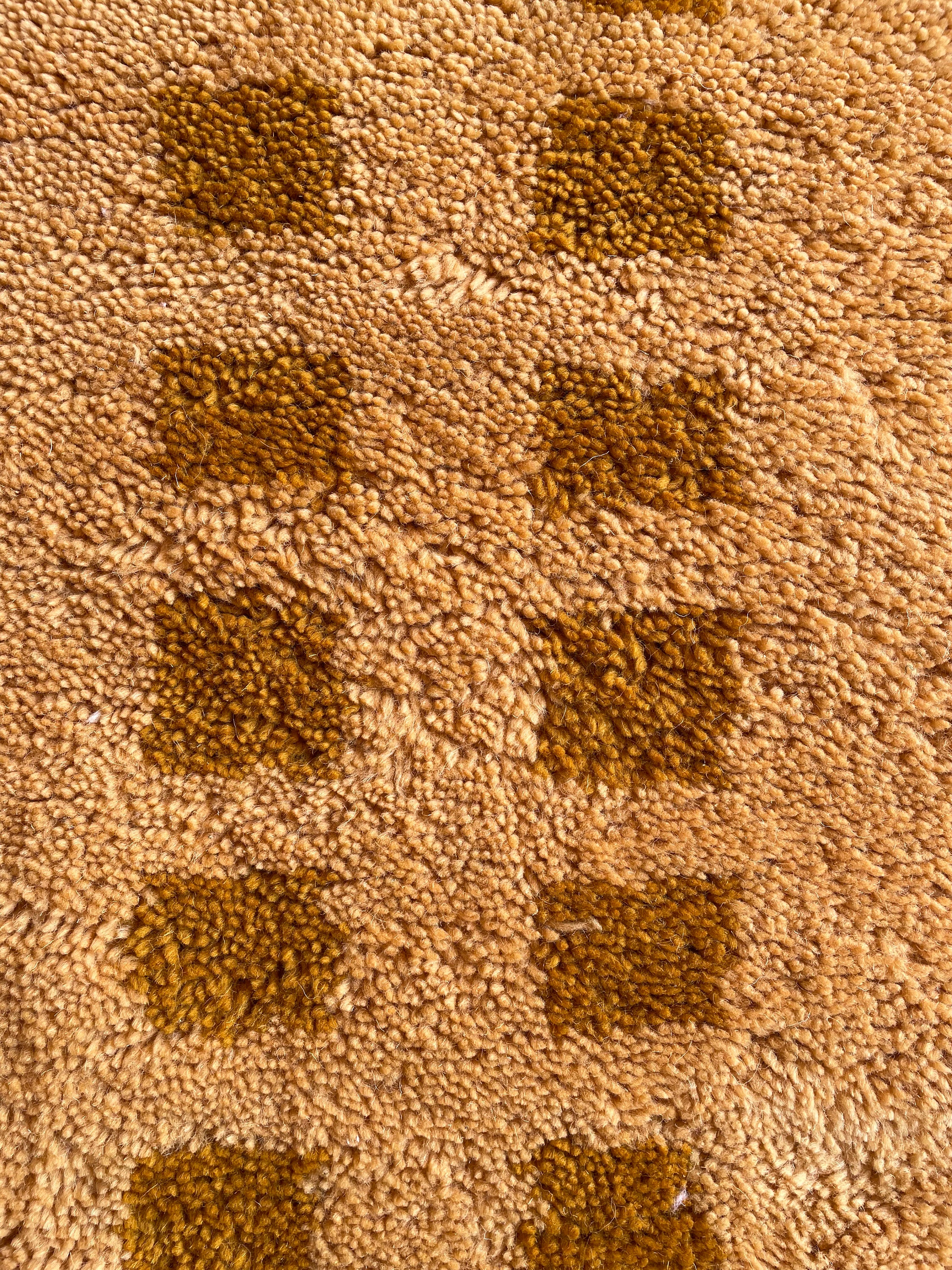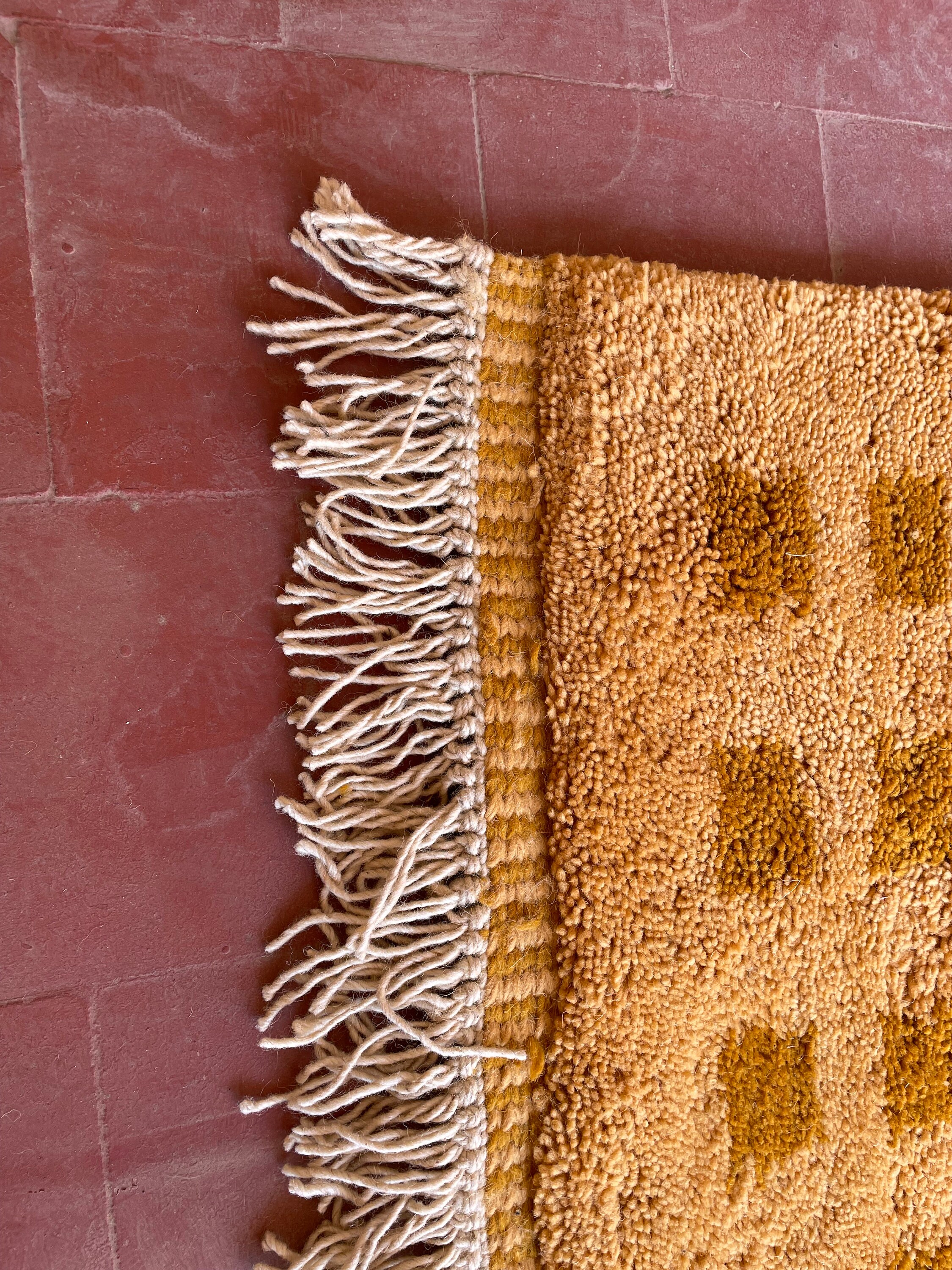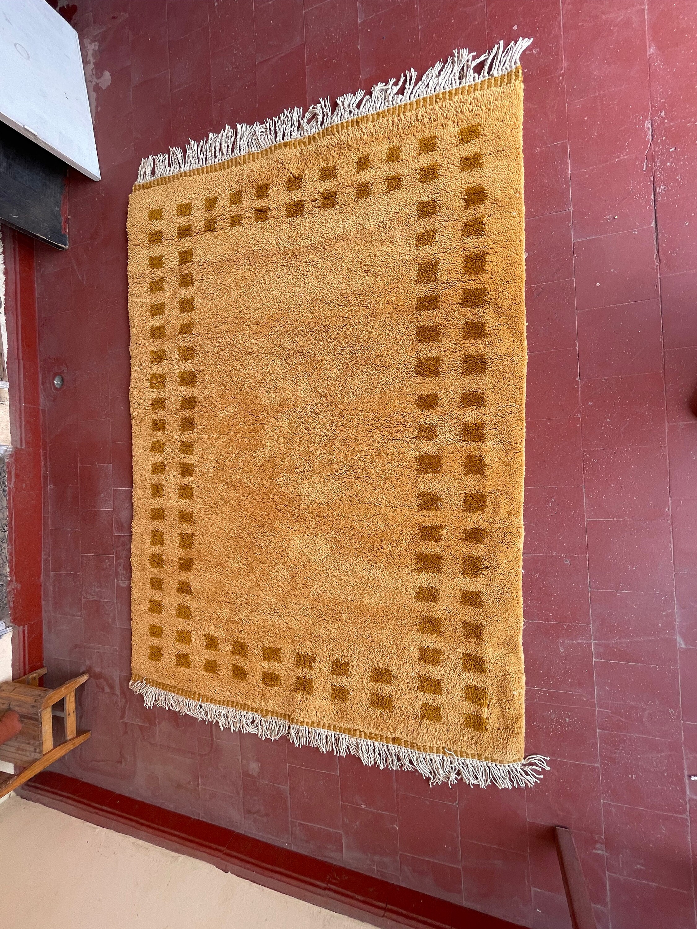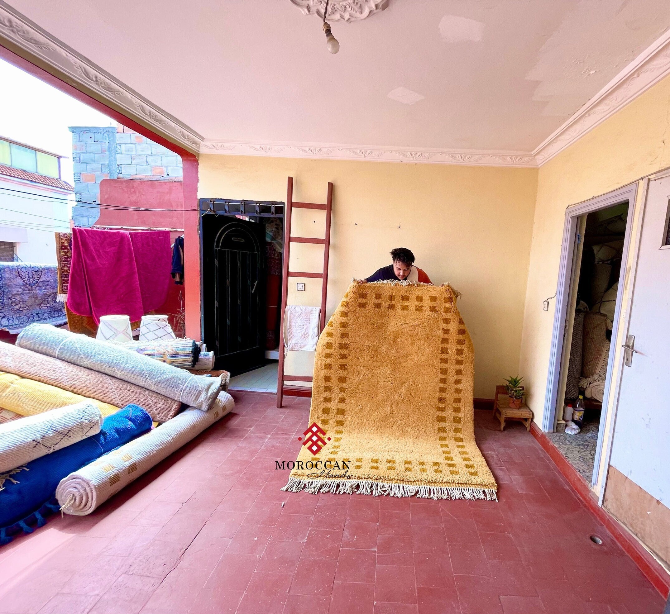 Elevate your space with our Checkered Benioourain Rug, a stunning Moroccan handmade rug that embodies the essence of tribal artistry. This unique Berber rug, crafted from luxurious sheep wool, features a beautiful checkerboard pattern in warm yellow and brown tones. Perfect for adding warmth and character to any room, this one-of-a-kind piece showcases traditional craftsmanship while offering a contemporary touch. Embrace the beauty of Moroccan heritage with our exquisite checkerboard rug today!