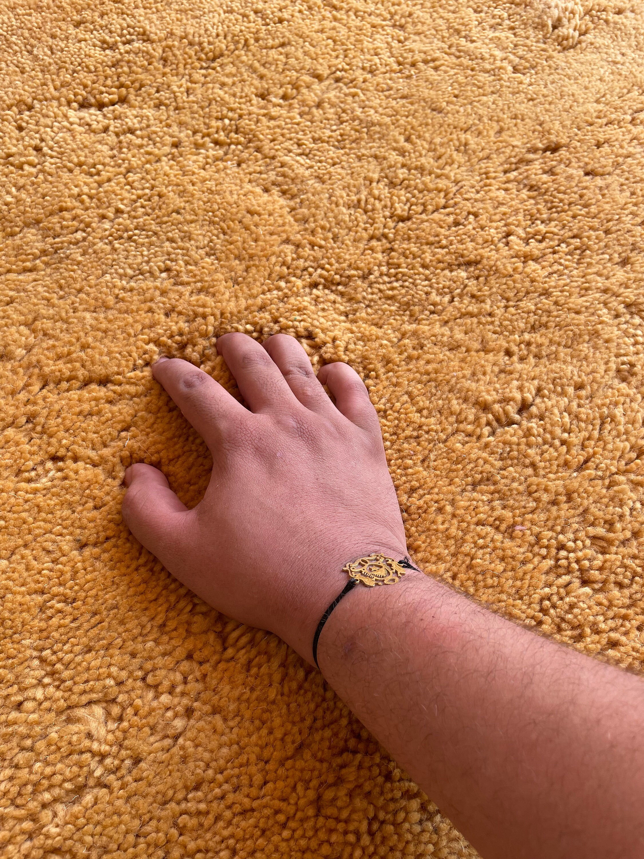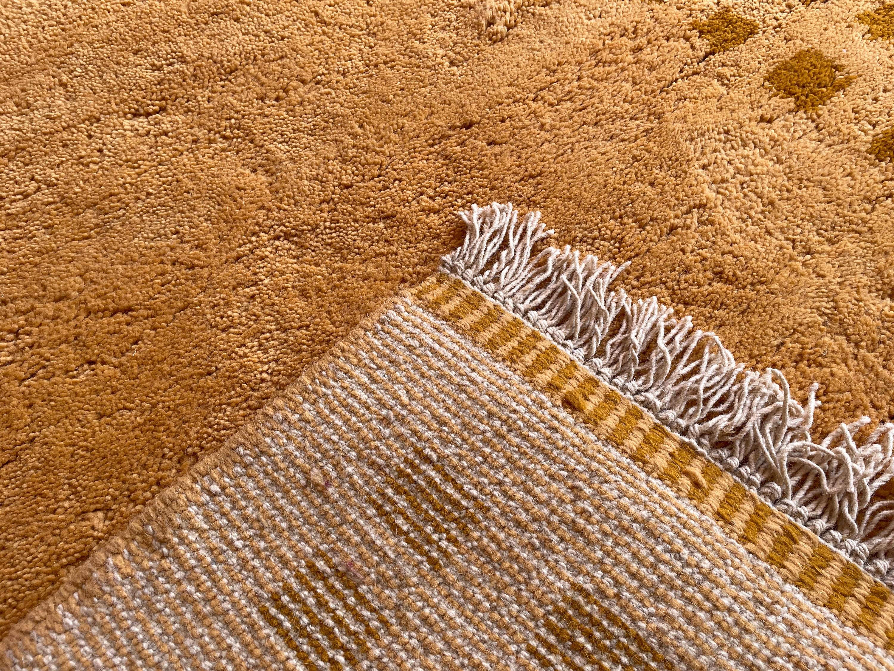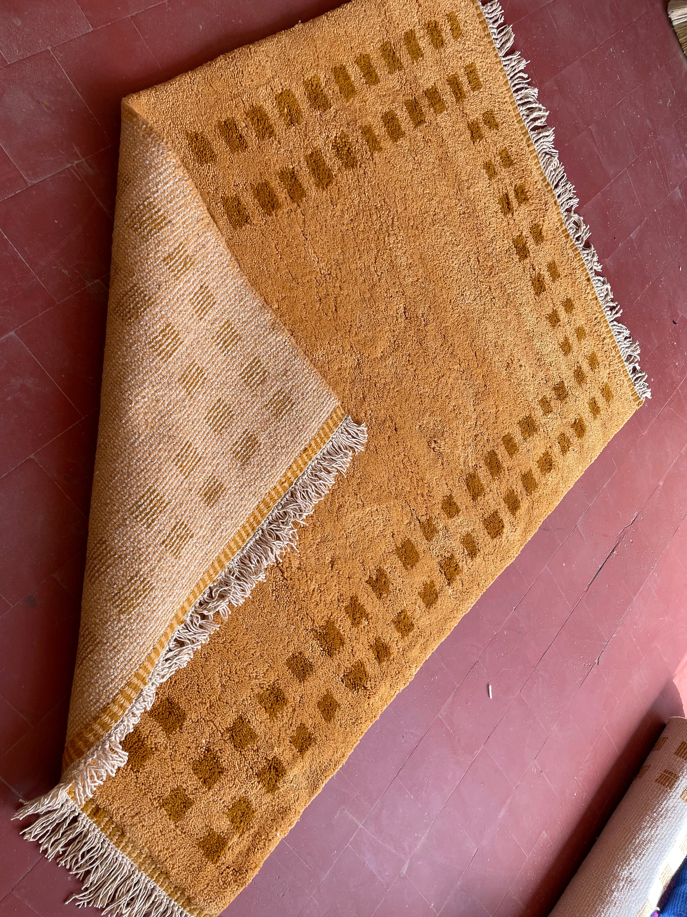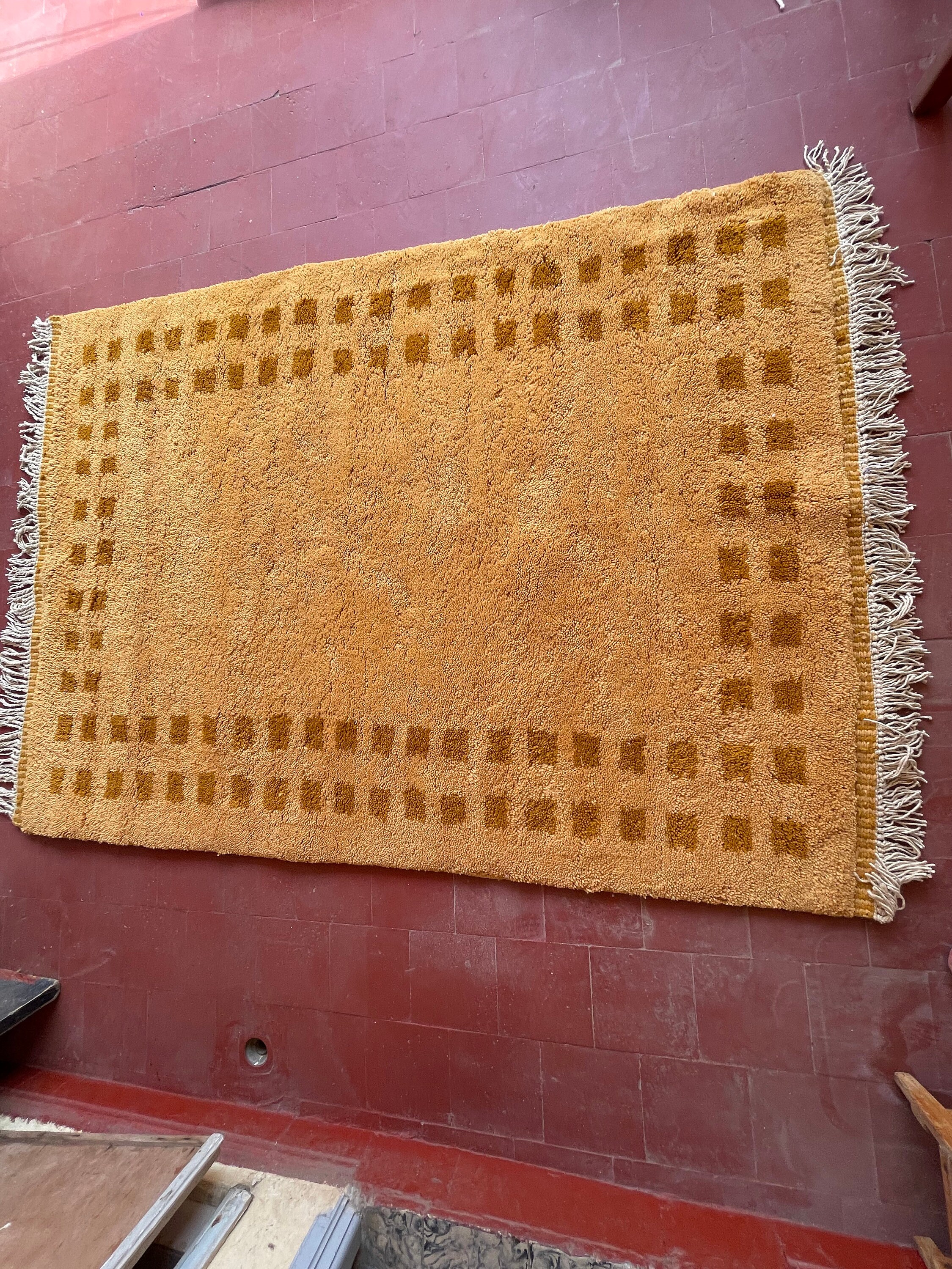 Elevate your space with our Checkered Benioourain Rug, a stunning Moroccan handmade rug that embodies the essence of tribal artistry. This unique Berber rug, crafted from luxurious sheep wool, features a beautiful checkerboard pattern in warm yellow and brown tones. Perfect for adding warmth and character to any room, this one-of-a-kind piece showcases traditional craftsmanship while offering a contemporary touch. Embrace the beauty of Moroccan heritage with our exquisite checkerboard rug today!