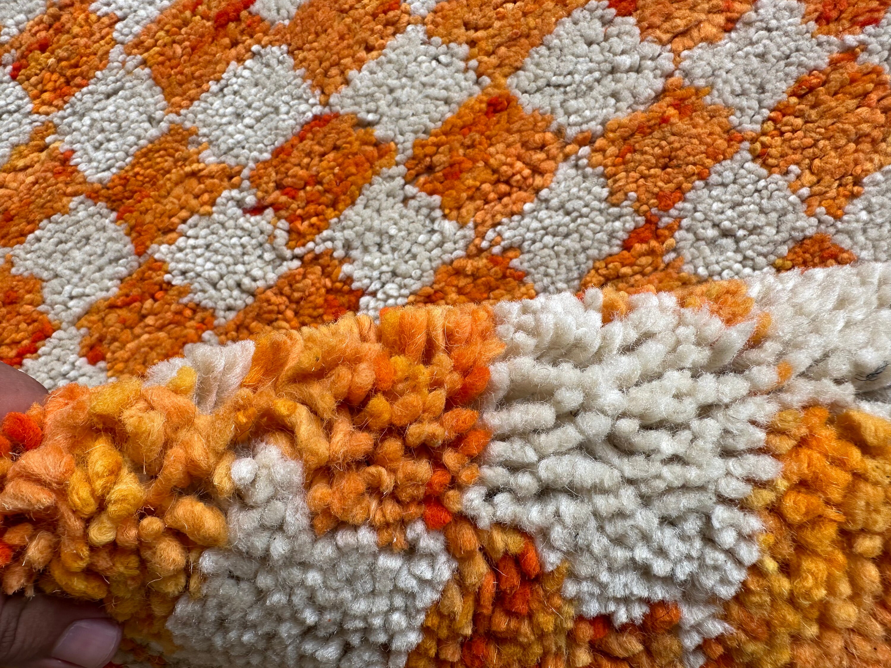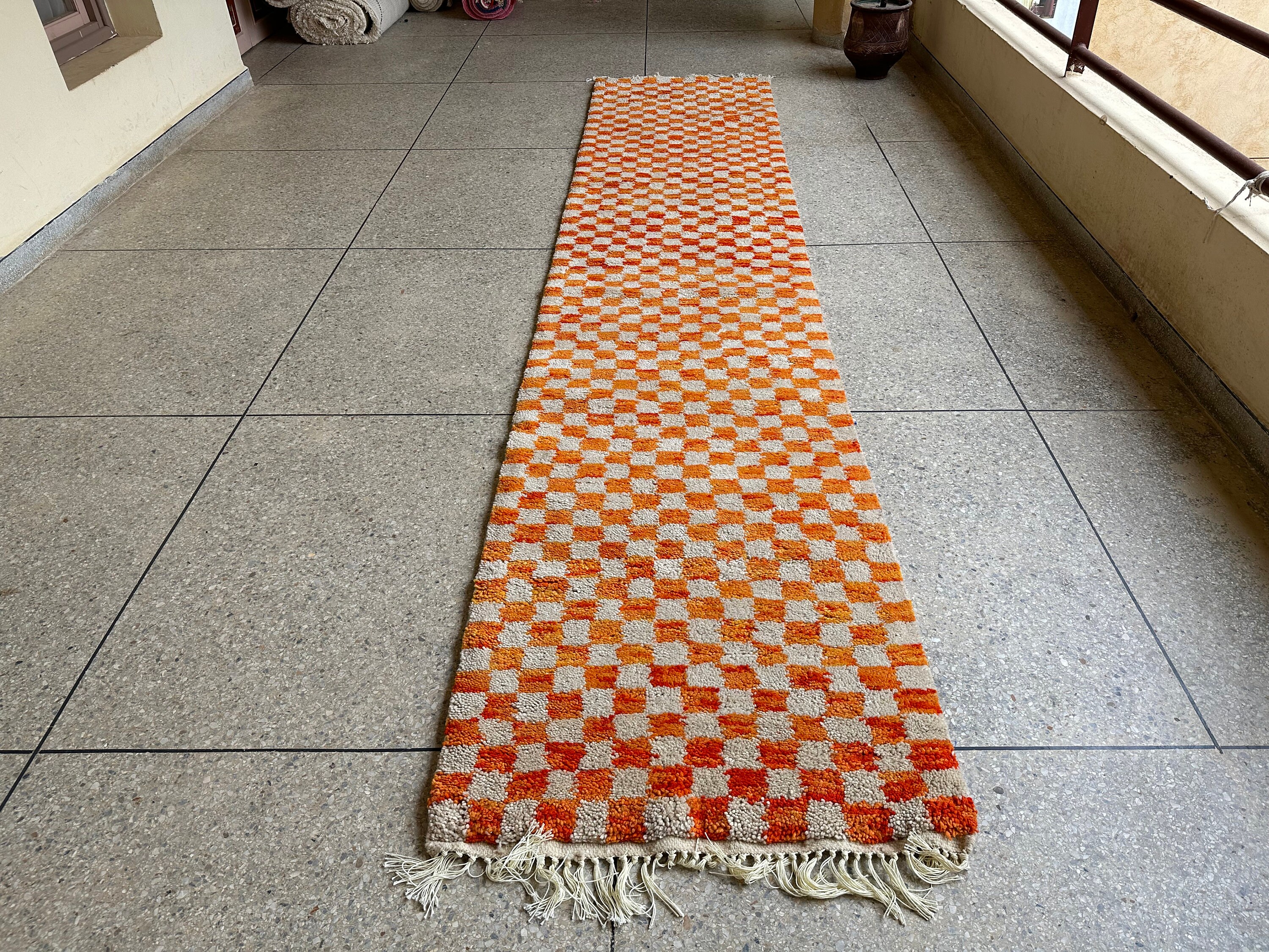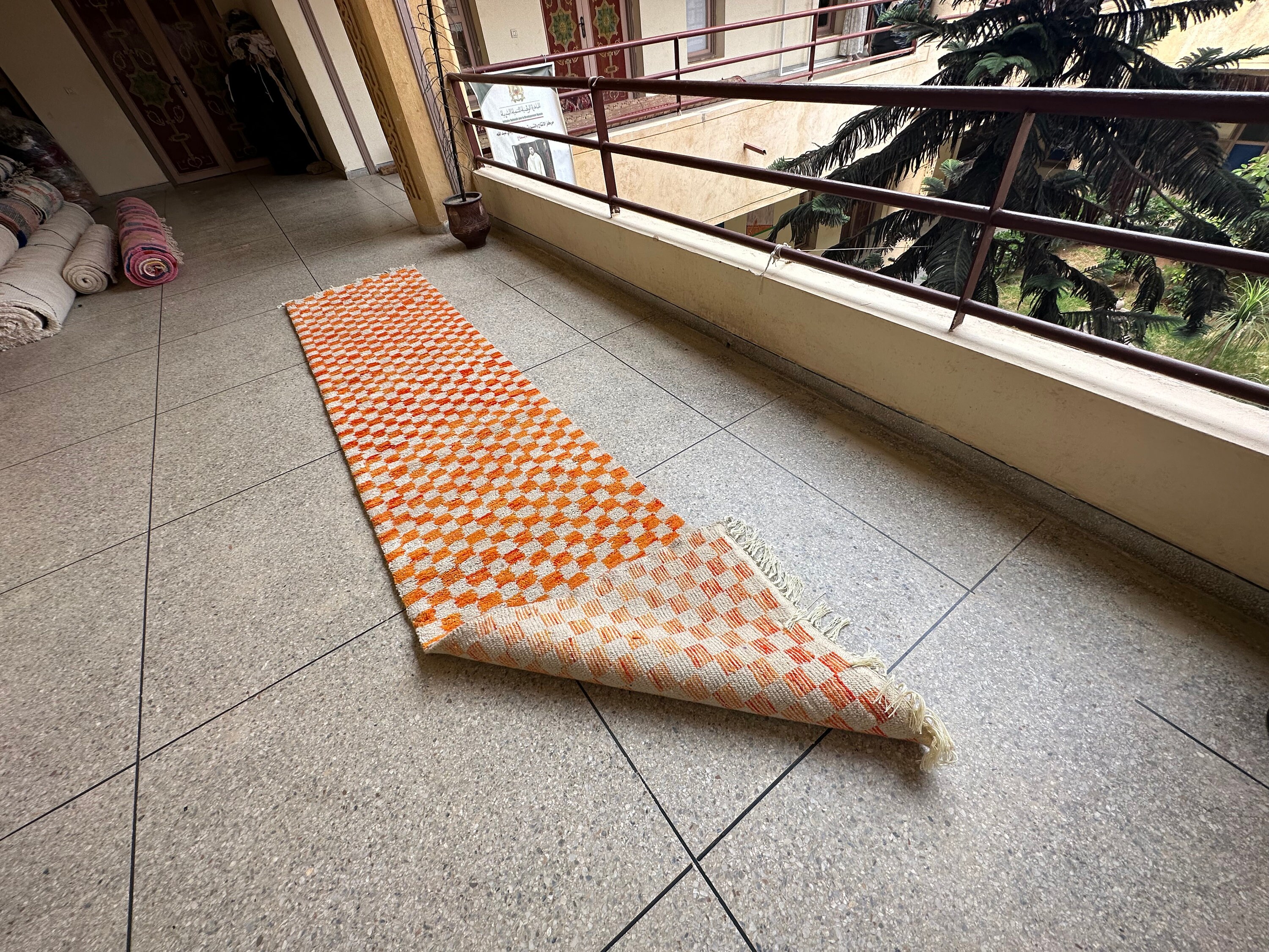 Add a pop of color to your space with this beautiful Moroccan runner in vibrant orange. Handmade with love by Berber artisans, this checkered wool runner rug is the perfect addition to your home decor. Elevate your space with this unique checkerboard runner rug today!