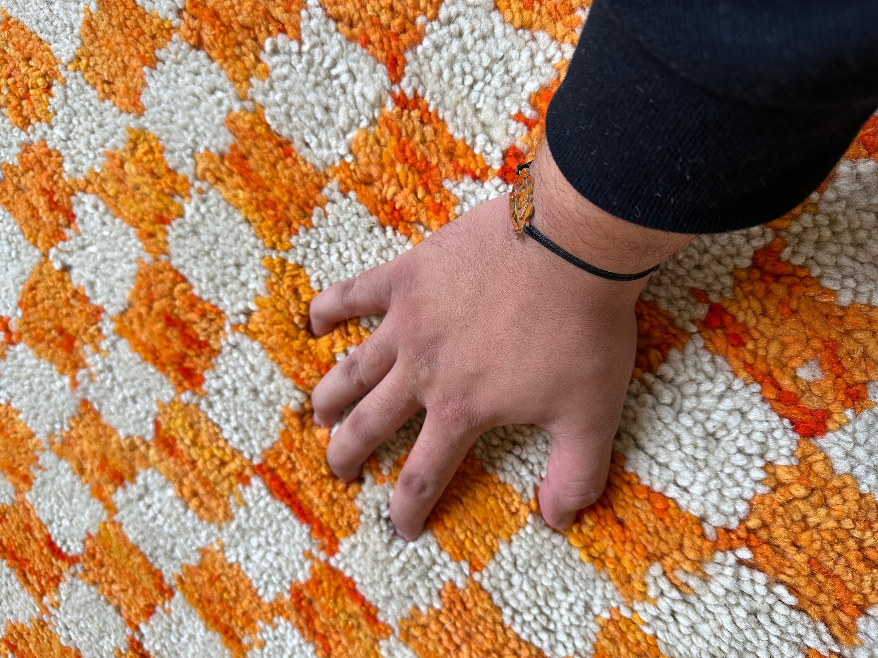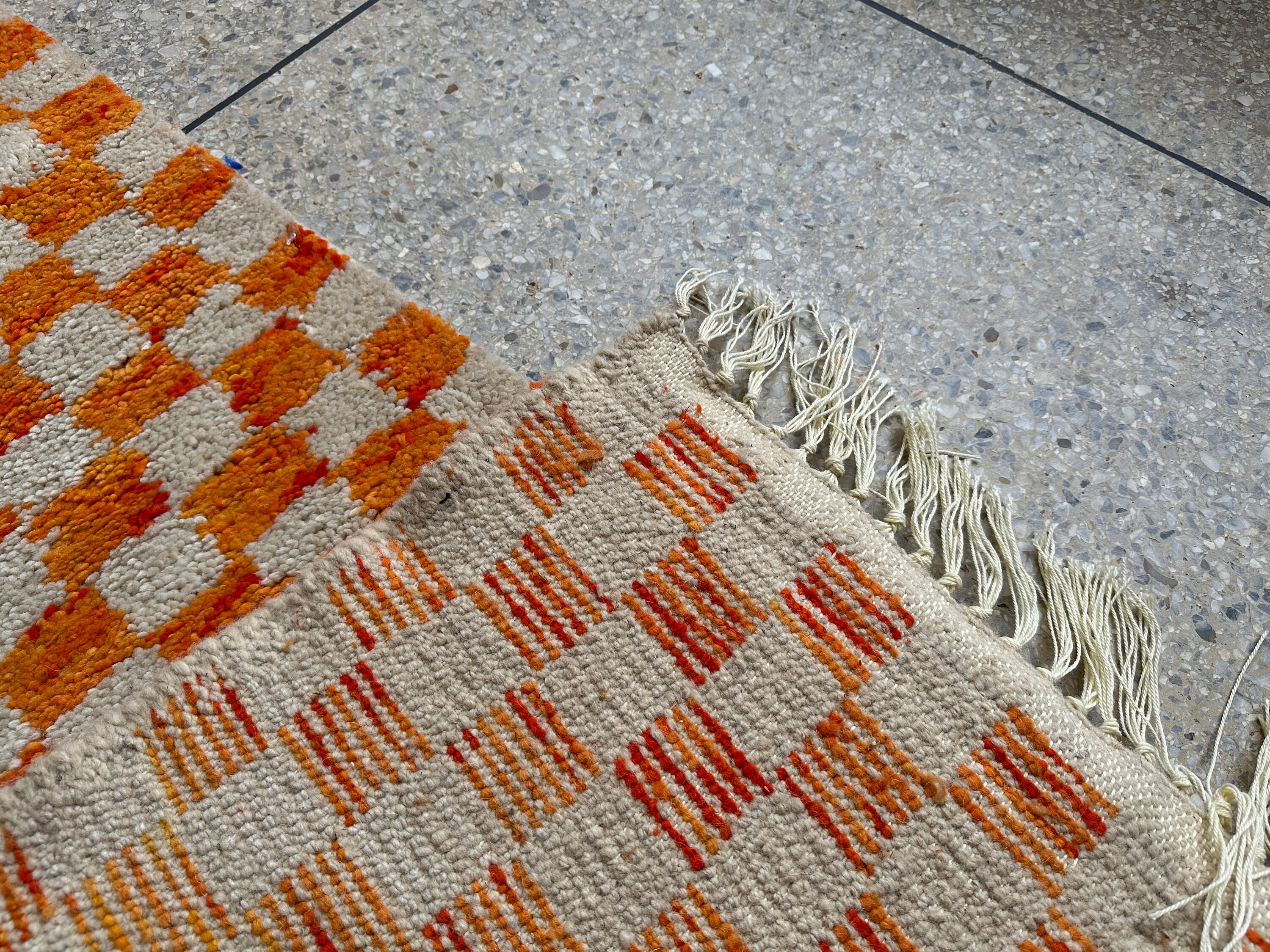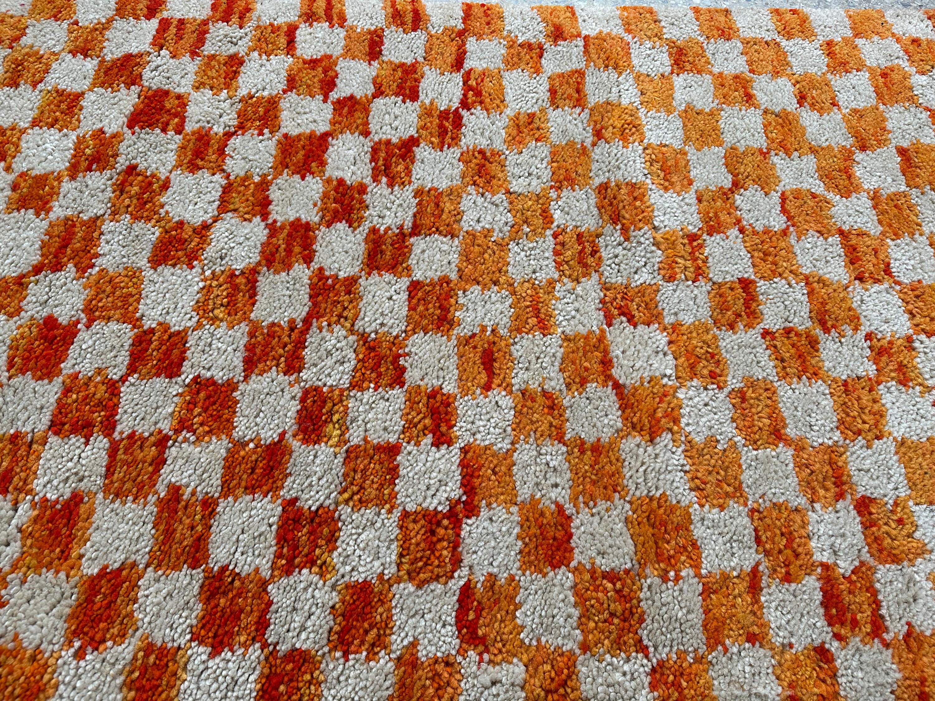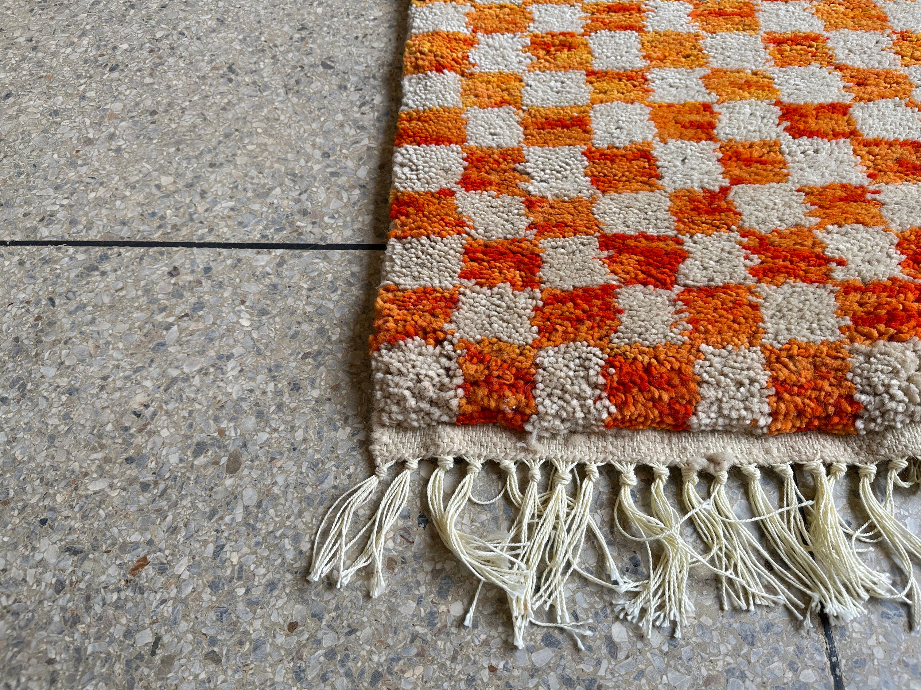 Add a pop of color to your space with this beautiful Moroccan runner in vibrant orange. Handmade with love by Berber artisans, this checkered wool runner rug is the perfect addition to your home decor. Elevate your space with this unique checkerboard runner rug today!