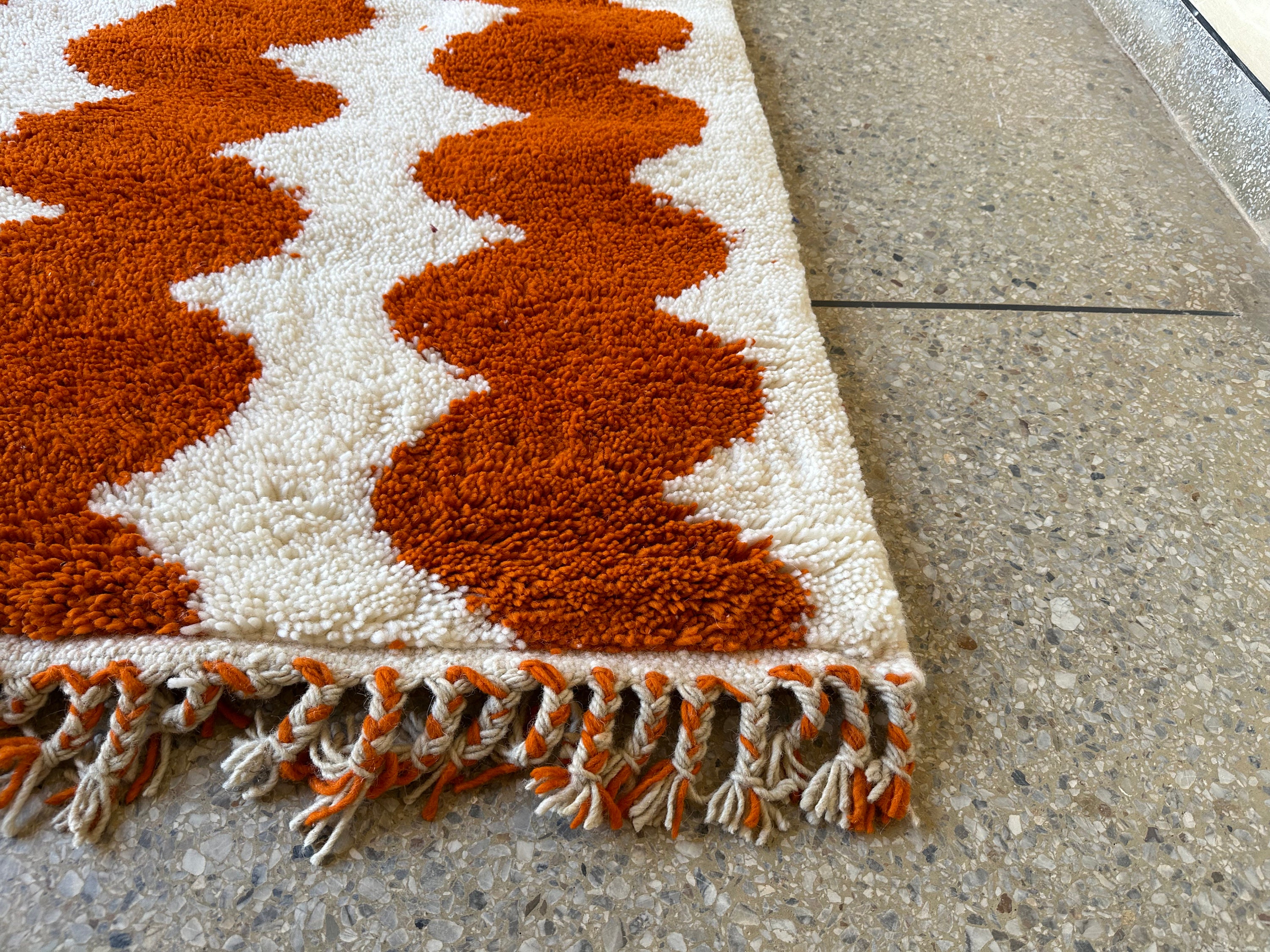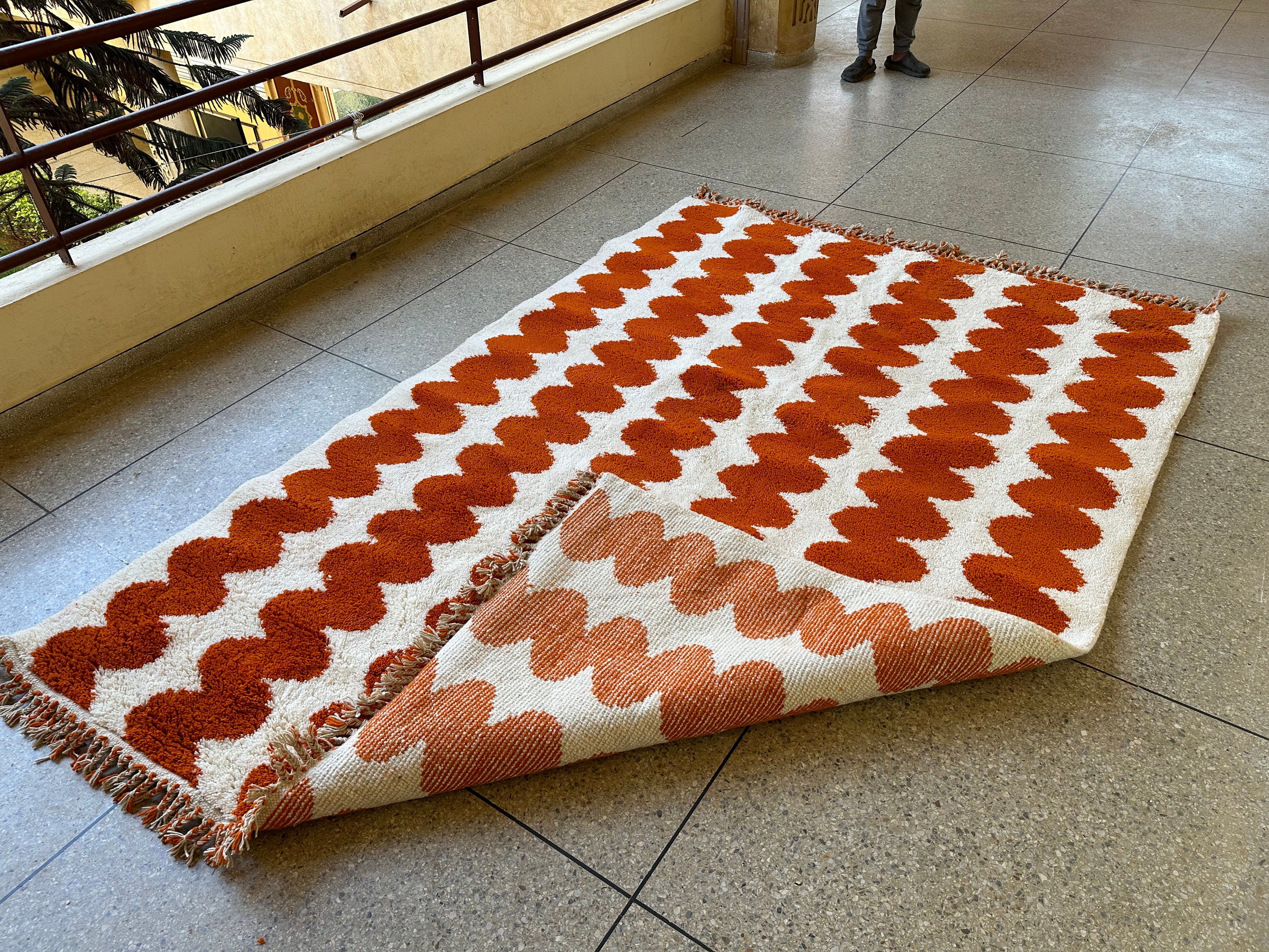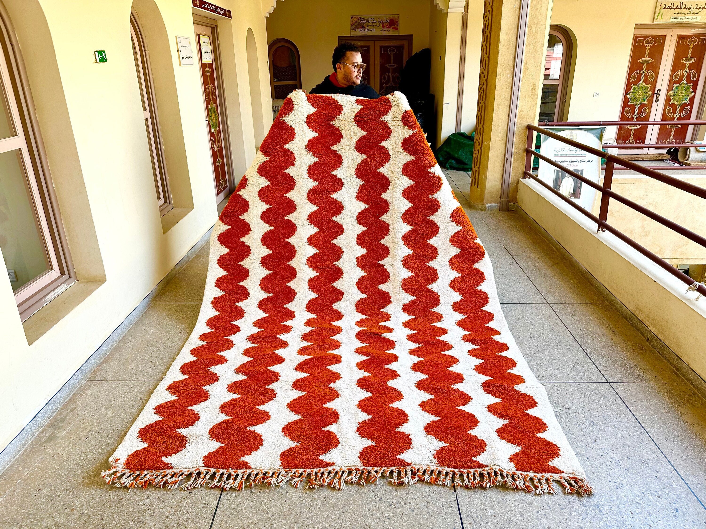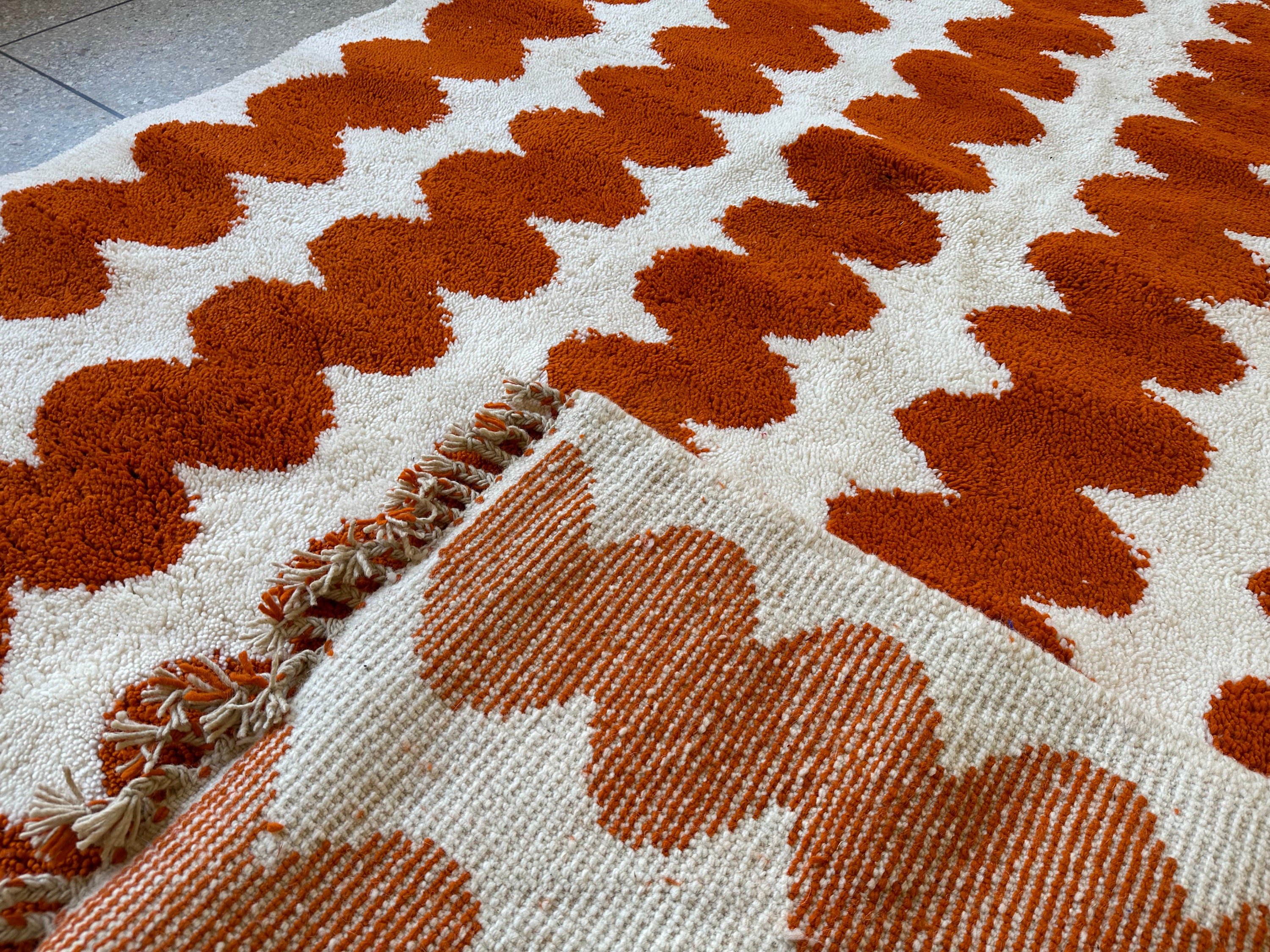 Elevate your space with an Authentic Moroccan Beni Ourain rug! Handcrafted to perfection, this Custom White & Orange Rug adds a touch of elegance. The Large Moroccan Rug is a perfect Housewarming Gift that will be cherished for years to come. Make a statement with this one-of-a-kind piece!