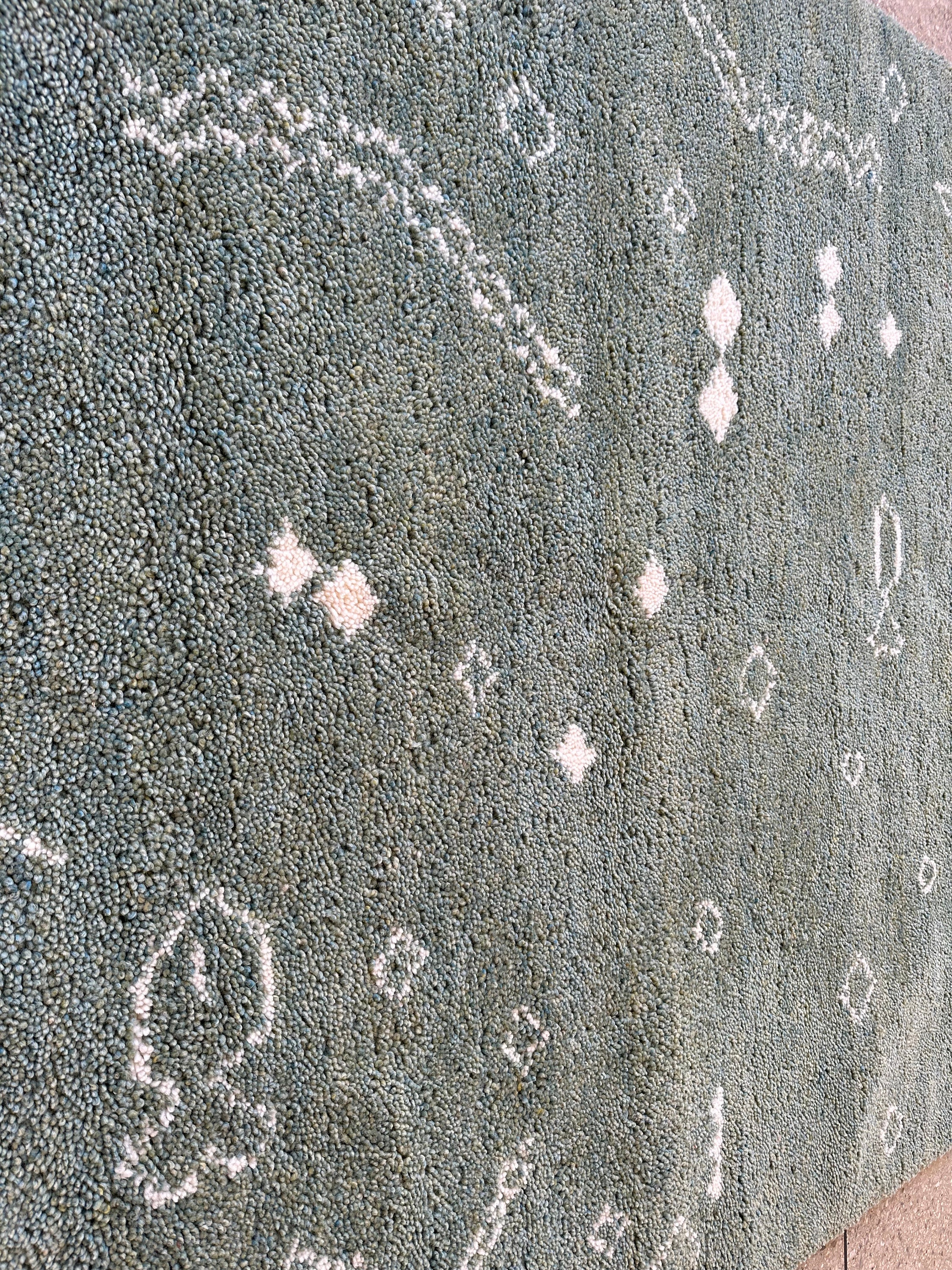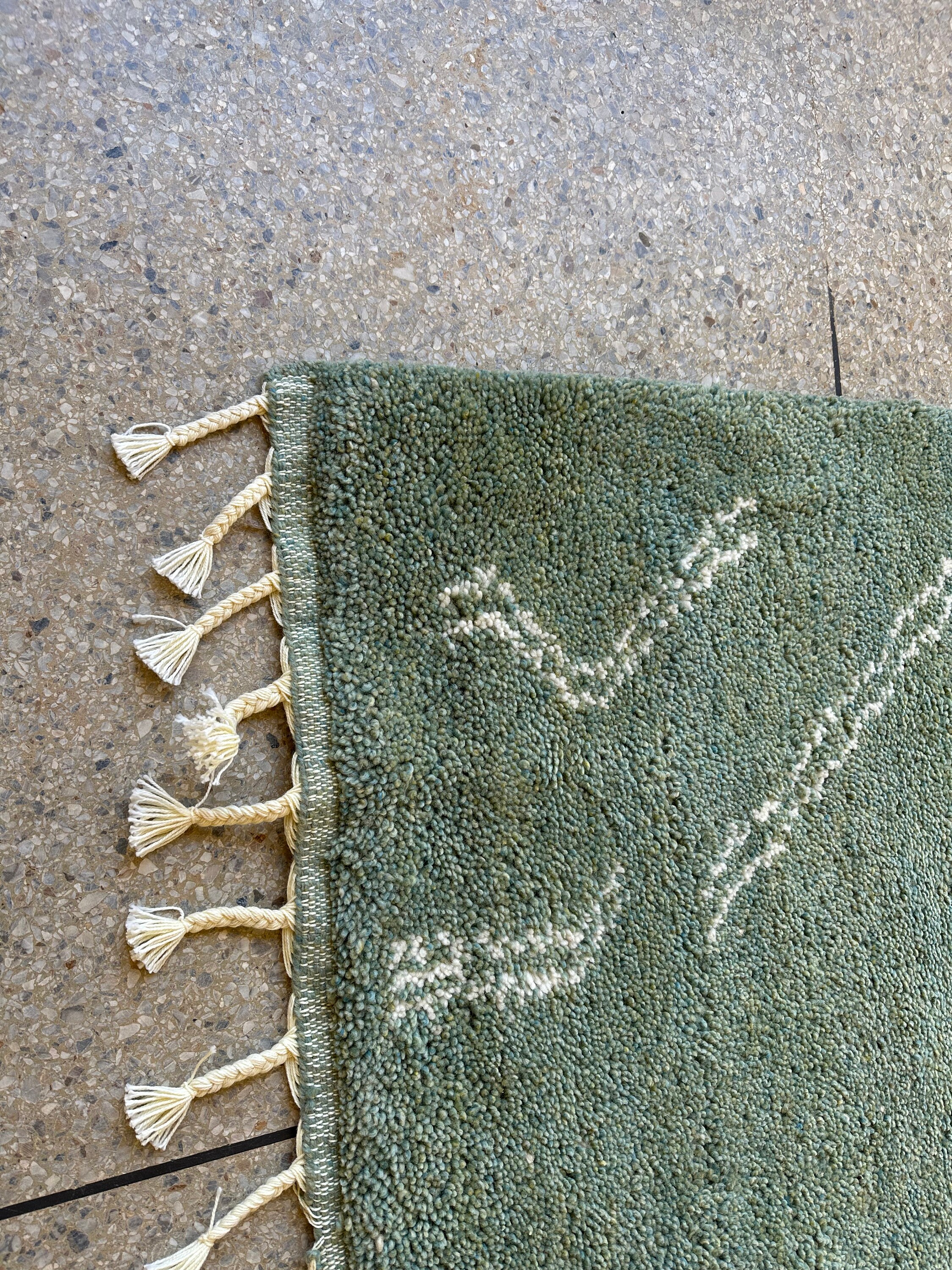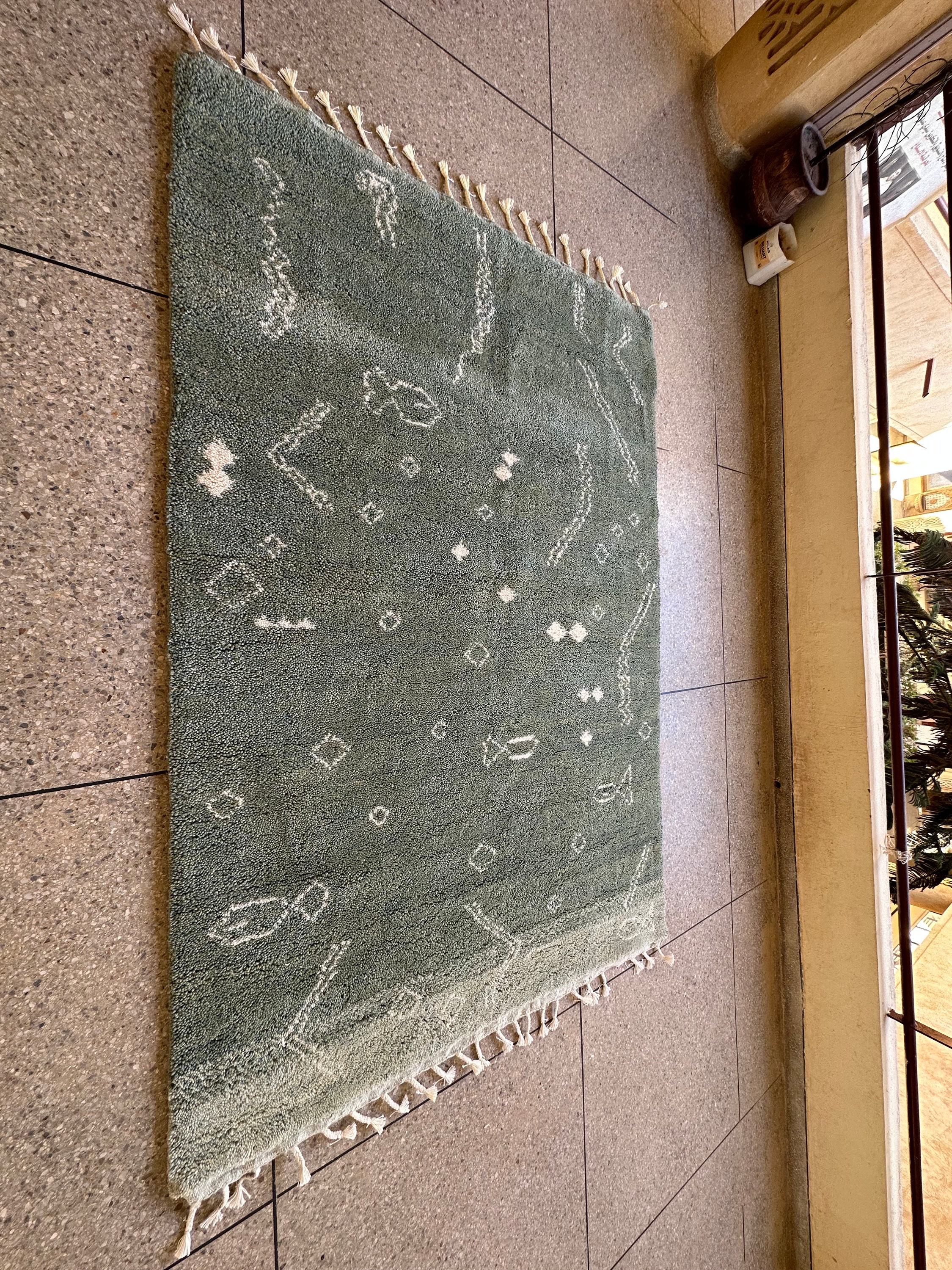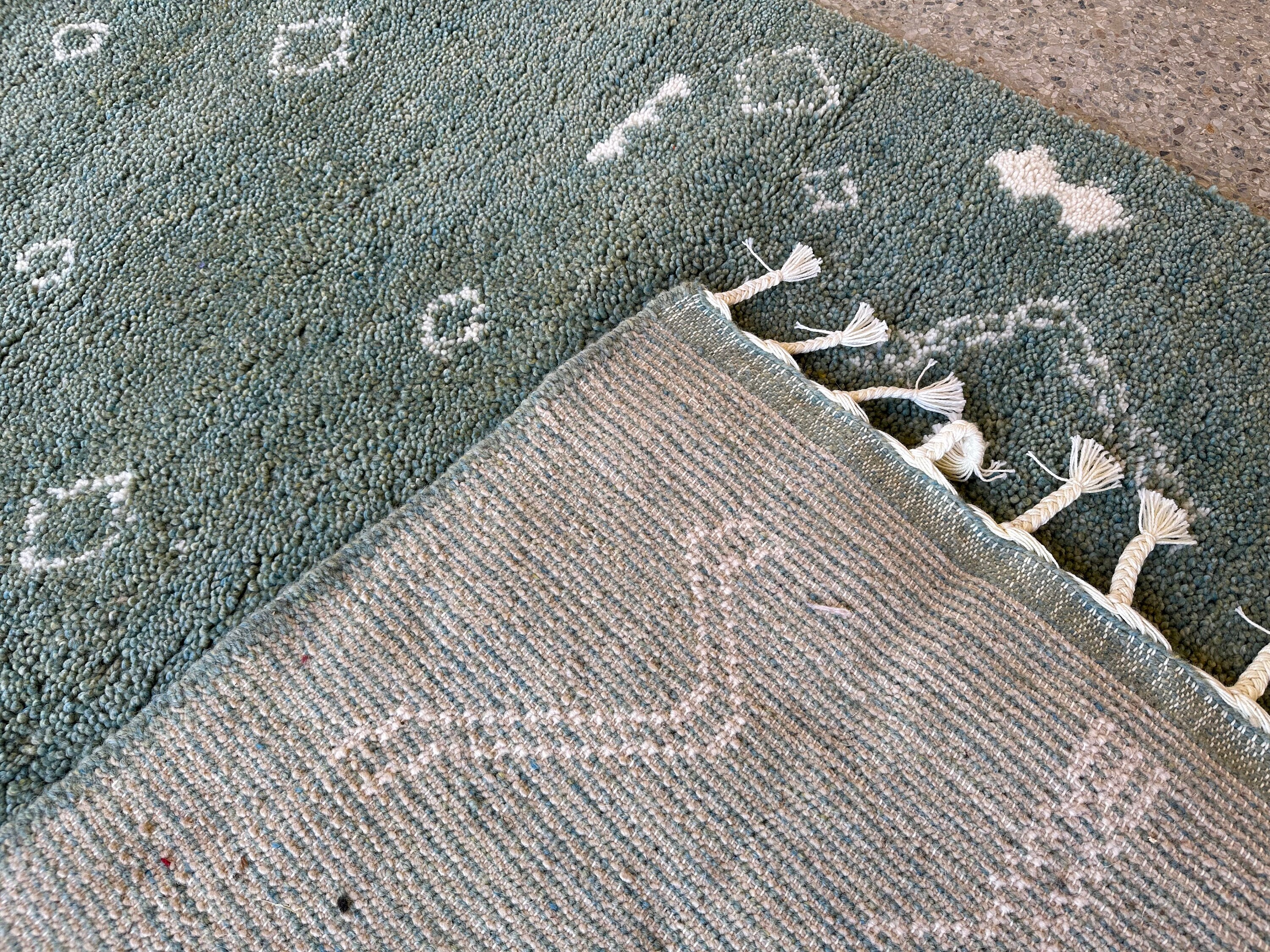 Transform your space with this marvelous Berber carpet inspired by Beni Ourain design. Elevate your decor with this abstract Moroccan rug, handmade from soft green and white wool. Personalize your home with this fluffy area decor that adds a touch of elegance and coziness. Ideal for adding warmth and character to any room.