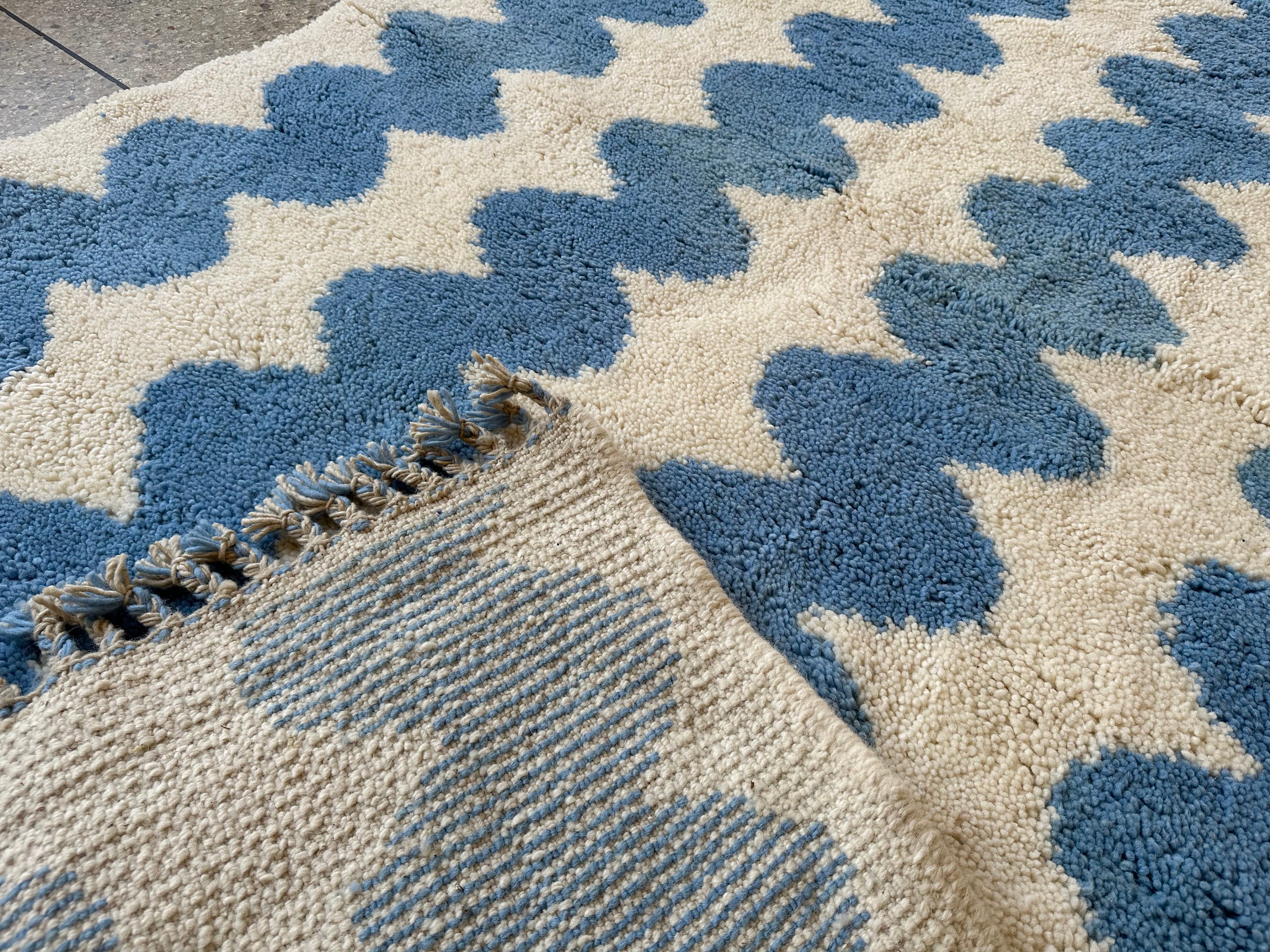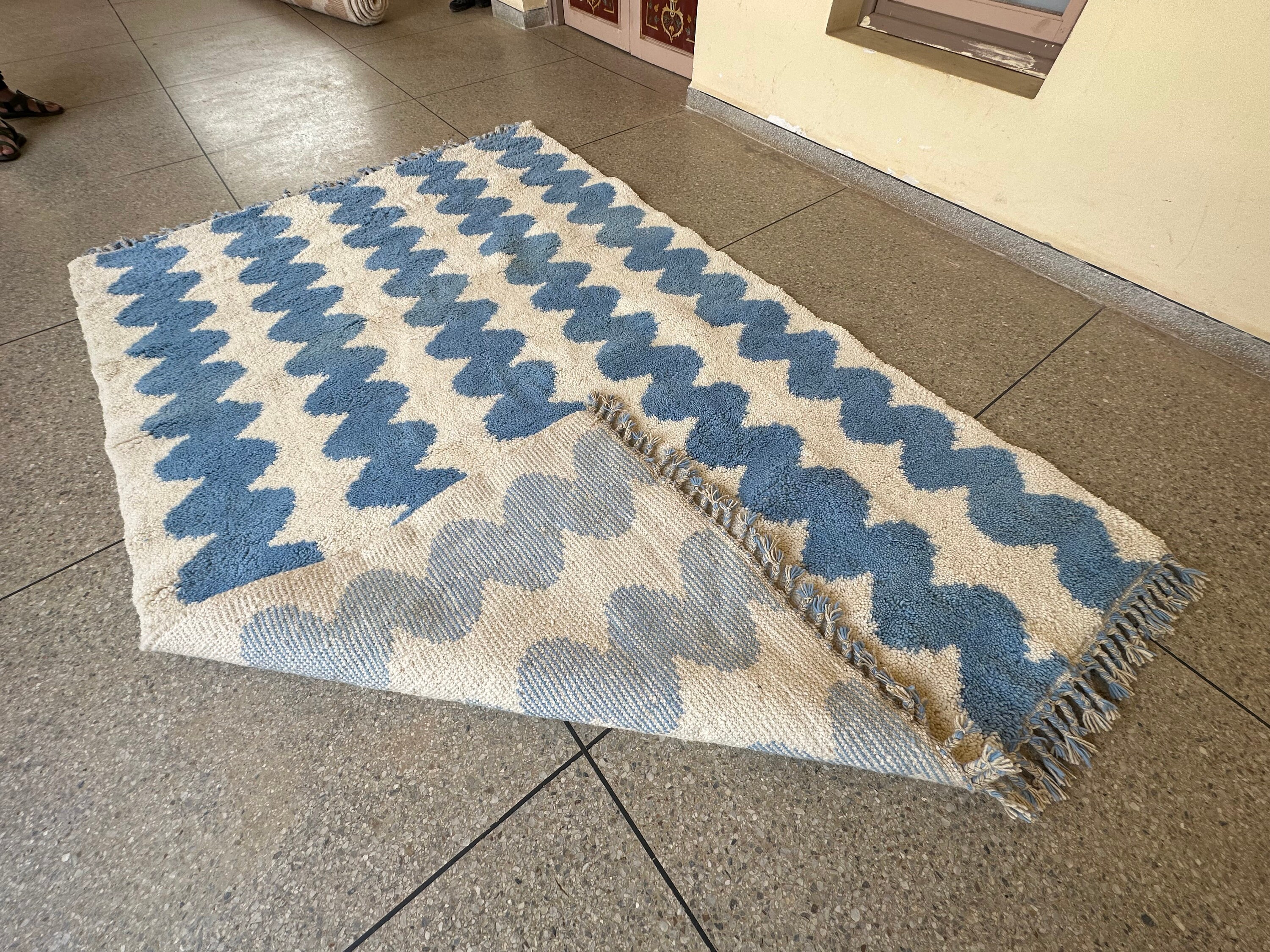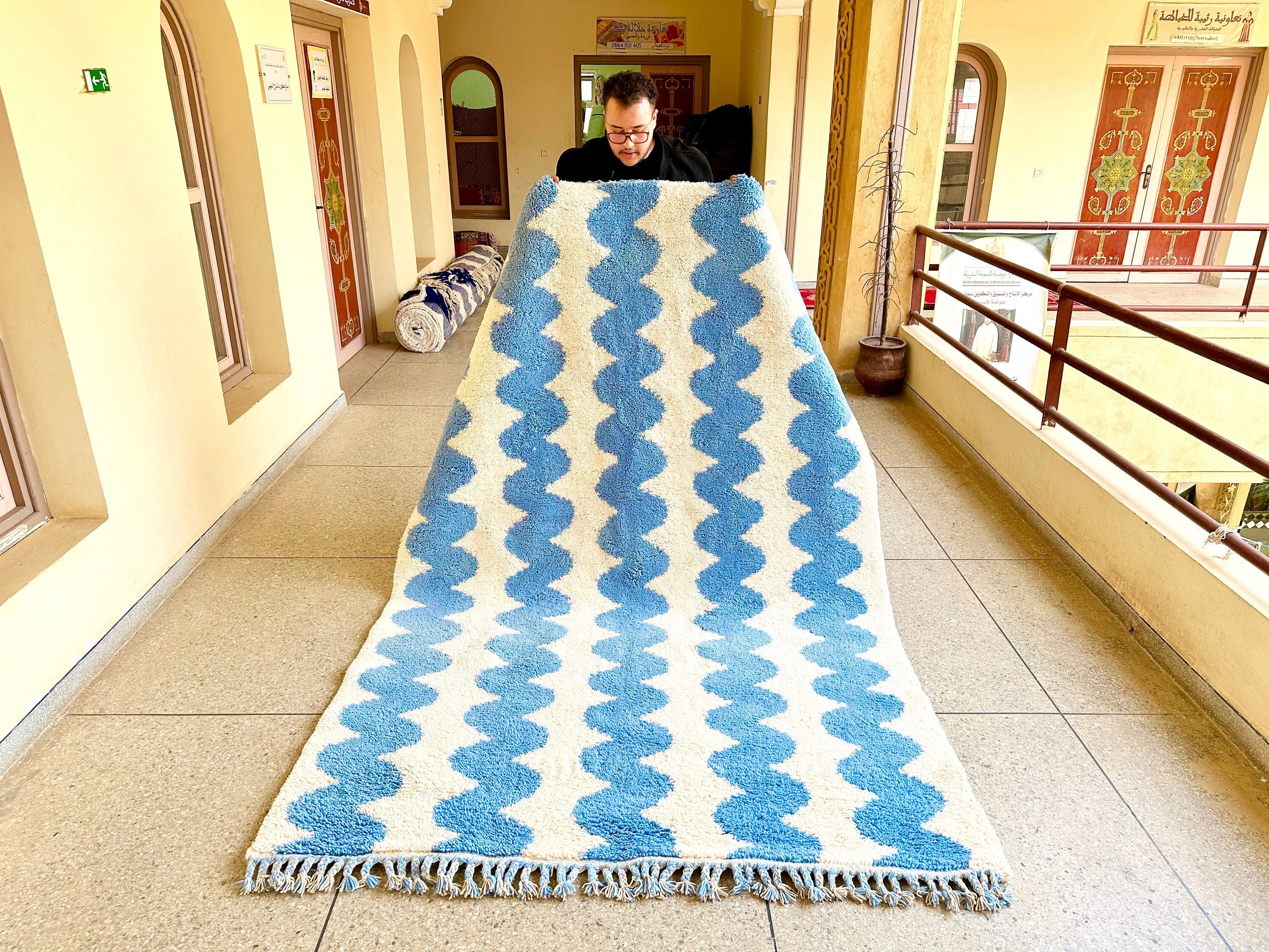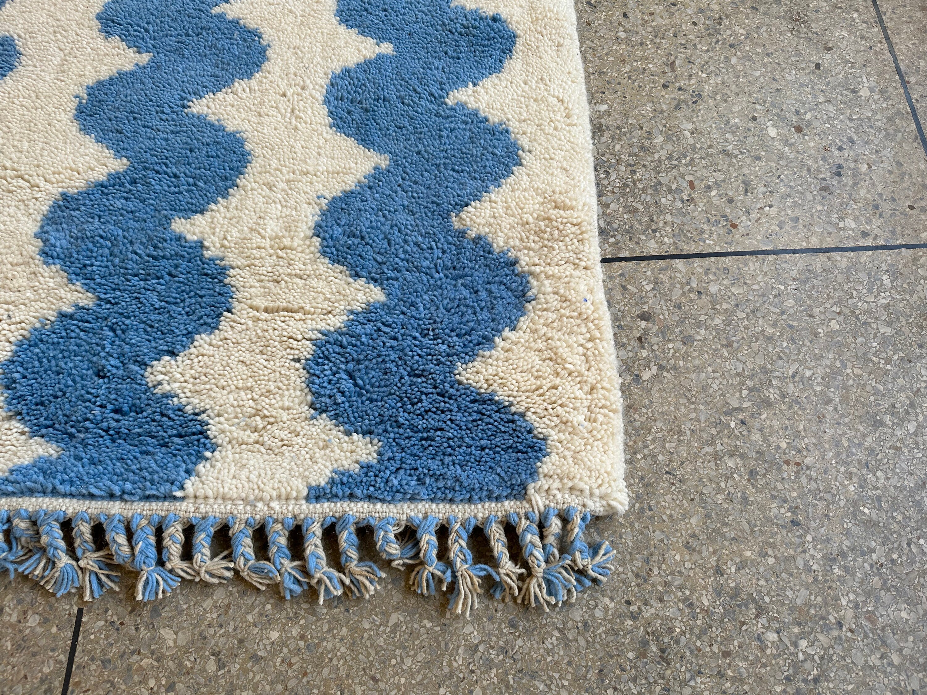 Transform your space with this stunning BENI OURAIN RUG. Handmade with high-quality wool in blue and white stripes, this CUSTOM SIZE Berber rug adds a touch of Moroccan charm. Elevate your decor with this unique and timeless piece!
