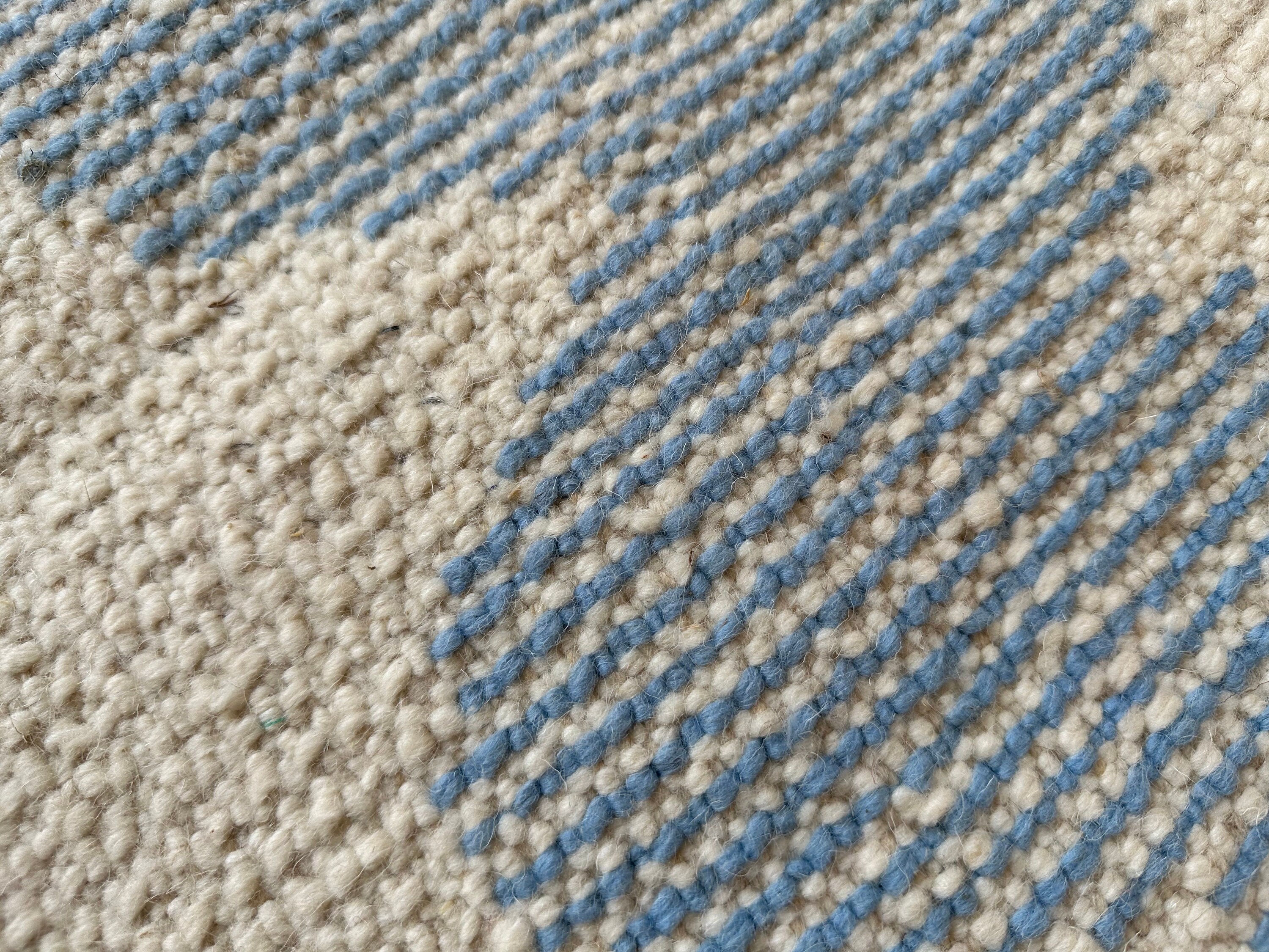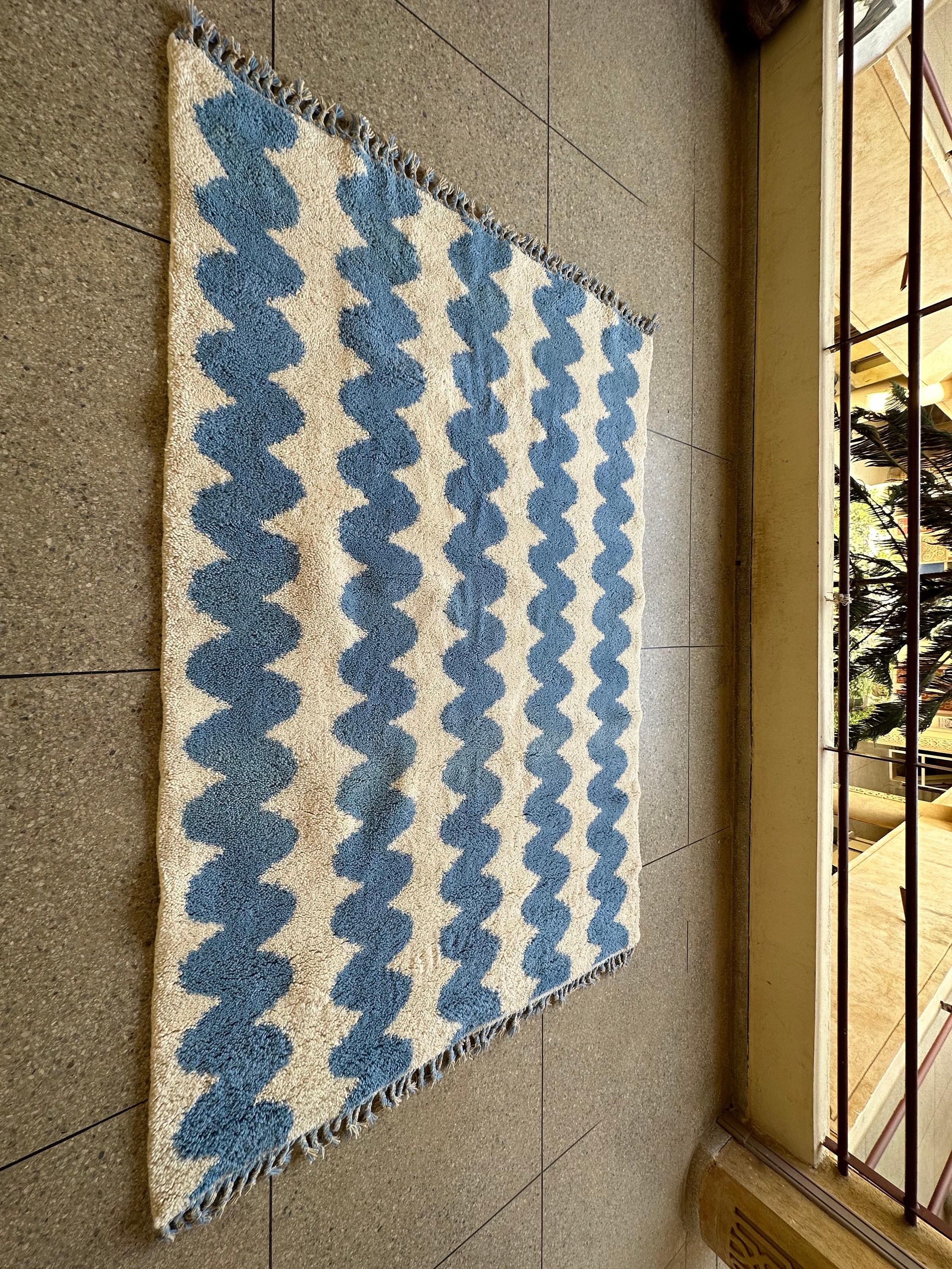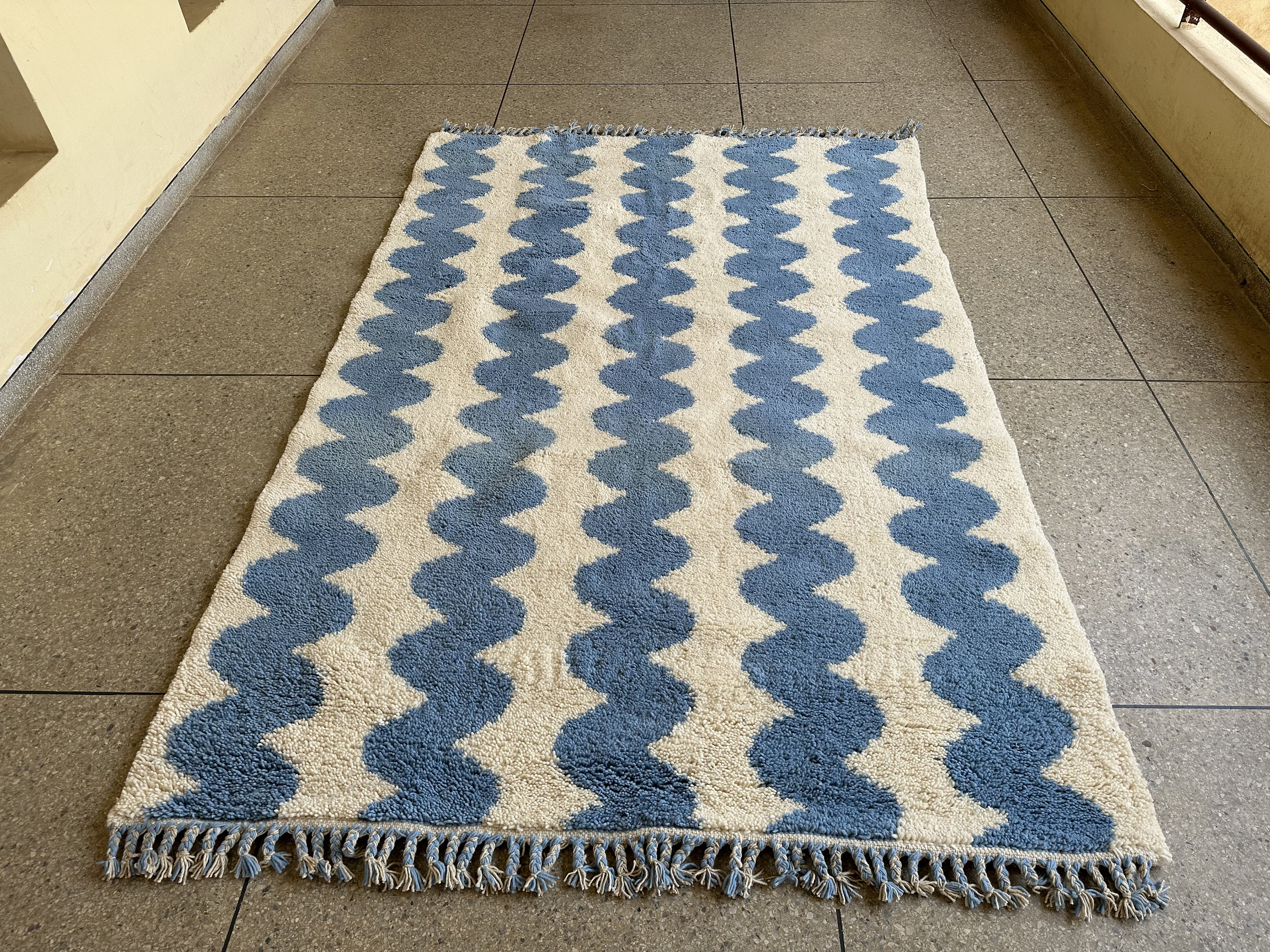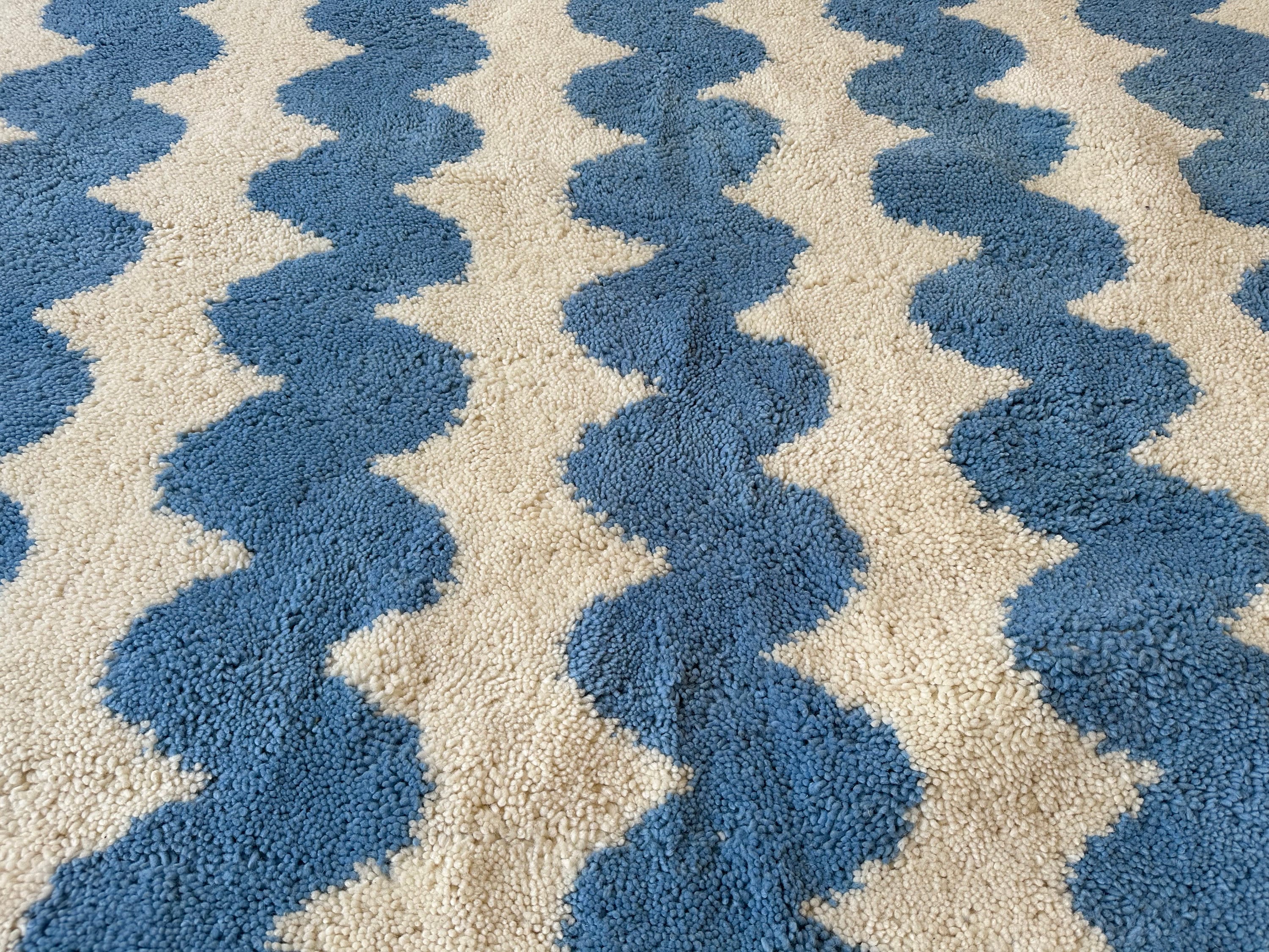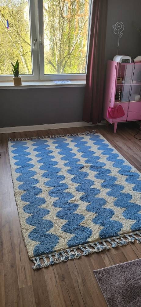 Transform your space with this stunning BENI OURAIN RUG. Handmade with high-quality wool in blue and white stripes, this CUSTOM SIZE Berber rug adds a touch of Moroccan charm. Elevate your decor with this unique and timeless piece!