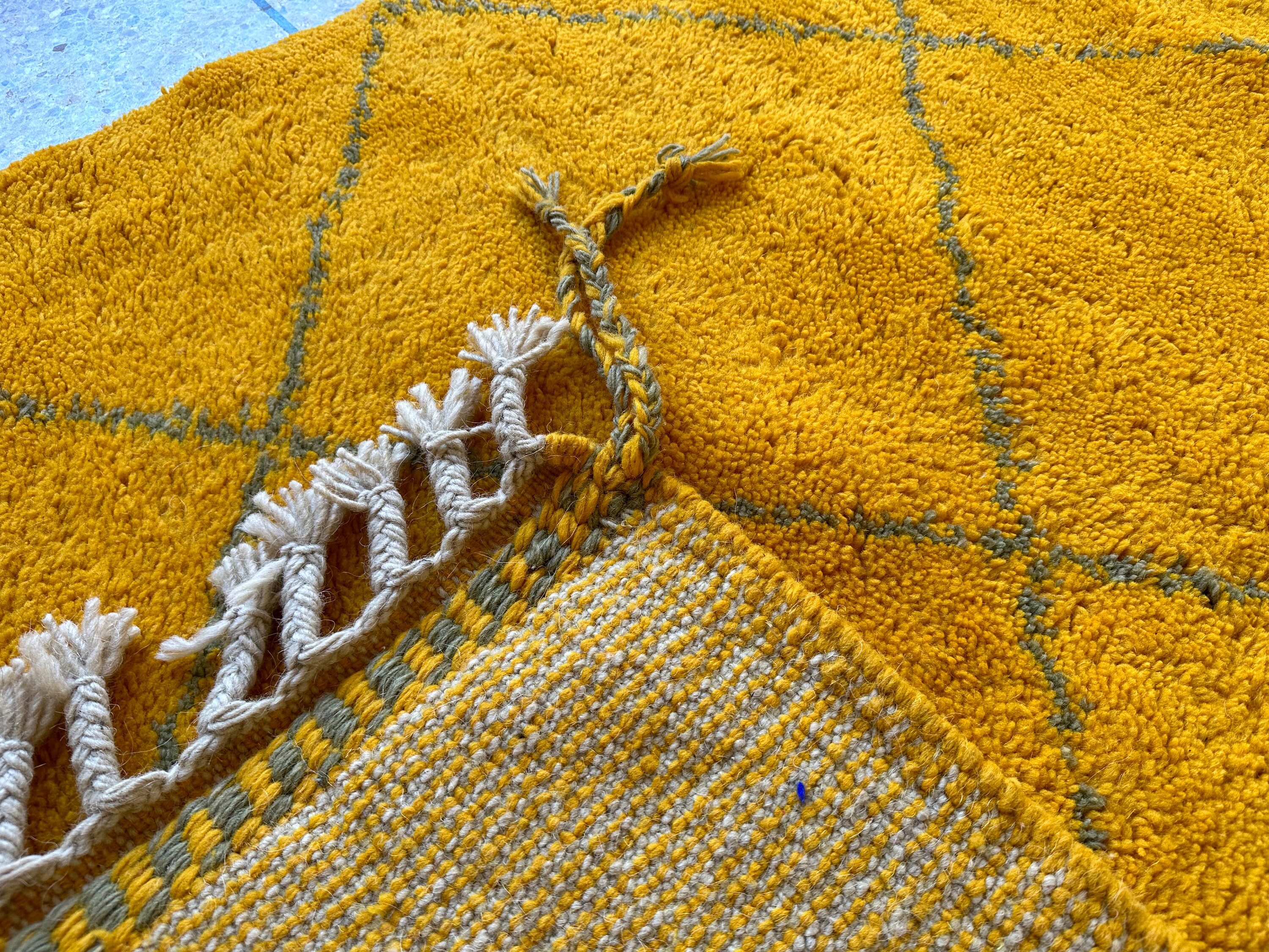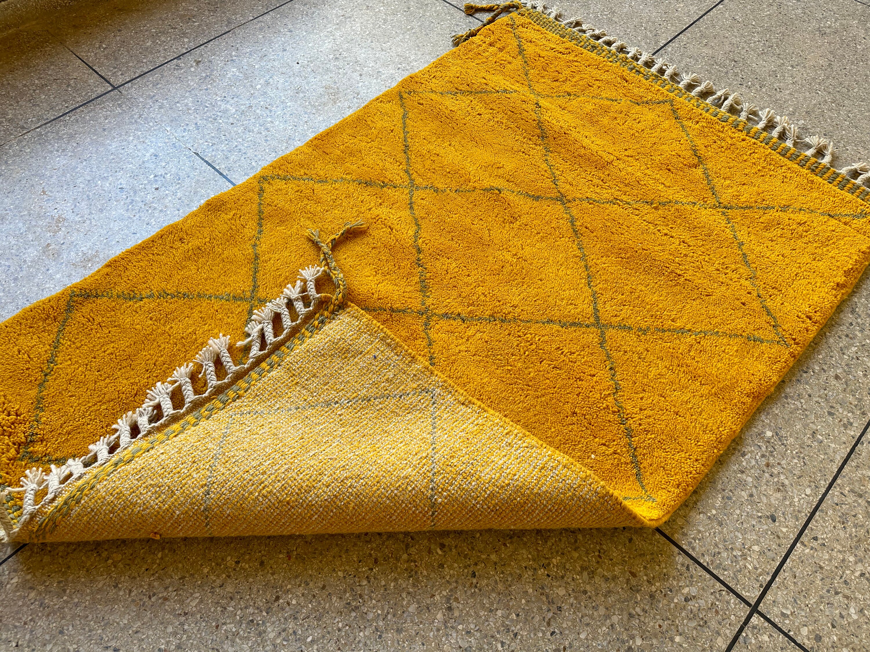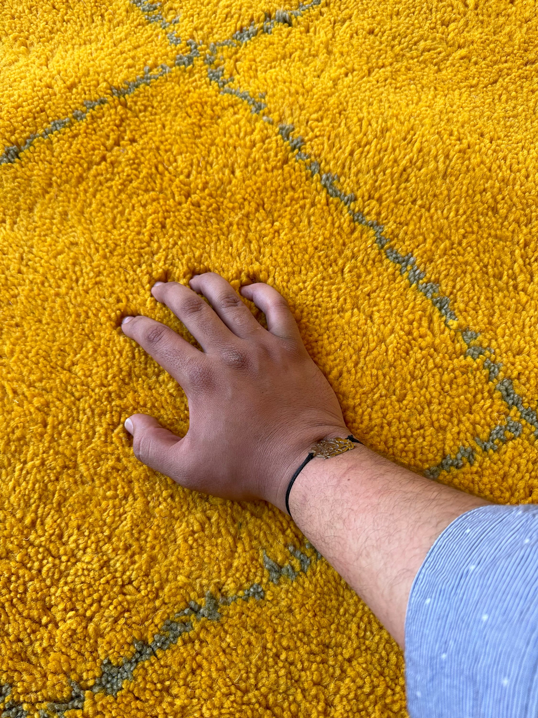 Brighten up your home with this stunning yellow geometric Beni Ourain rug! Handwoven from premium sheep wool, this Moroccan masterpiece features an elegant diamond pattern, blending traditional craftsmanship with modern Scandinavian and bohemian aesthetics. Soft, cozy, and durable, it's the perfect statement piece for your living room, bedroom, or office. Add warmth, texture, and a touch of Moroccan charm to your space with this unique handmade area rug. Order your custom wool rug today!
