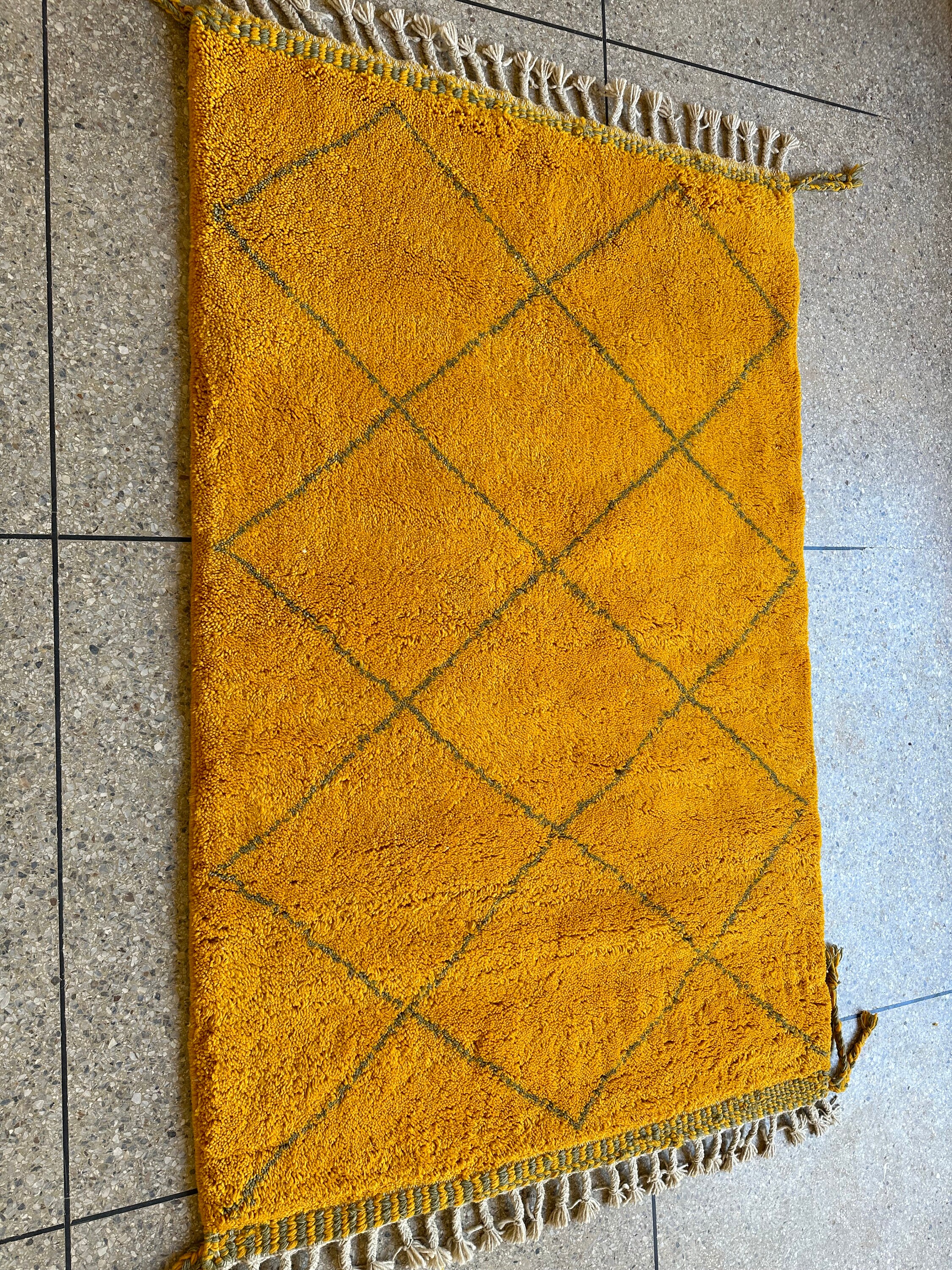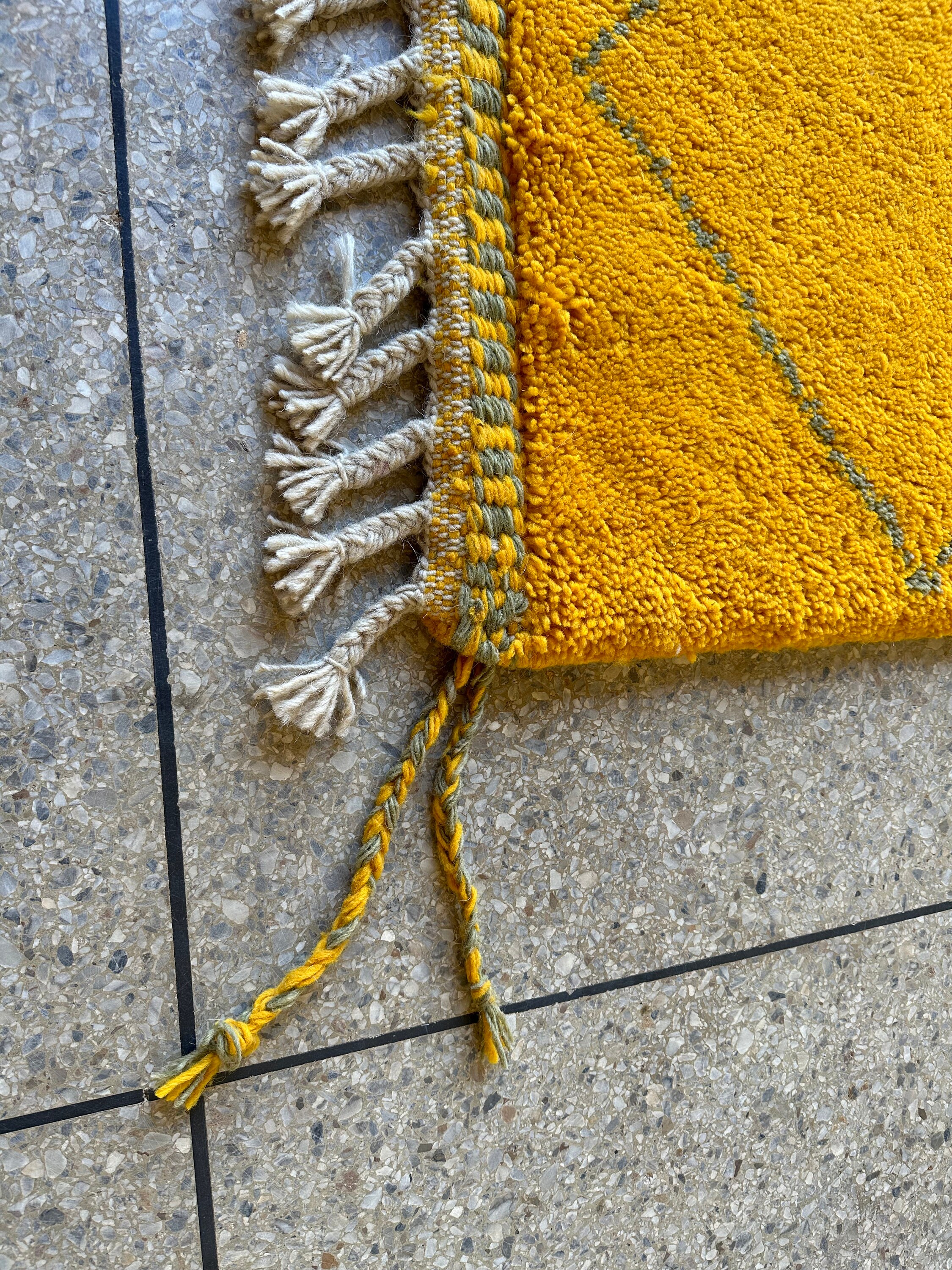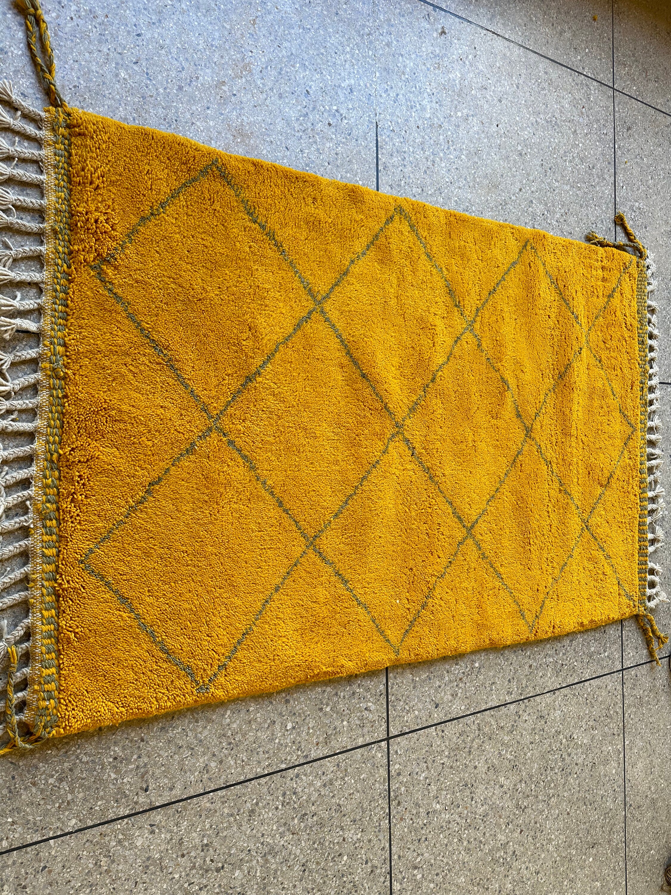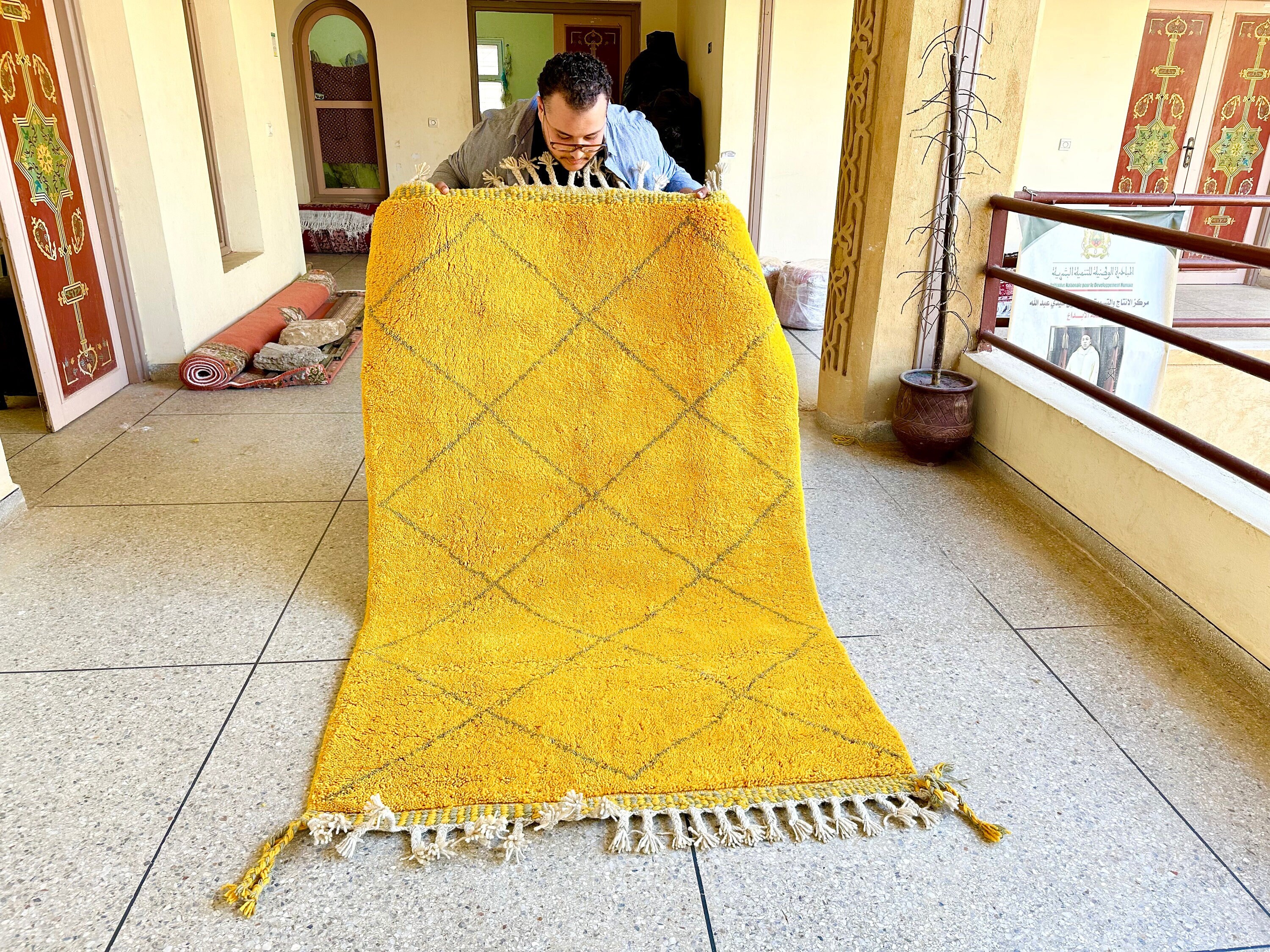 Brighten up your home with this stunning yellow geometric Beni Ourain rug! Handwoven from premium sheep wool, this Moroccan masterpiece features an elegant diamond pattern, blending traditional craftsmanship with modern Scandinavian and bohemian aesthetics. Soft, cozy, and durable, it's the perfect statement piece for your living room, bedroom, or office. Add warmth, texture, and a touch of Moroccan charm to your space with this unique handmade area rug. Order your custom wool rug today!