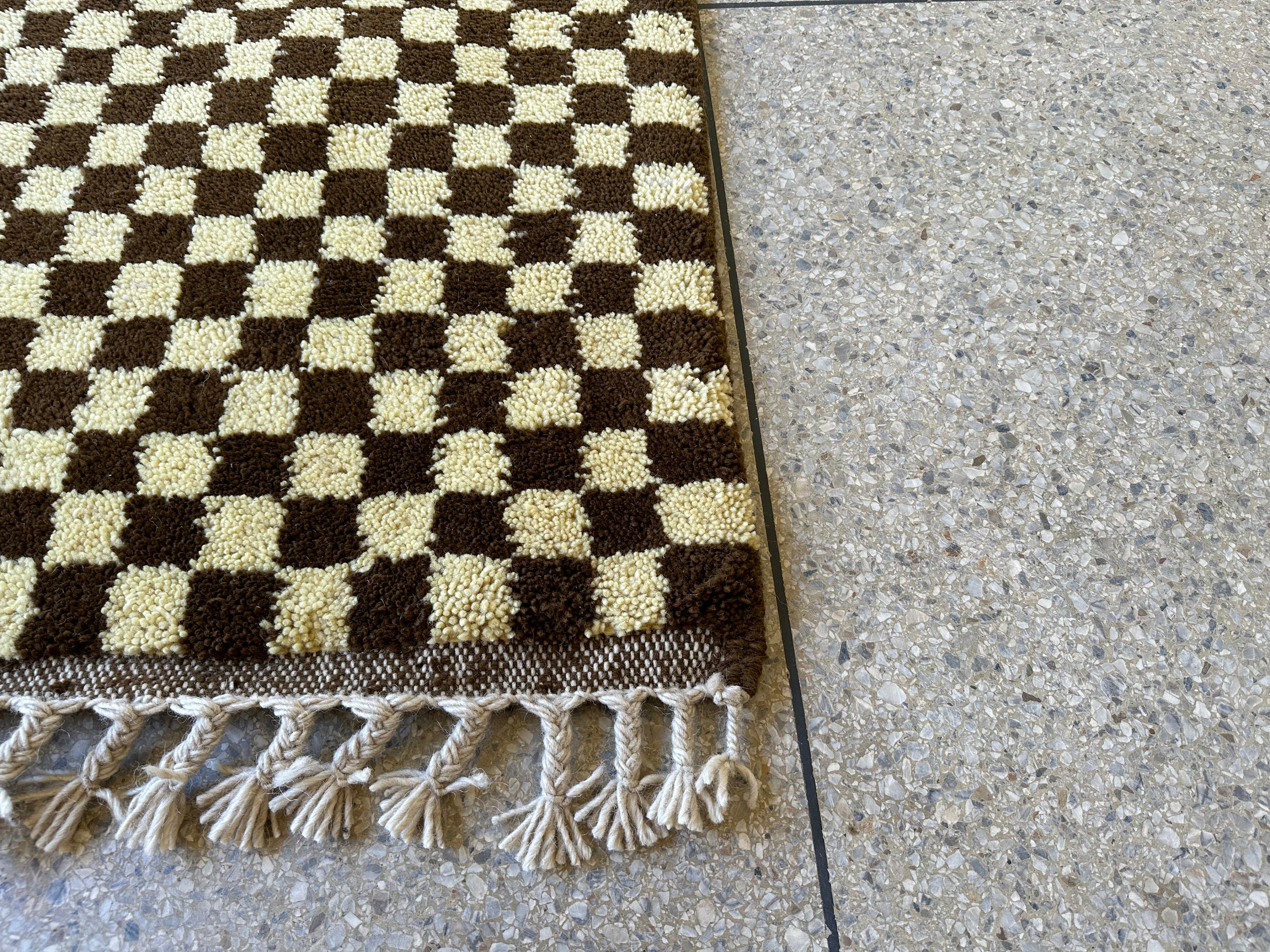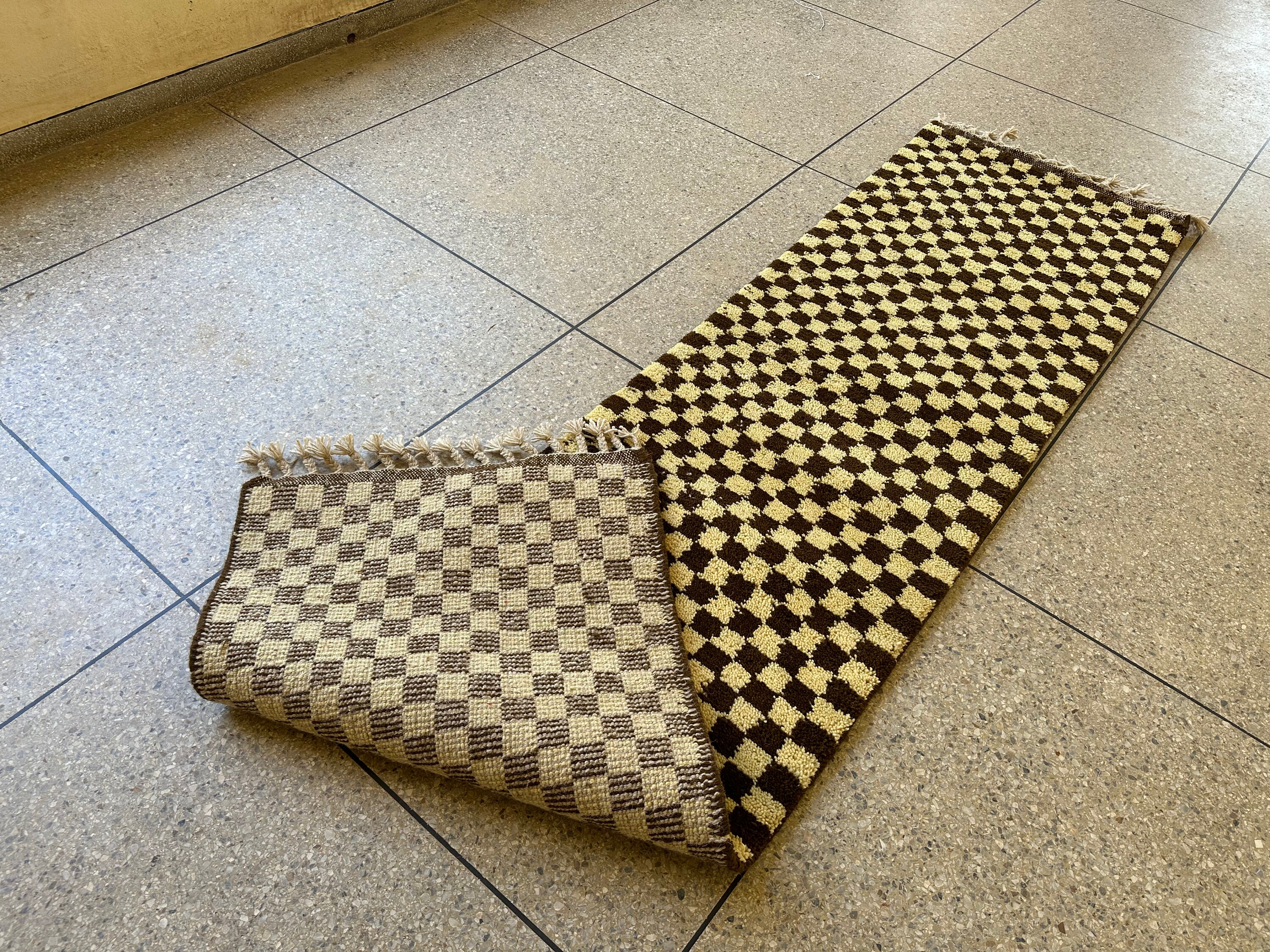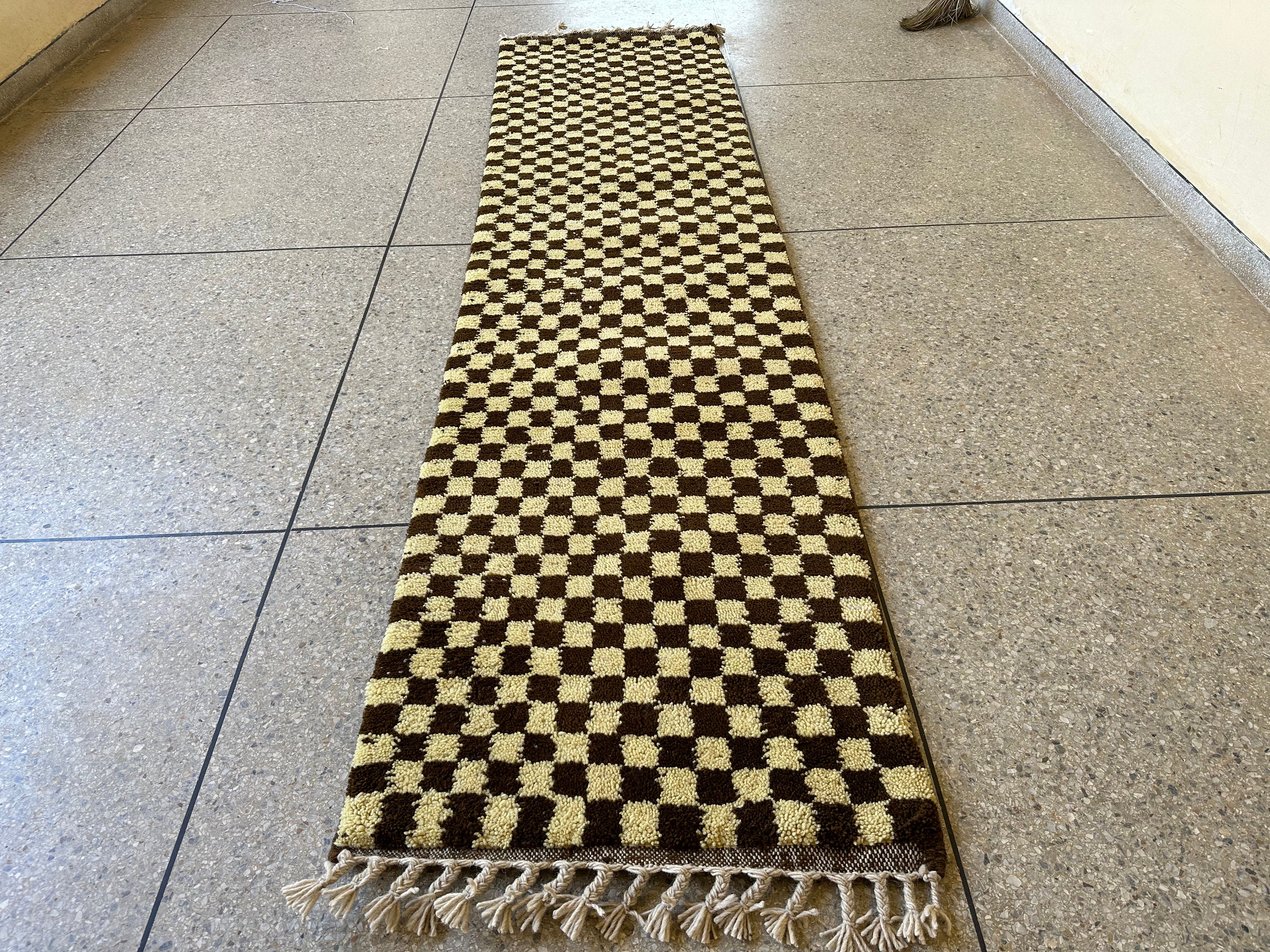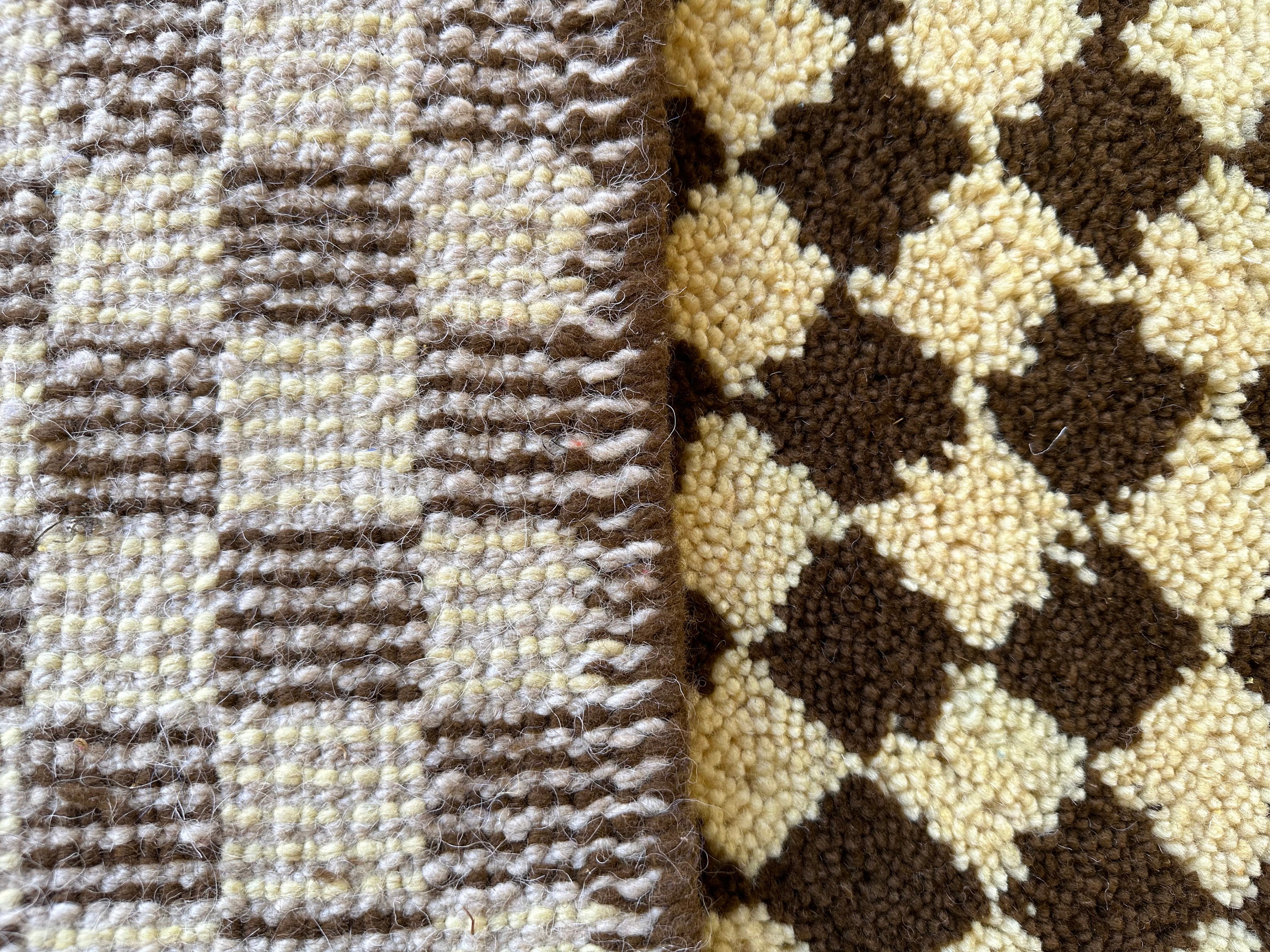 Elevate your space with our AUTHENTIC CHECKERED RUNNER, handcrafted from luxurious wool for lasting elegance. This Beni Ourain Moroccan Carpet features a stunning ivory and brown design, perfect for your hallway or entryway. Its intricate hand-knotted construction adds a unique touch to any Berber kitchen or living area. Bring warmth and style to your home with this exquisite wool hallway runner—where tradition meets modern decor! Ideal for enhancing any room's aesthetic while providing comfort underfoot.