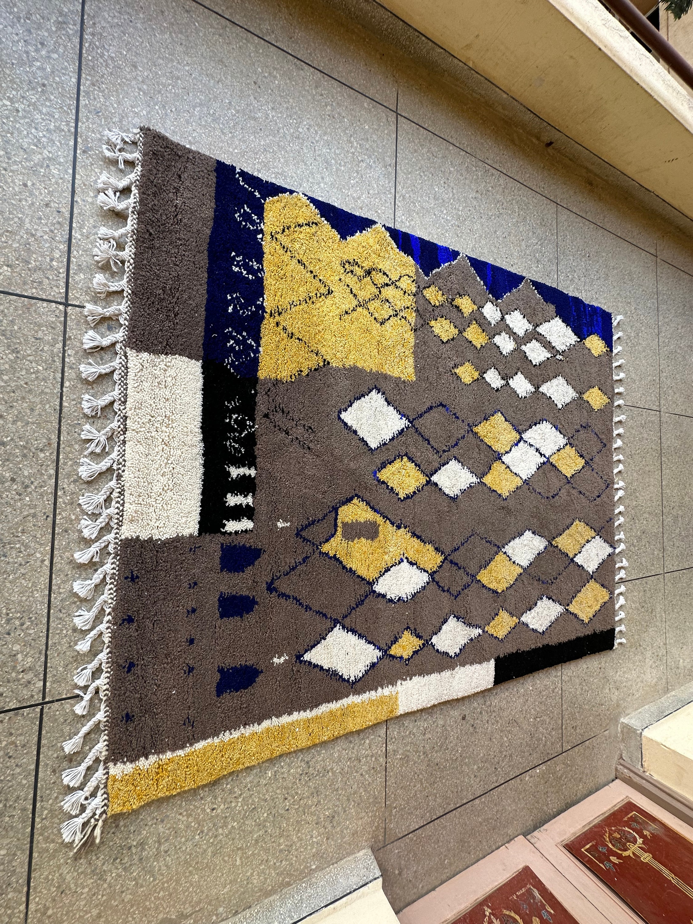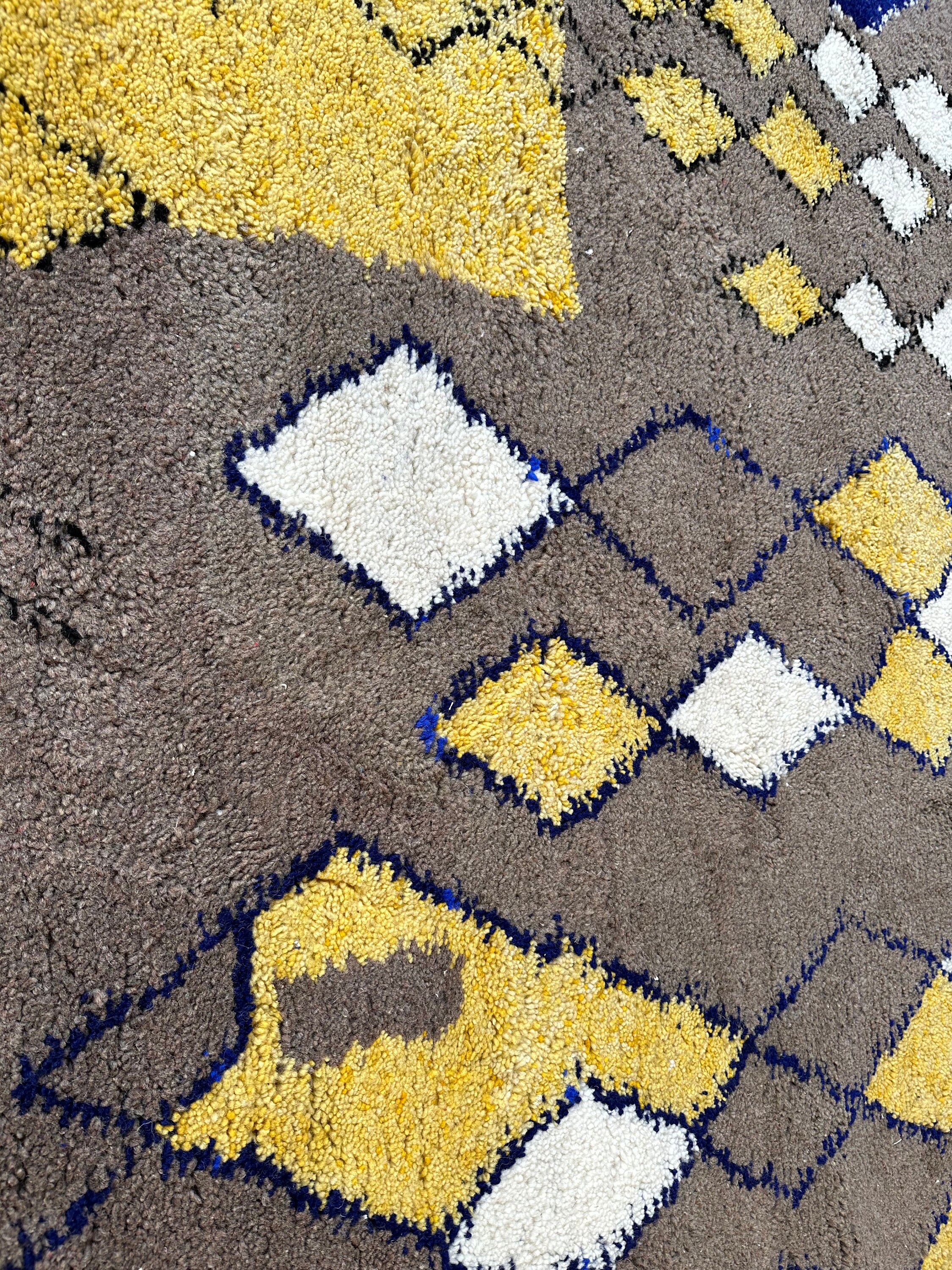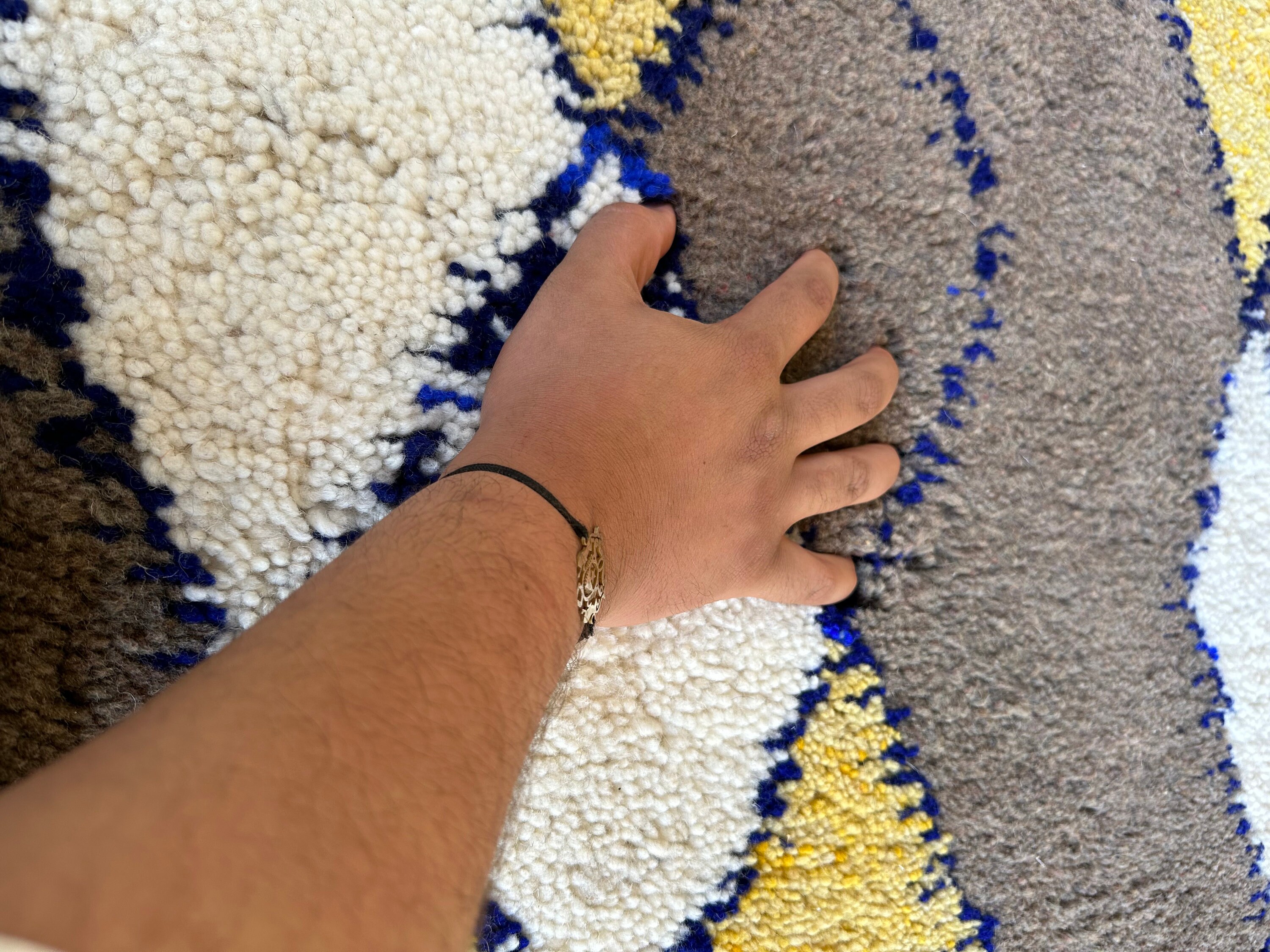 Brighten your space with this handmade gray & yellow Beni Ourain rug — soft wool, abstract charm, and perfect for cozy boho vibes.