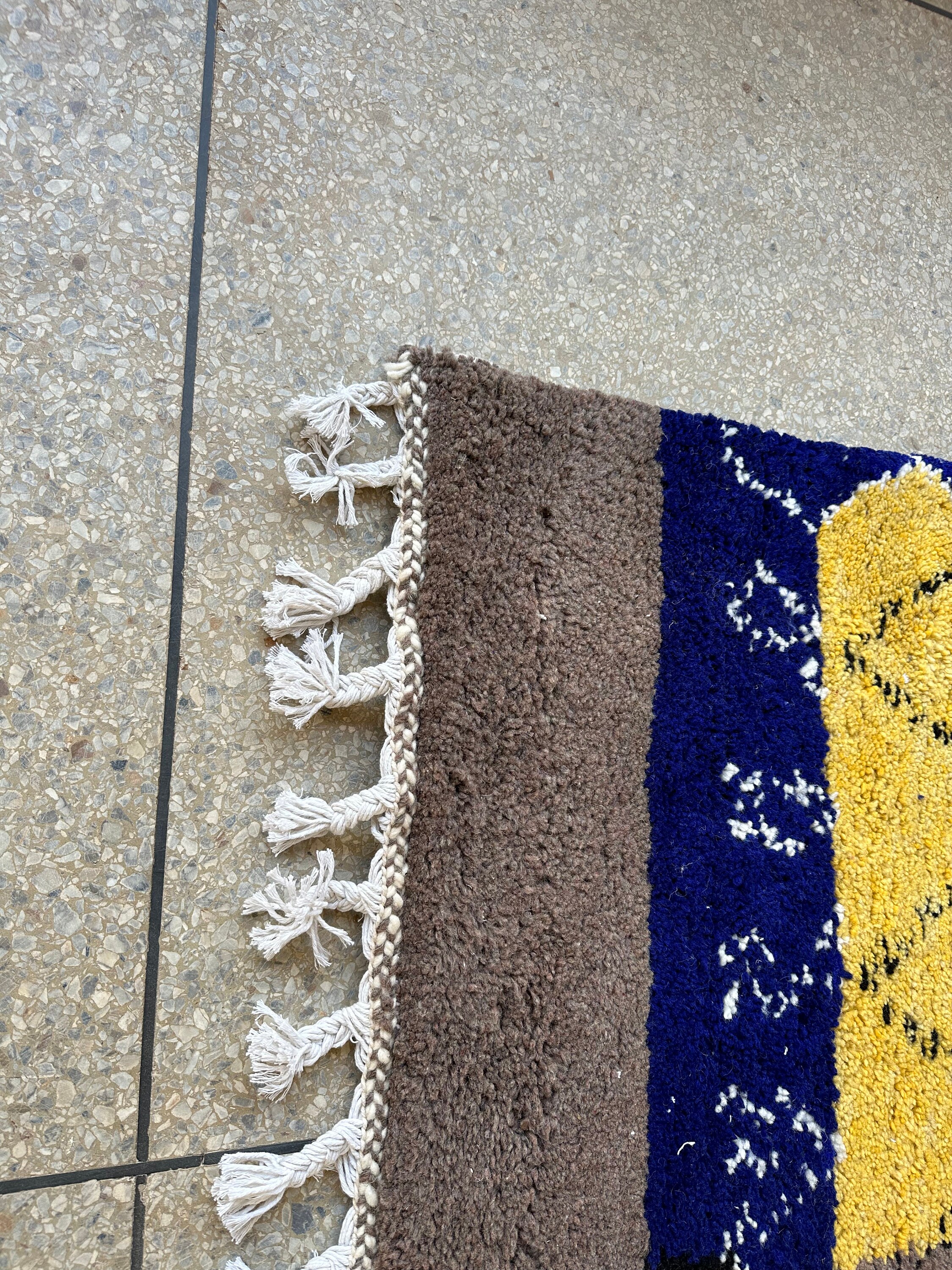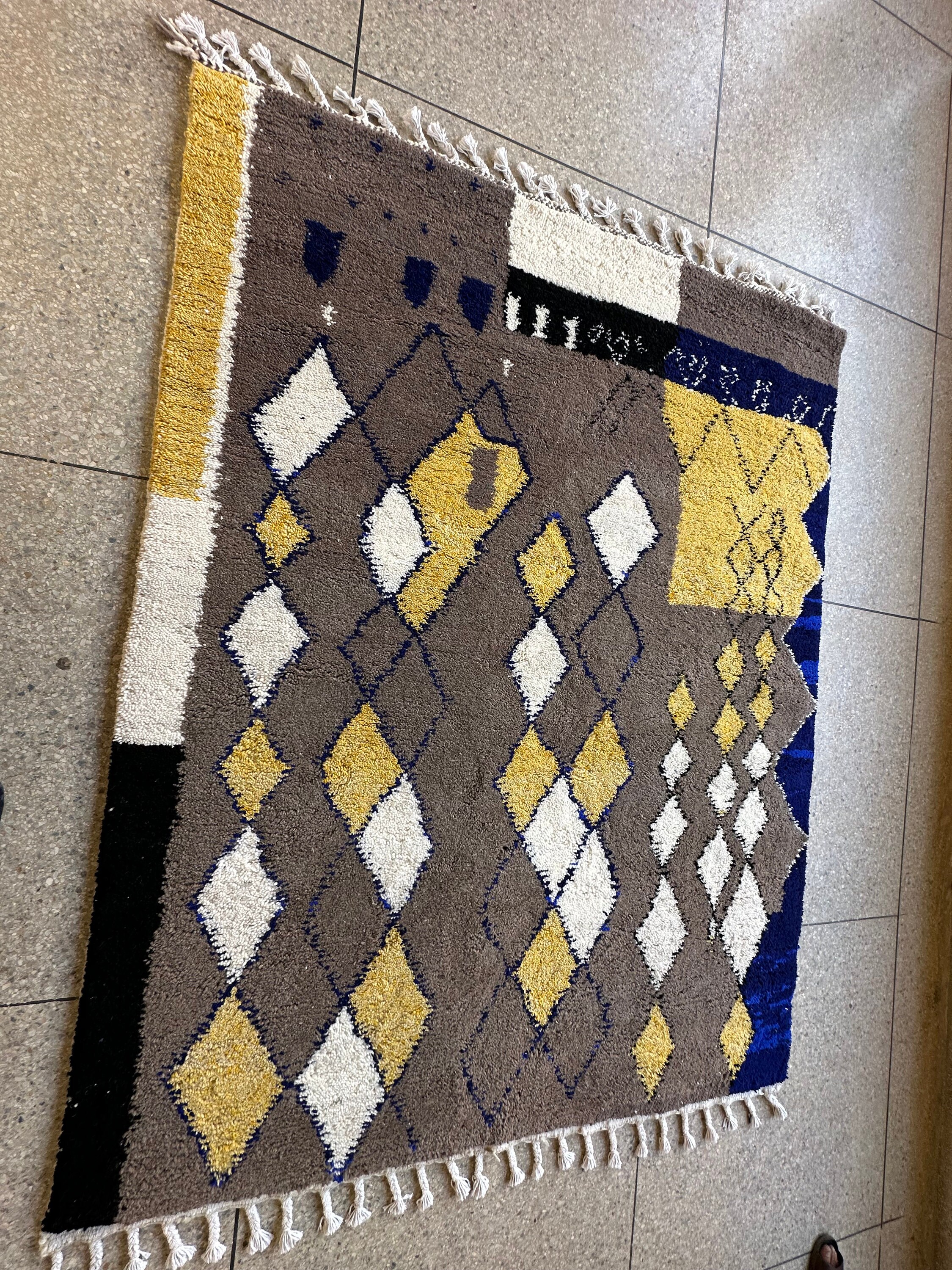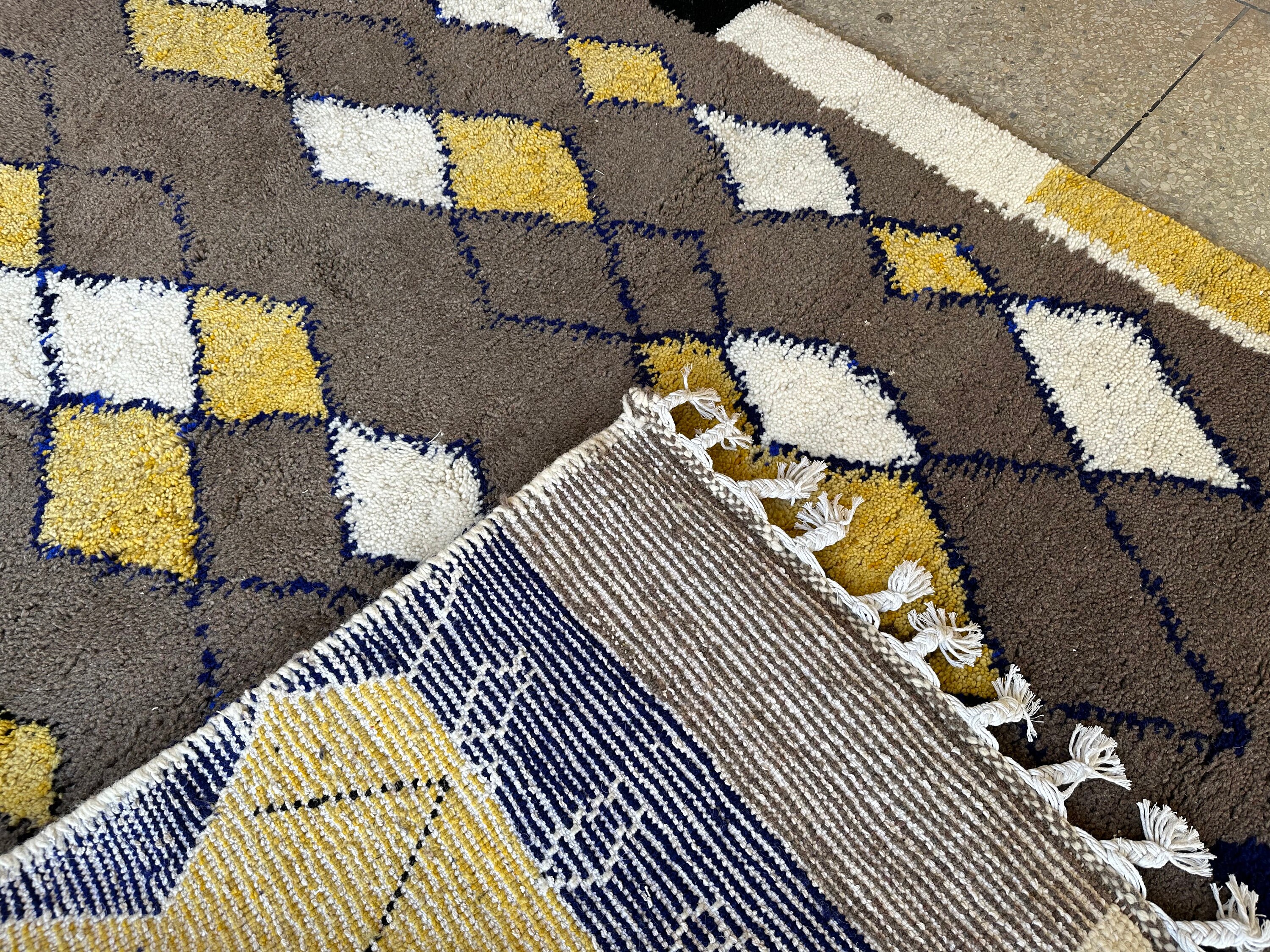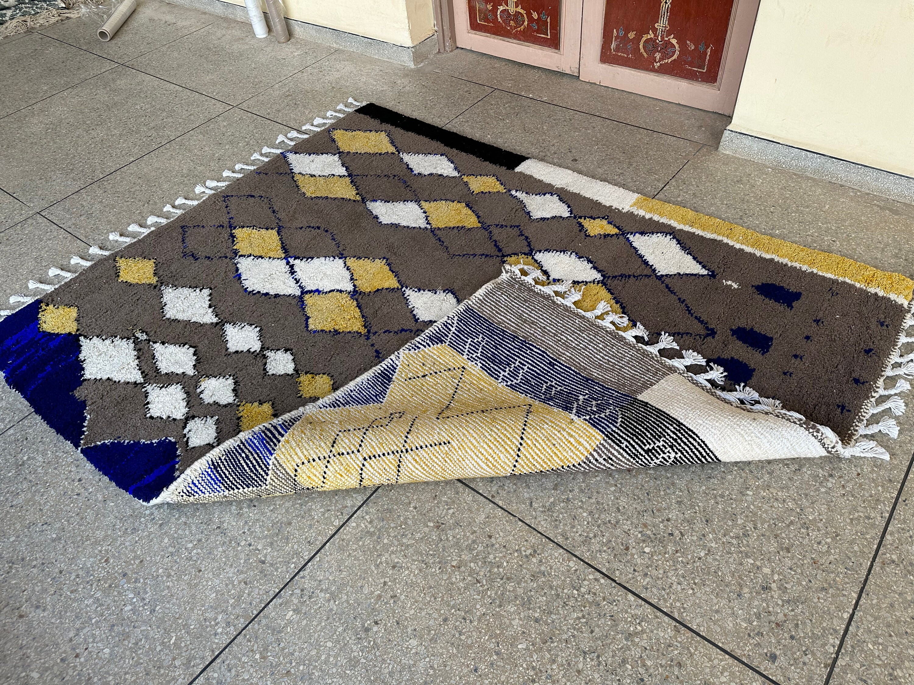 Brighten your space with this handmade gray & yellow Beni Ourain rug — soft wool, abstract charm, and perfect for cozy boho vibes.