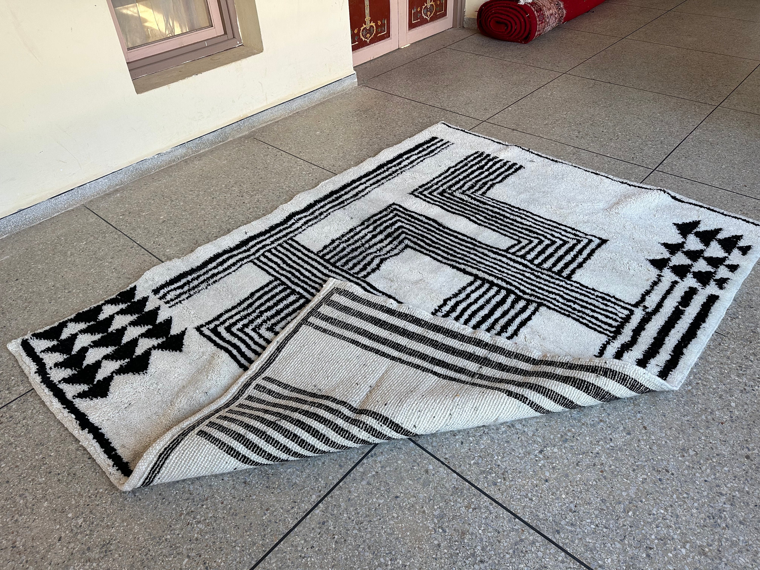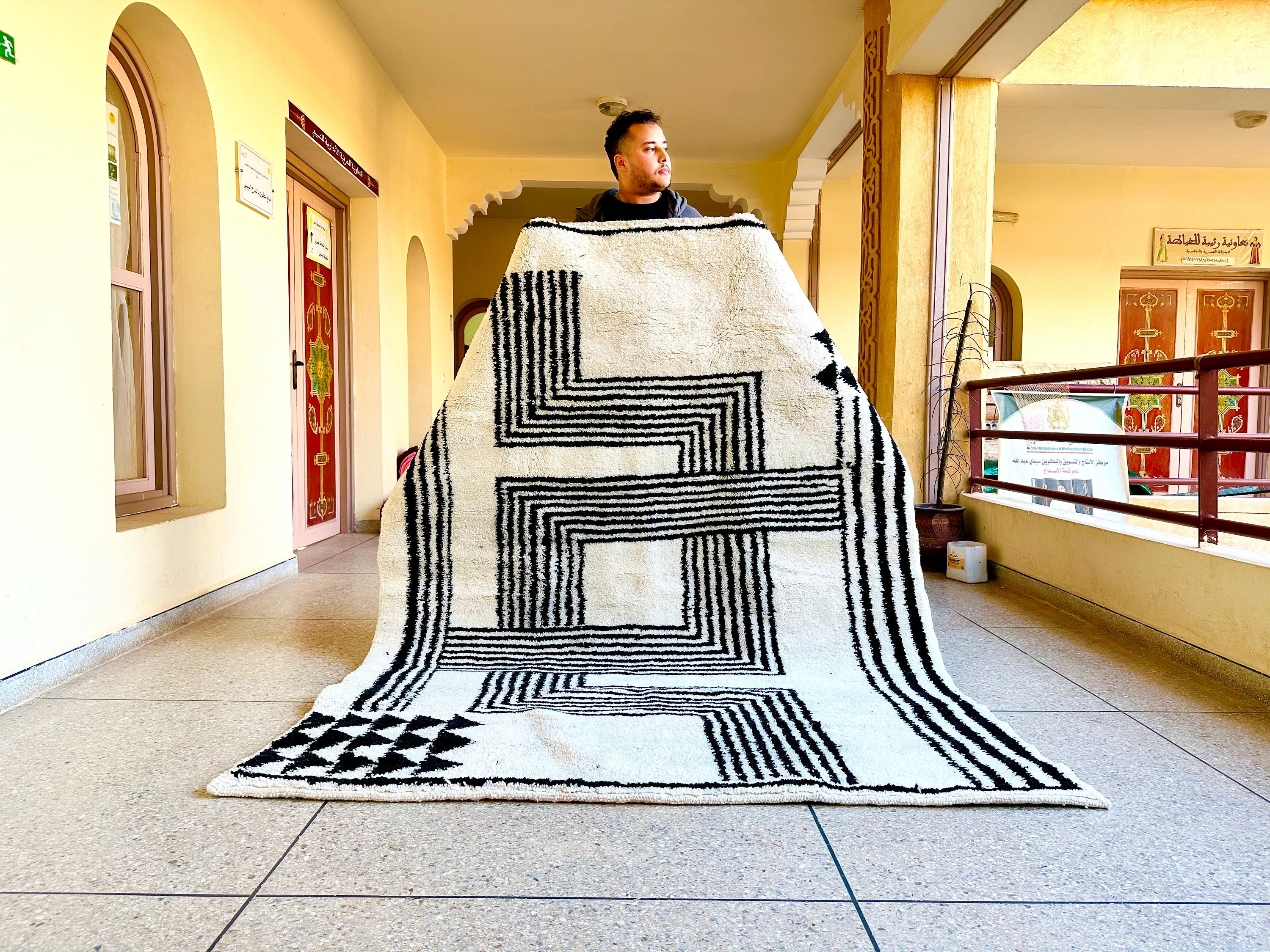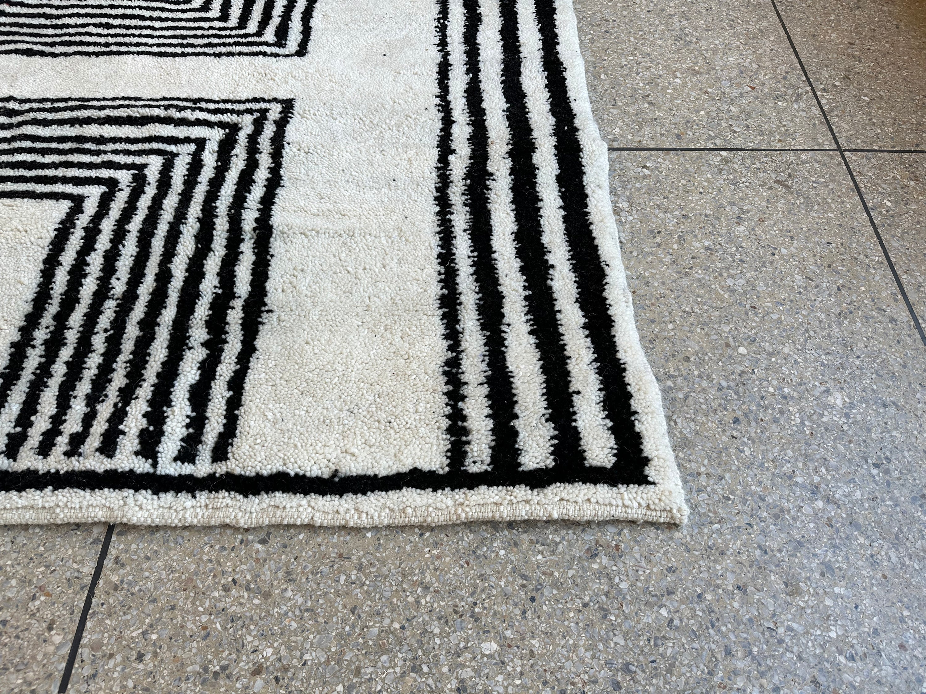 Elevate your space with this amazing Beni Ourain rug! Handwoven in Morocco from high-quality sheep wool, this custom black and white area rug features classic stripes in a timeless Berber design. Add a touch of elegance and cozy warmth to any room with this authentic Moroccan carpet.