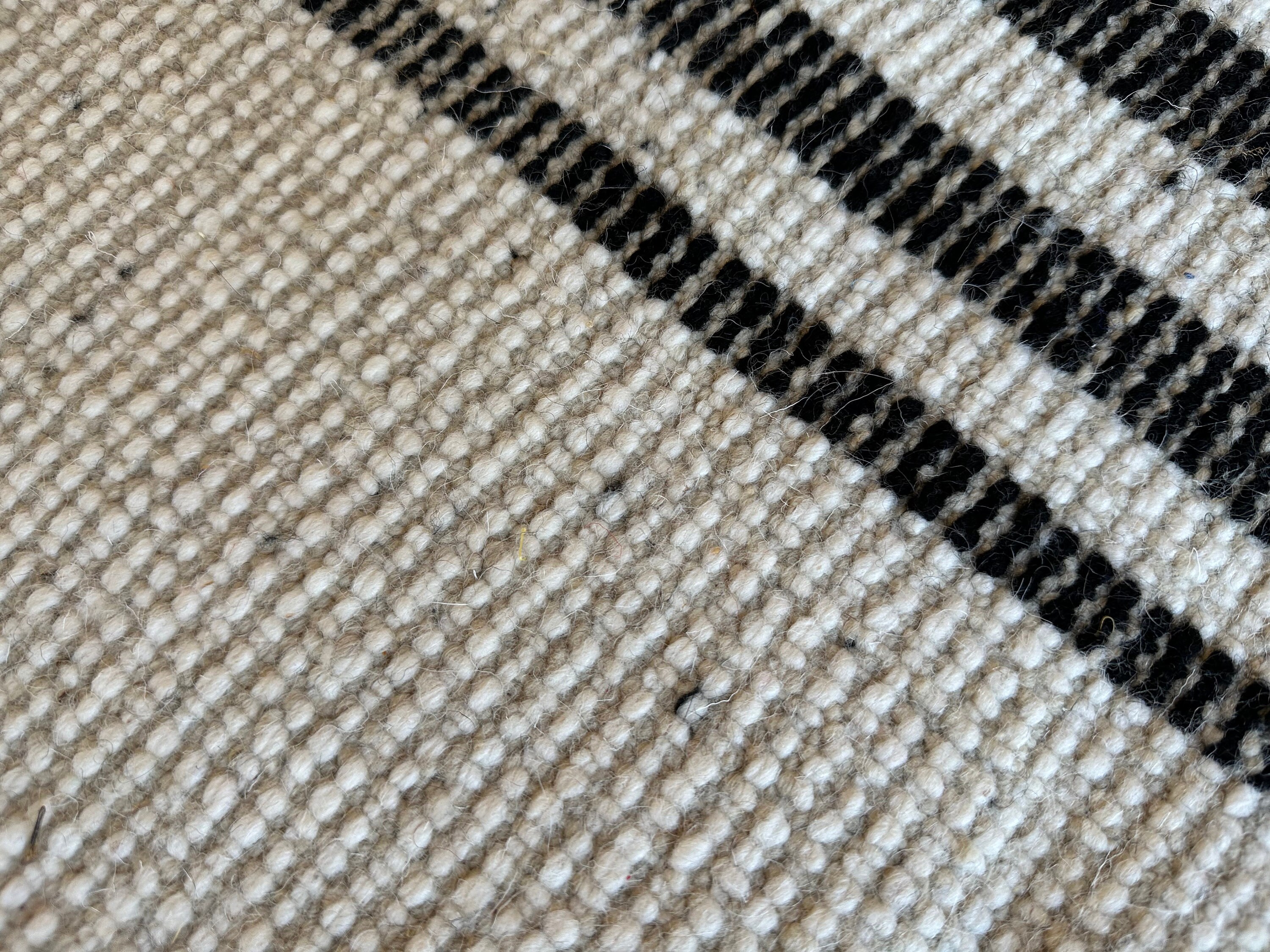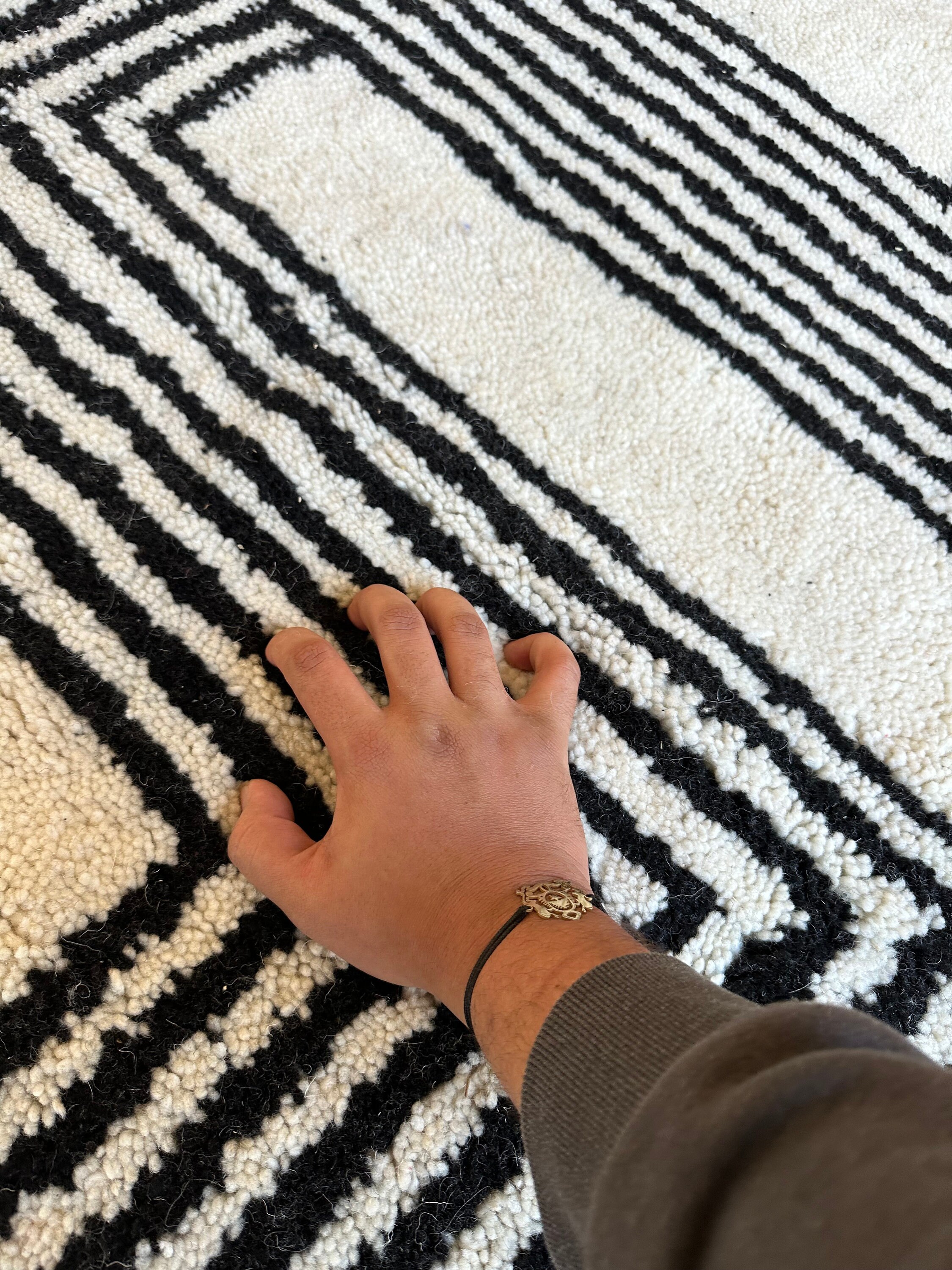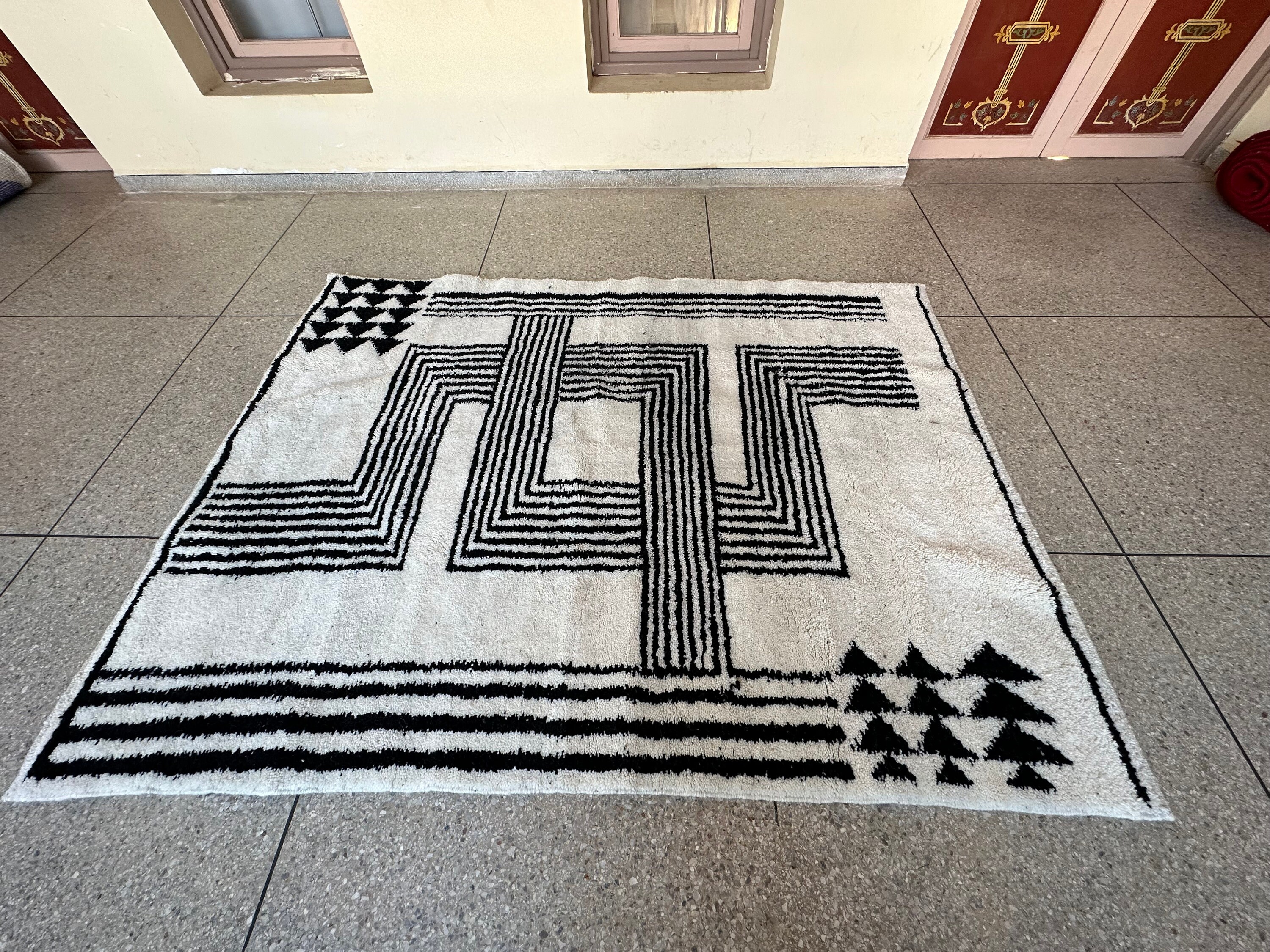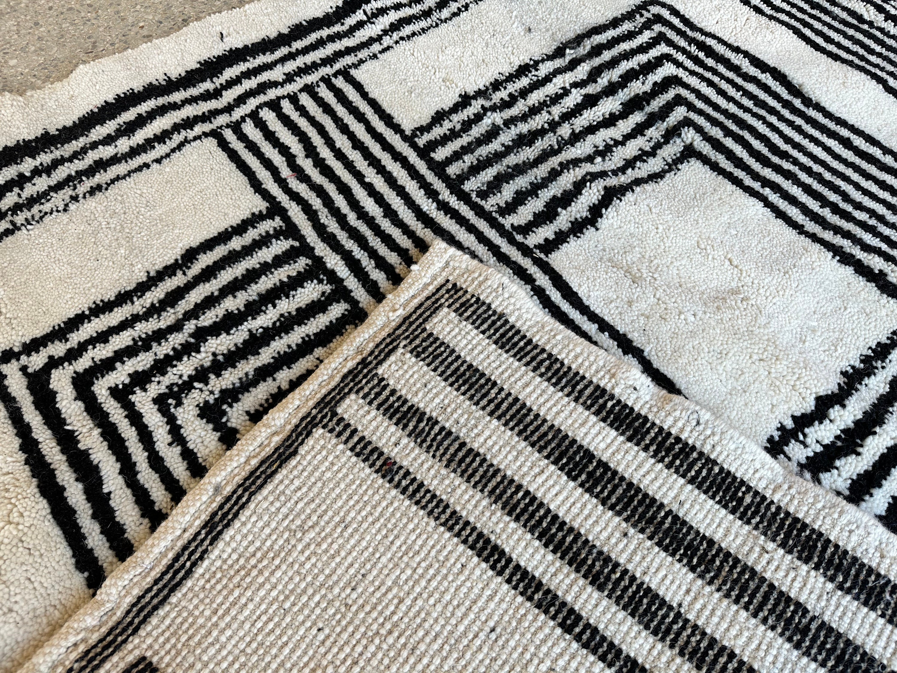Elevate your space with this amazing Beni Ourain rug! Handwoven in Morocco from high-quality sheep wool, this custom black and white area rug features classic stripes in a timeless Berber design. Add a touch of elegance and cozy warmth to any room with this authentic Moroccan carpet.