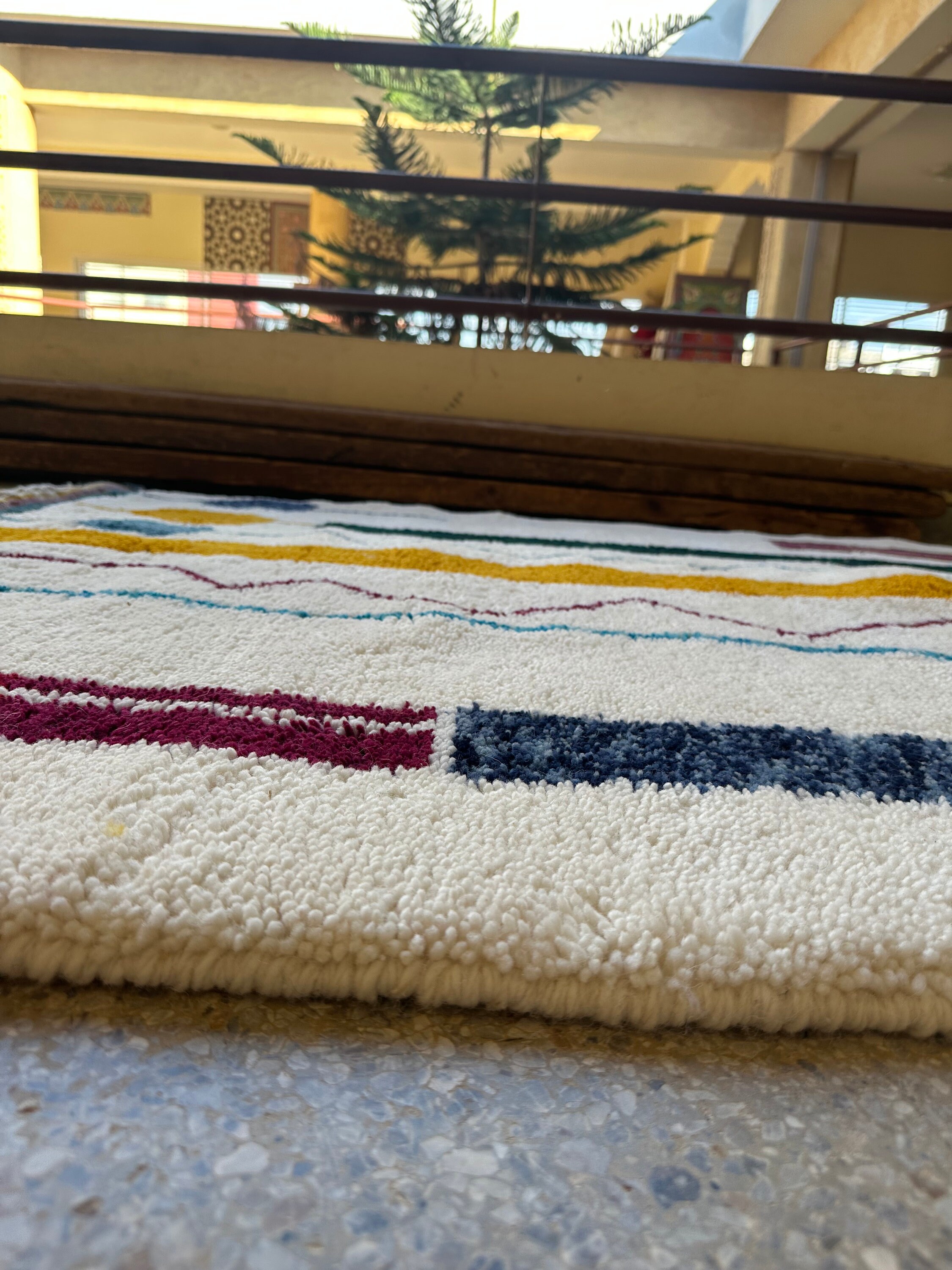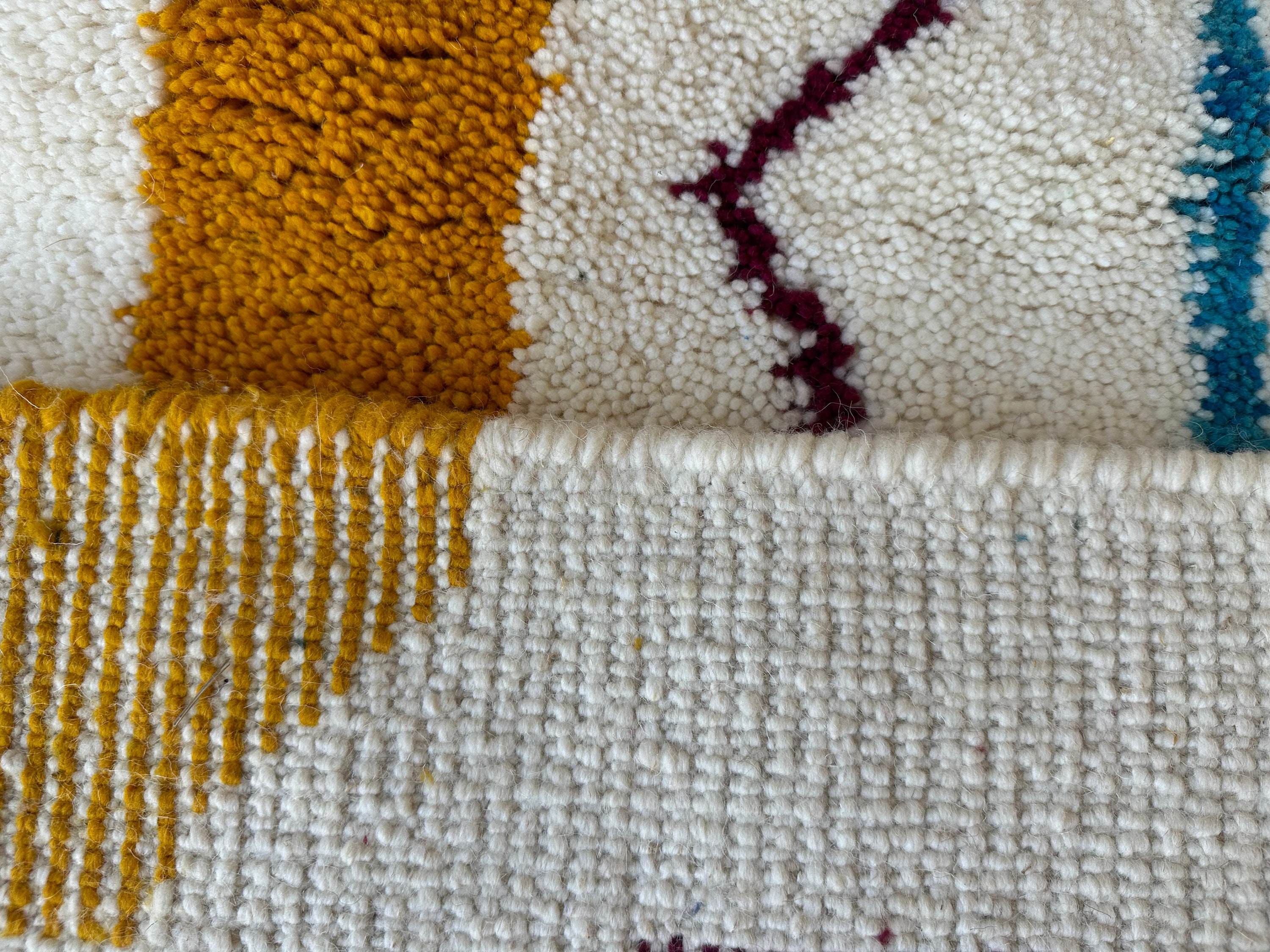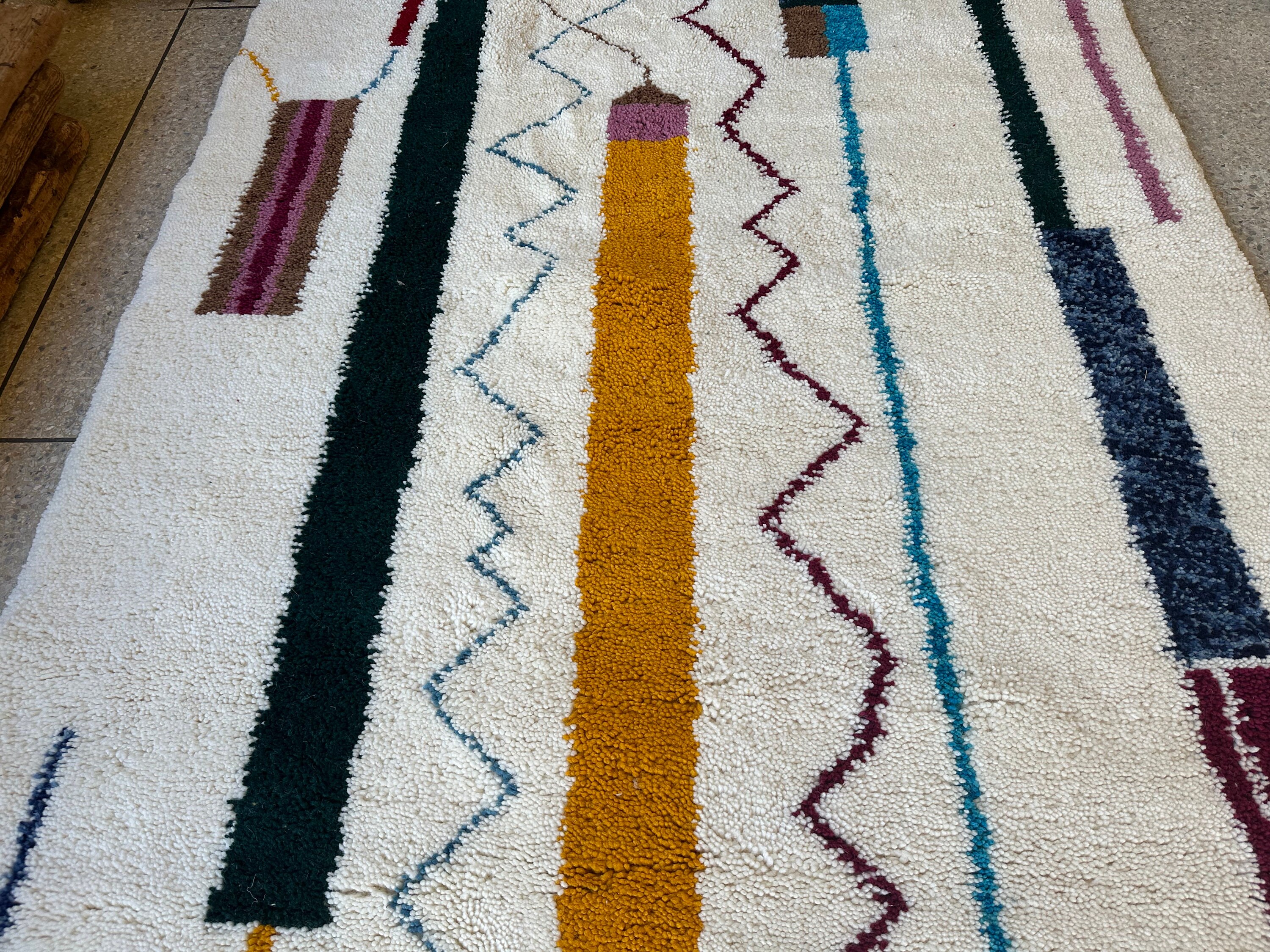 Bright and cozy — this handmade white & yellow Beni Ourain rug features abstract stripes and soft wool texture for the perfect boho accent.