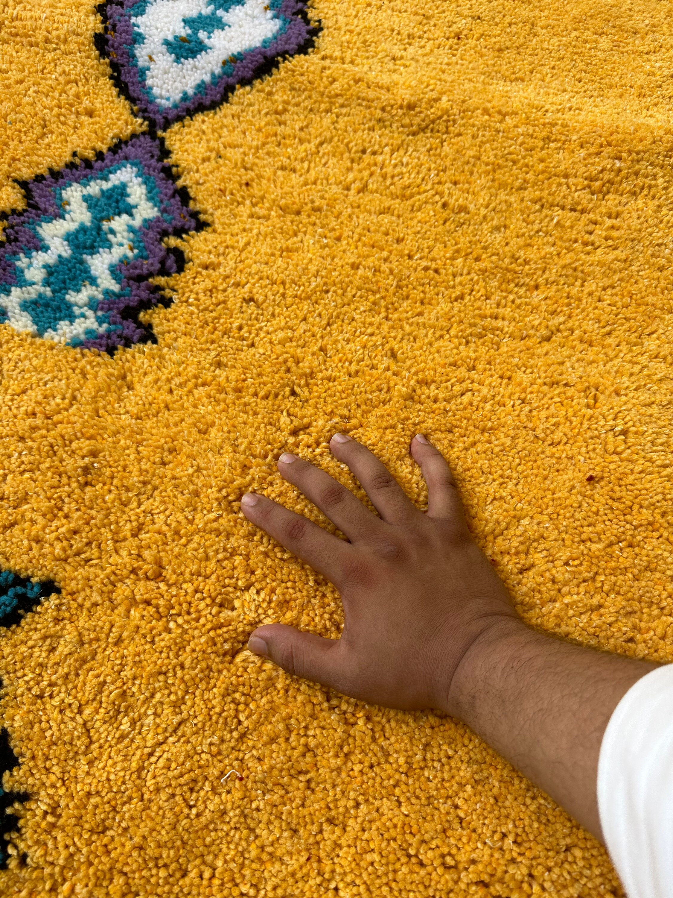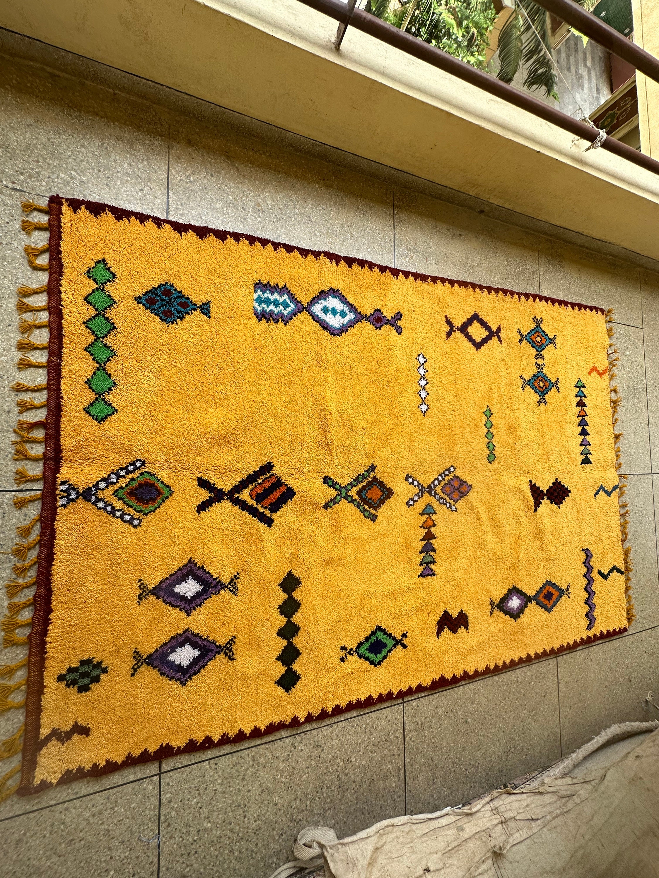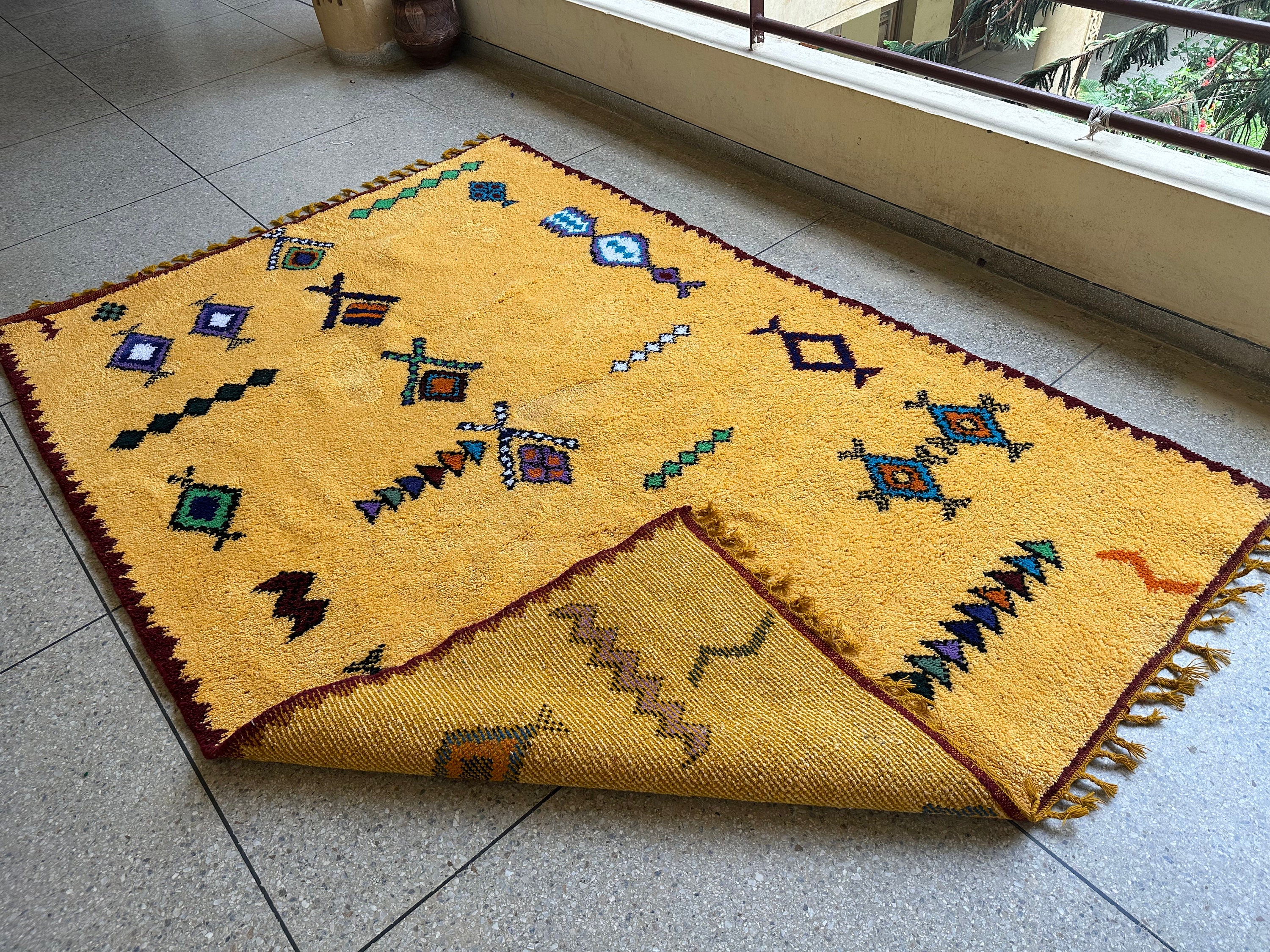 Add warmth and character to your space with this vibrant yellow Beni Ourain rug. Handwoven from soft sheep wool, this abstract Moroccan rug is a unique statement piece for bohemian and eclectic home décor.