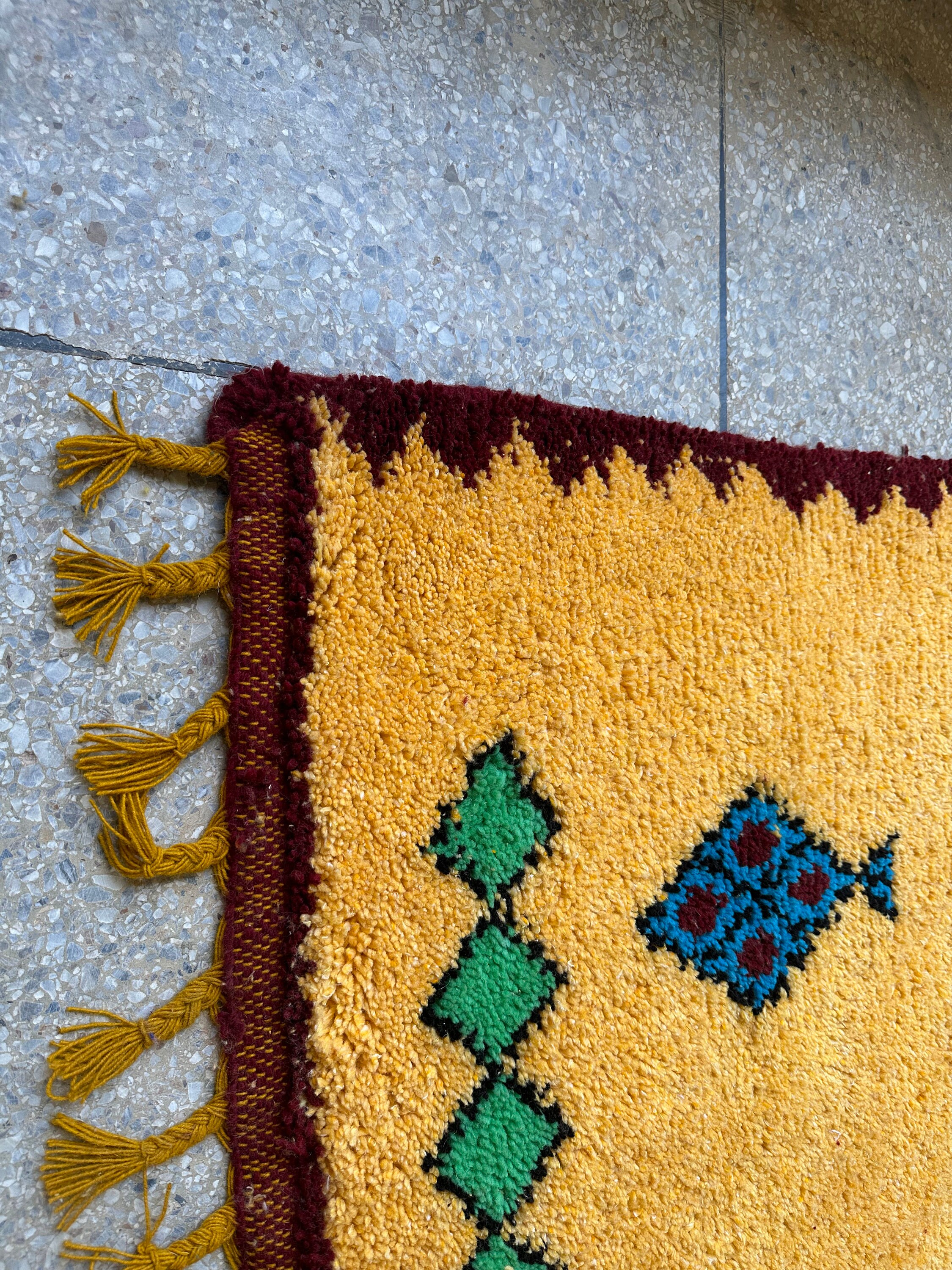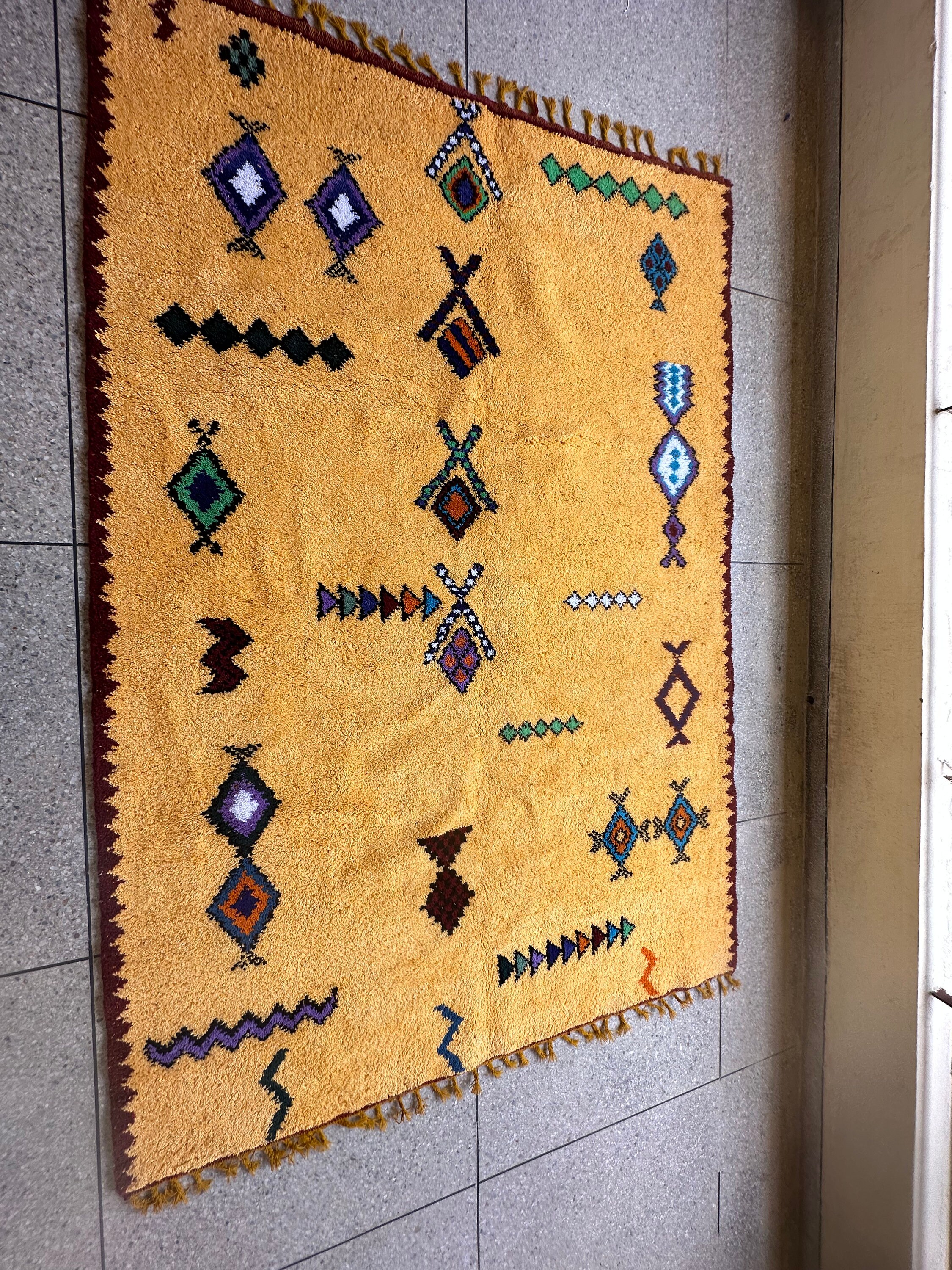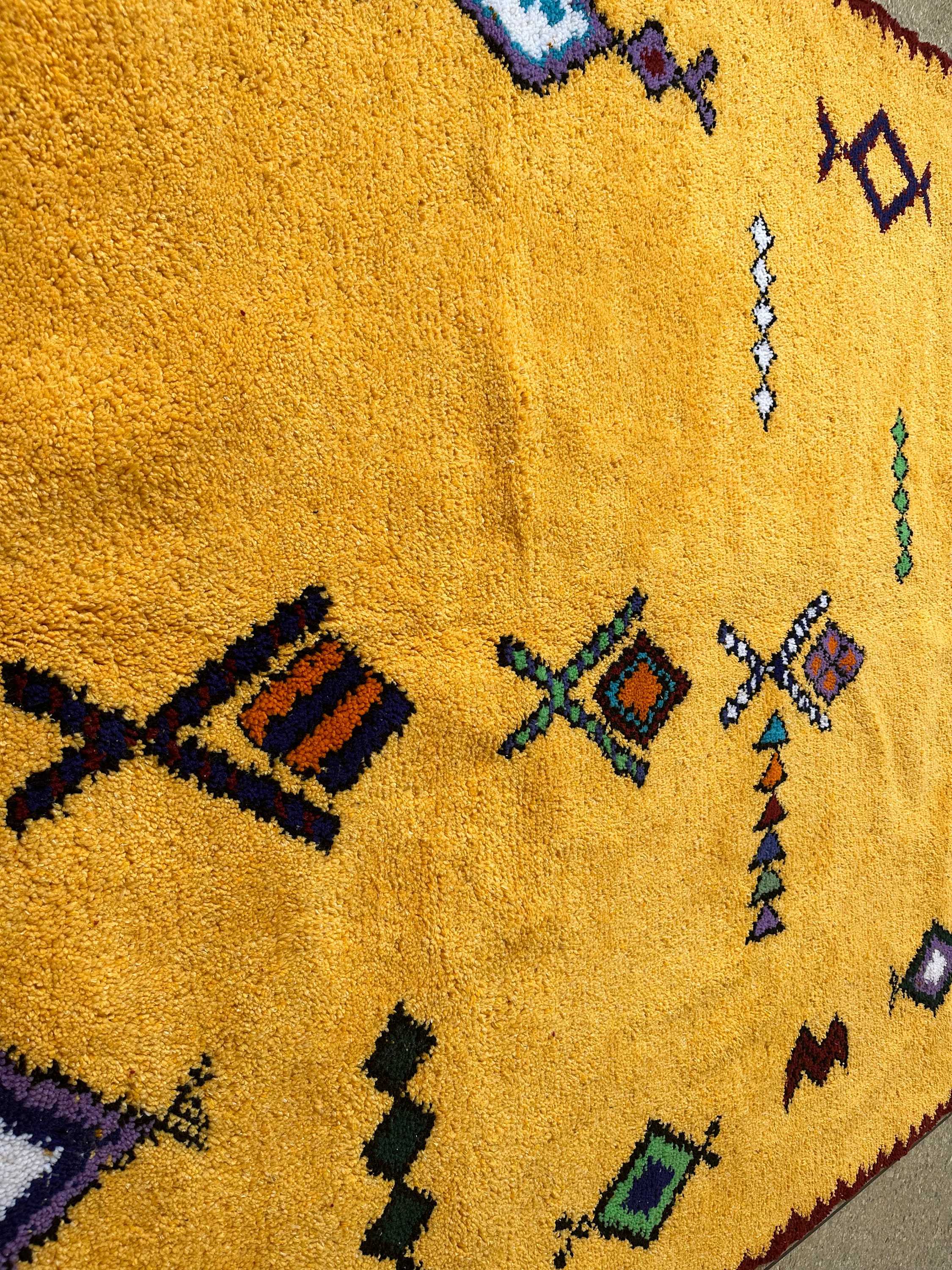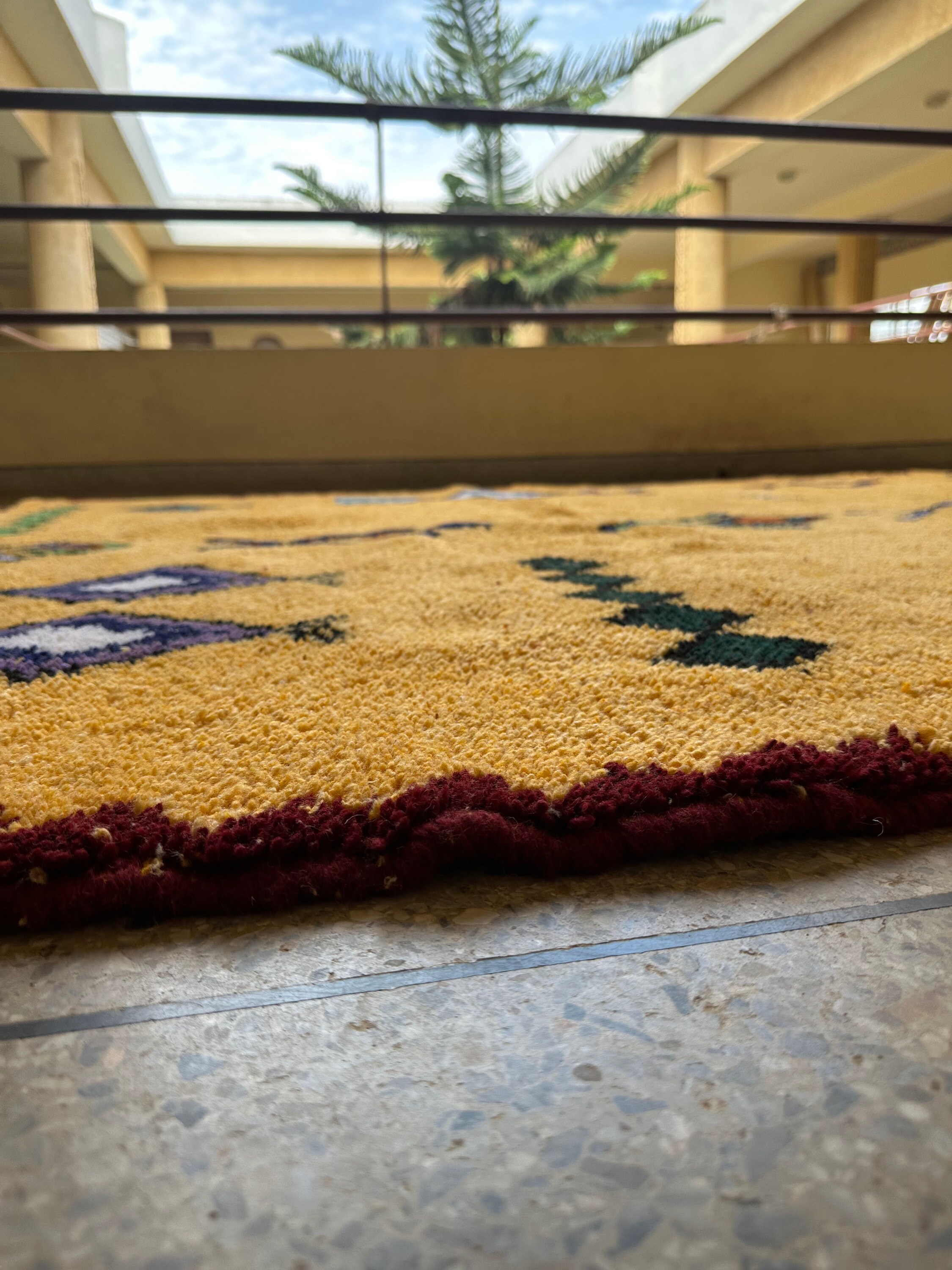 Add warmth and character to your space with this vibrant yellow Beni Ourain rug. Handwoven from soft sheep wool, this abstract Moroccan rug is a unique statement piece for bohemian and eclectic home décor.