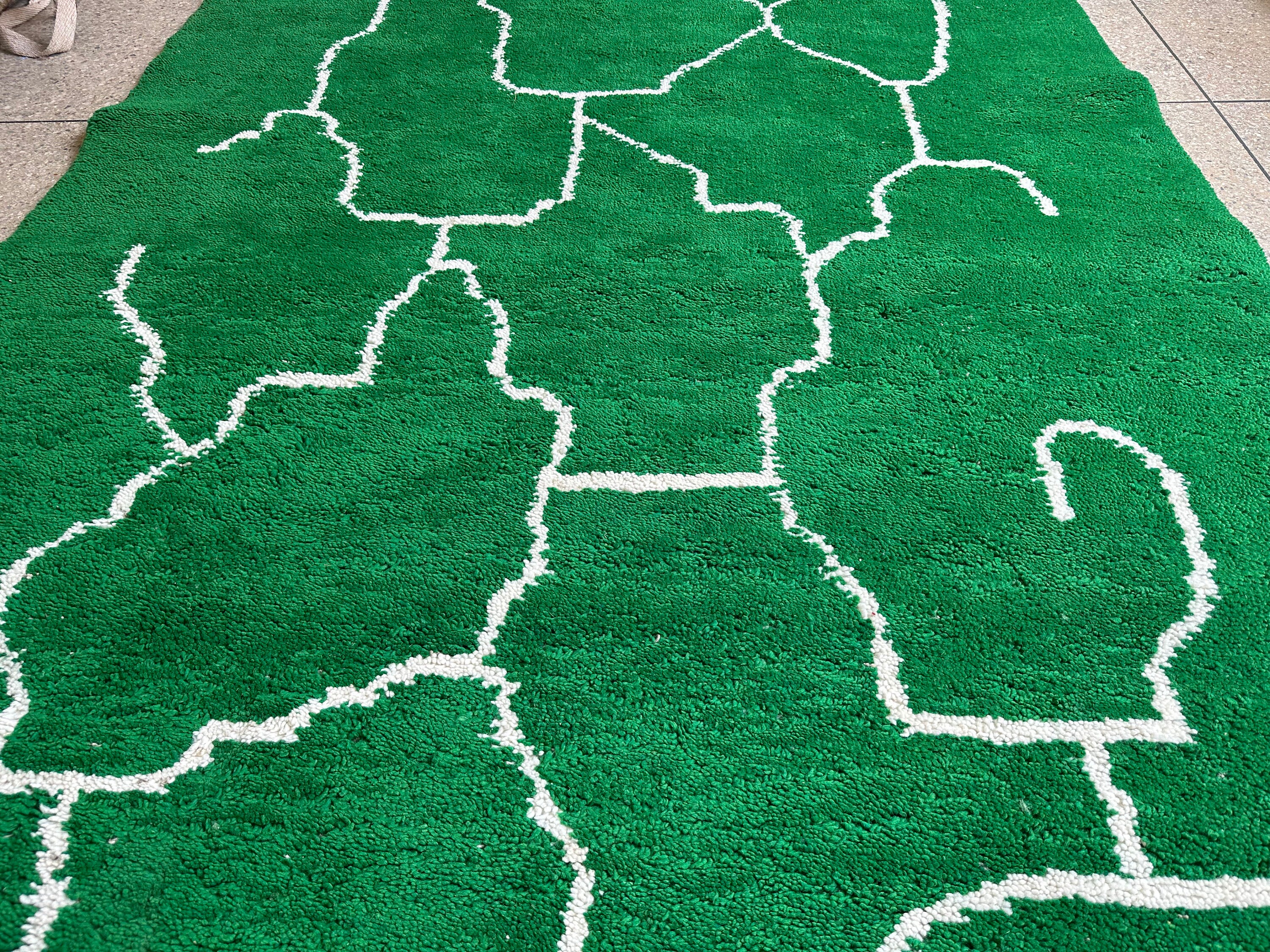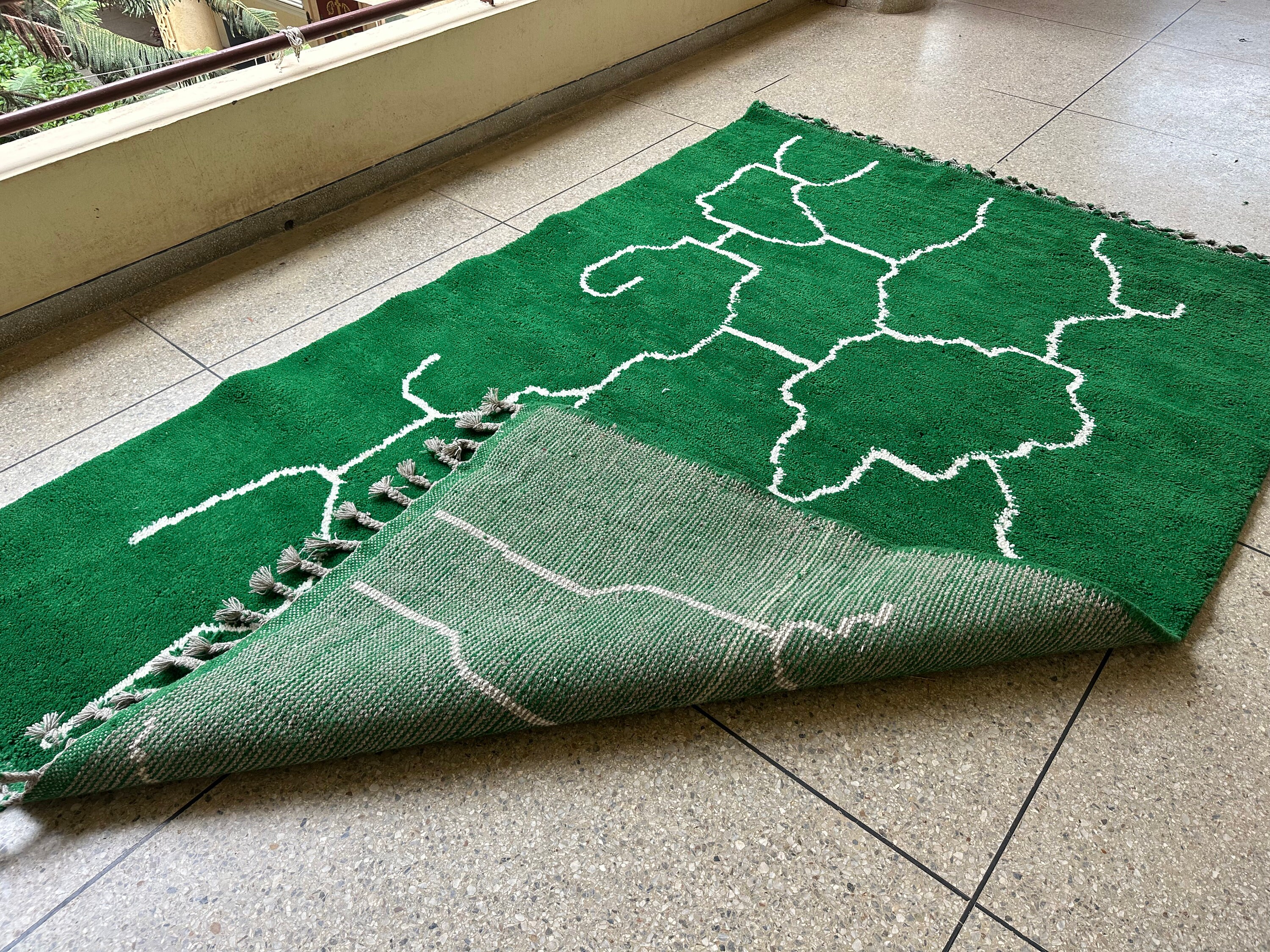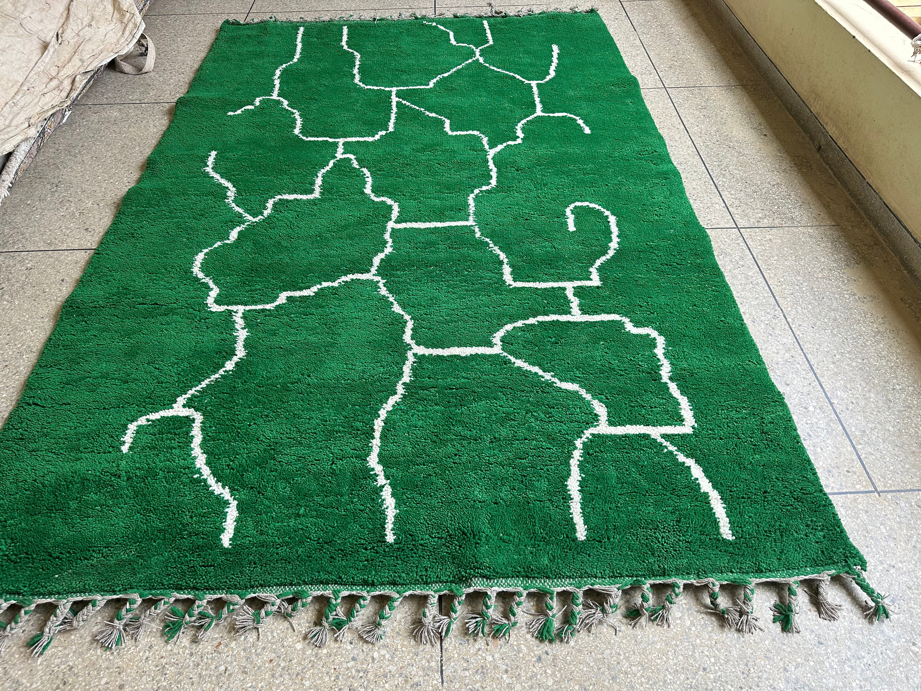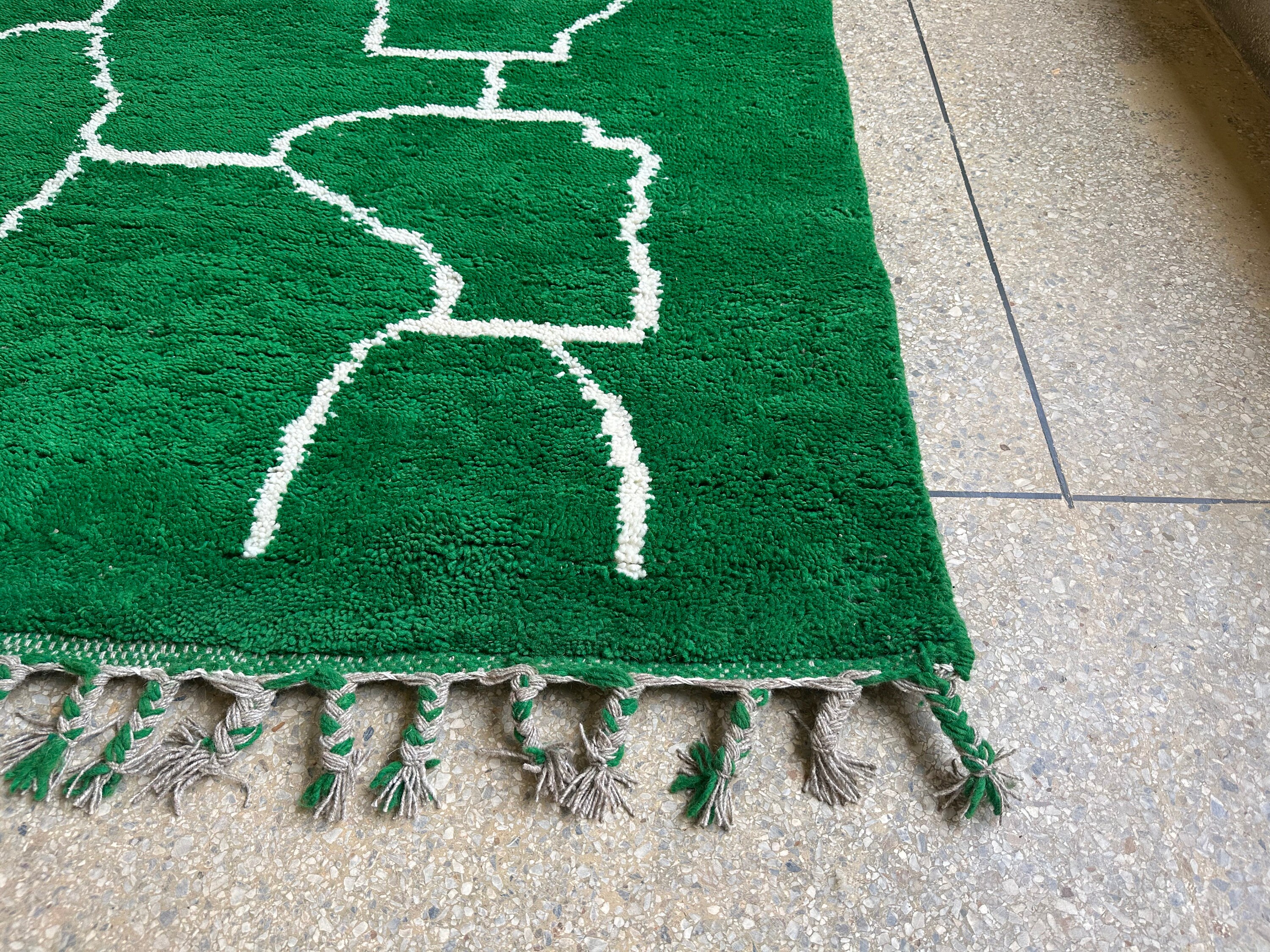Add a touch of nature-inspired elegance to your home with this green and white geometric Beni Ourain rug. Handwoven from soft sheep wool, this custom Berber rug is perfect for minimalist decor. Its timeless design and eco-friendly materials make it a sustainable and stylish choice for any space. Elevate your decor with this luxurious, artisan-crafted Moroccan rug today!