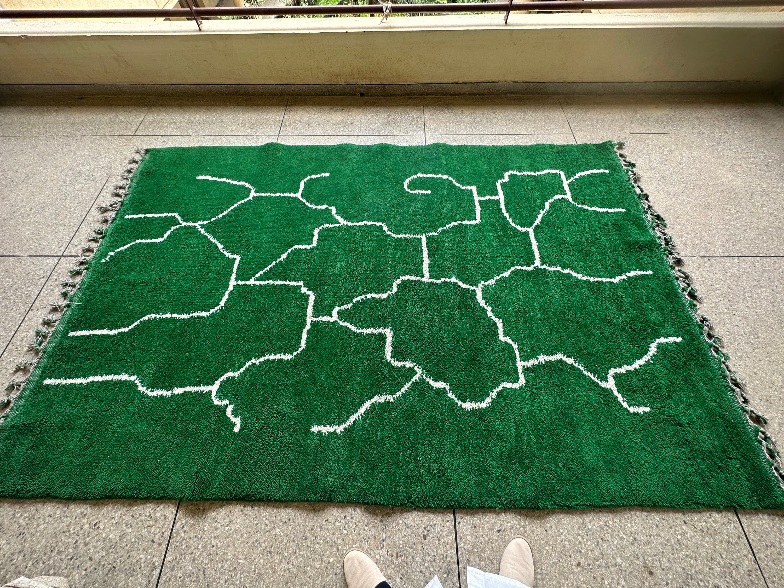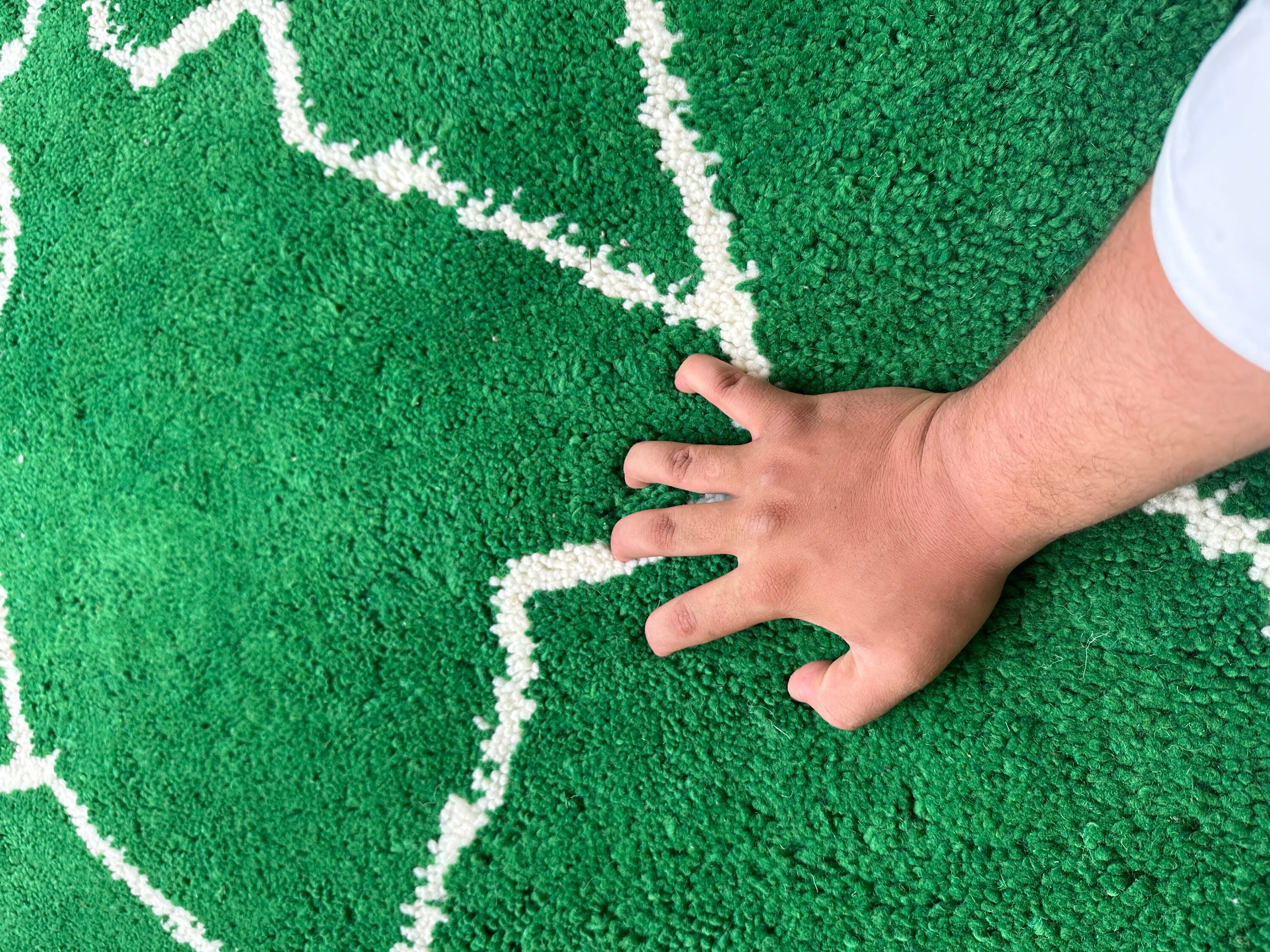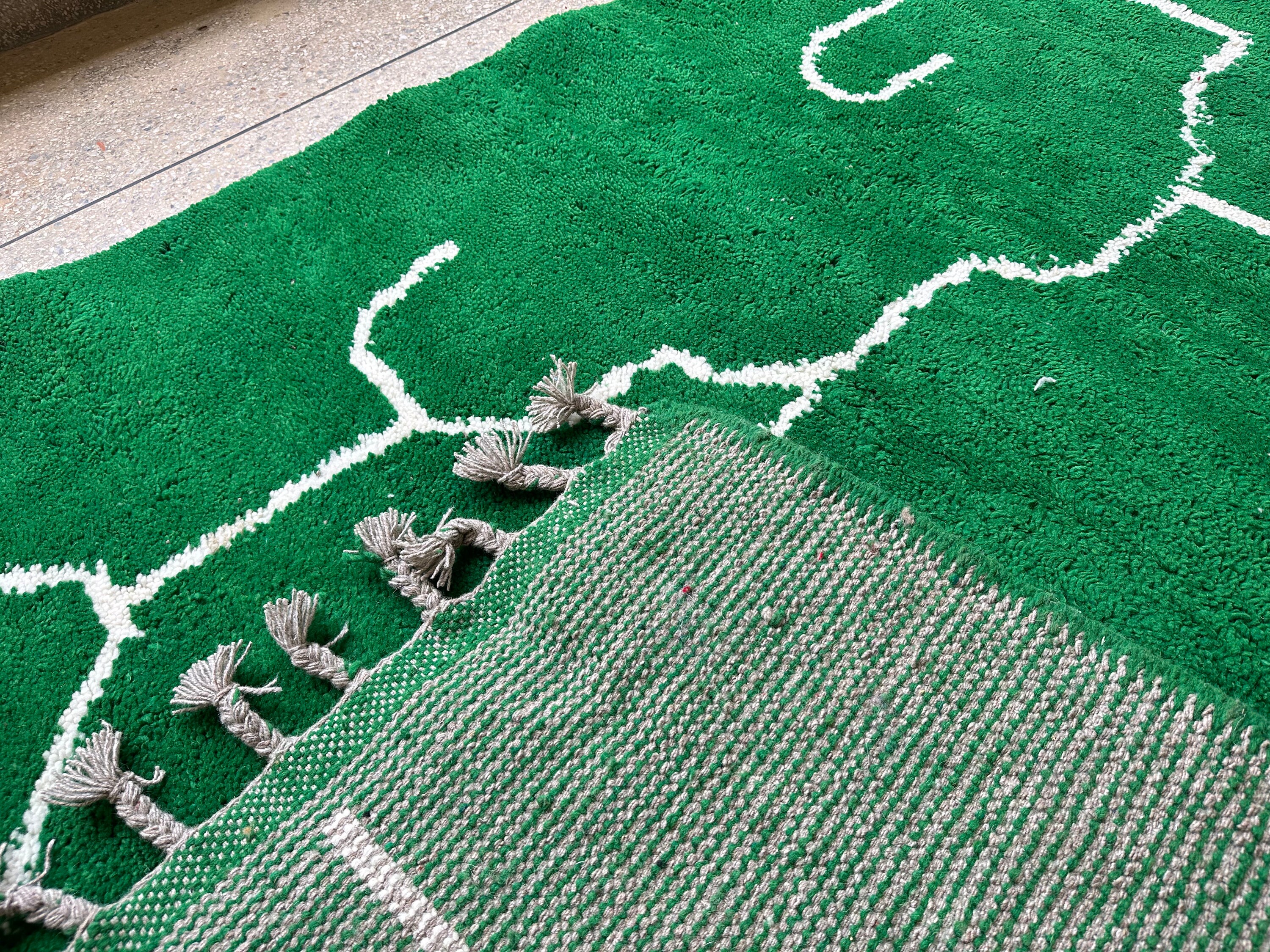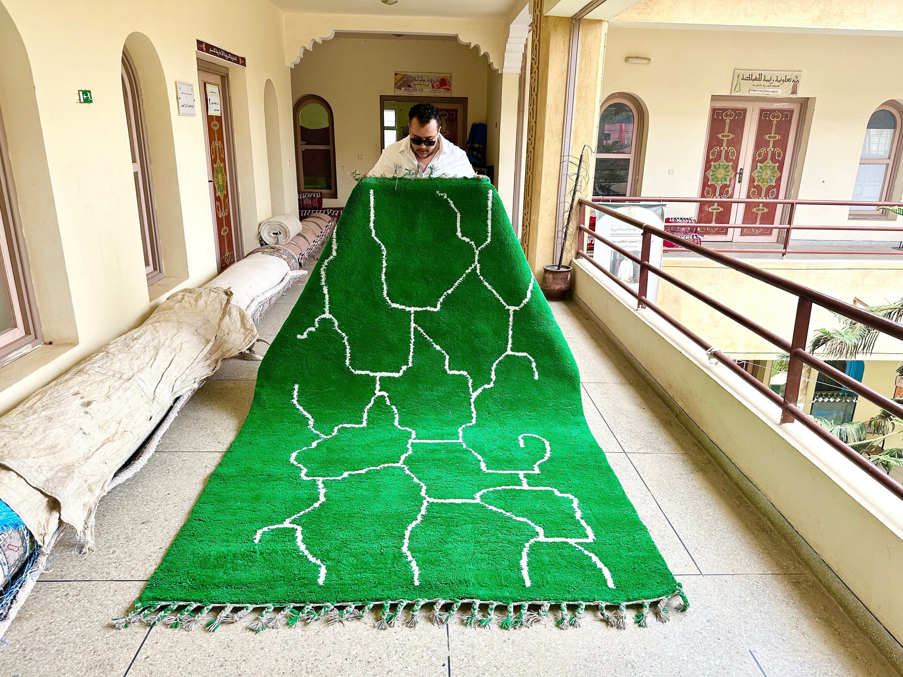 Add a touch of nature-inspired elegance to your home with this green and white geometric Beni Ourain rug. Handwoven from soft sheep wool, this custom Berber rug is perfect for minimalist decor. Its timeless design and eco-friendly materials make it a sustainable and stylish choice for any space. Elevate your decor with this luxurious, artisan-crafted Moroccan rug today!