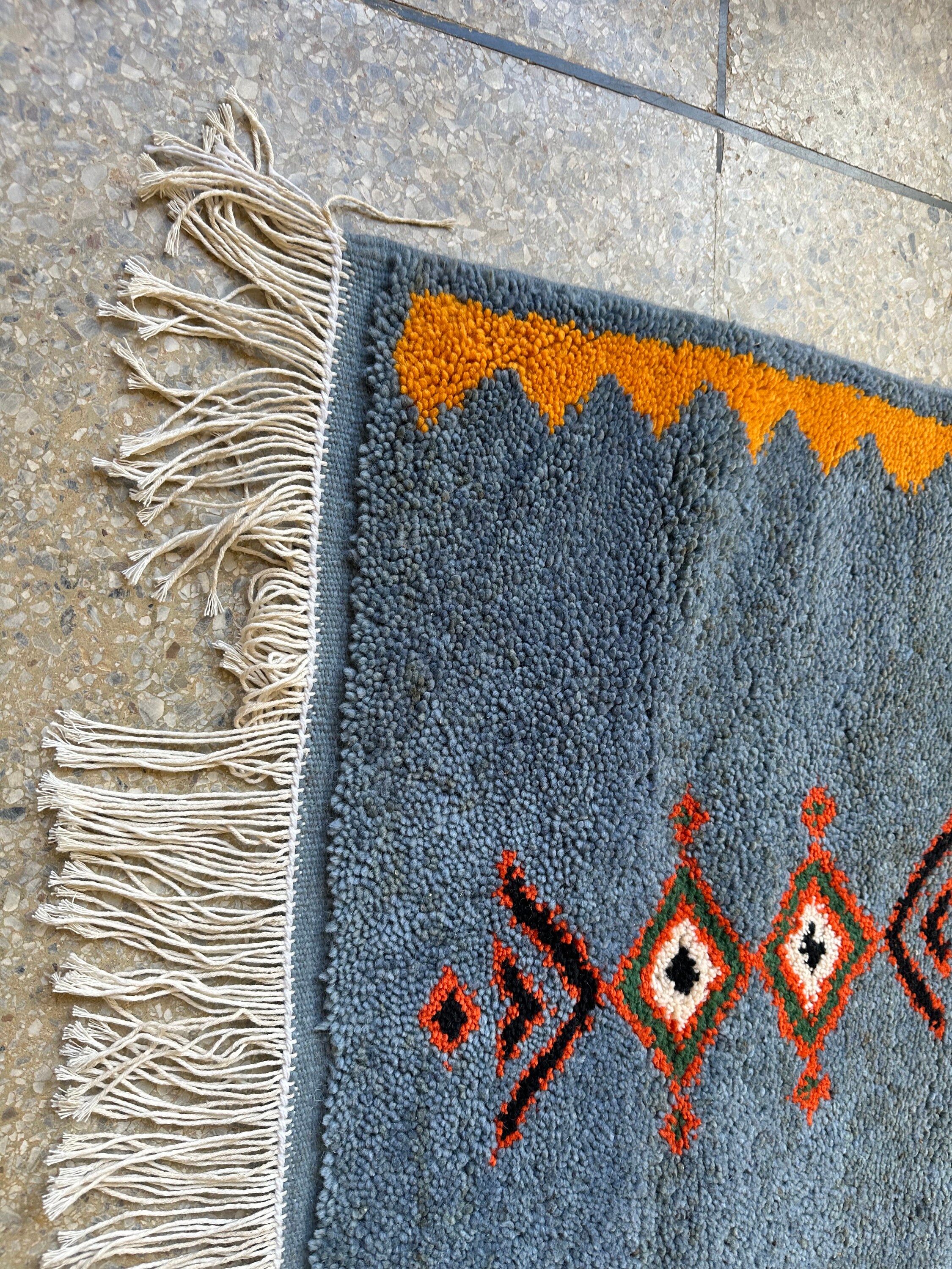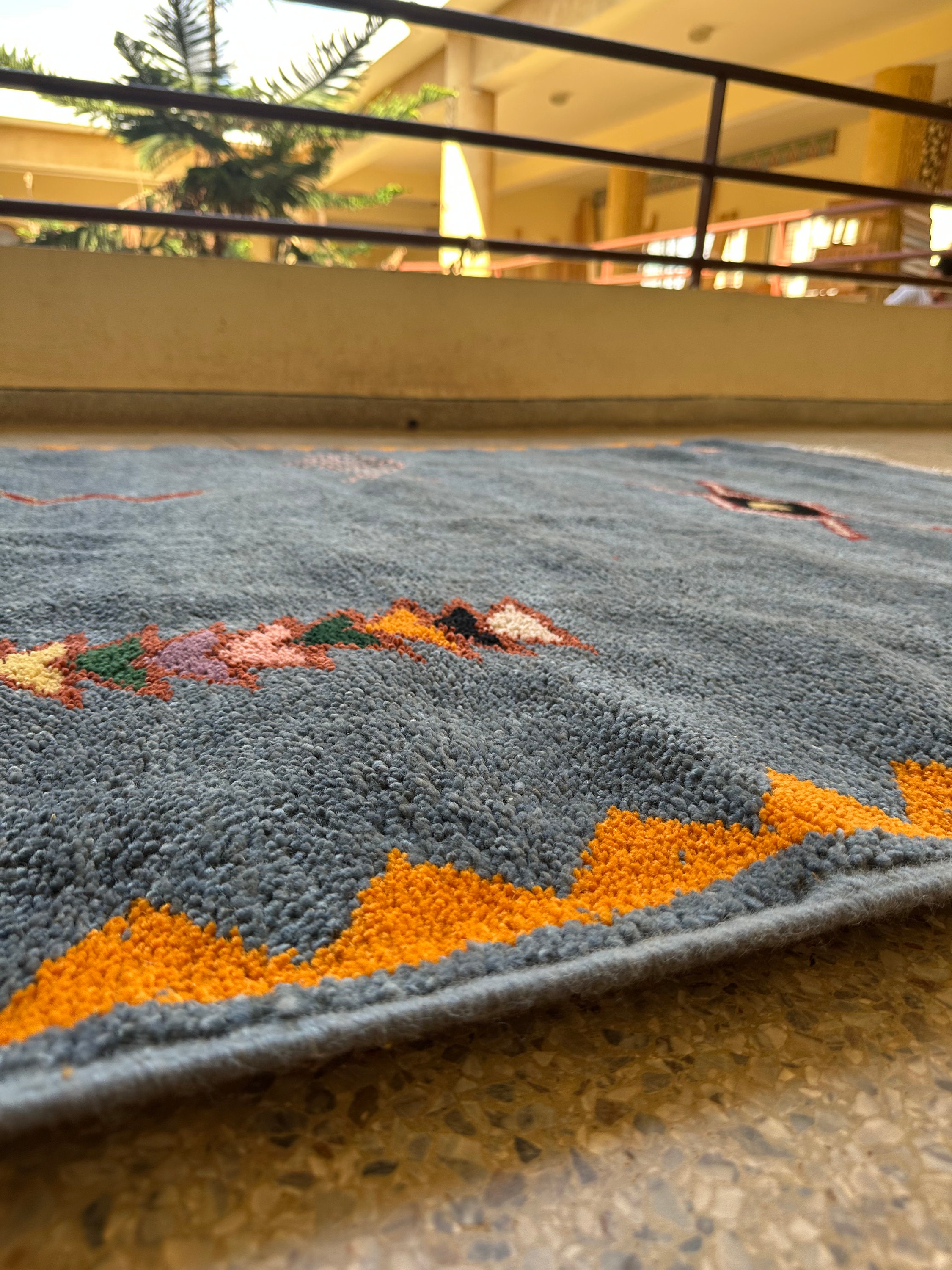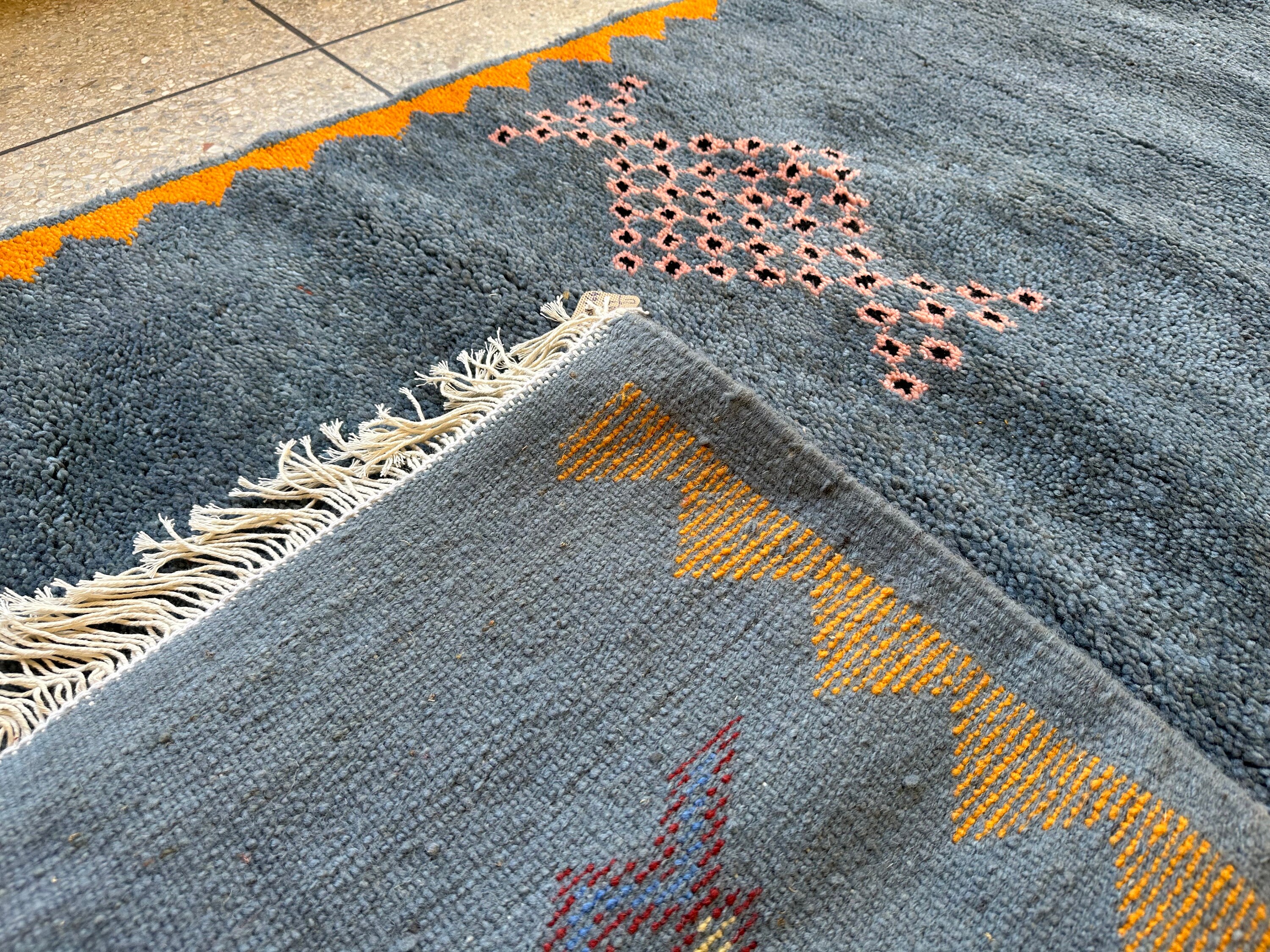 Enhance your space with this charming Beni Ourain rug, expertly handwoven by Moroccan artisans. This made-to-order wool carpet features a beautiful teal blue and yellow design, perfect for adding a touch of Berber craftsmanship to any room. Elevate your decor with this stunning area rug today!