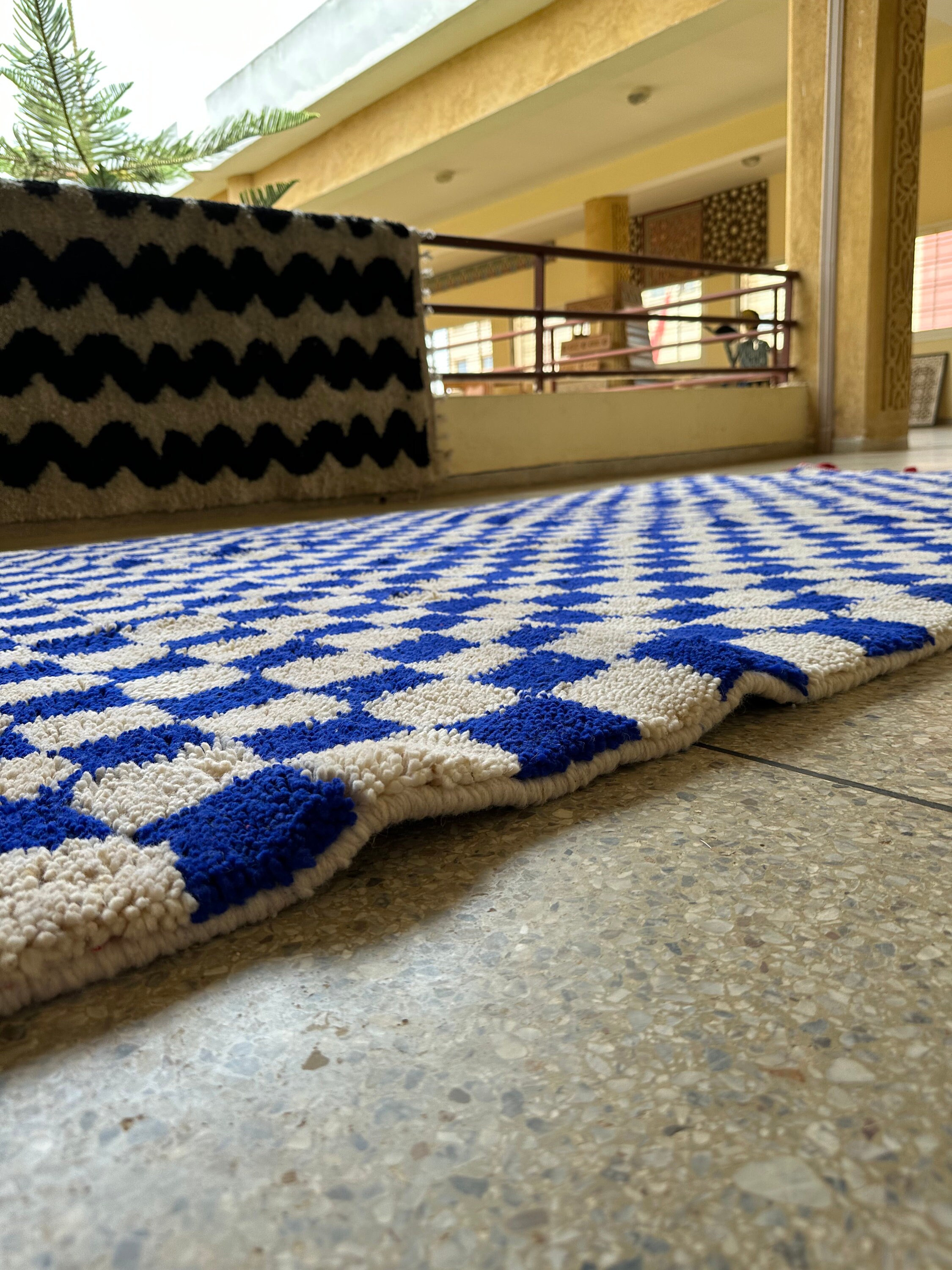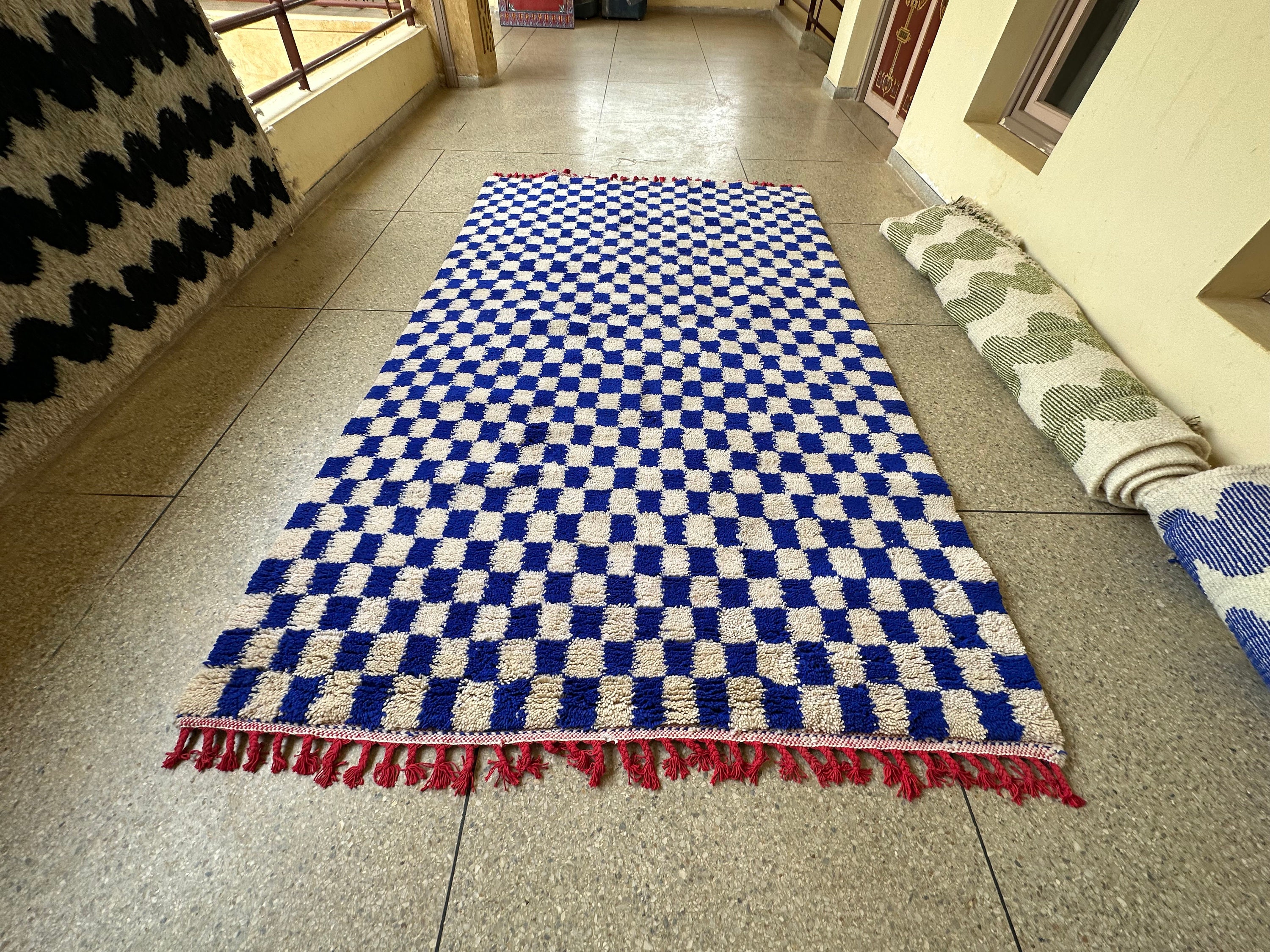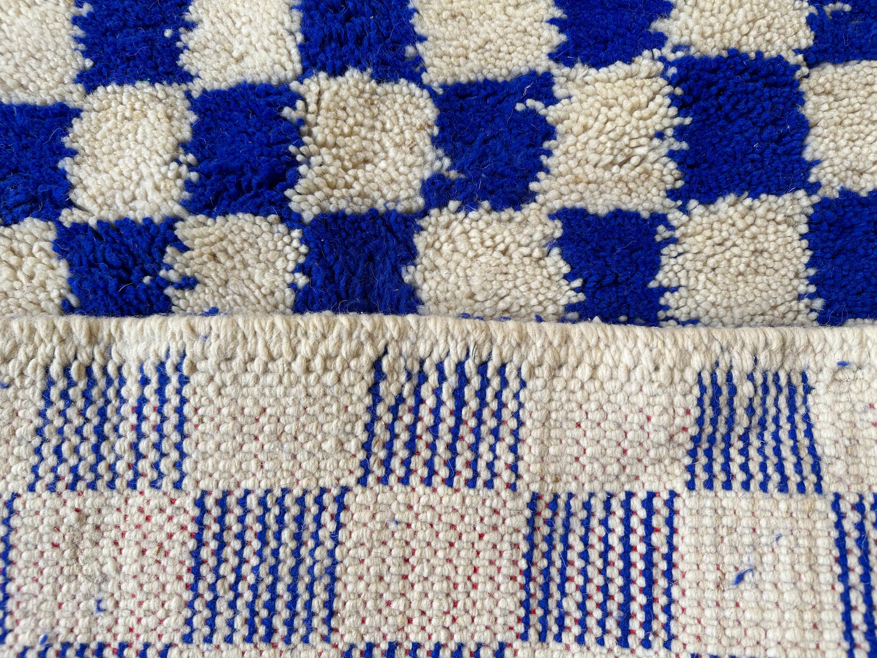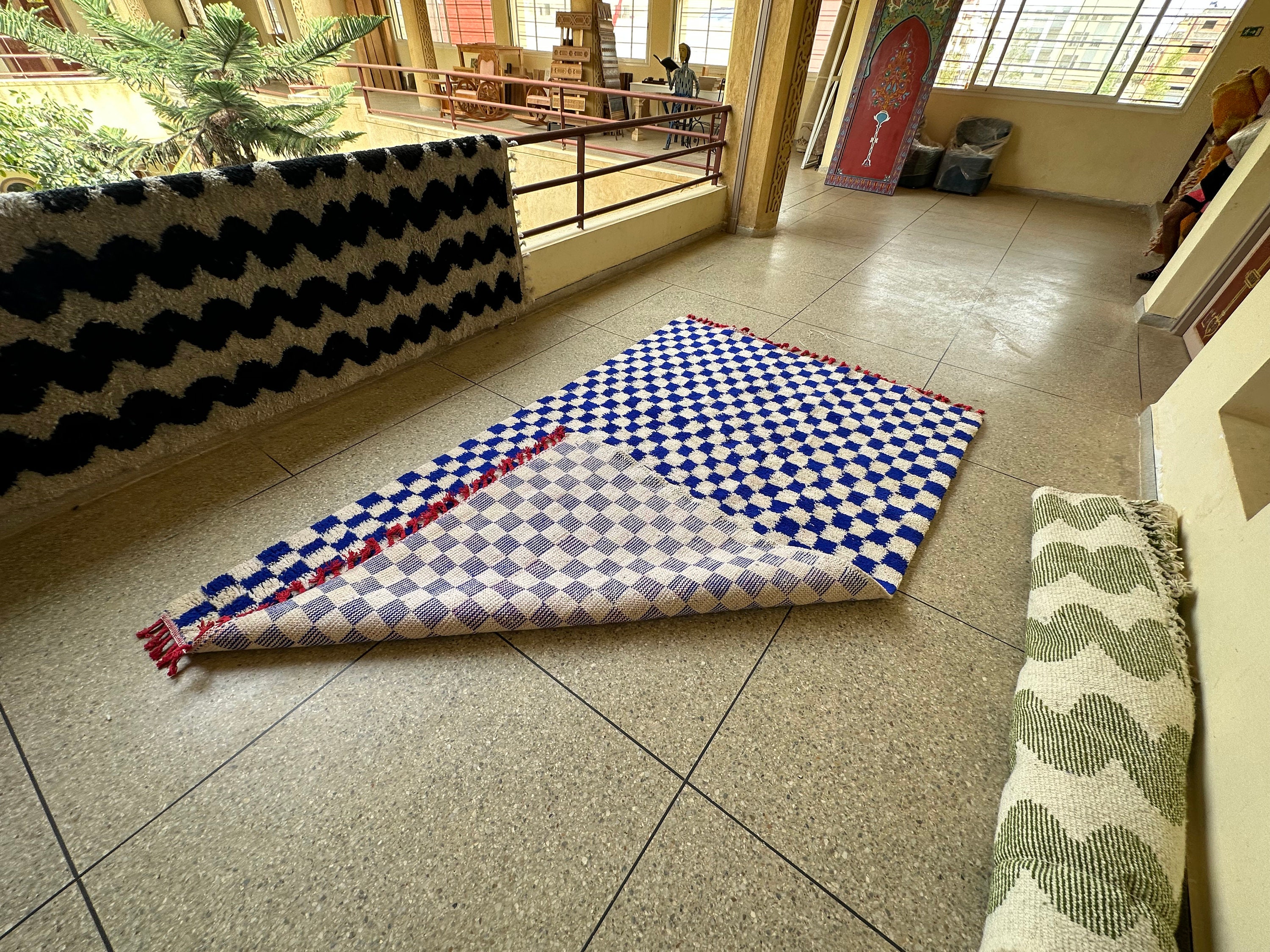 Transform your space with our authentic Beni Ourain Rug, a stunning blend of tradition and style. Handcrafted from premium sheep wool, this checkered rug features a beautiful white and blue design that adds a touch of bohemian elegance to any room. Perfect for modern and rustic decor alike, this versatile Berber rug is not just a floor covering; it’s a statement piece. Elevate your home with this unique handmade Moroccan rug that promises to bring warmth and texture wherever it's placed.