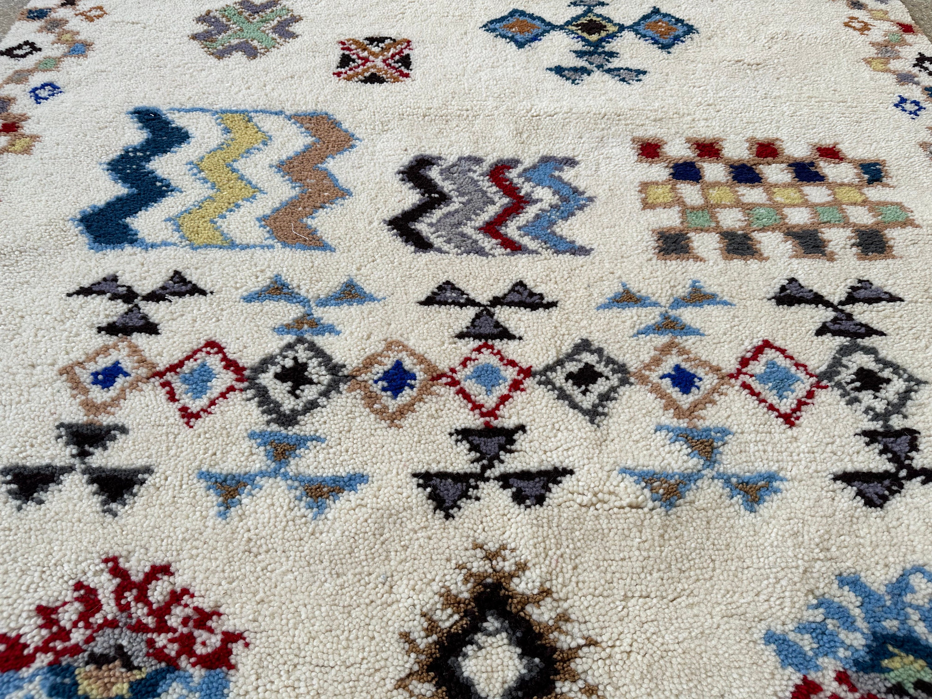 Add a touch of boho elegance to your home with this white abstract Beni Ourain rug. Hand-knotted by Berber artisans, this custom Azilal rug is perfect for living rooms, bedrooms, or kids’ rooms. Its timeless design and eco-friendly materials make it a sustainable and stylish choice for any space. Elevate your decor with this luxurious, artisan-crafted Moroccan rug today!
