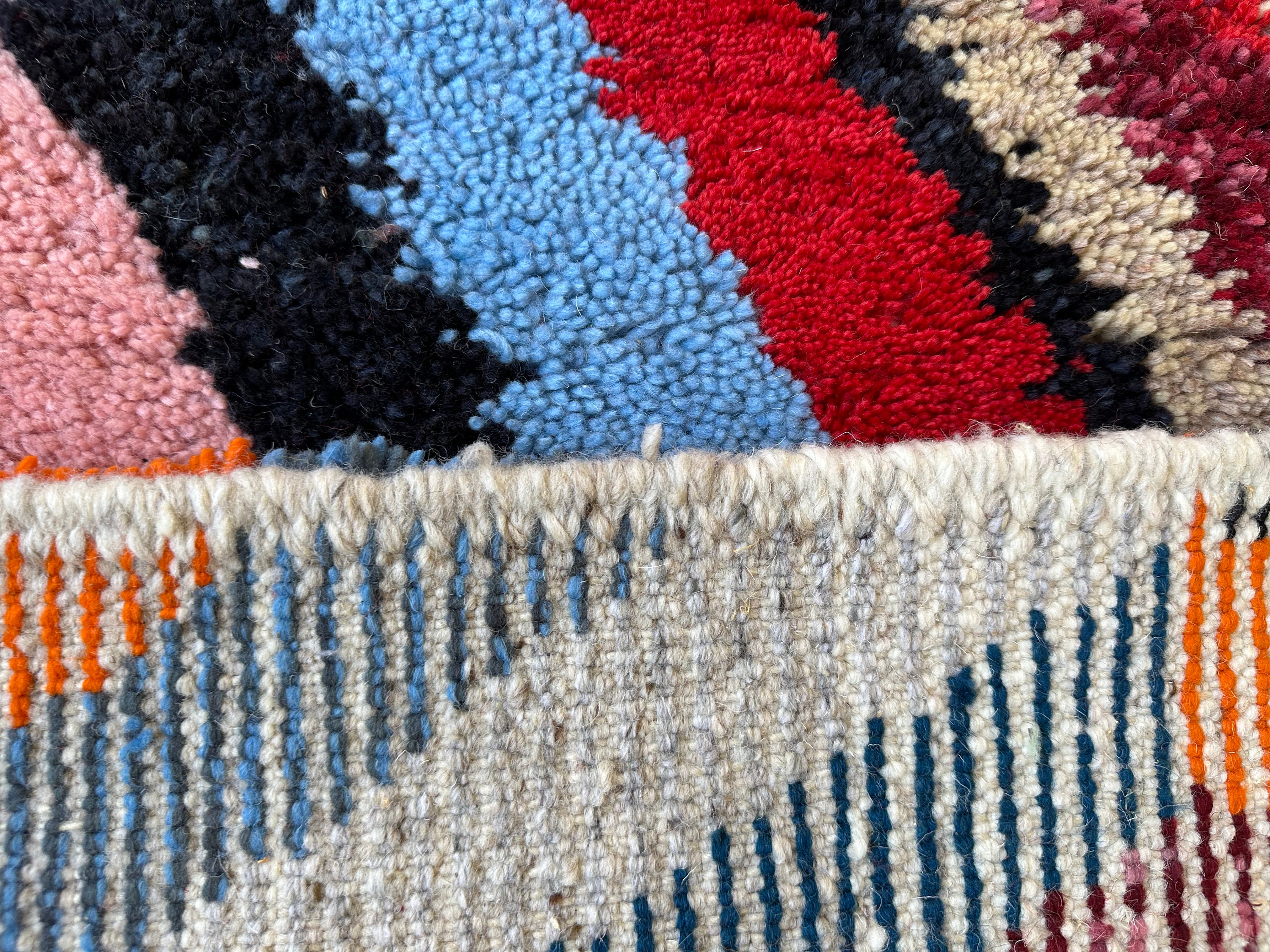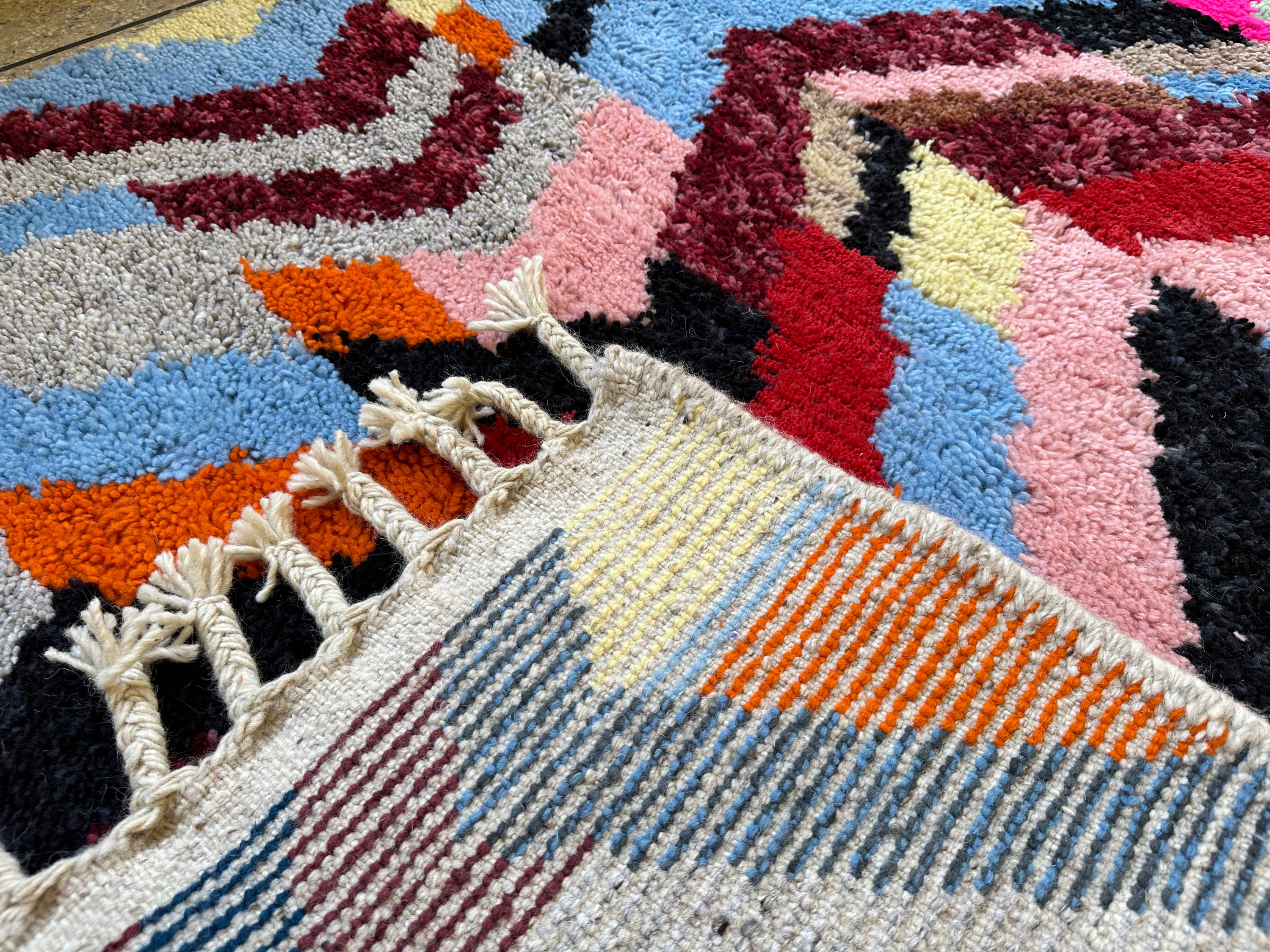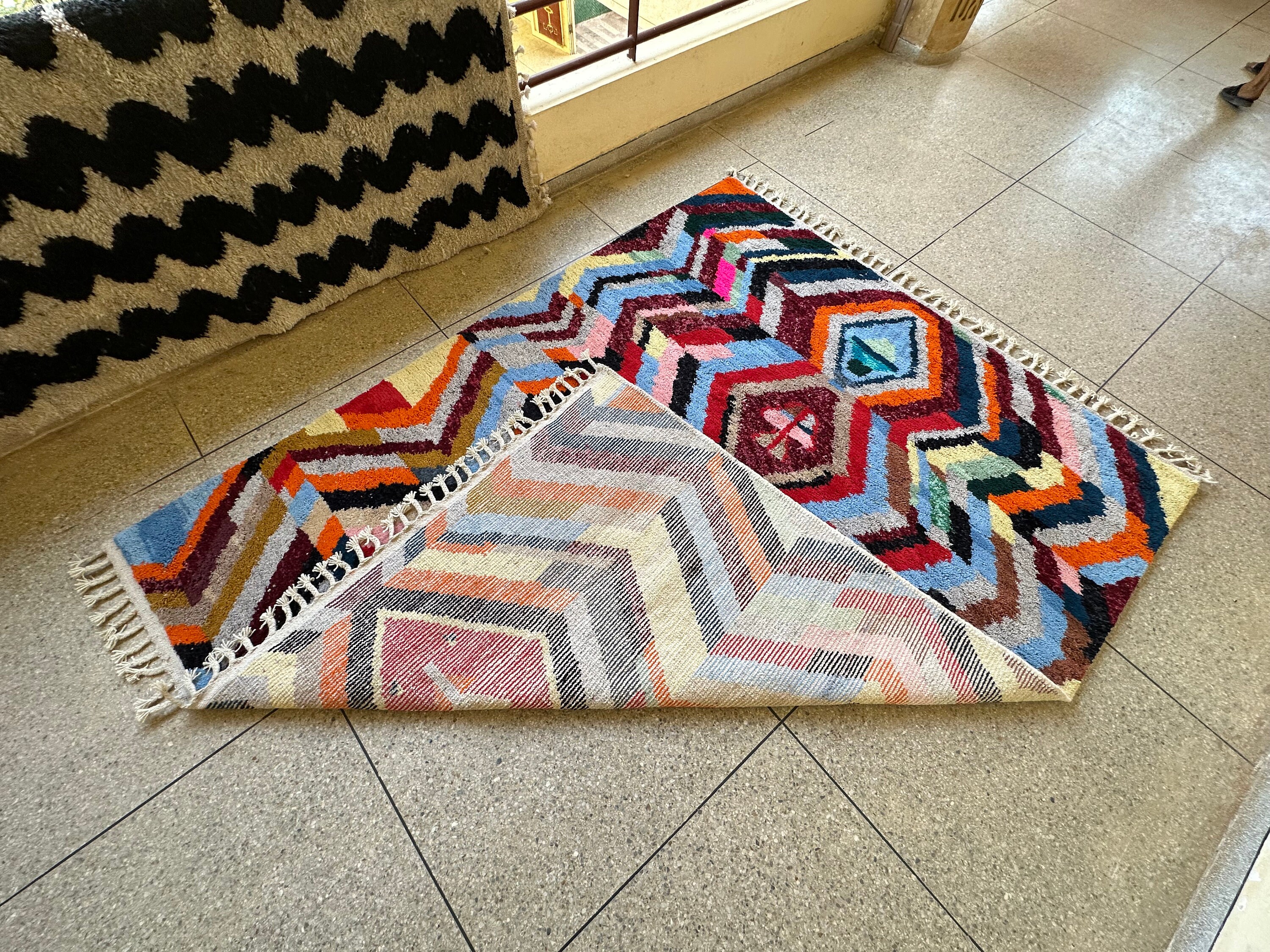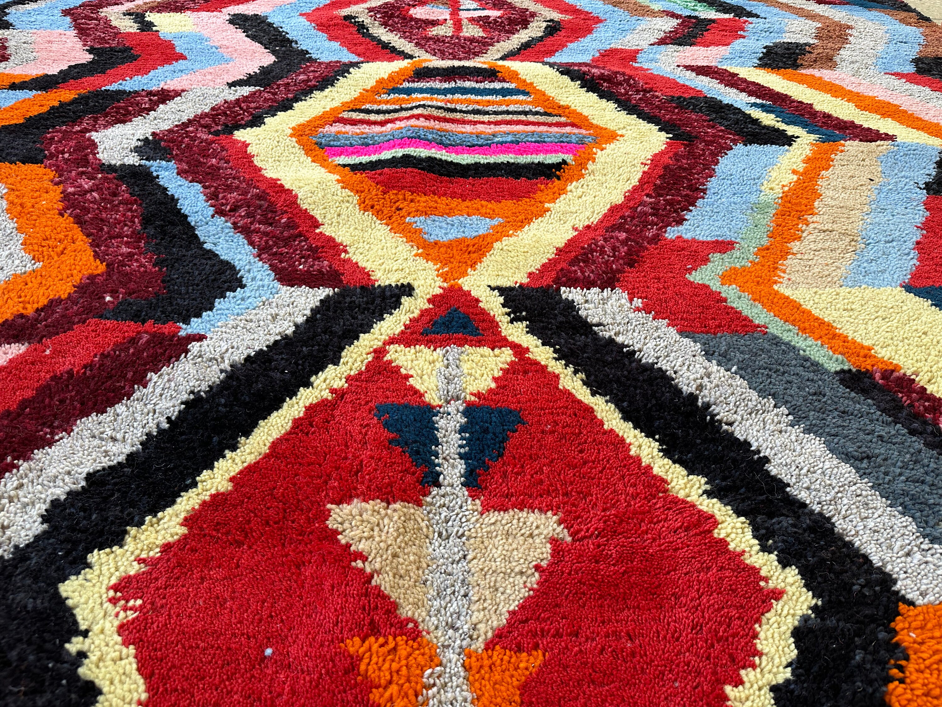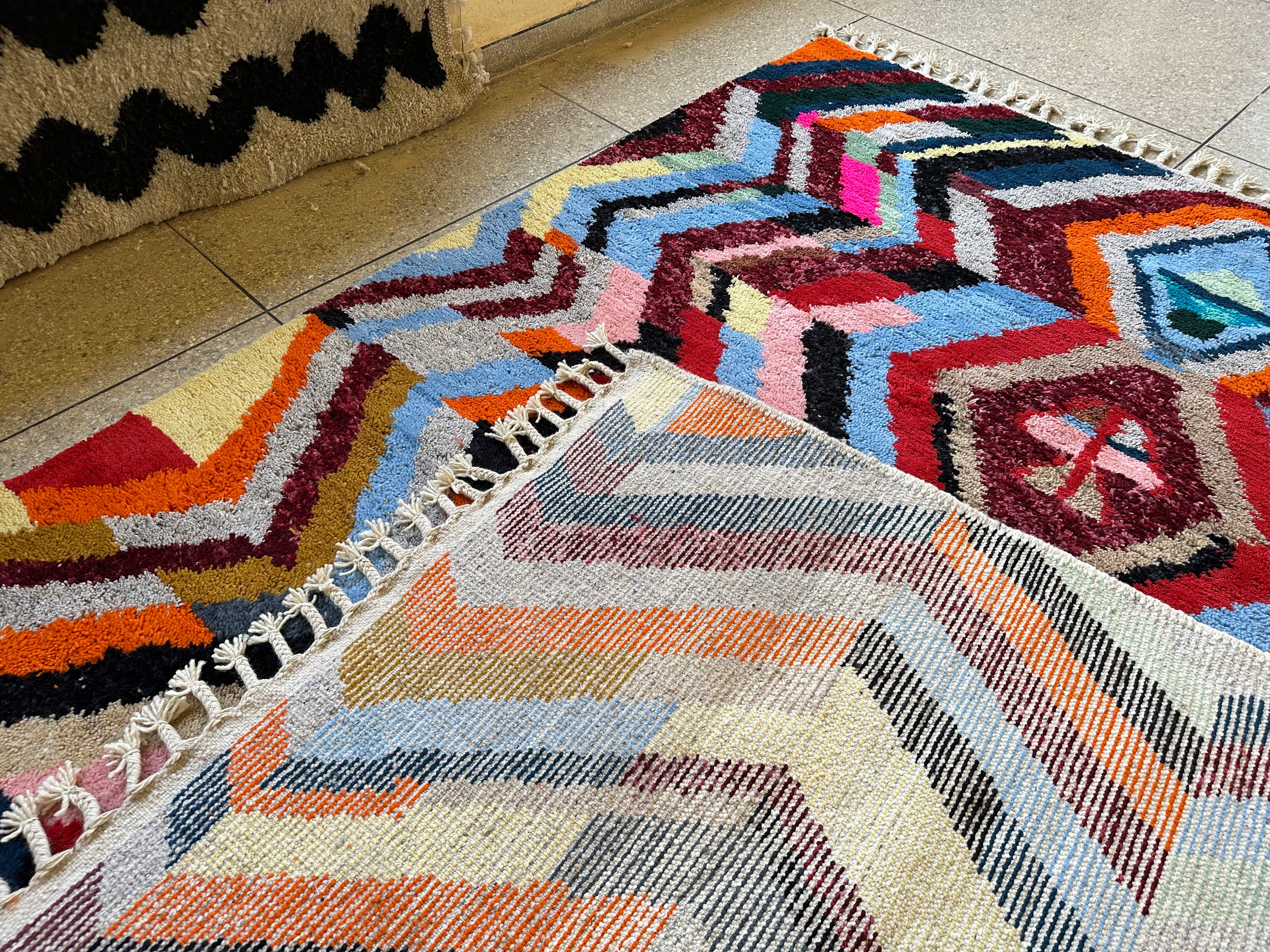 Add a burst of color and texture to your home with this stunning multicolor Moroccan Beni Ourain rug. Expertly handwoven from soft sheep wool, this geometric masterpiece blends traditional Berber craftsmanship with a modern artistic touch. Its vibrant hues and intricate design make it the perfect statement piece for living rooms, bedrooms, or creative spaces. Whether your style is bohemian, eclectic, or contemporary, this rug will instantly transform your space with warmth and charm.
