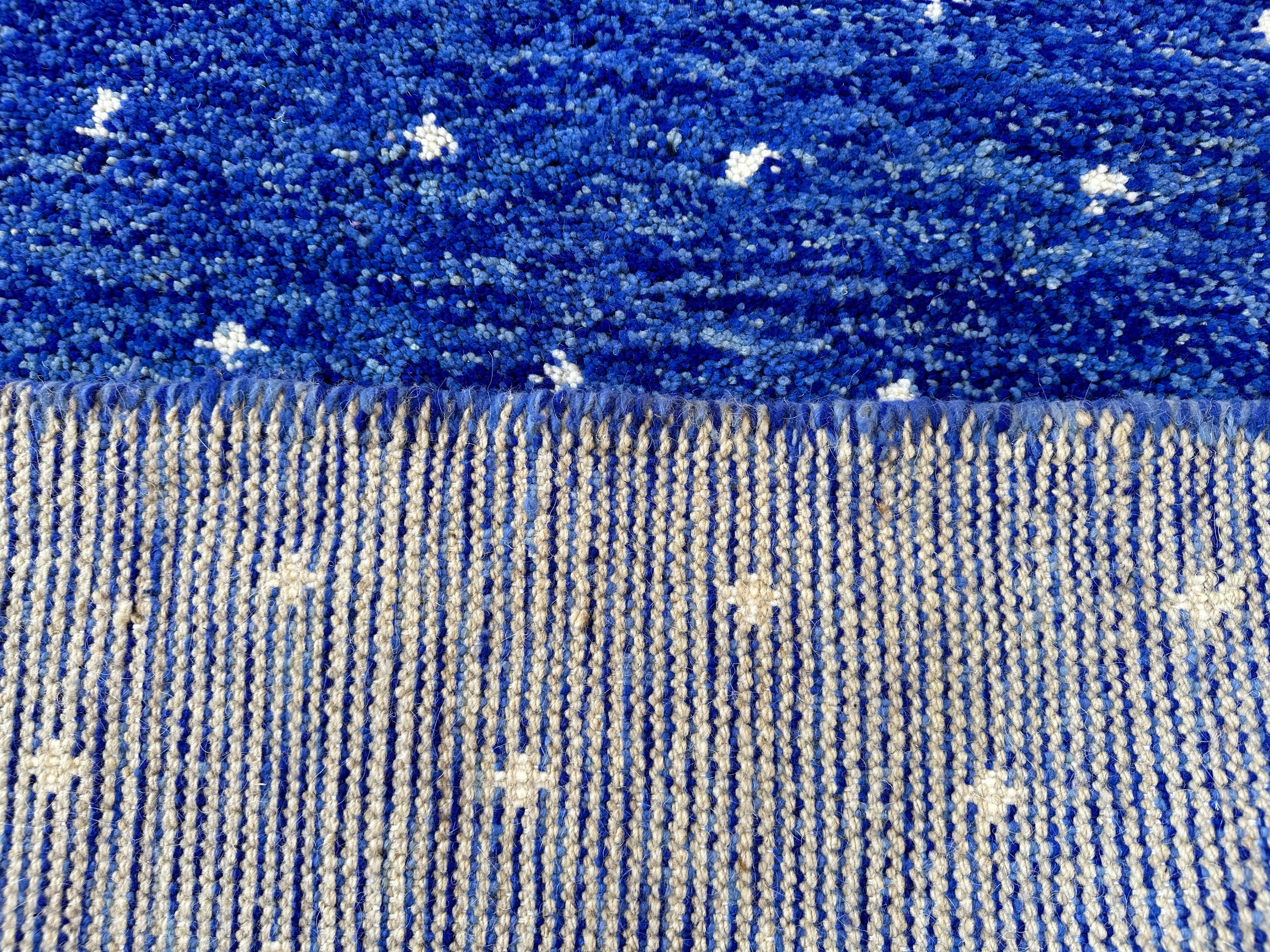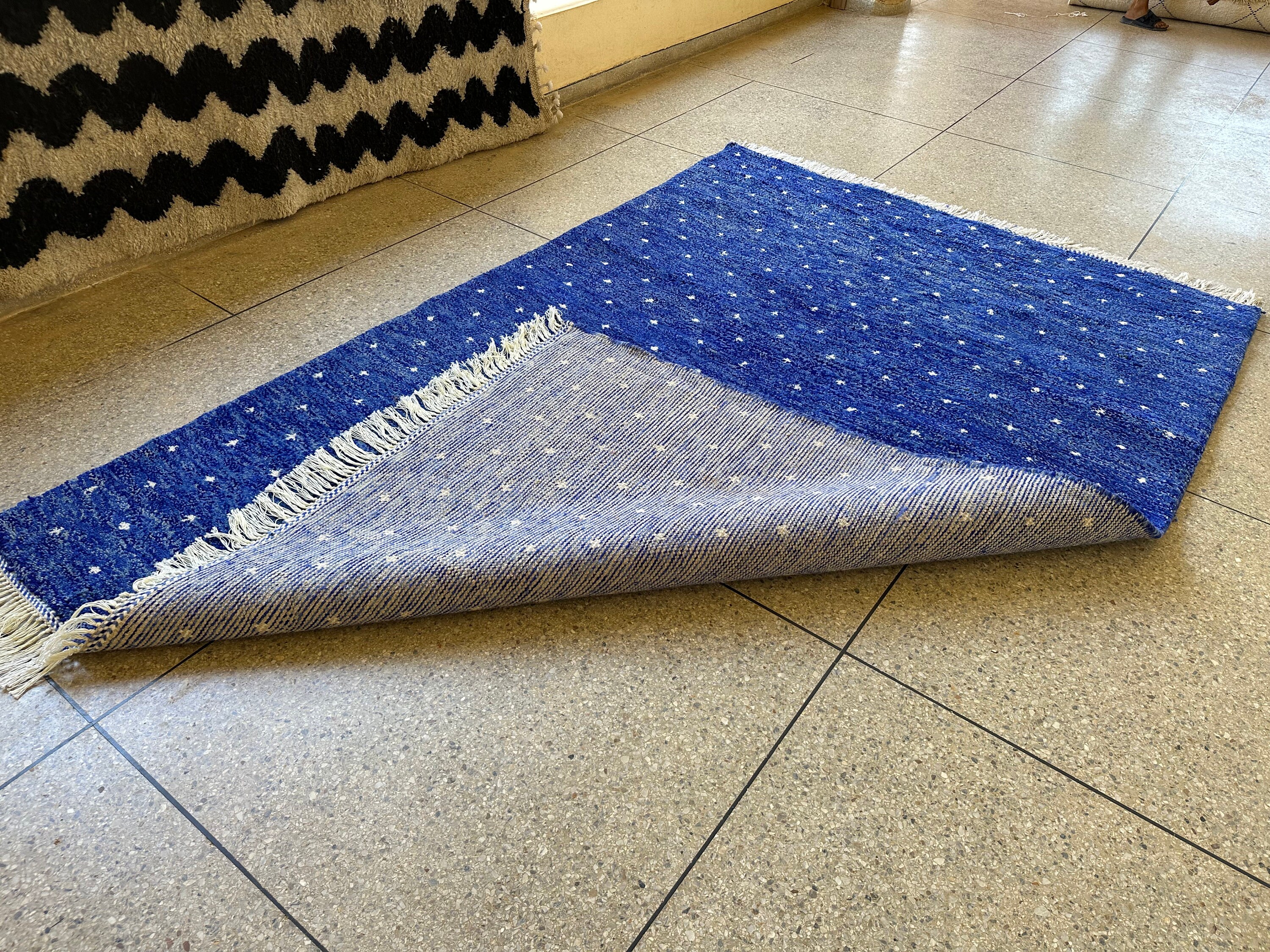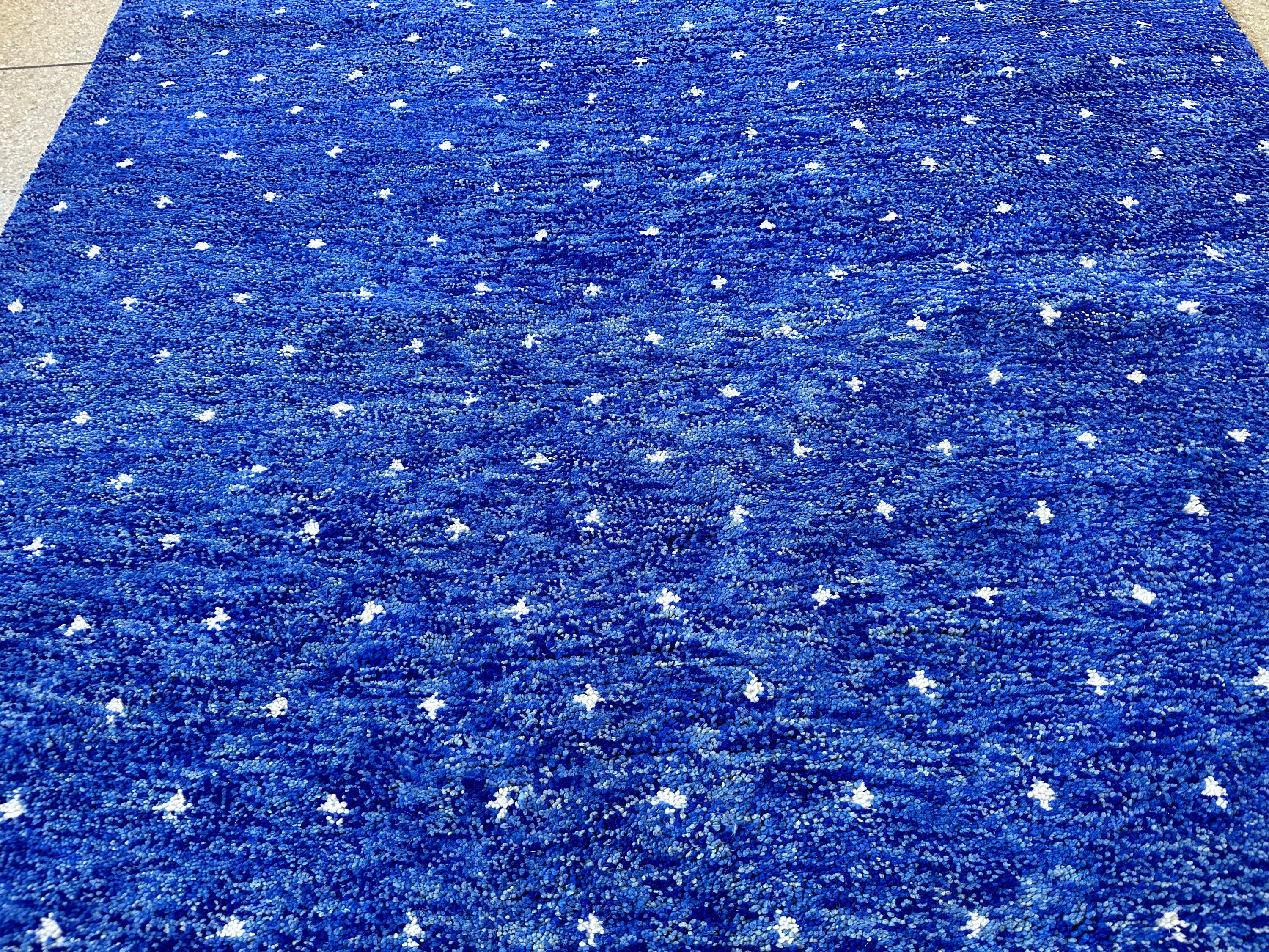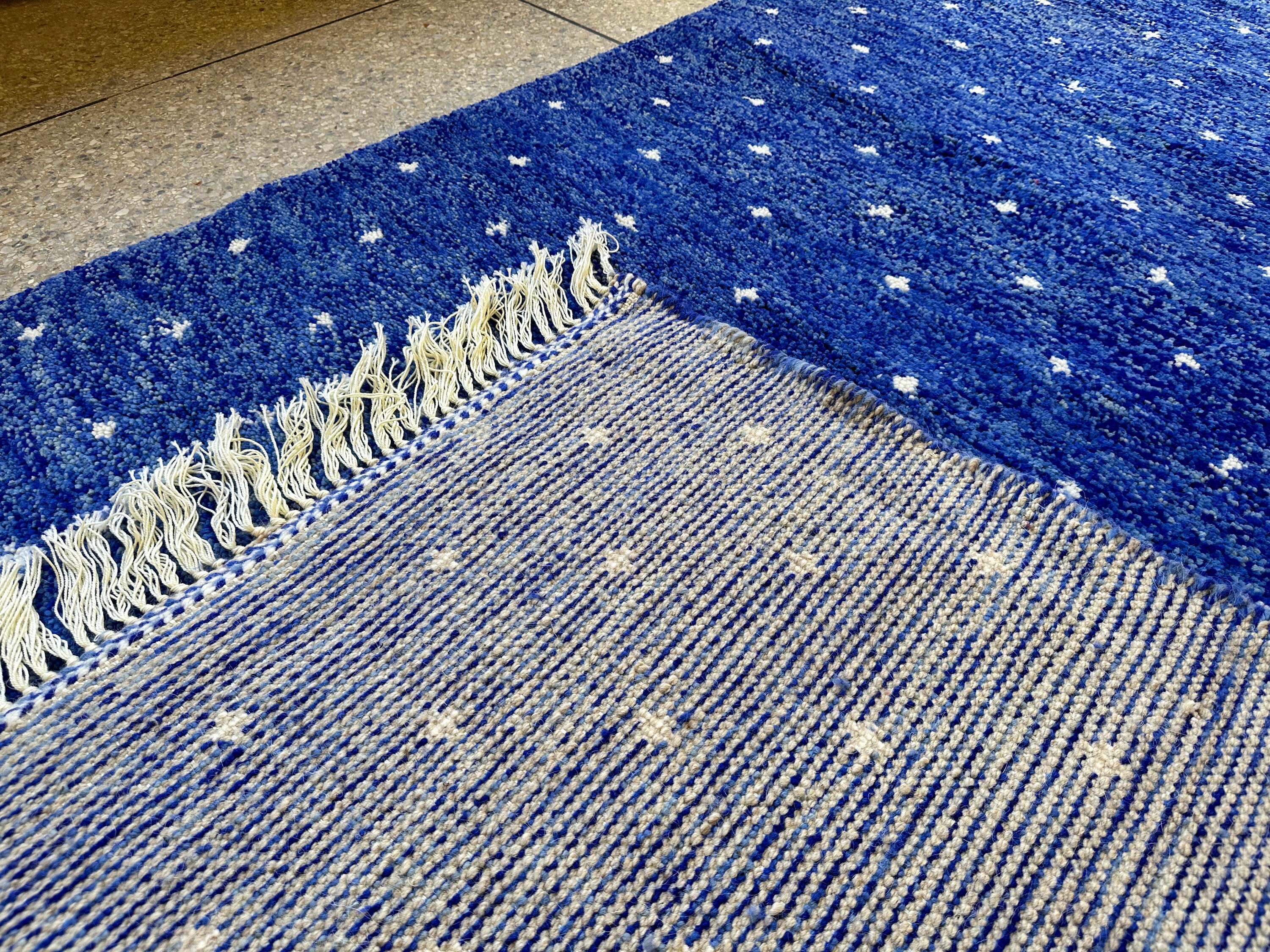 Transform your space with our stunning Pretty Berber Carpet—a Handmade Moroccan Rug that exudes elegance. Featuring a unique dotted Beni Ourain design in vibrant royal blue and crisp white, this shaggy custom area rug adds a touch of luxury to any room. Perfect for living rooms, bedrooms, or as a statement piece in your home, it's an eye-catching alternative to traditional Home Depot rugs. Elevate your decor with this exquisite wool rug that combines style and comfort effortlessly!