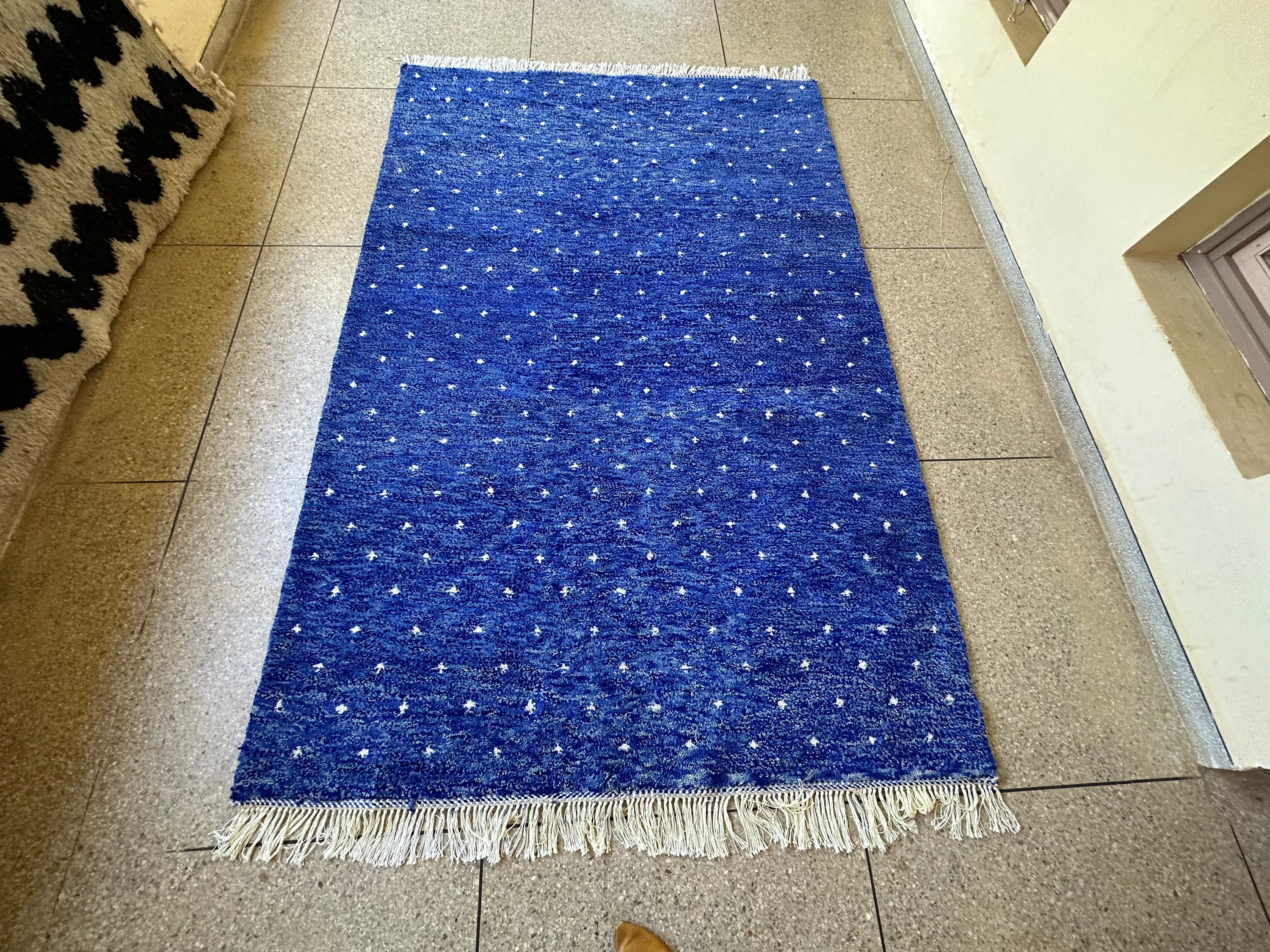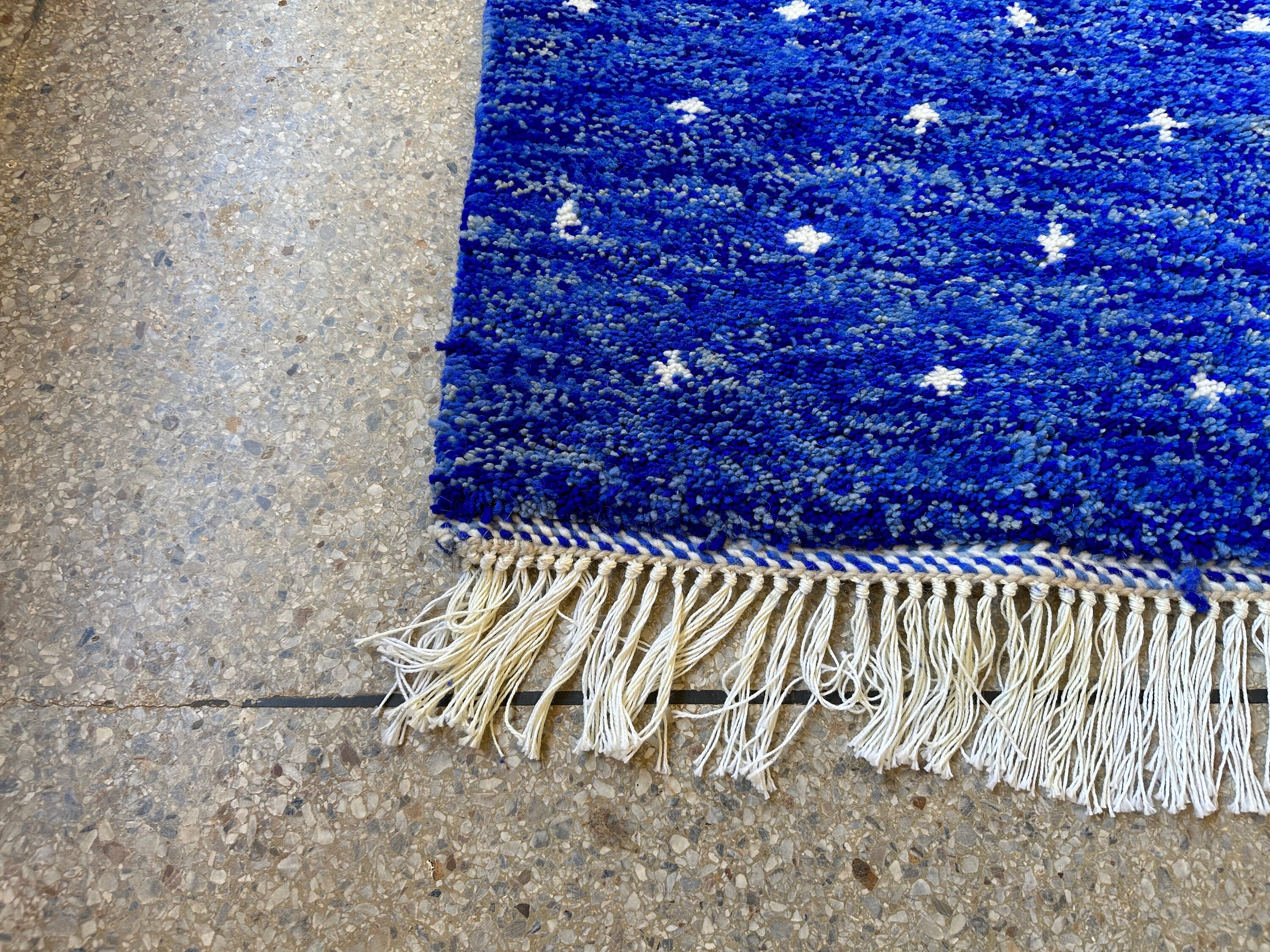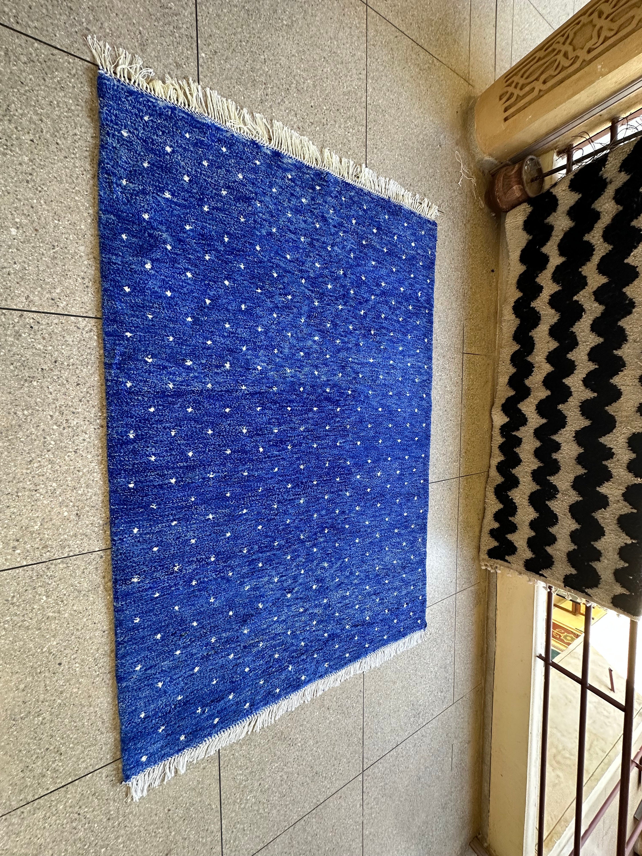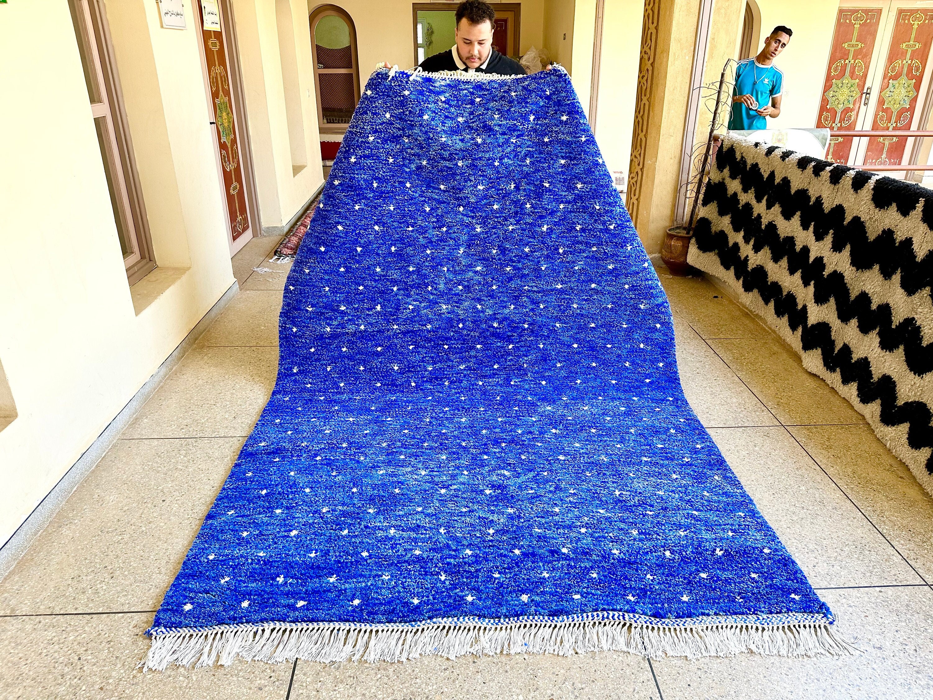 Transform your space with our stunning Pretty Berber Carpet—a Handmade Moroccan Rug that exudes elegance. Featuring a unique dotted Beni Ourain design in vibrant royal blue and crisp white, this shaggy custom area rug adds a touch of luxury to any room. Perfect for living rooms, bedrooms, or as a statement piece in your home, it's an eye-catching alternative to traditional Home Depot rugs. Elevate your decor with this exquisite wool rug that combines style and comfort effortlessly!