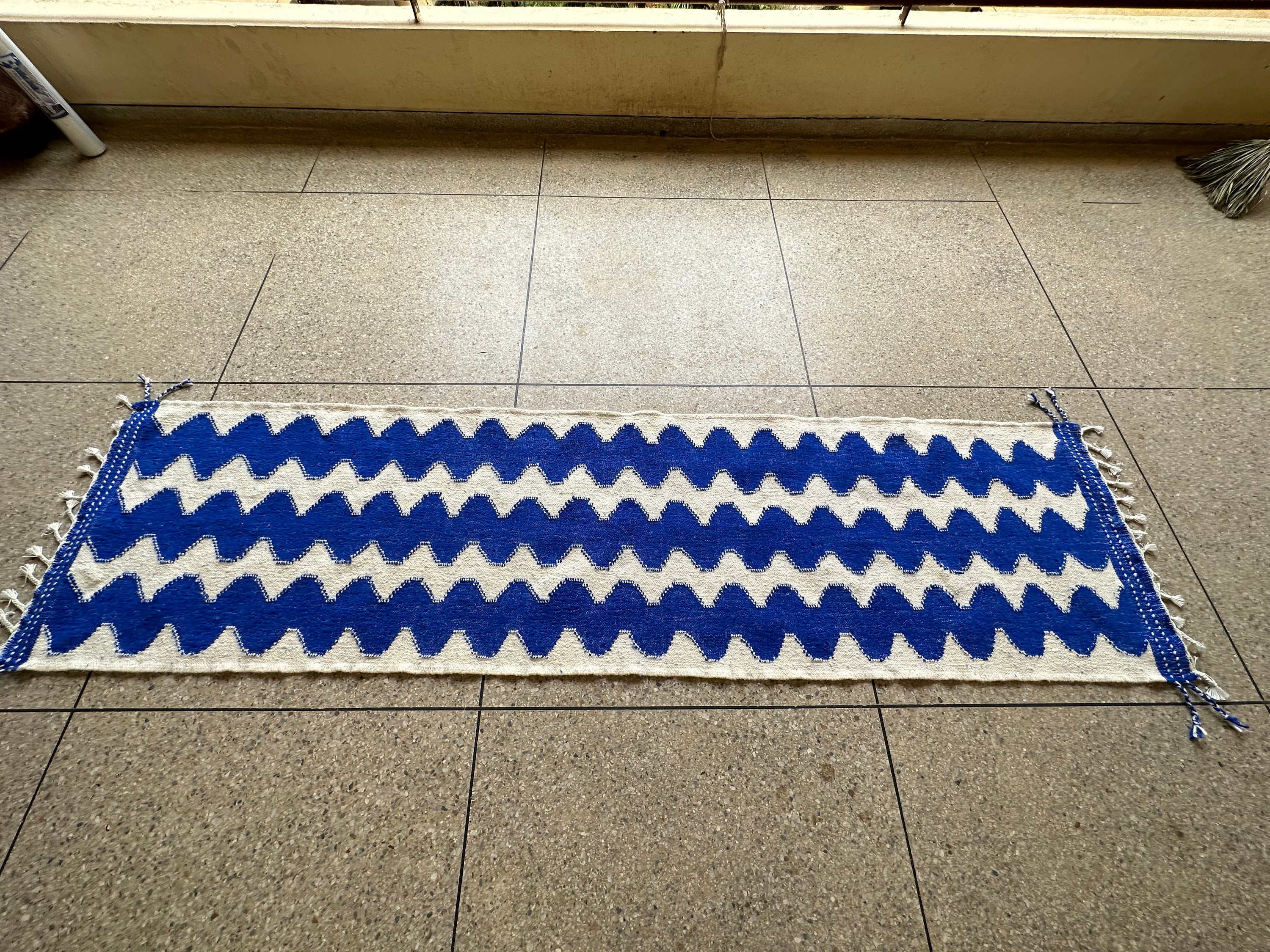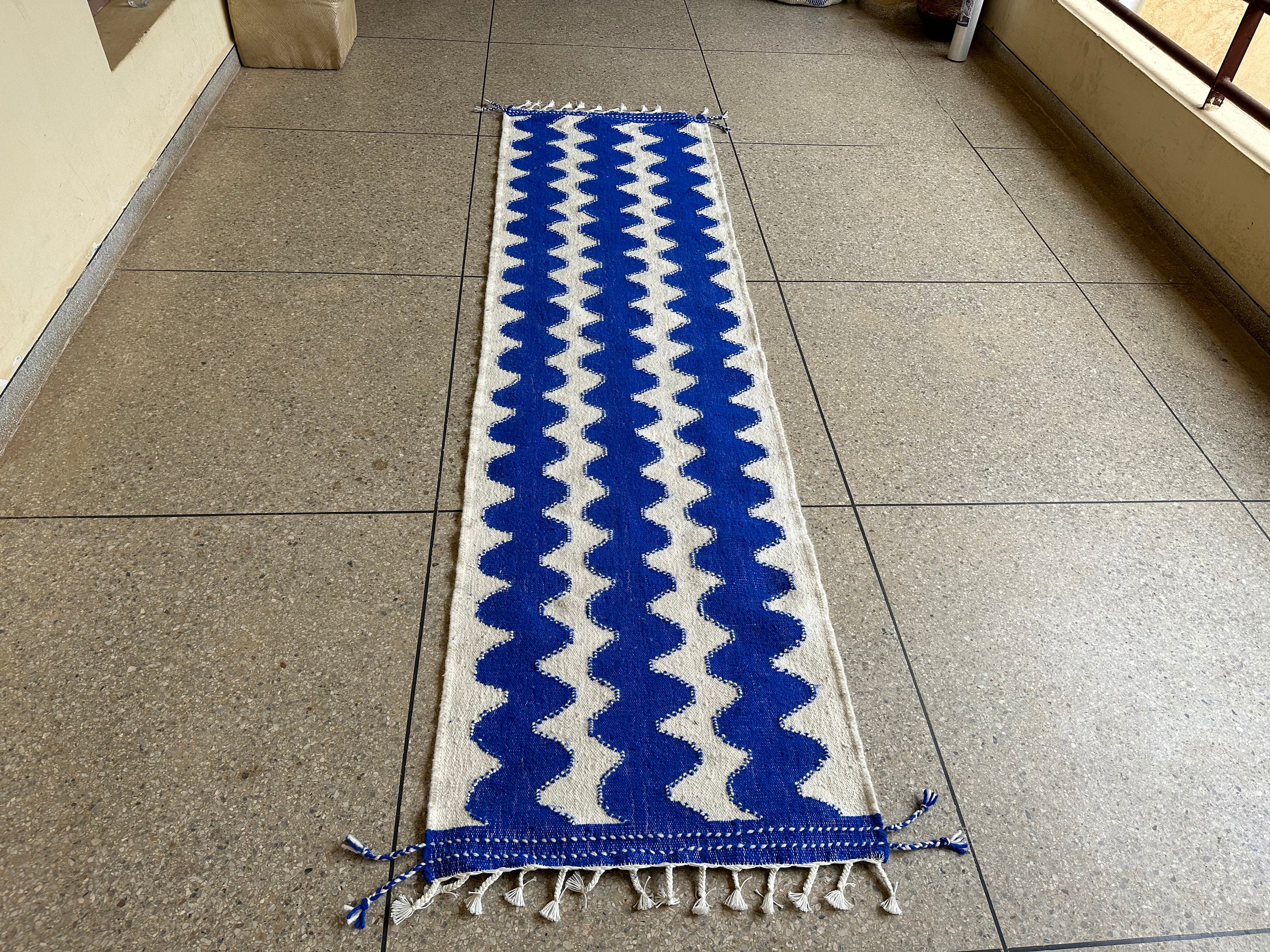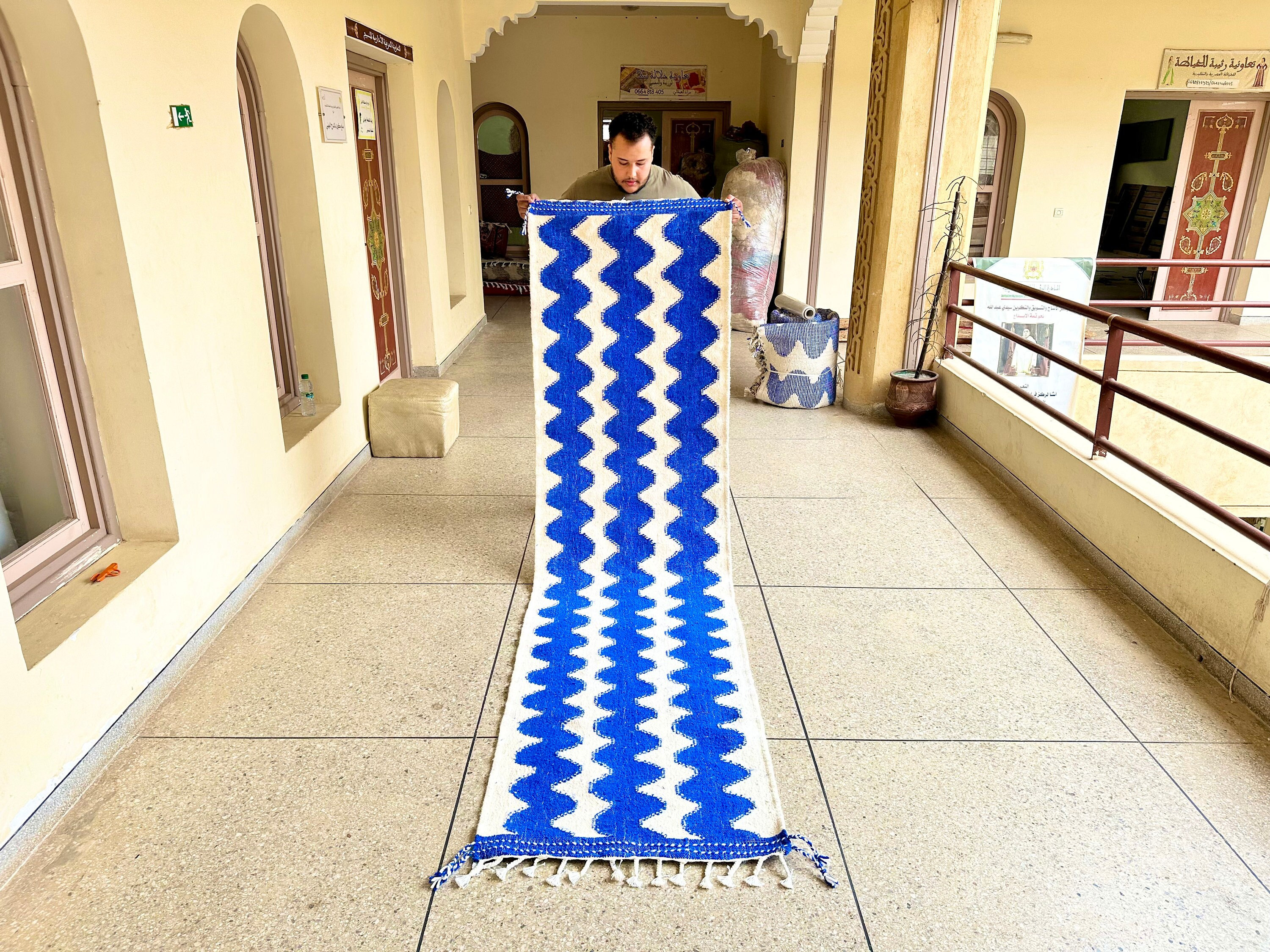Elevate your space with our stunning Moroccan Kilim Runner! This Beni Ourain White and Blue Striped Runner adds a touch of elegance to any hallway. Handmade by Berber artisans, this wool runner rug is both authentic and customizable to complement your entryway perfectly. Make a statement with this unique and timeless piece!